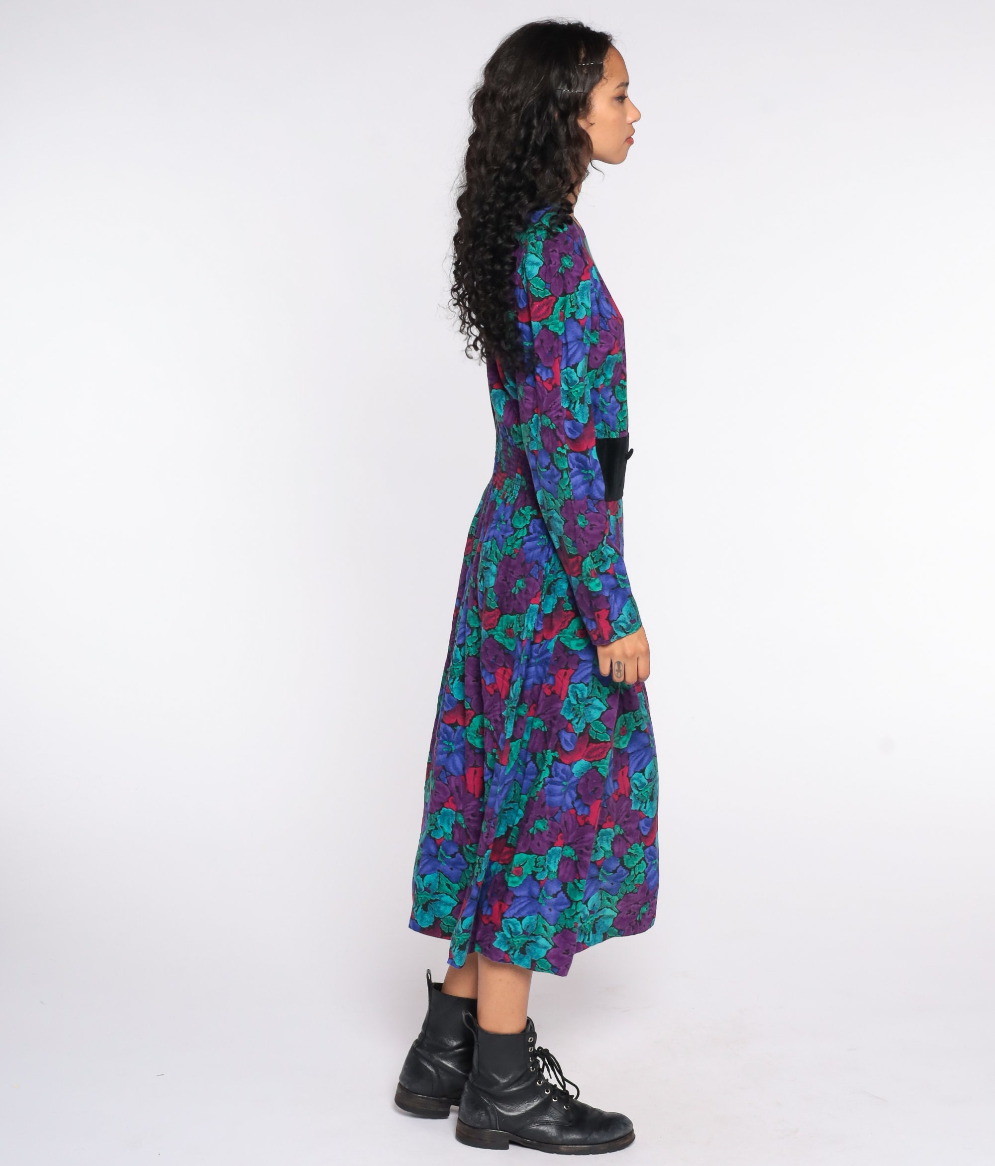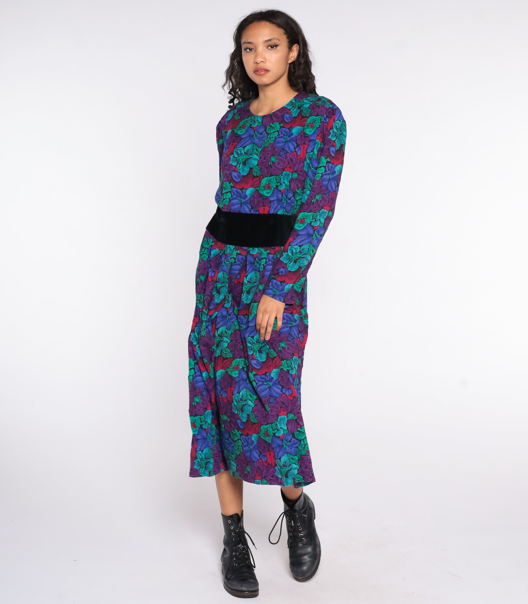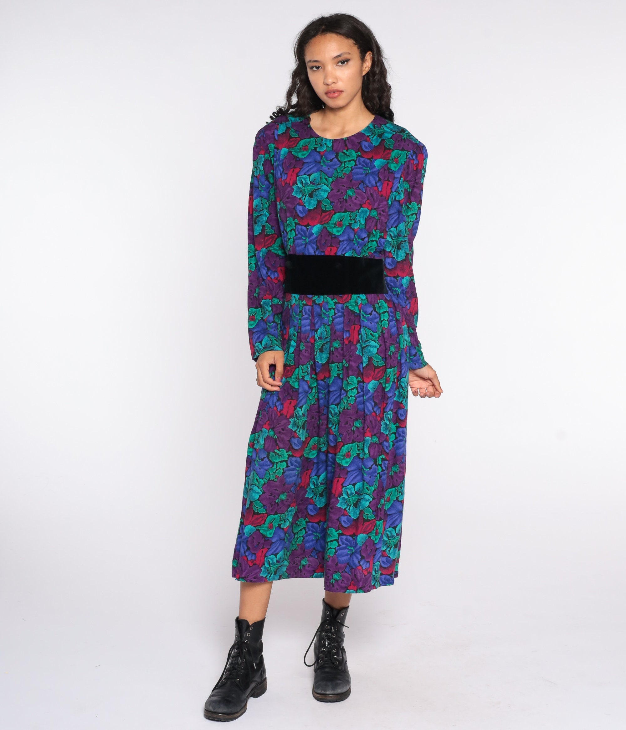 Vintage 80s dress in a floral print with long sleeves and a high waist.