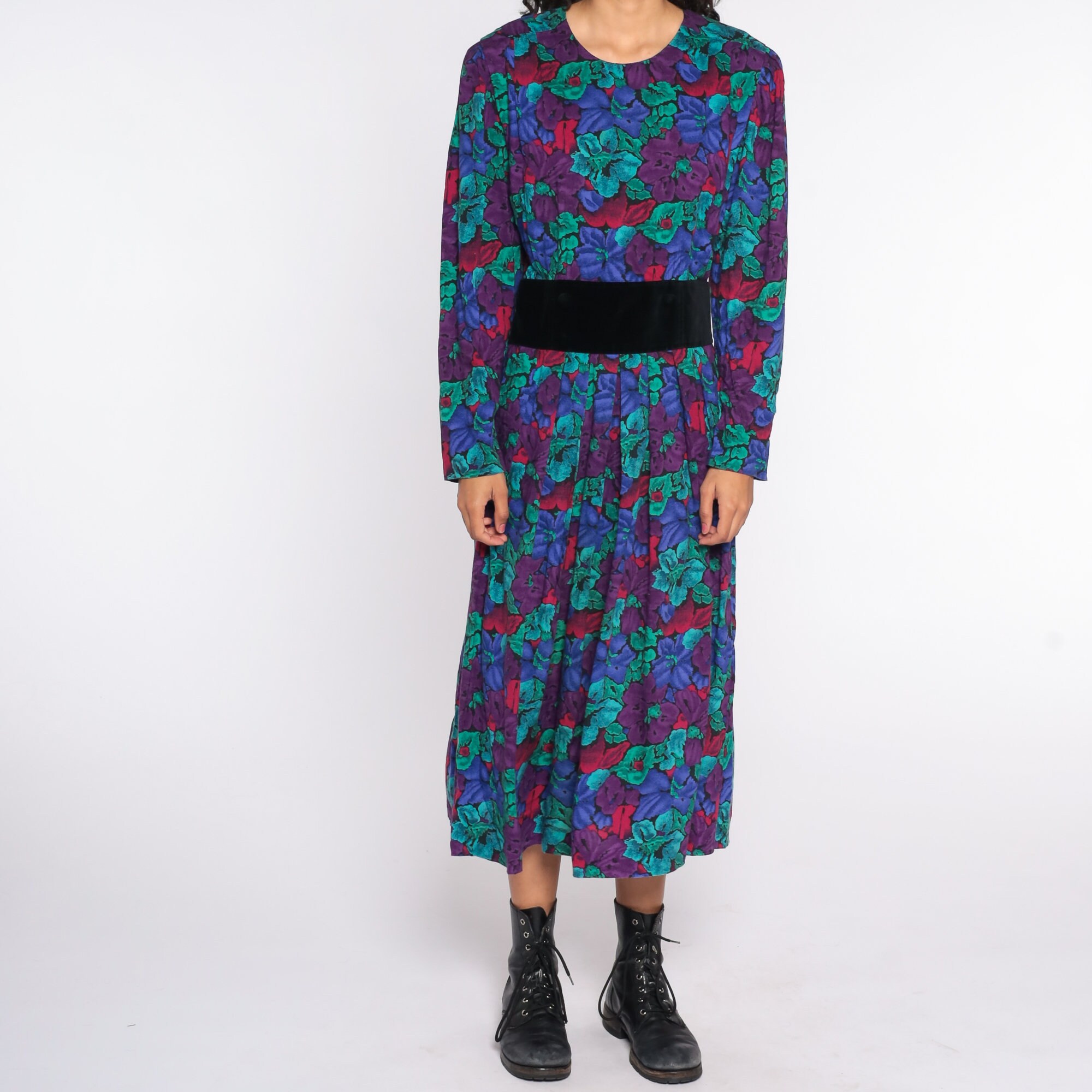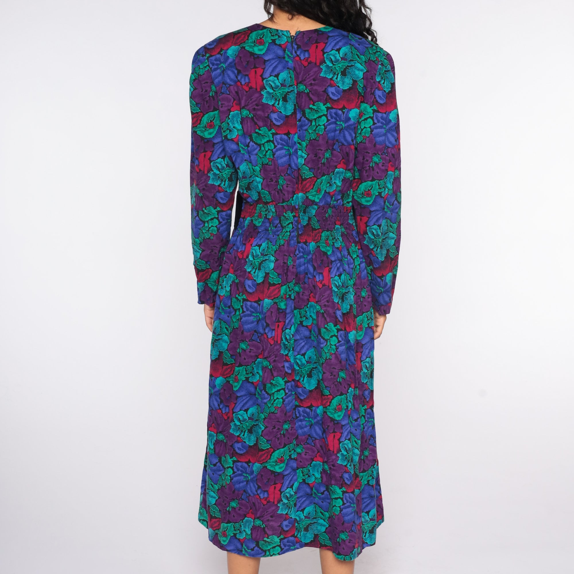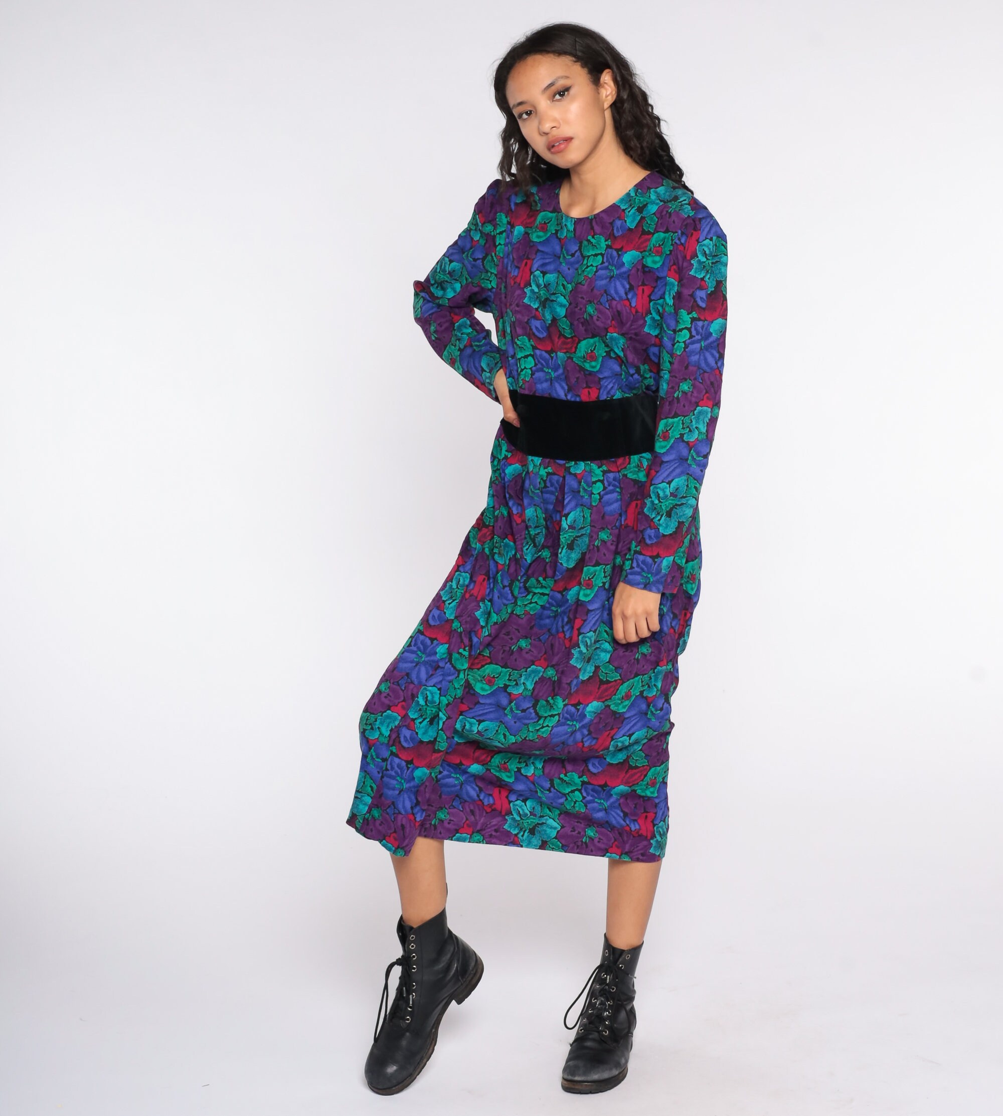 Vintage 80s dress in a floral print with long sleeves and a high waist.