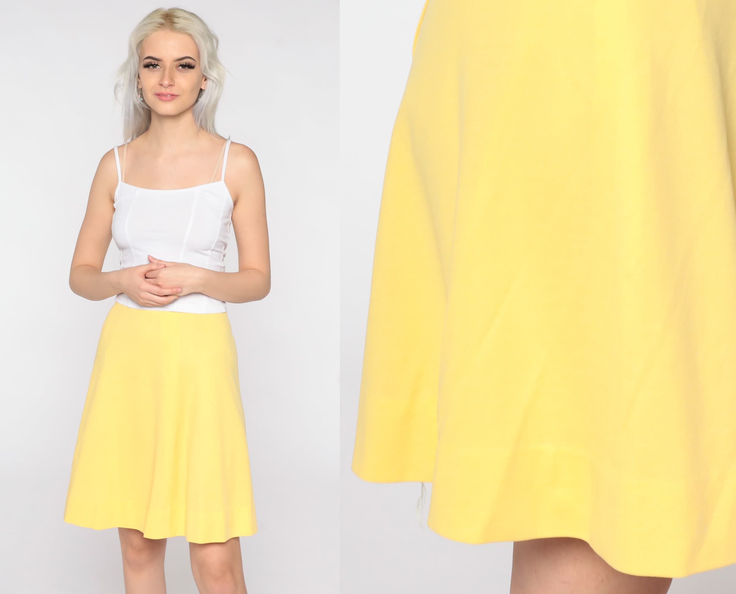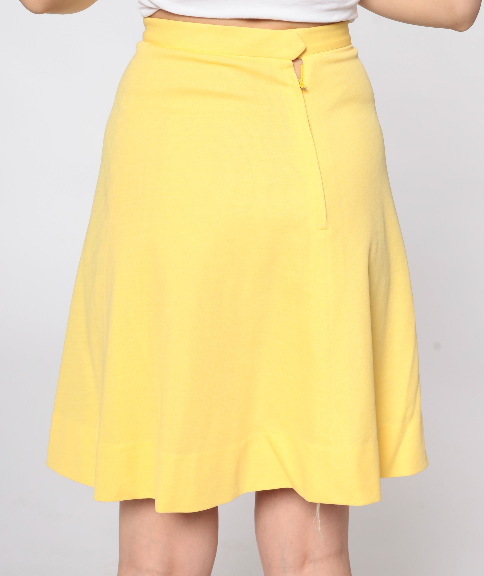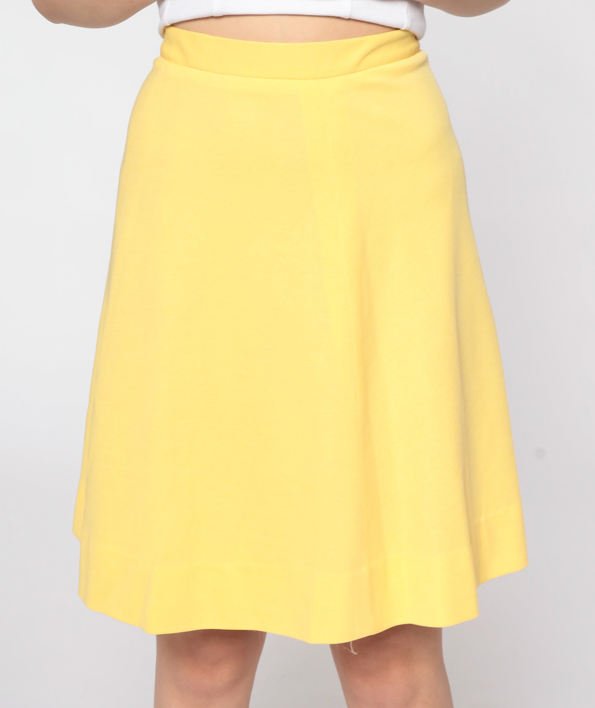 Vintage 70s skirt in yellow with an a line cut. Mini length. Rear zipper.