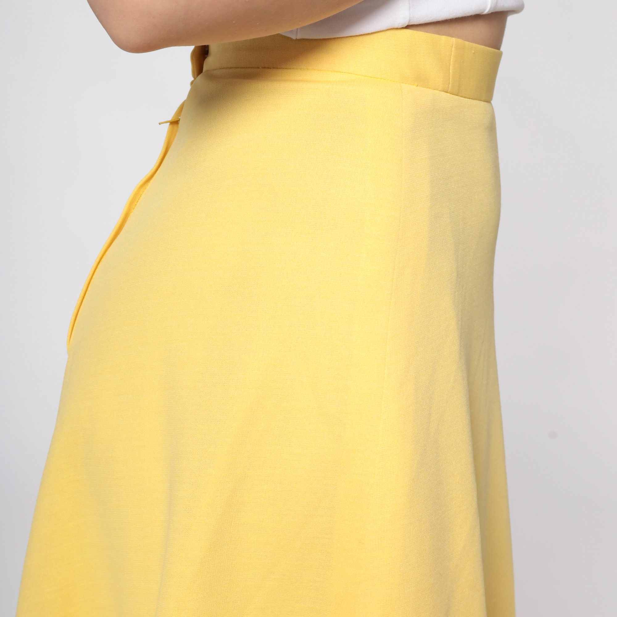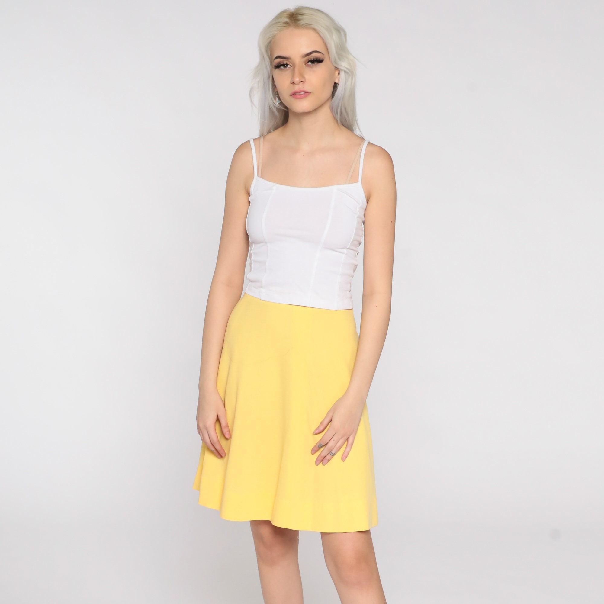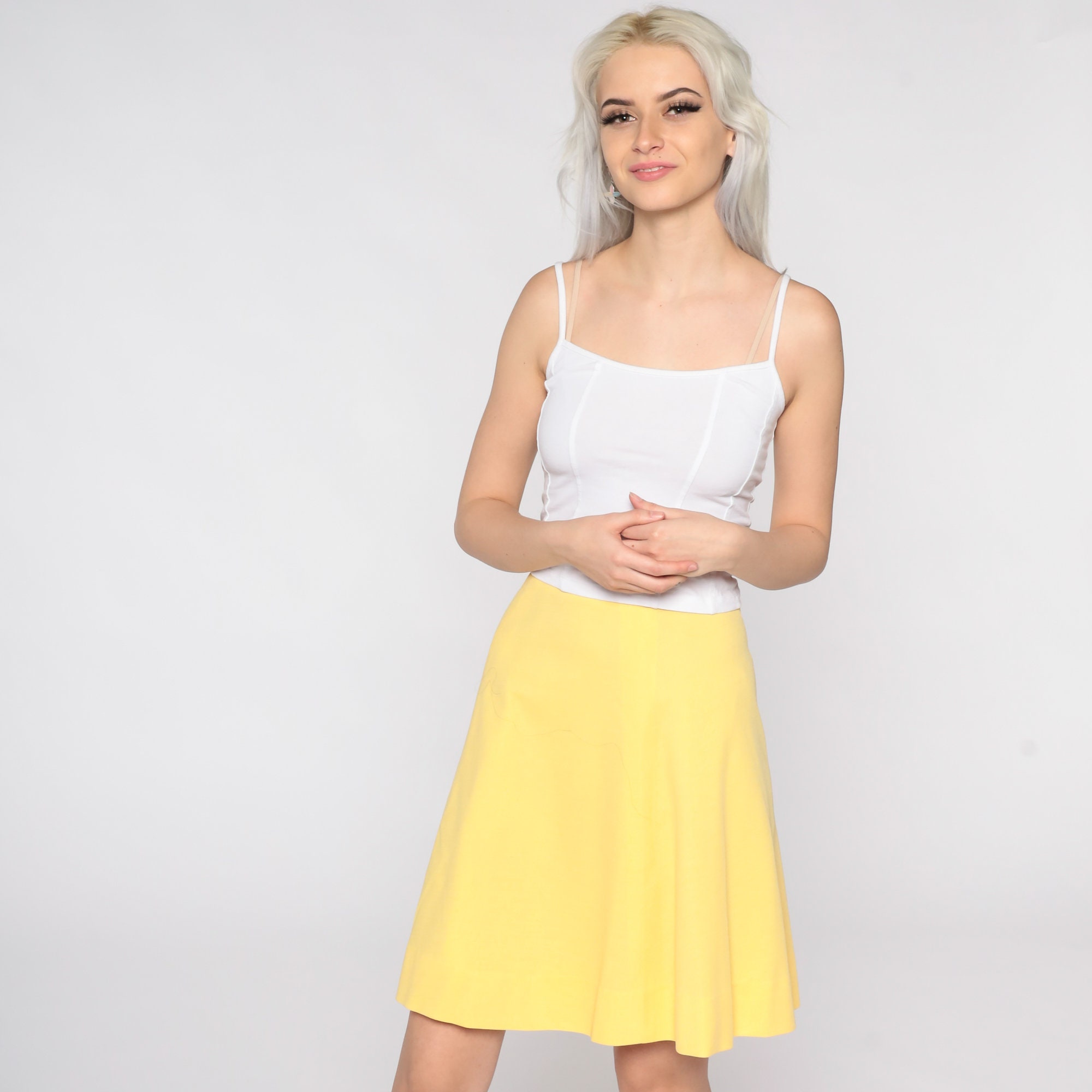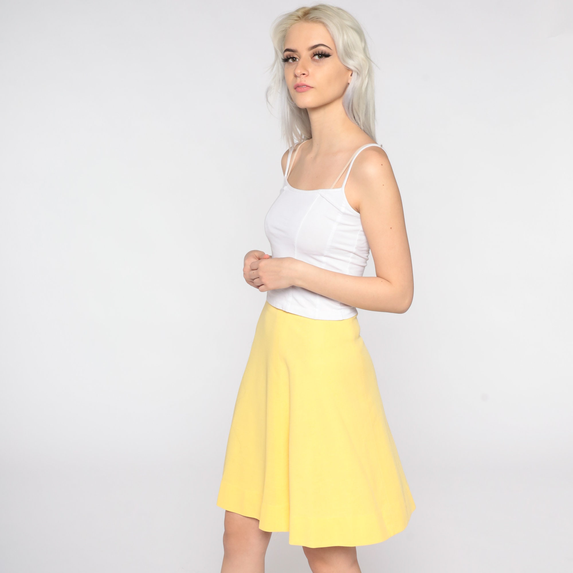 Vintage 70s skirt in yellow with an a line cut. Mini length. Rear zipper.