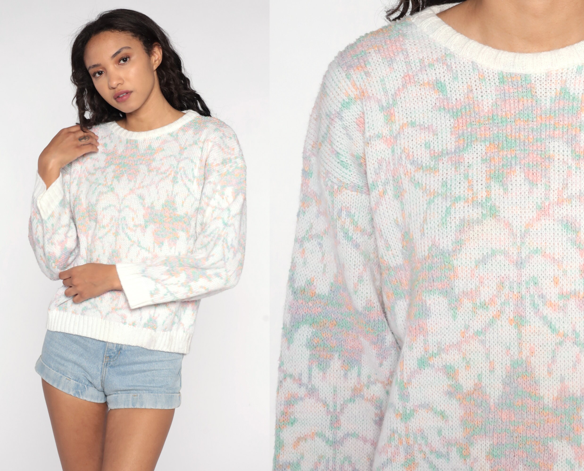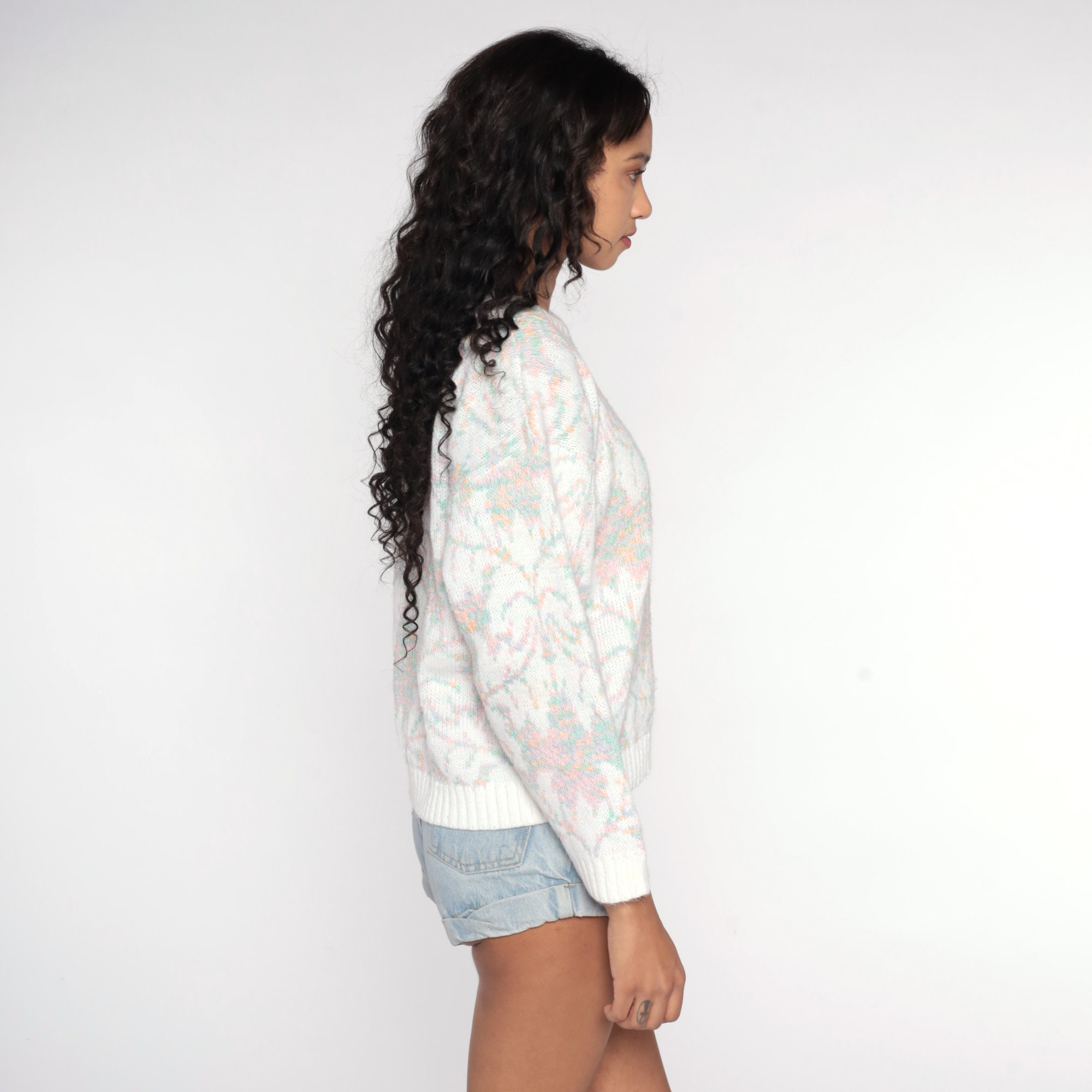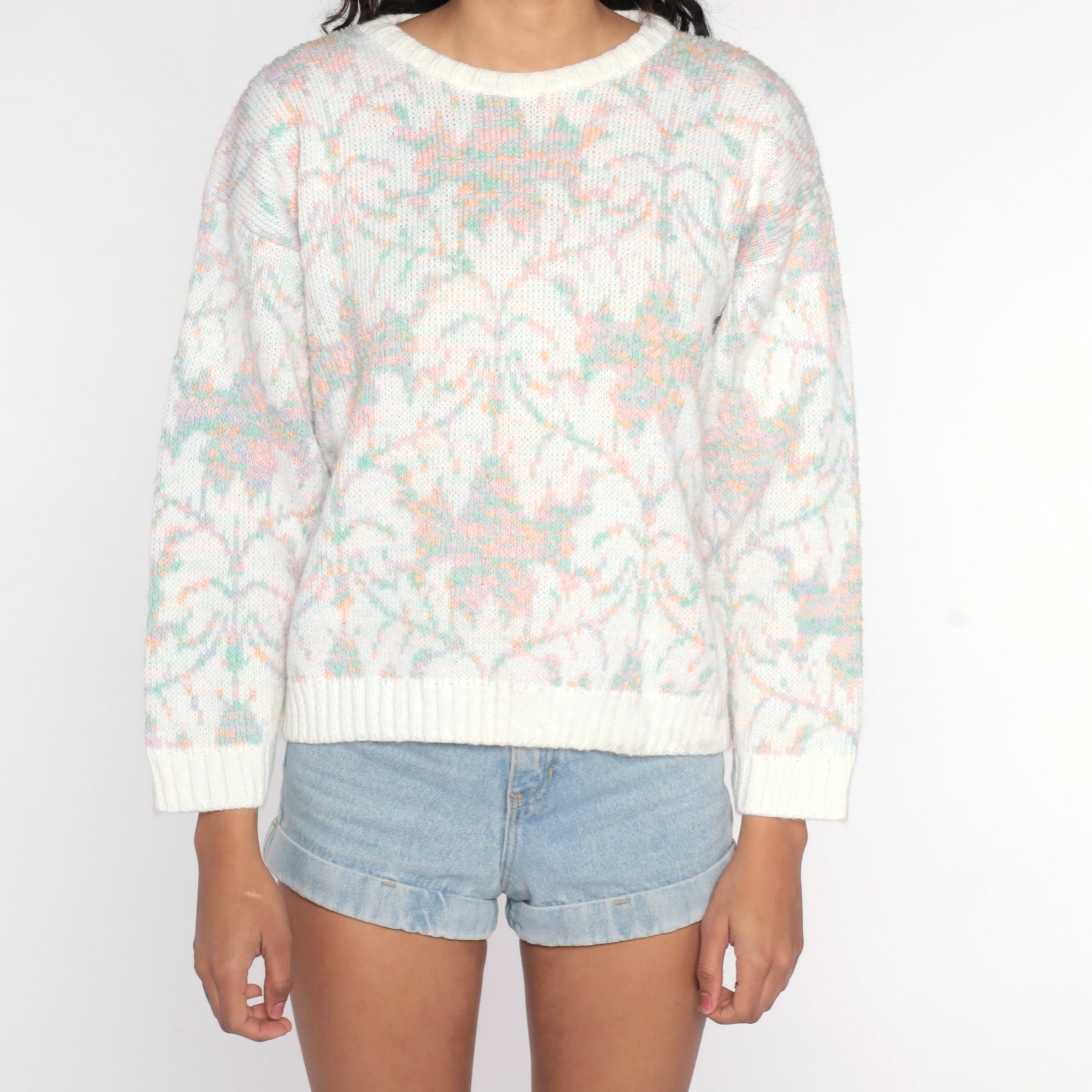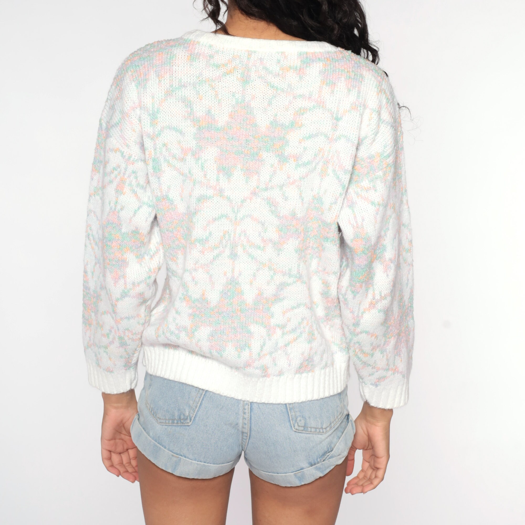 Vintage 80s sweater in white and pastel knit with a leaf design.