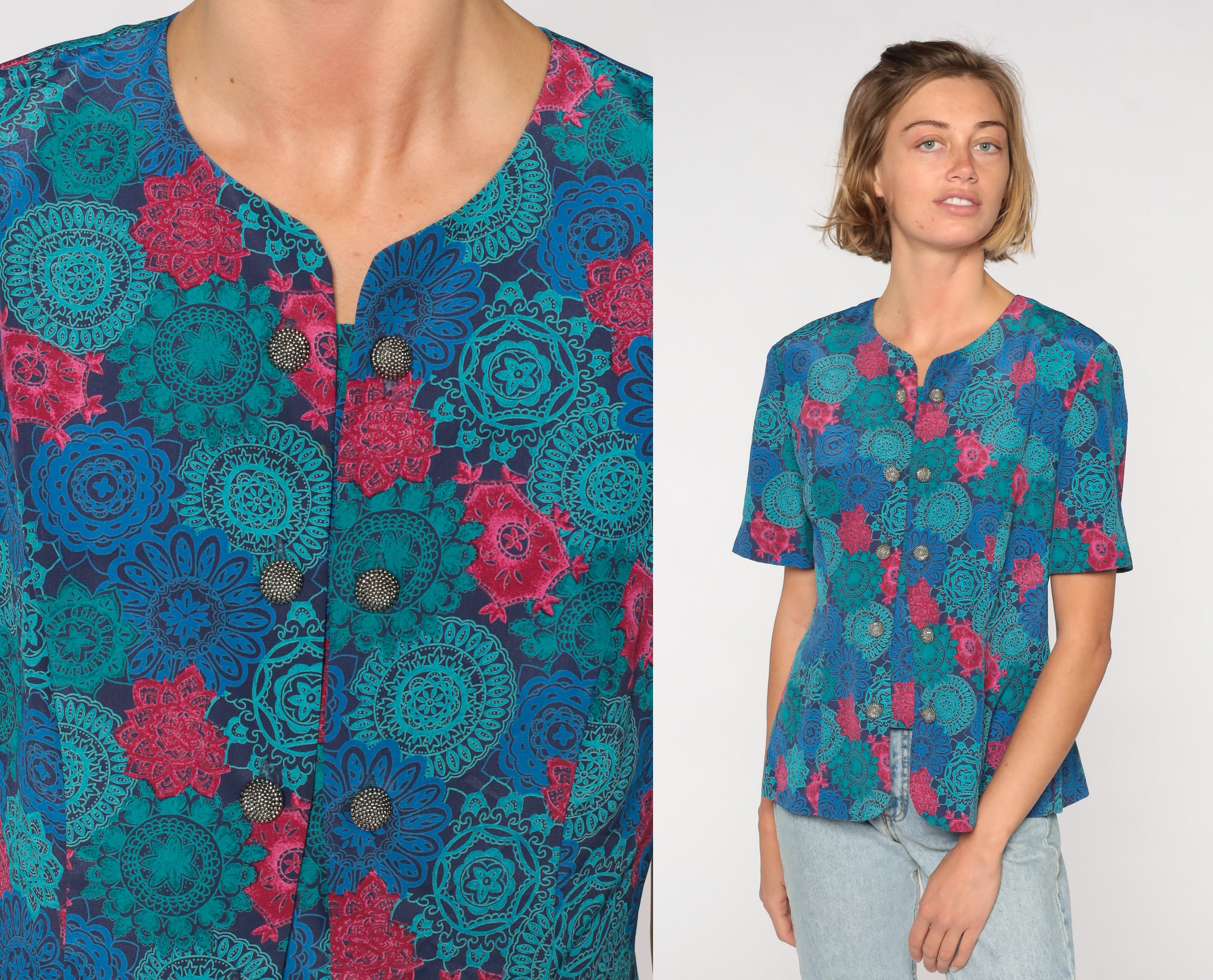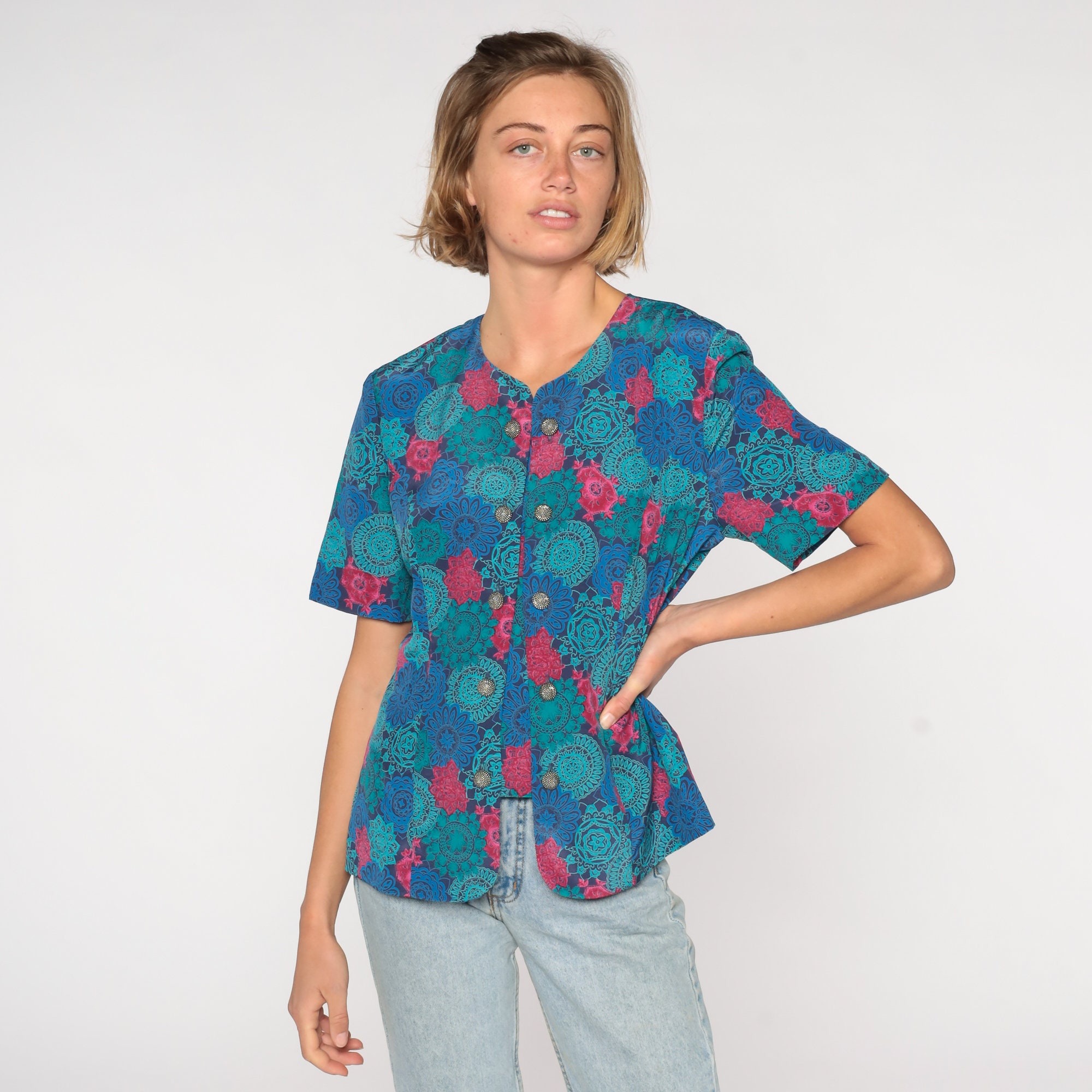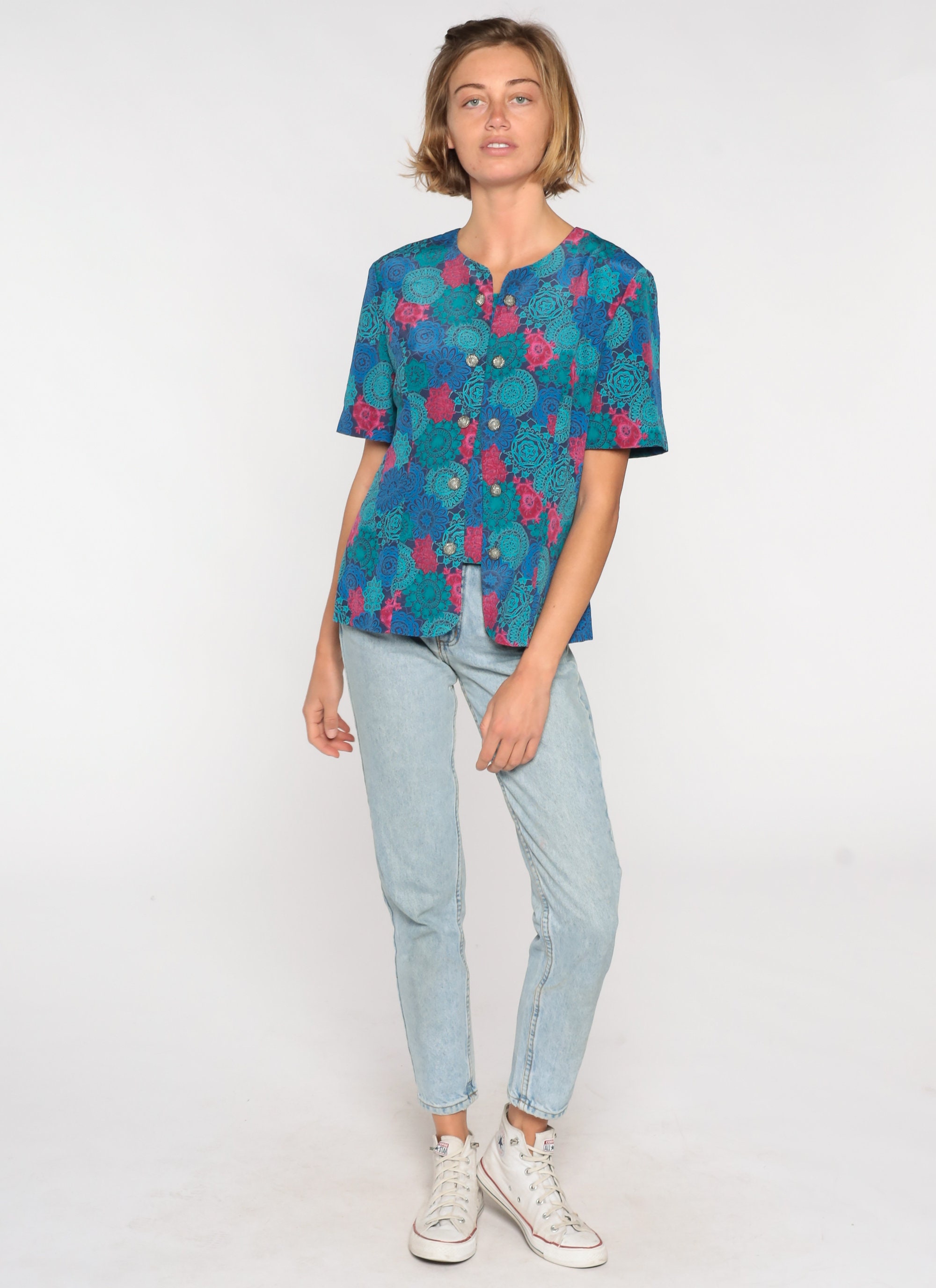 Vintage 80s shirt in blue with a geometric print. Buttons up the front with short sleeves.