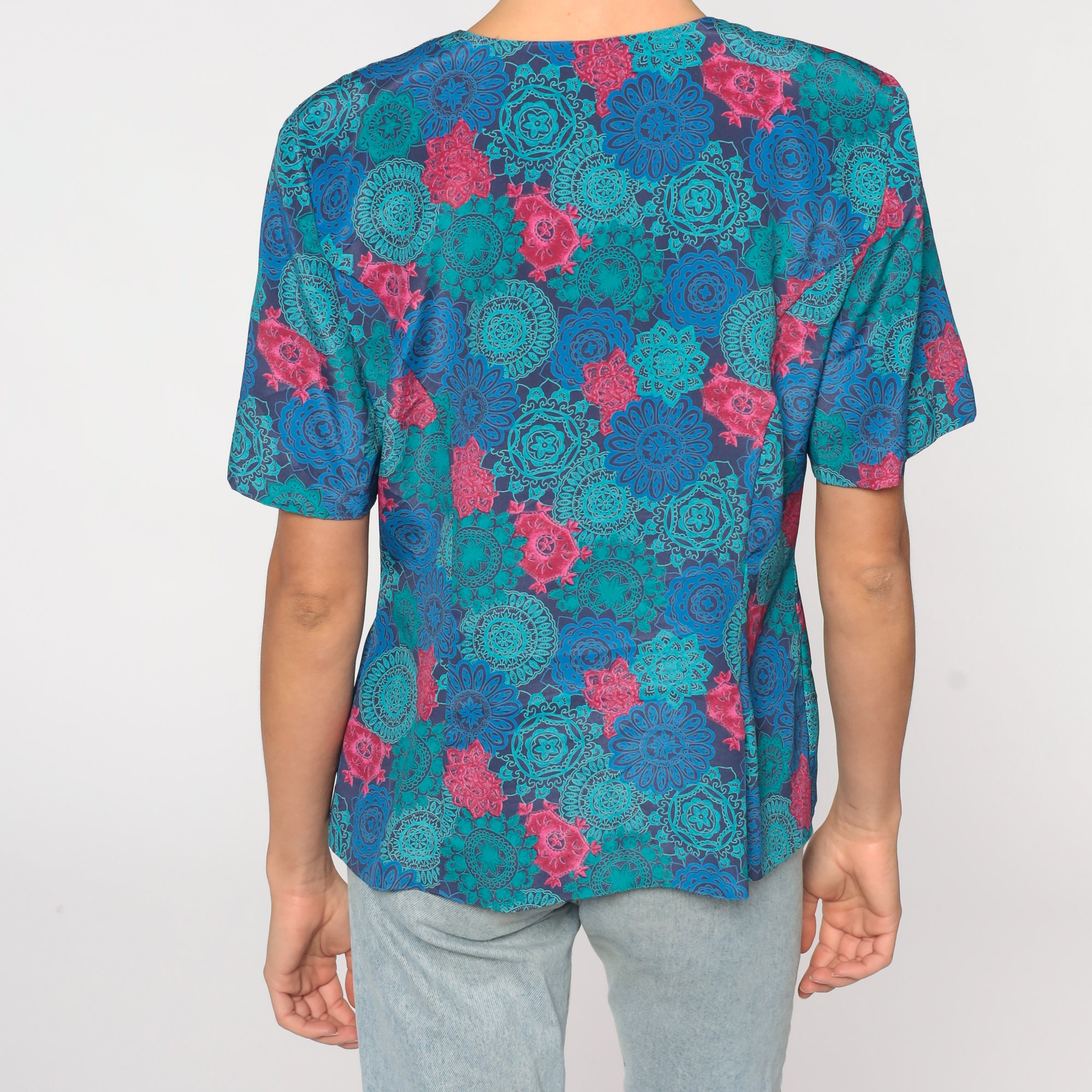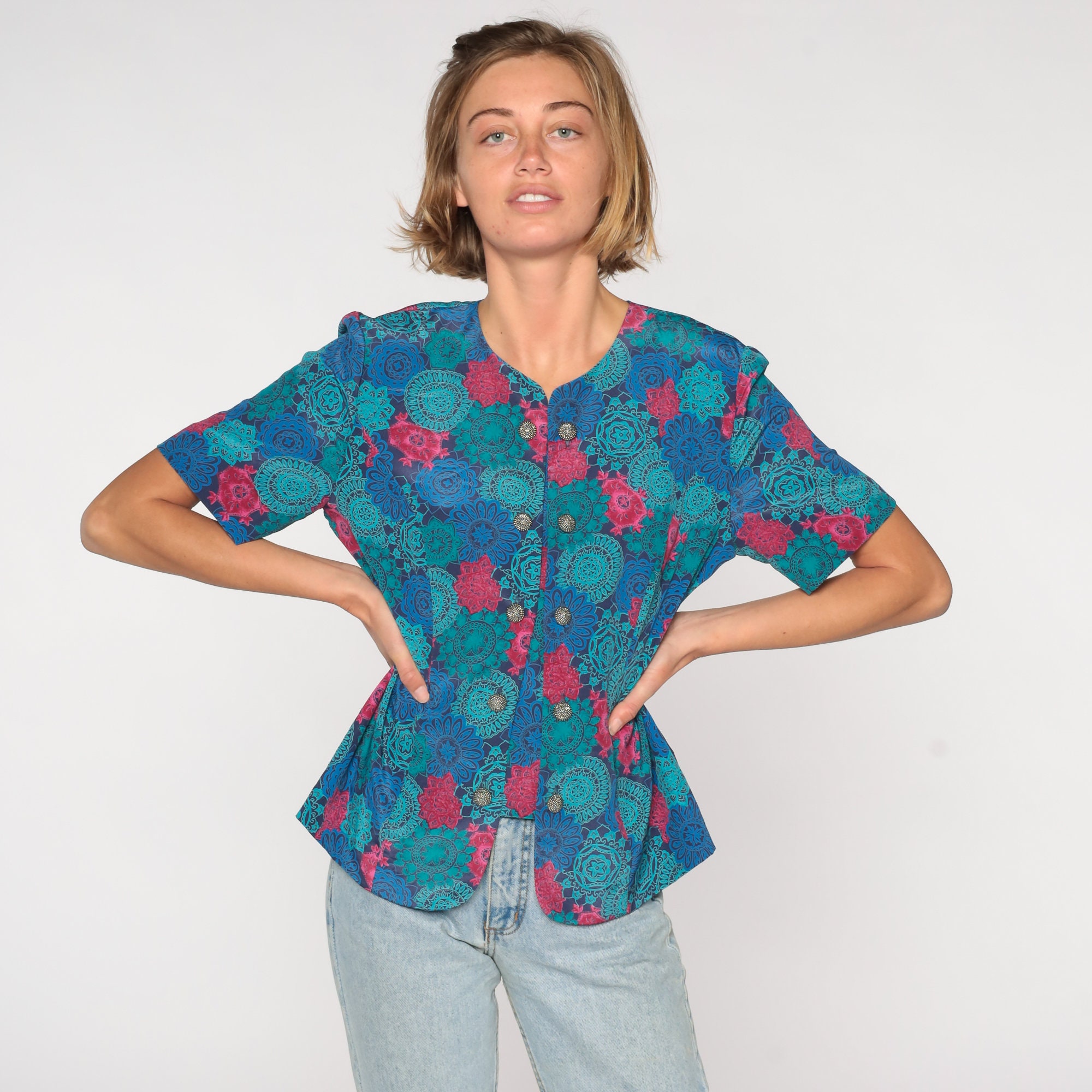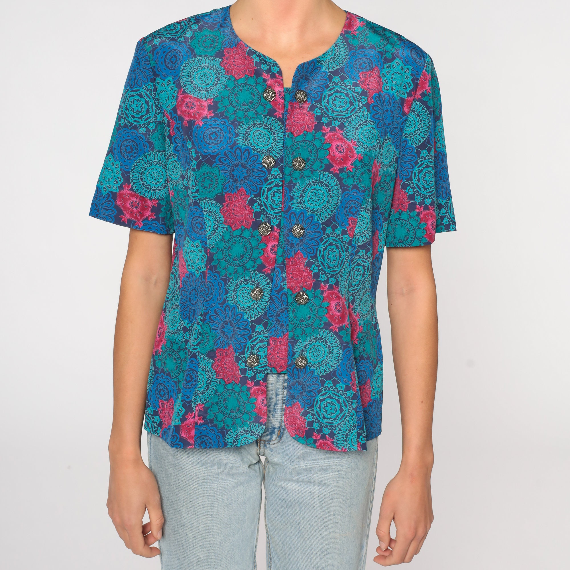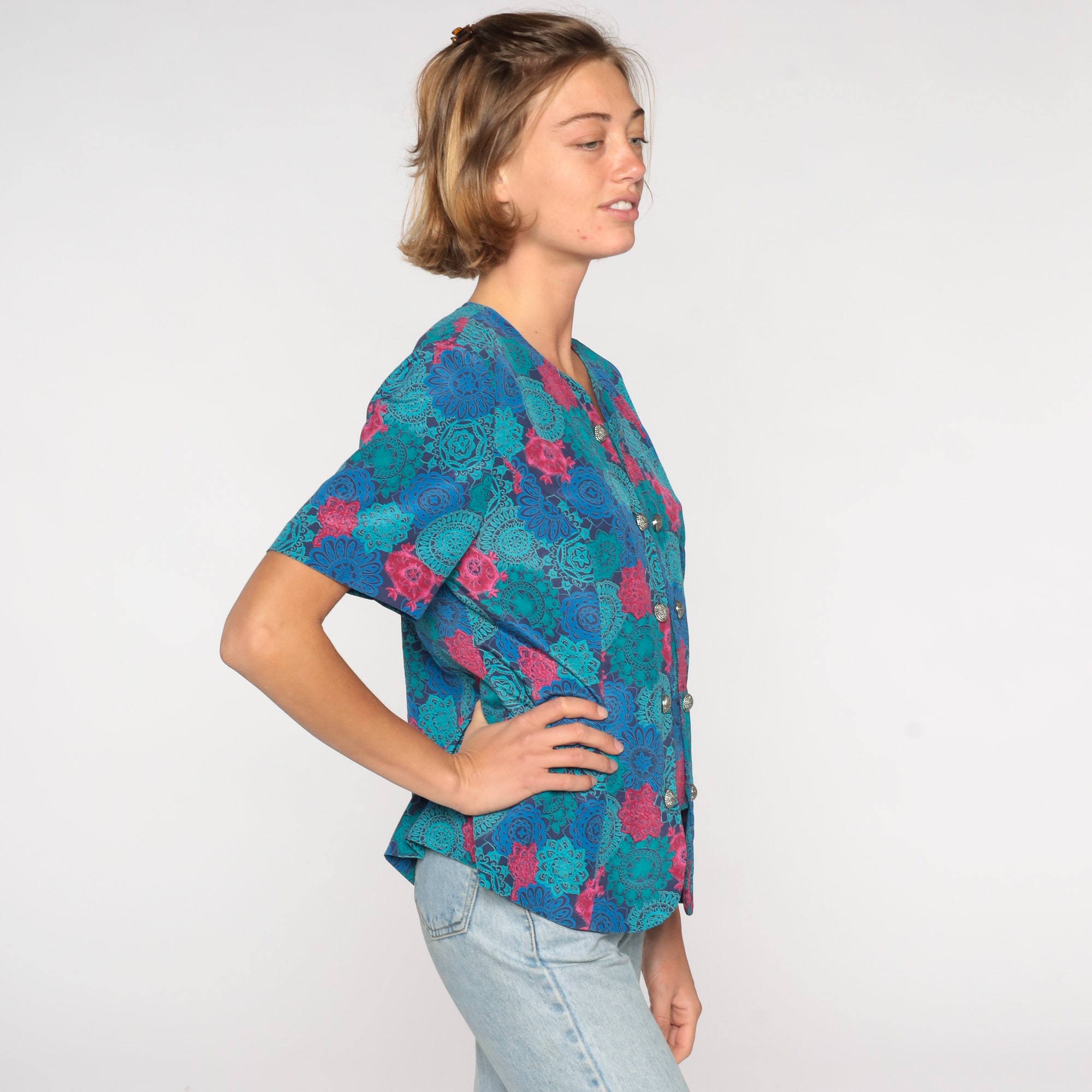 Vintage 80s shirt in blue with a geometric print. Buttons up the front with short sleeves.