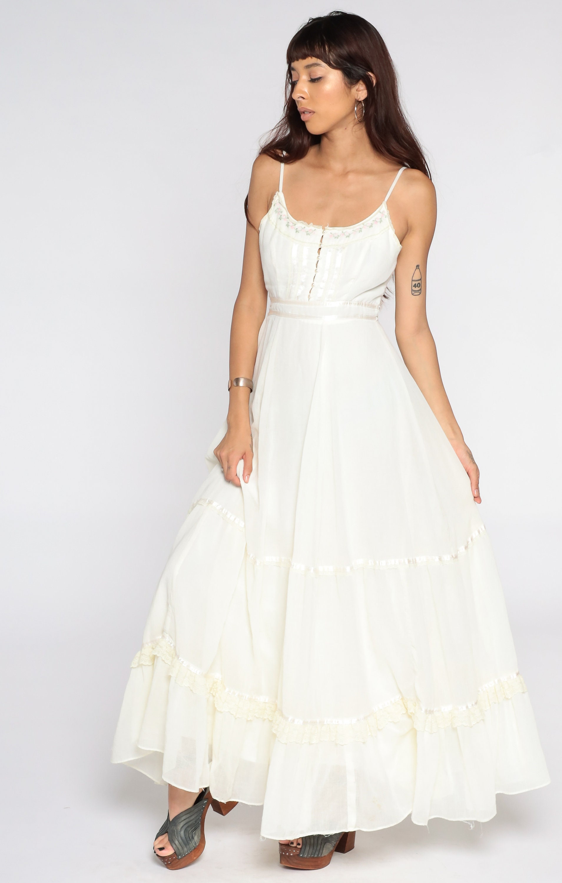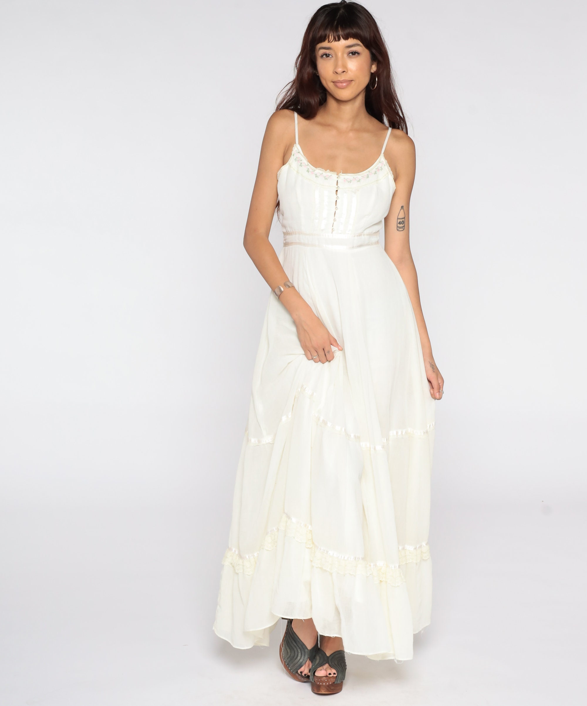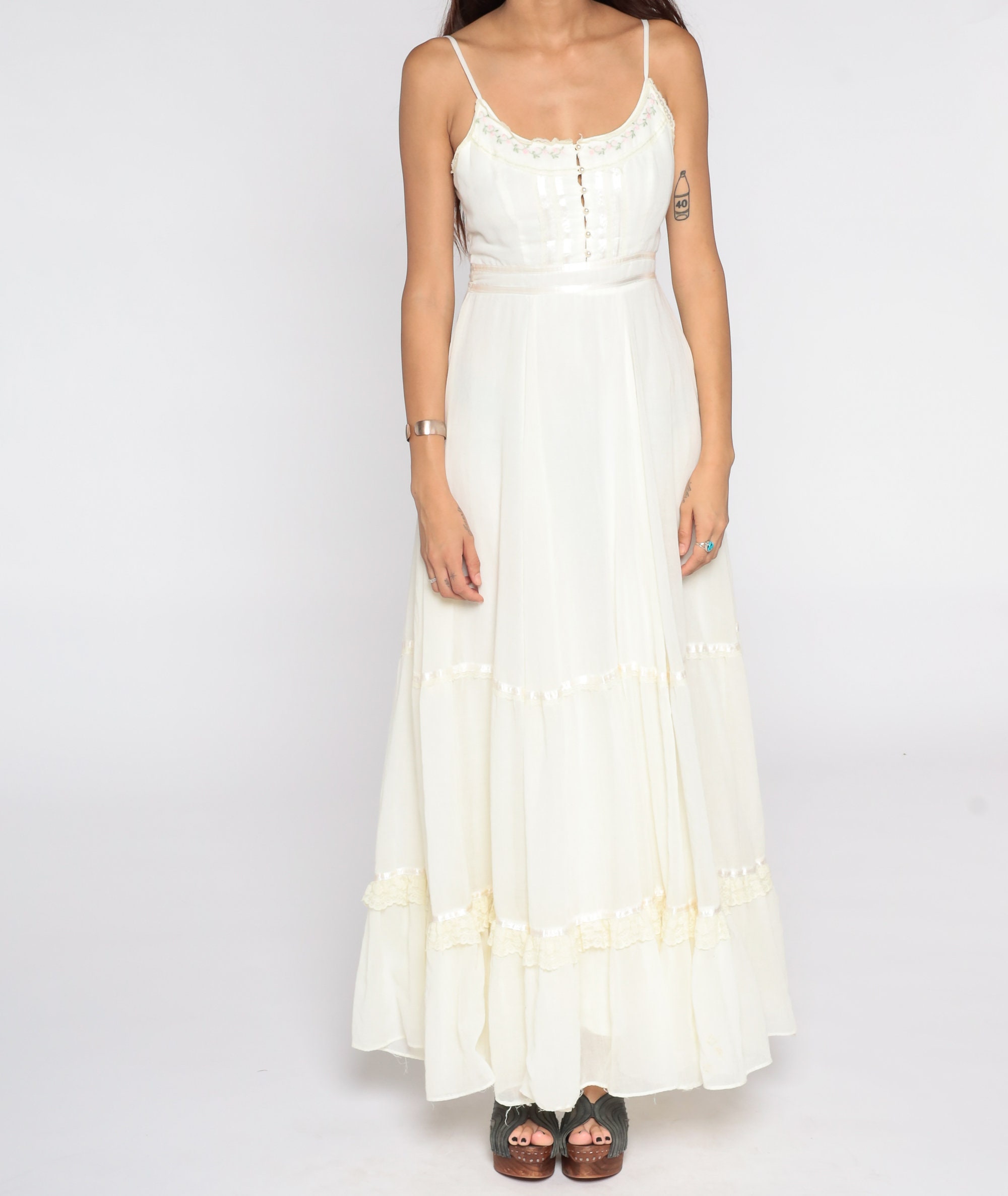 Vintage 70s dress in cream with floral embroidered trim and buttons up the front. It has a high waist with tank straps and a full tiered skirt. Maxi length. It looks like it had a Gunne Sax tag, but only the back part of the tag remains. We've seen this before and we think it might happen when the dress is put on clearance or ends up in an outlet.