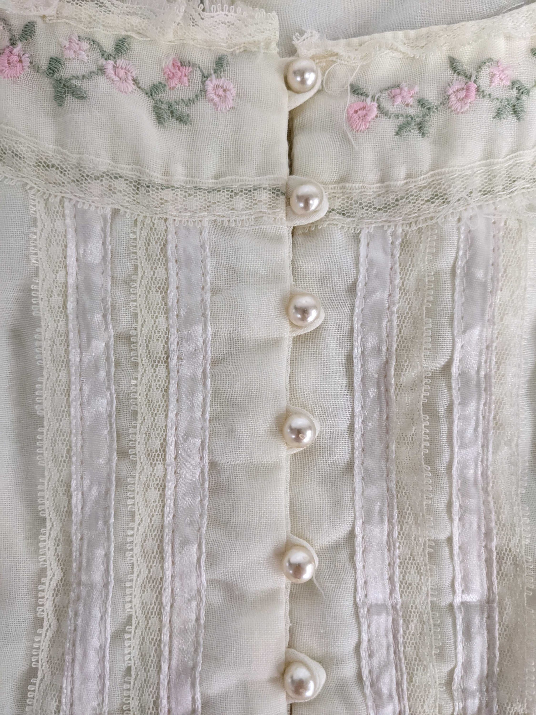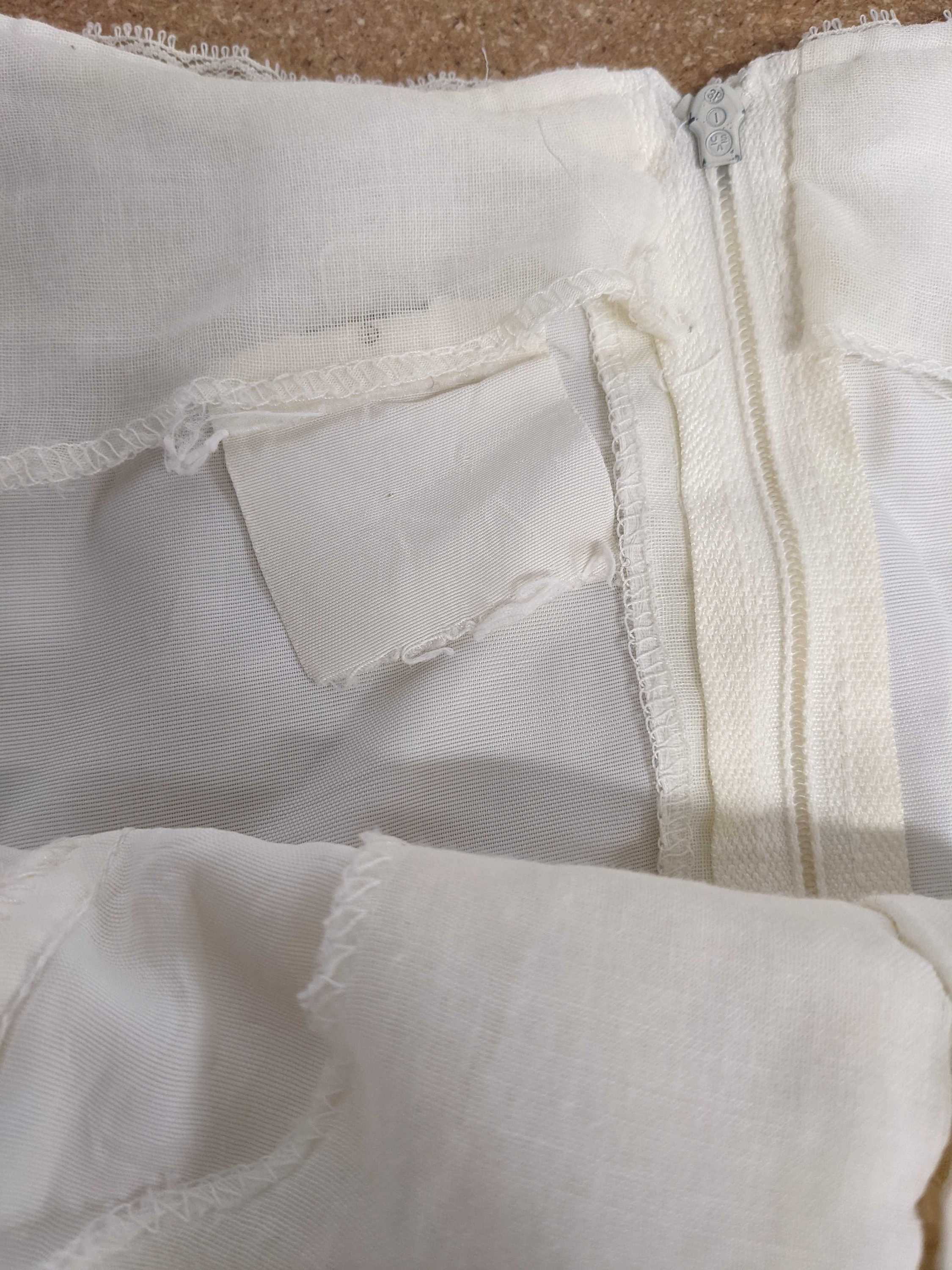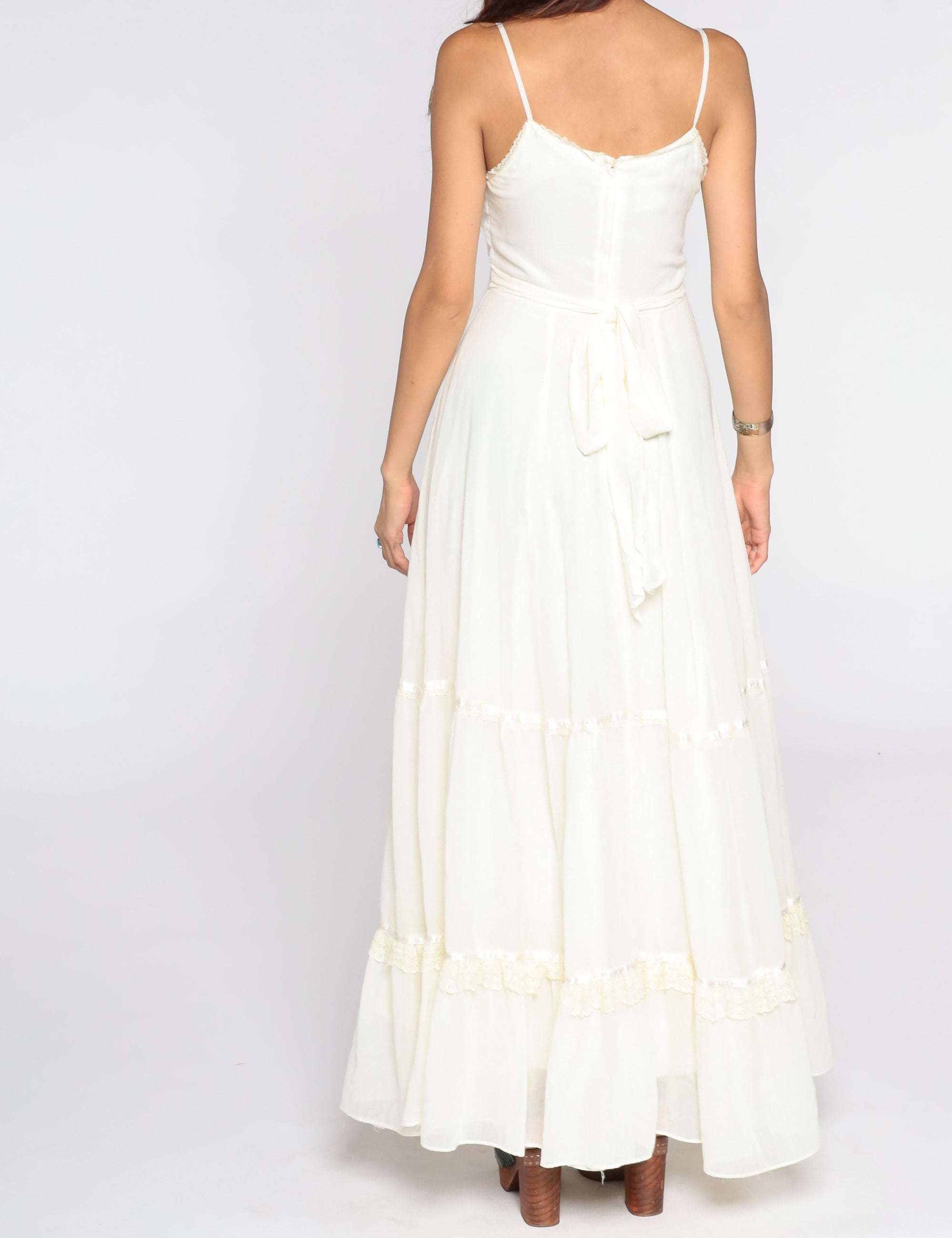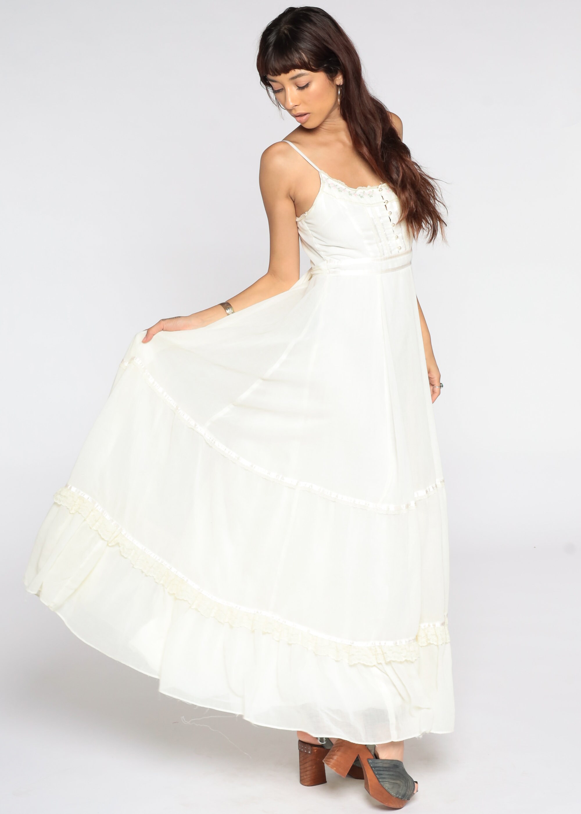 Vintage 70s dress in cream with floral embroidered trim and buttons up the front. It has a high waist with tank straps and a full tiered skirt. Maxi length. It looks like it had a Gunne Sax tag, but only the back part of the tag remains. We've seen this before and we think it might happen when the dress is put on clearance or ends up in an outlet.