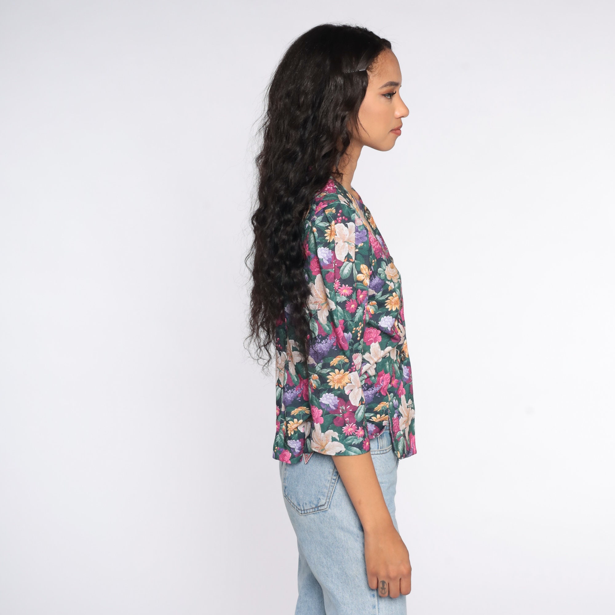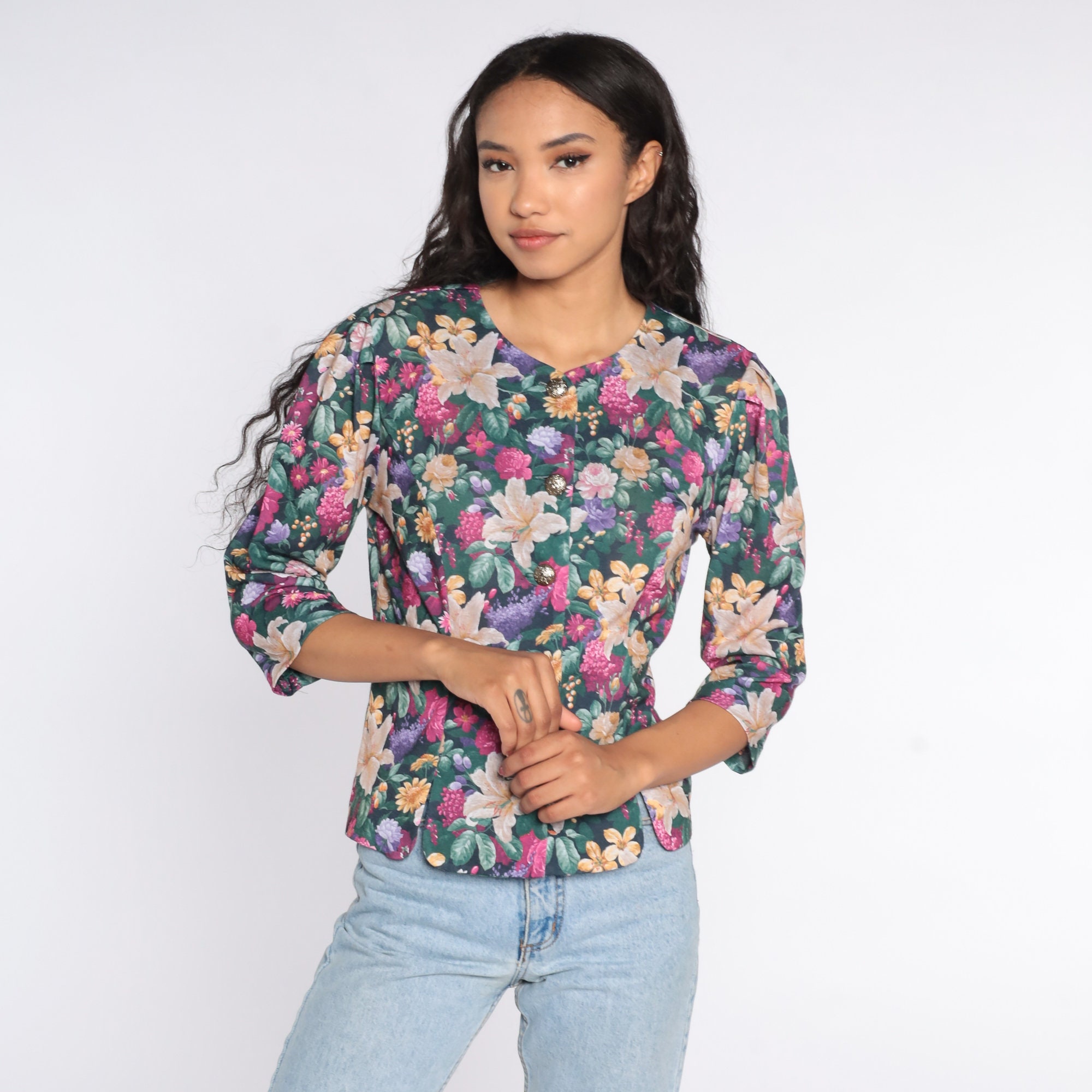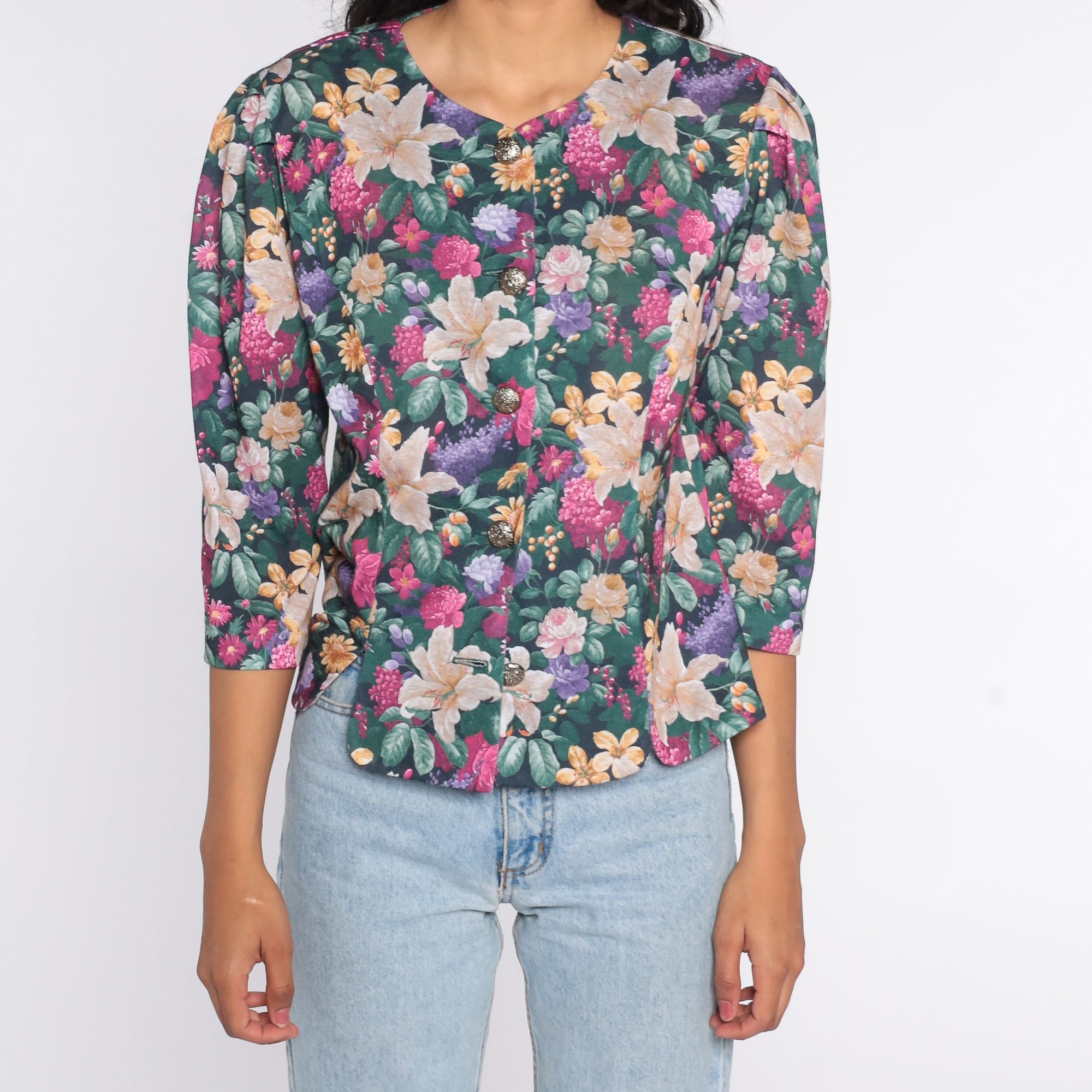 Vintage 80s blouse in a floral print with puff sleeves. Buttons up the front.