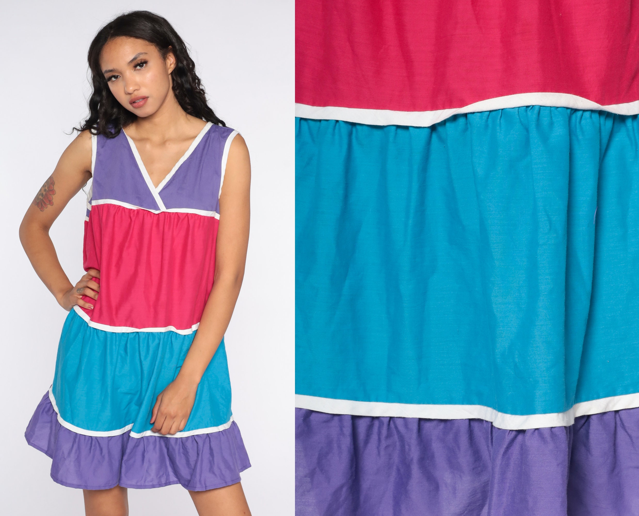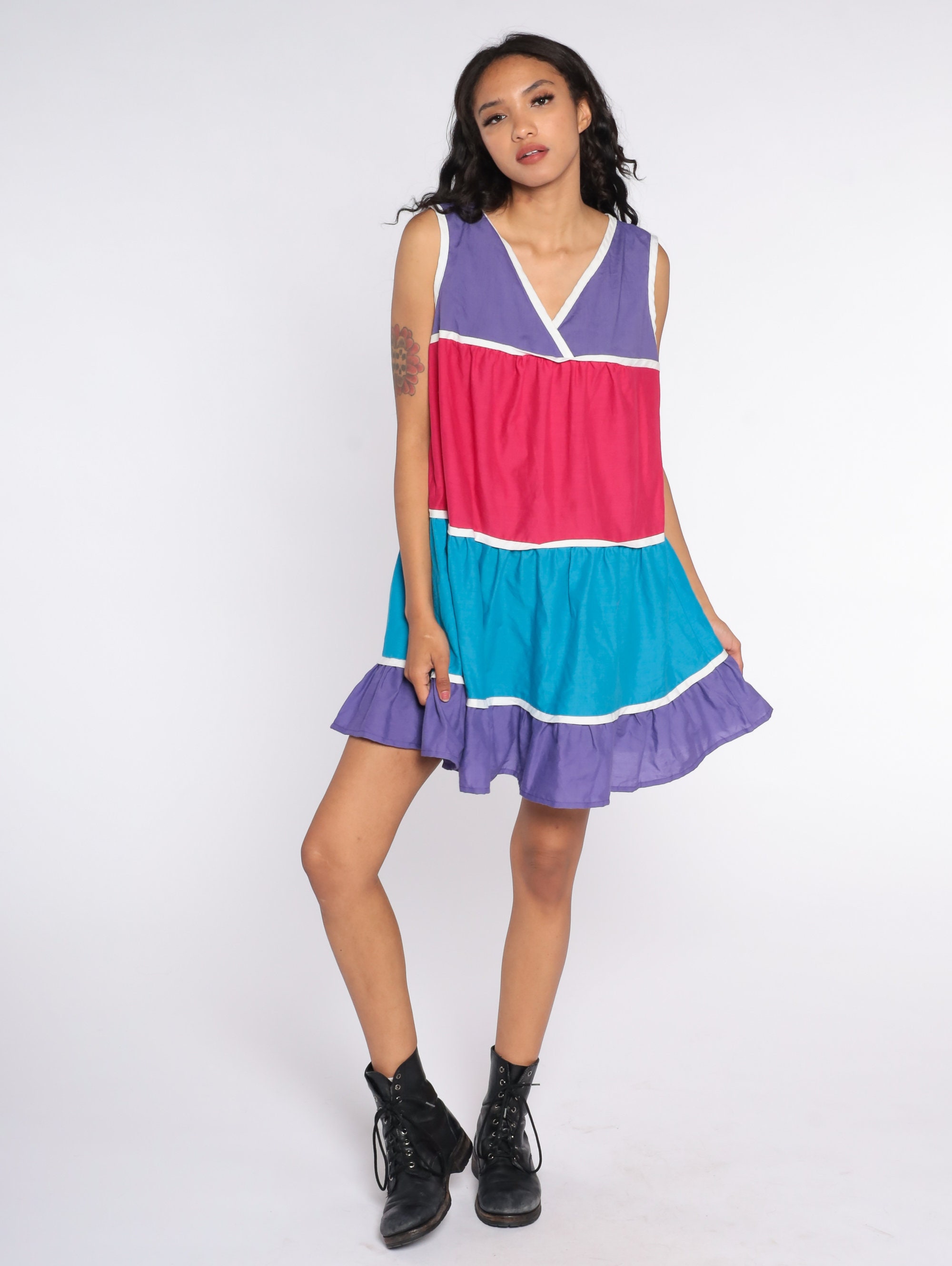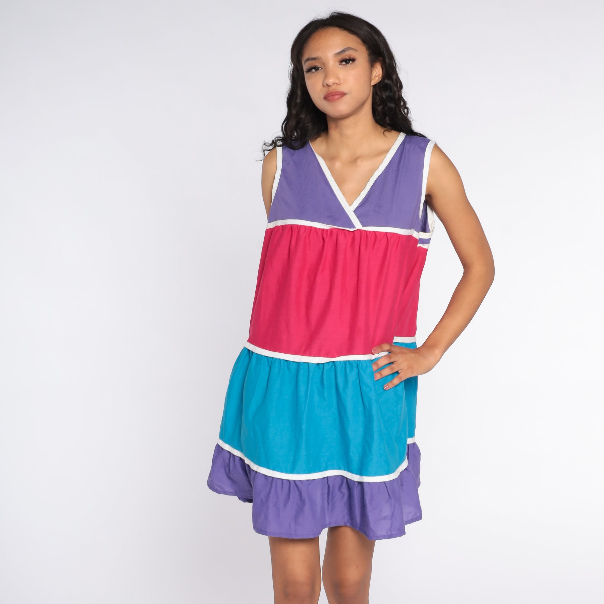 Vintage 80s dress with tiered colour blocking and a tent cut. Mini length.