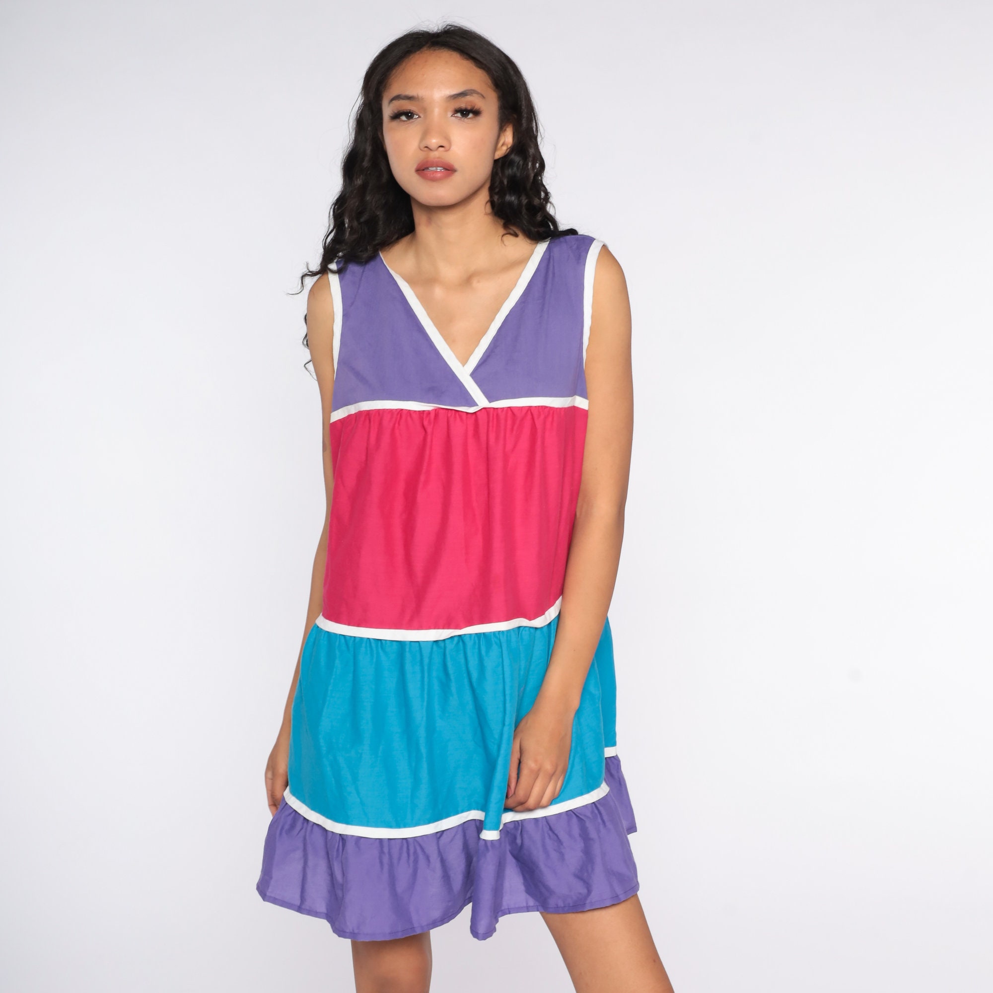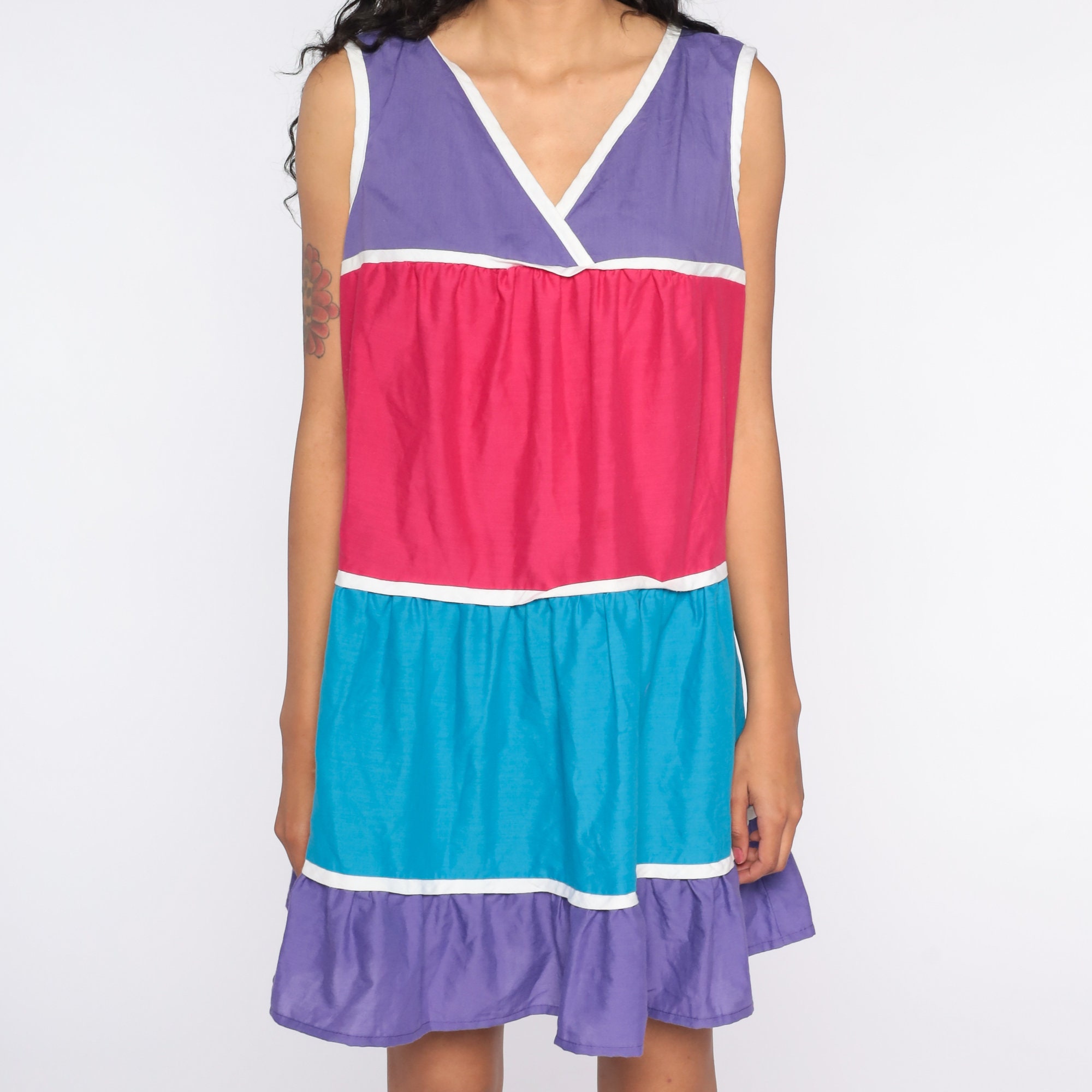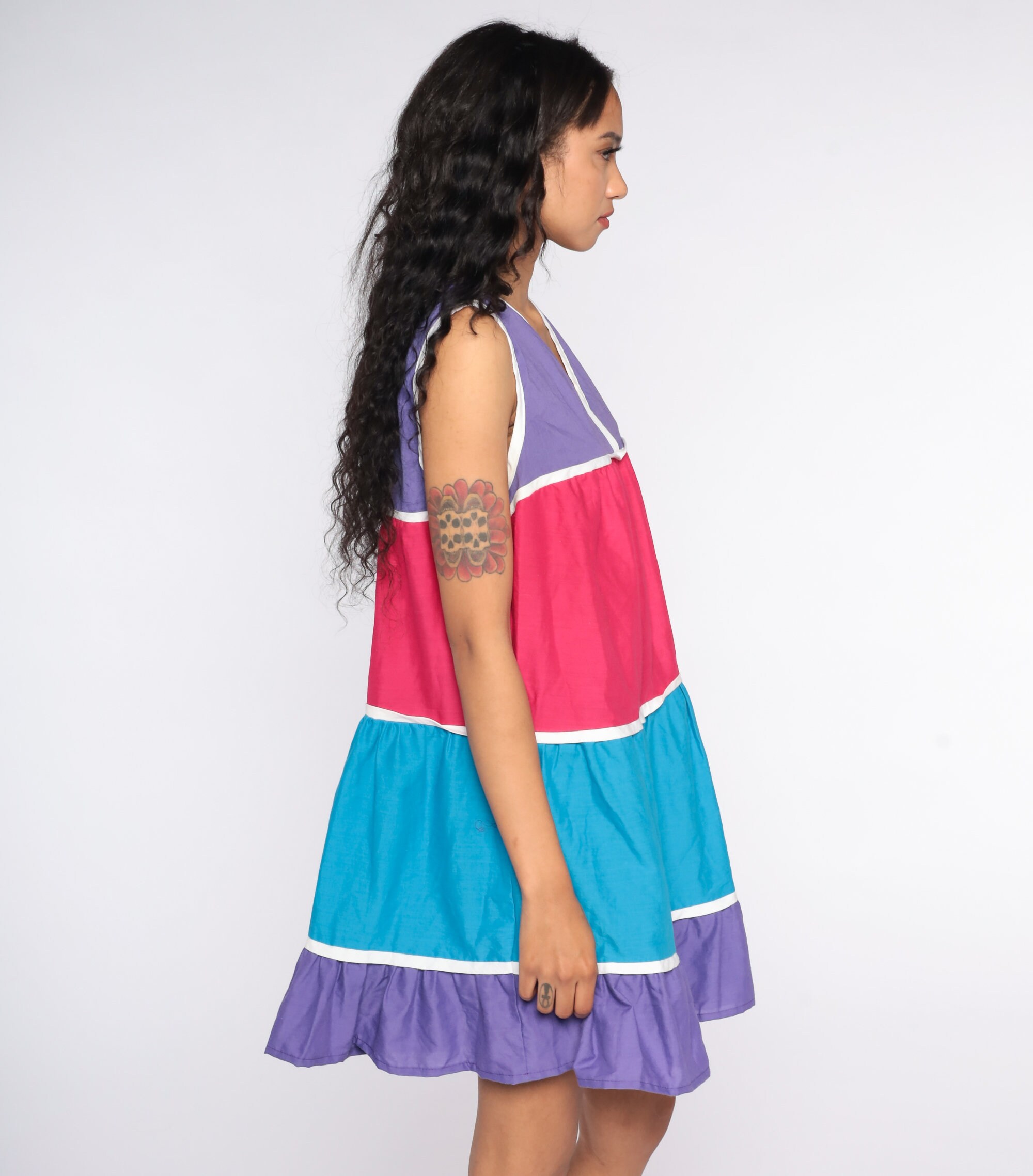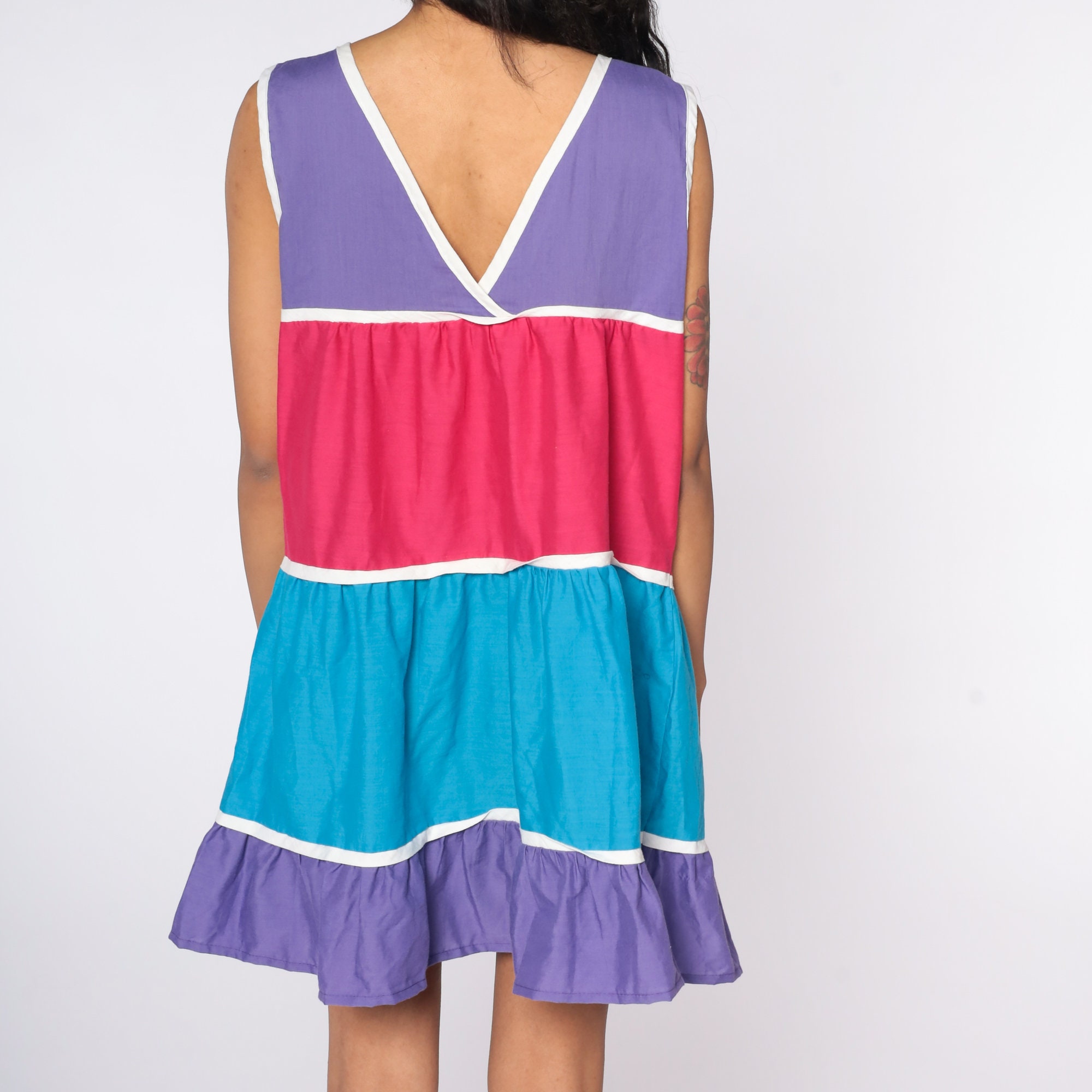 Vintage 80s dress with tiered colour blocking and a tent cut. Mini length.