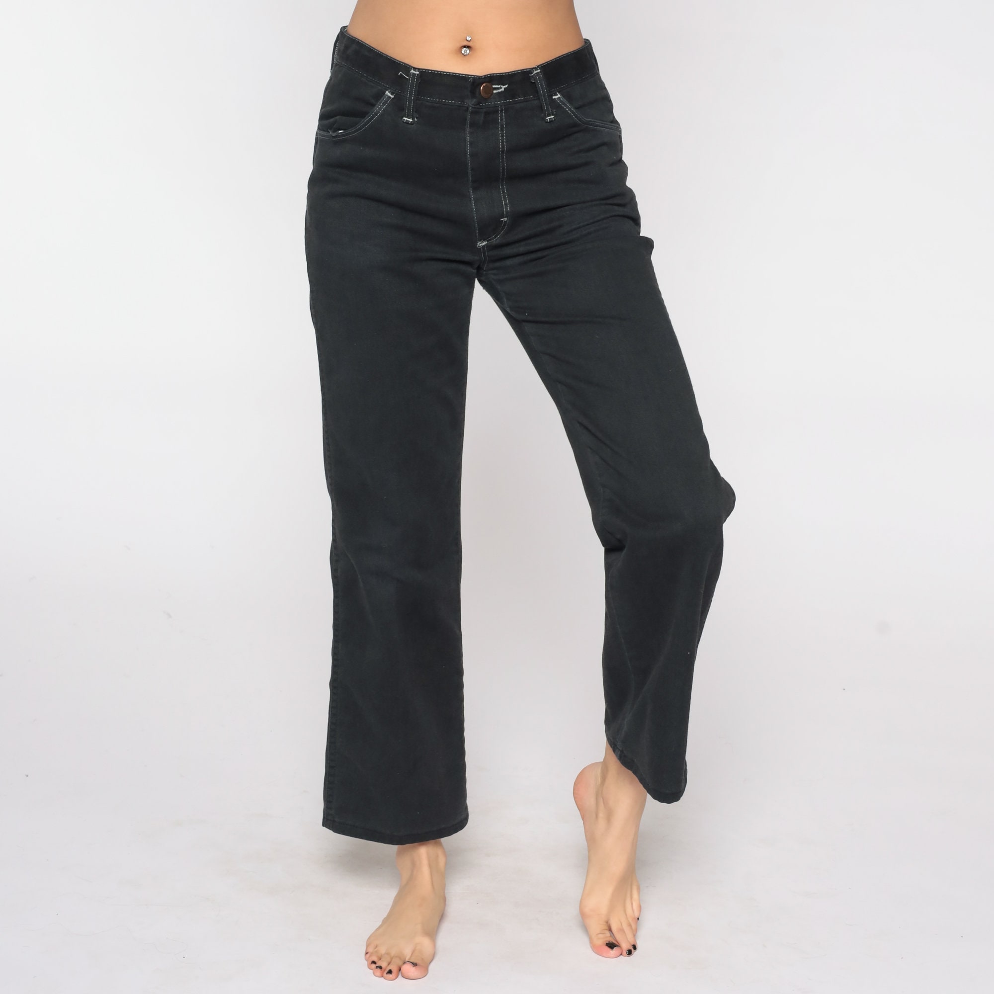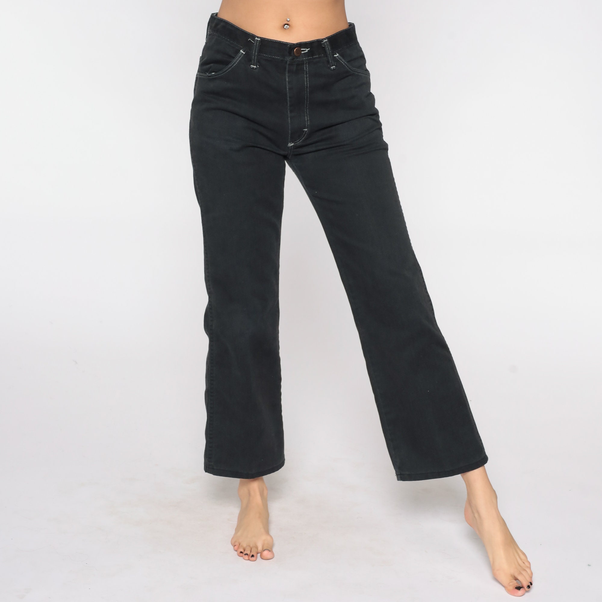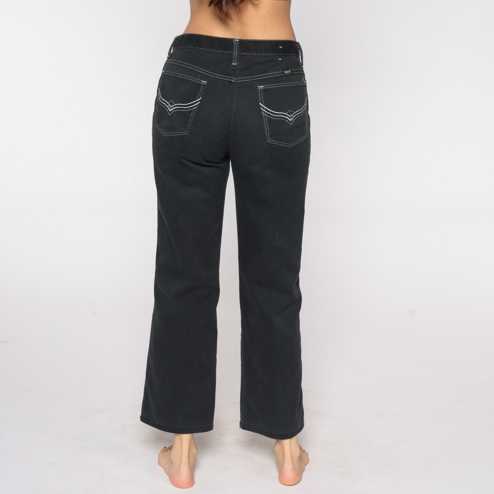 Vintage 70s 80s jeans in black with a high waist and a bootcut leg.