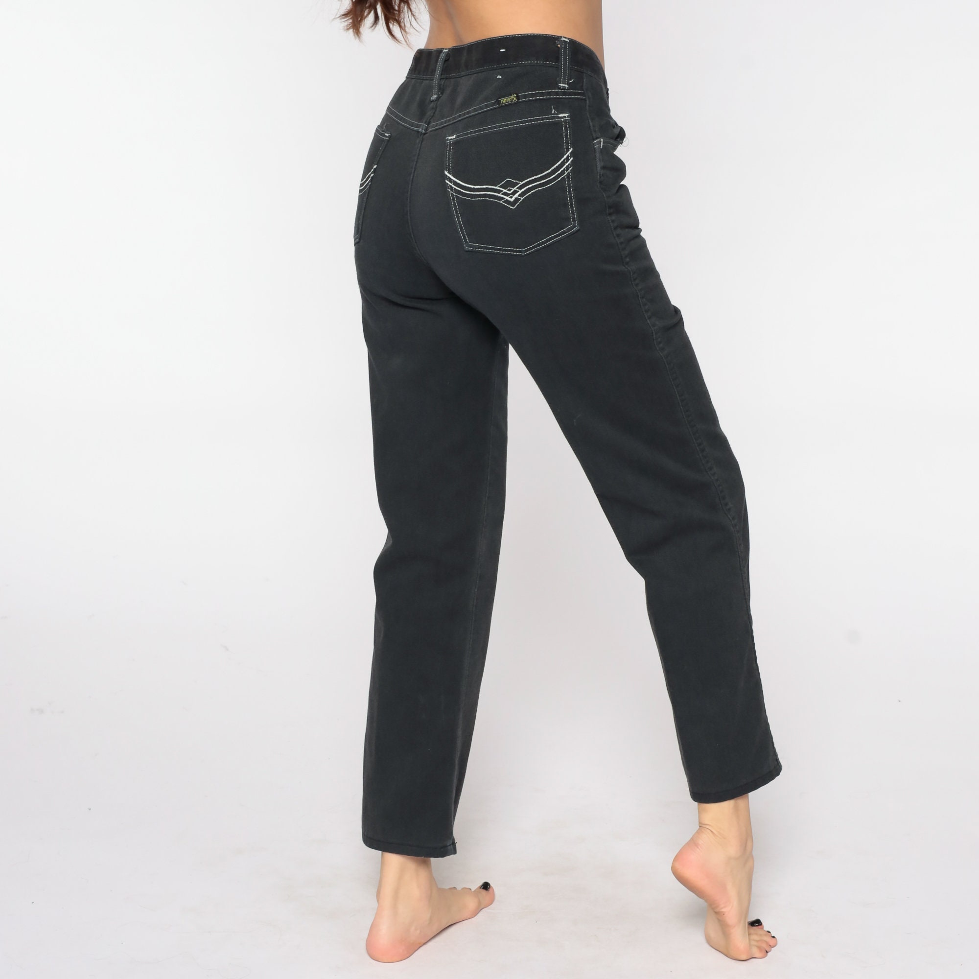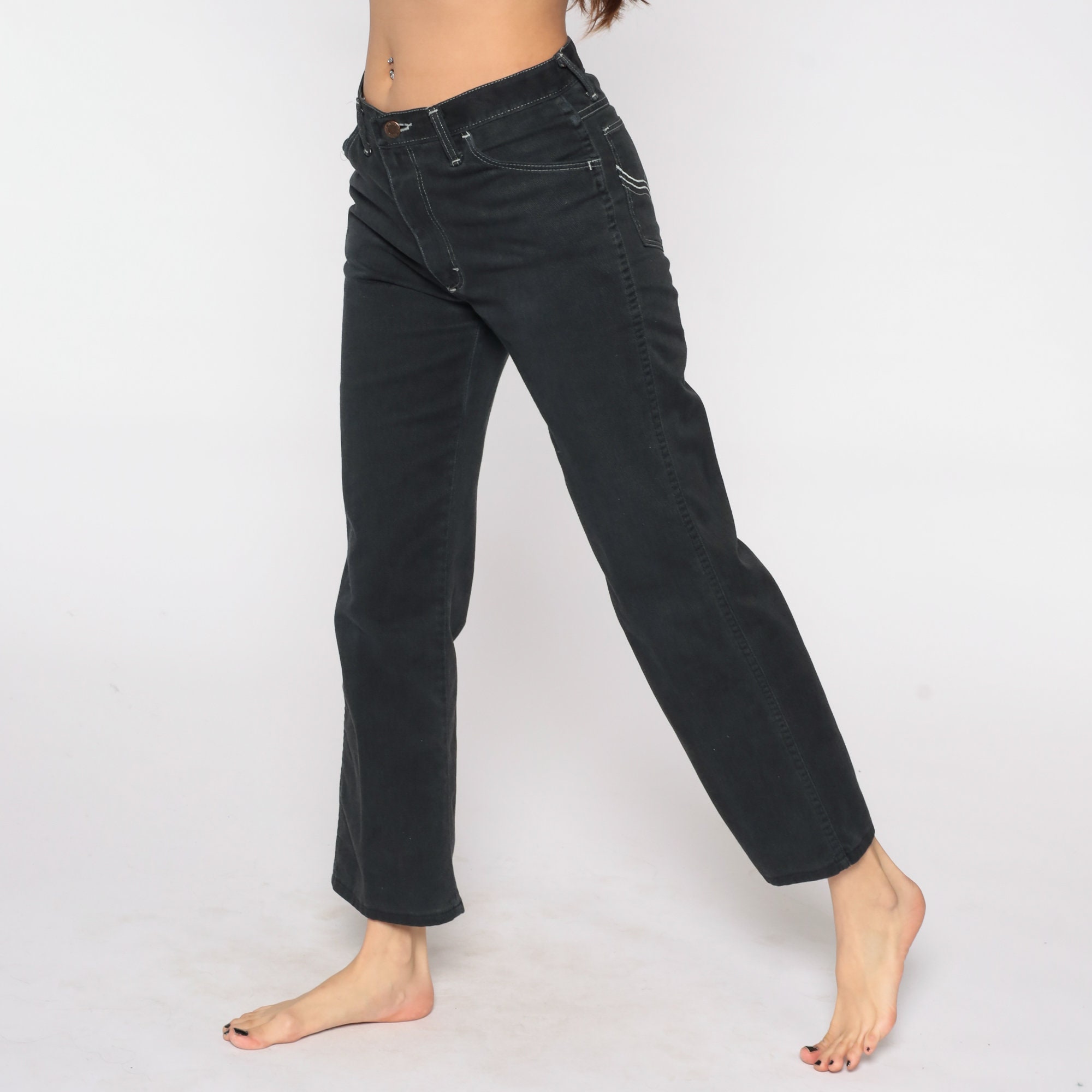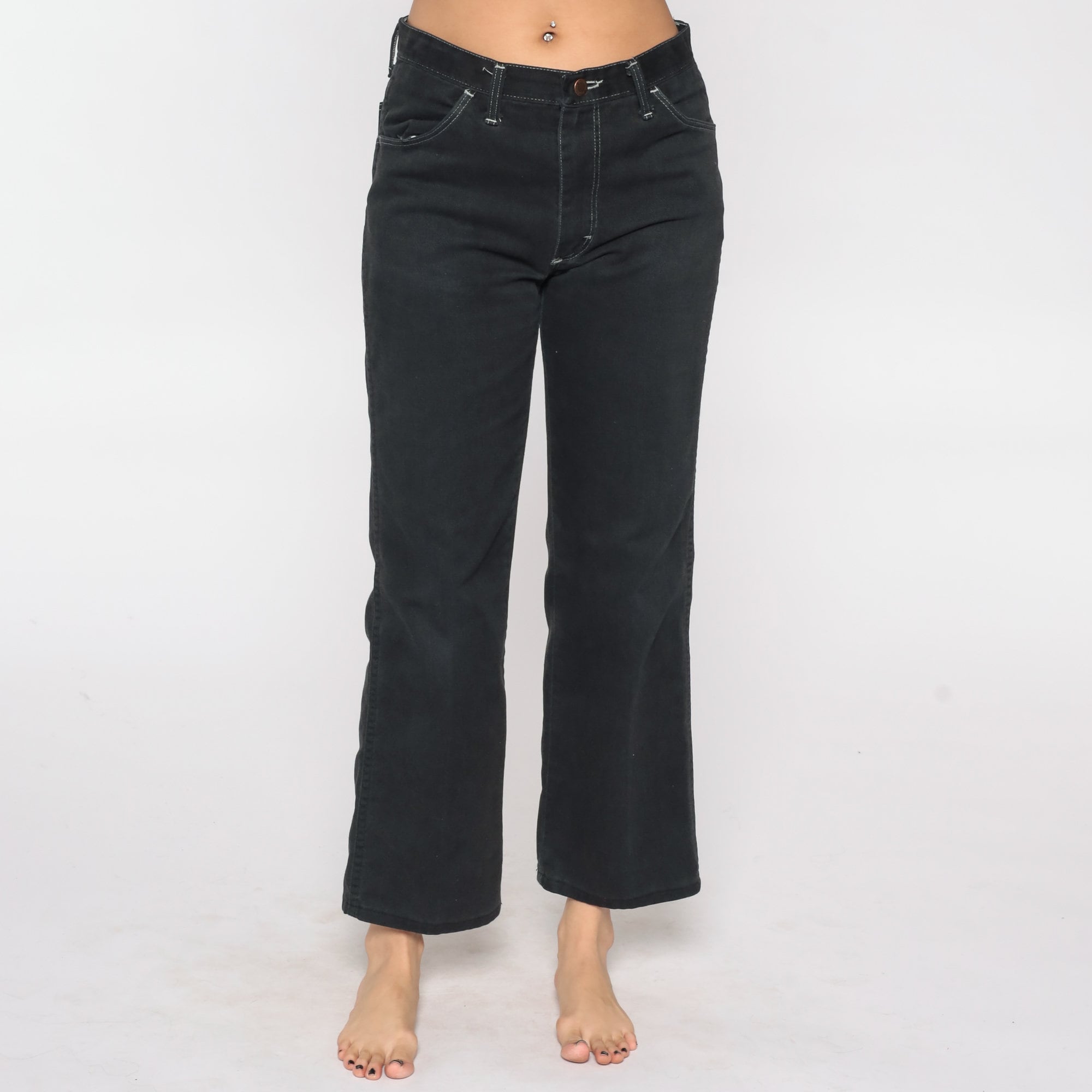 Vintage 70s 80s jeans in black with a high waist and a bootcut leg.