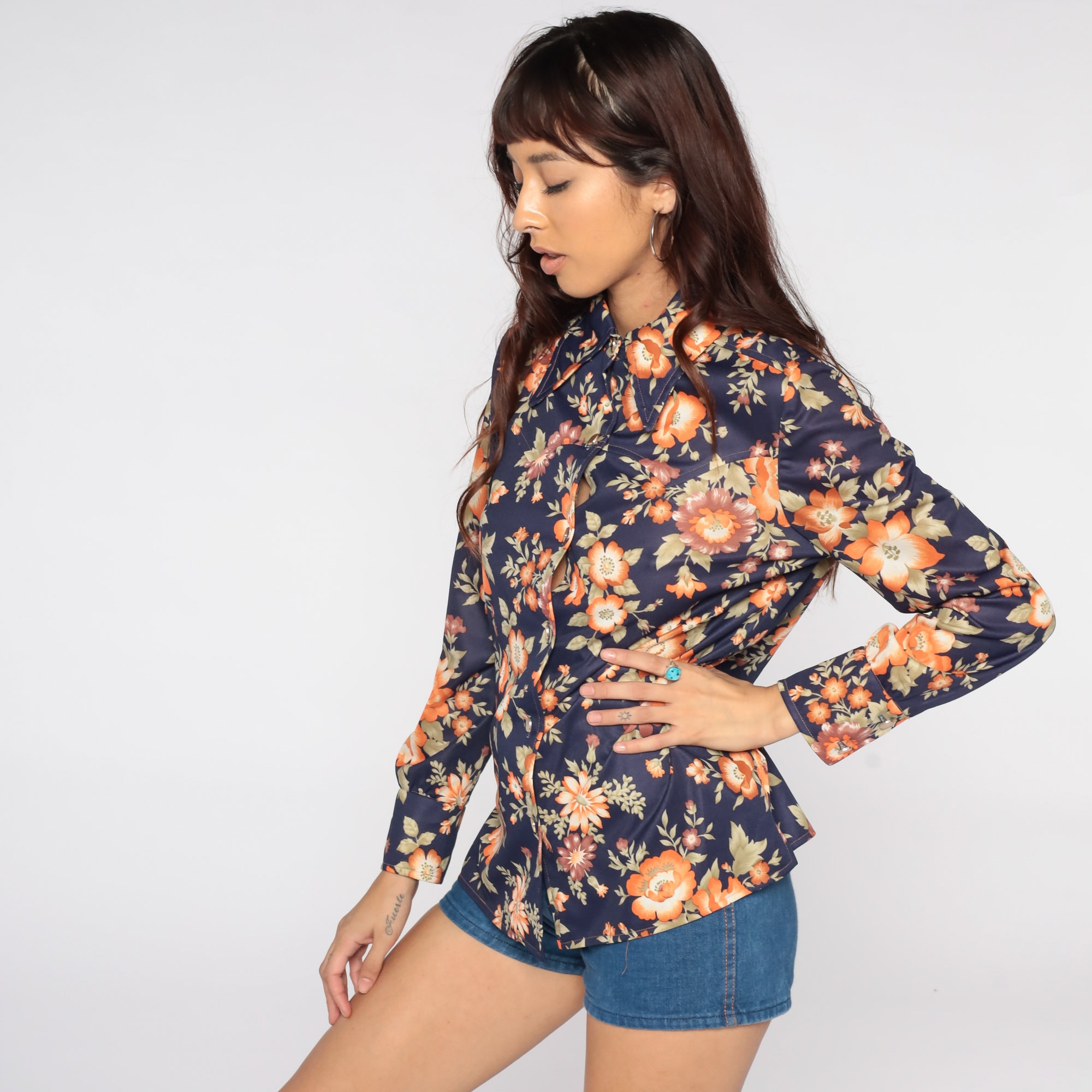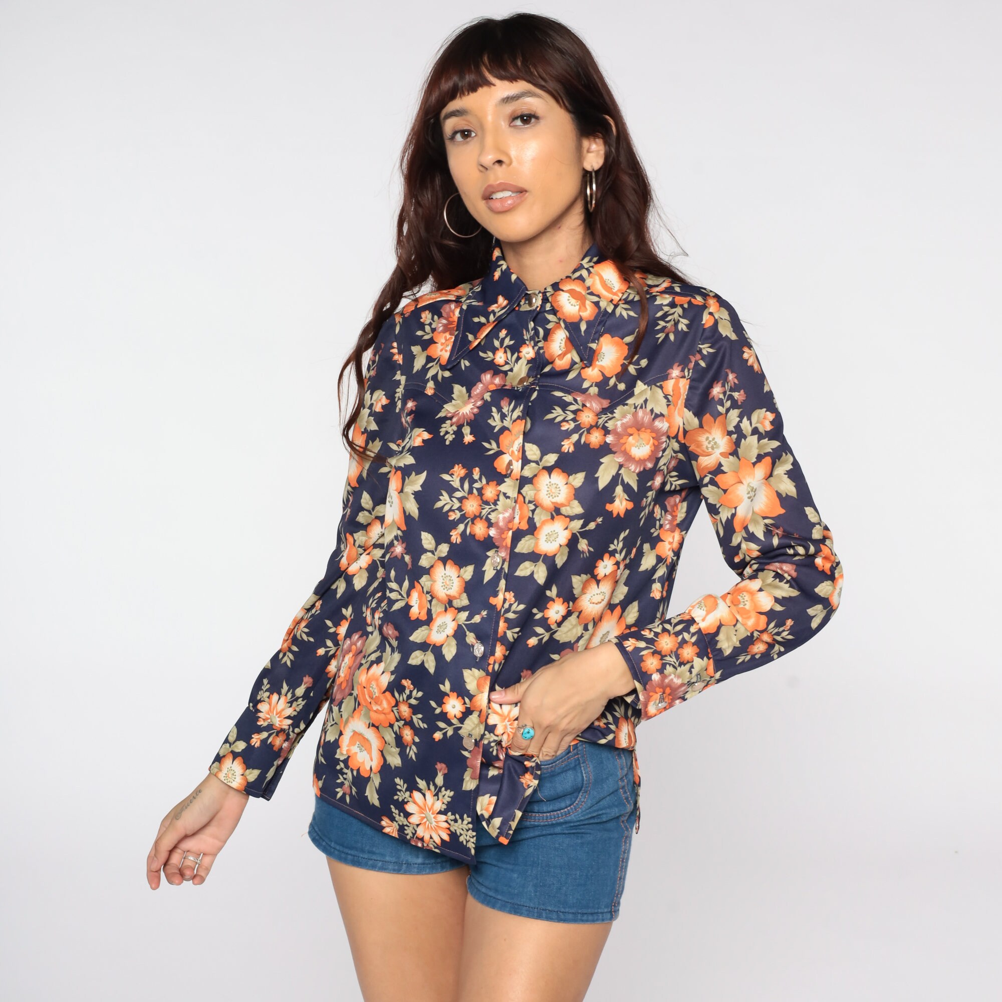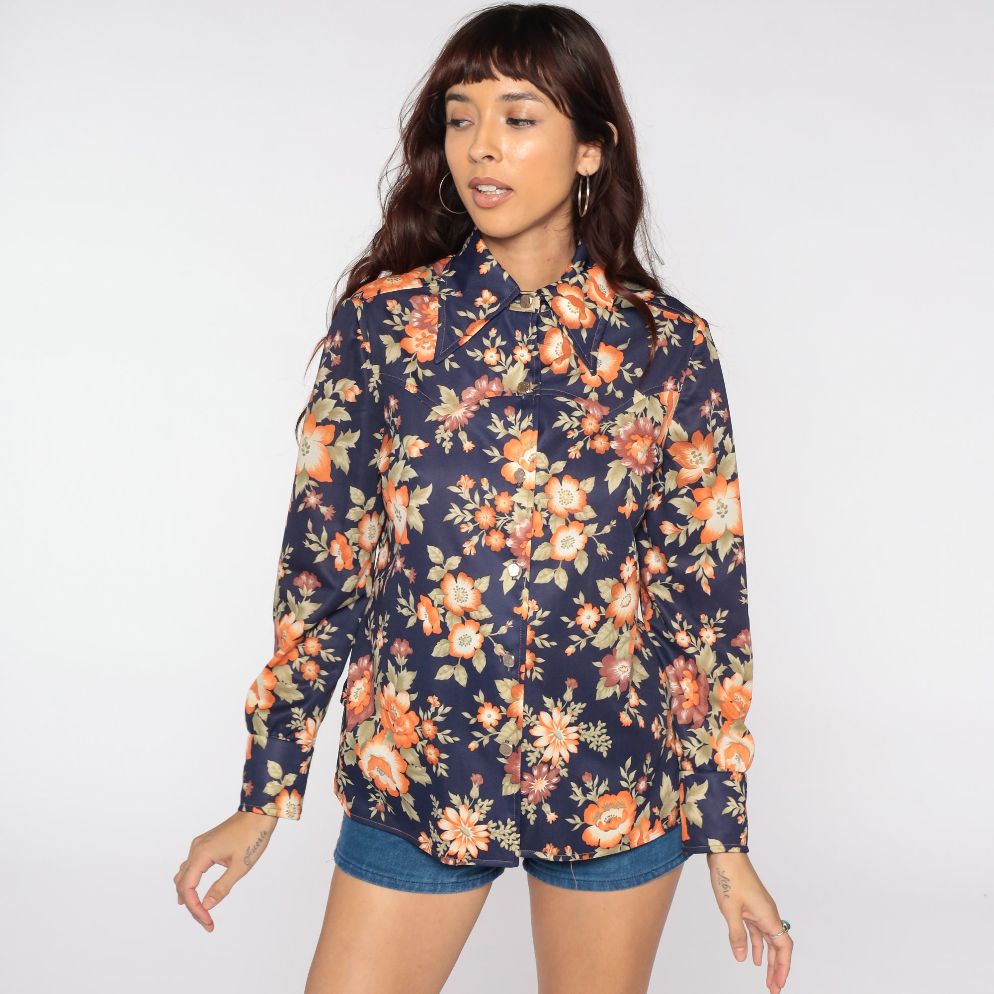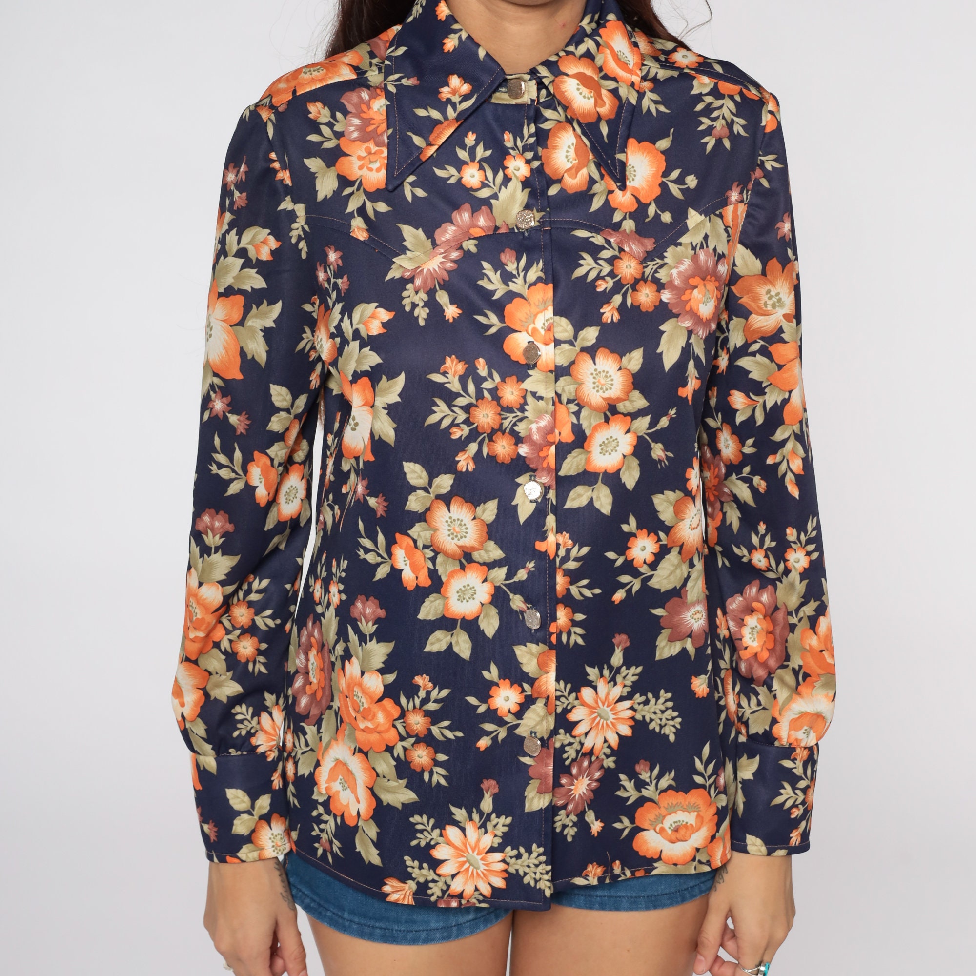 Vintage 70s shirt with a blue flower print. Buttons up the front with long sleeves and a pointed collar.