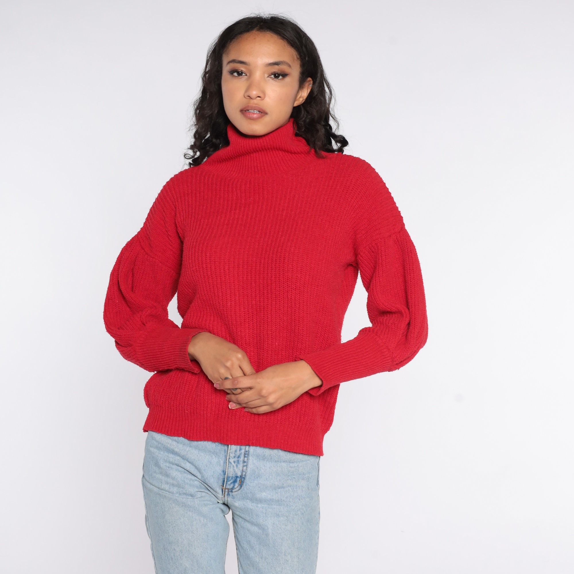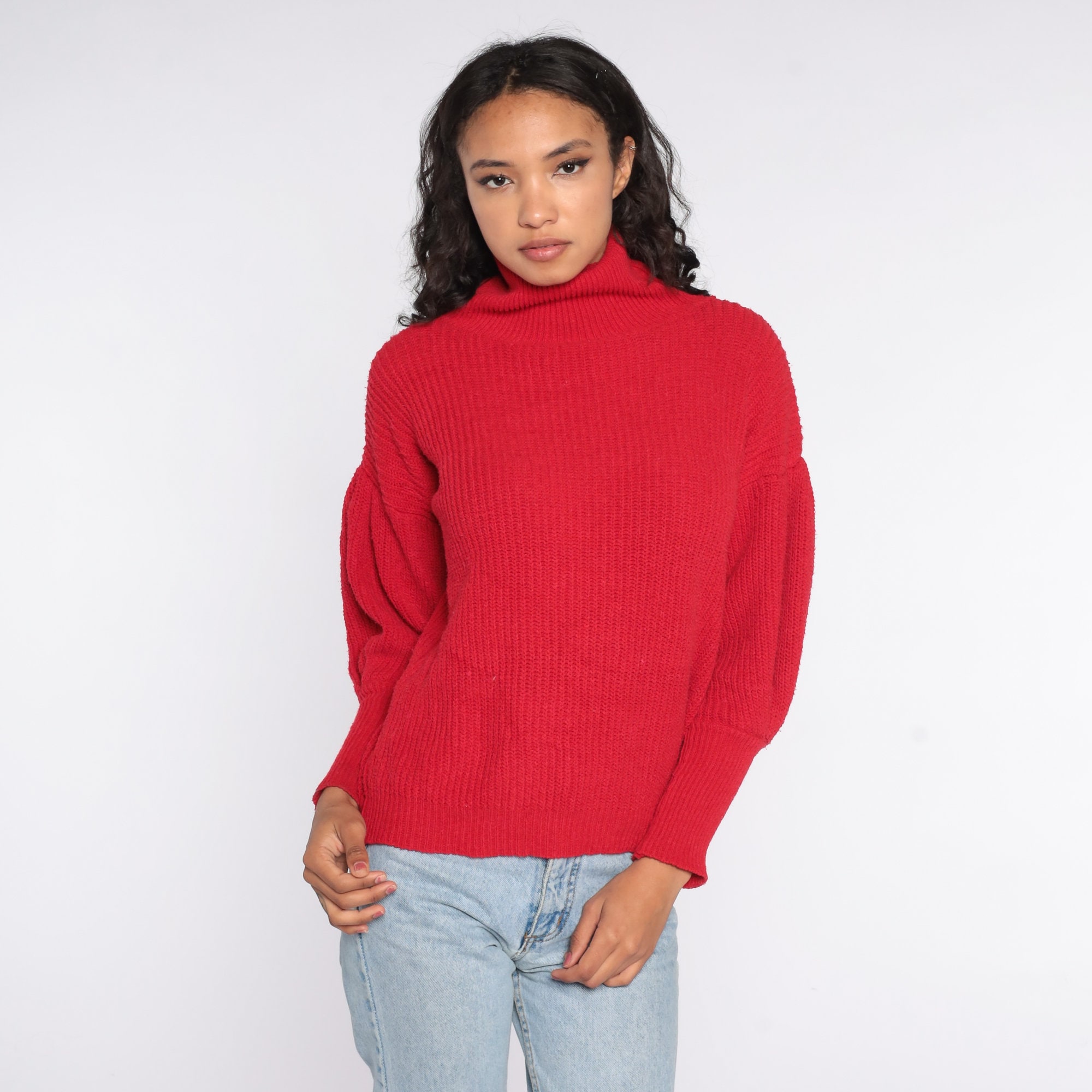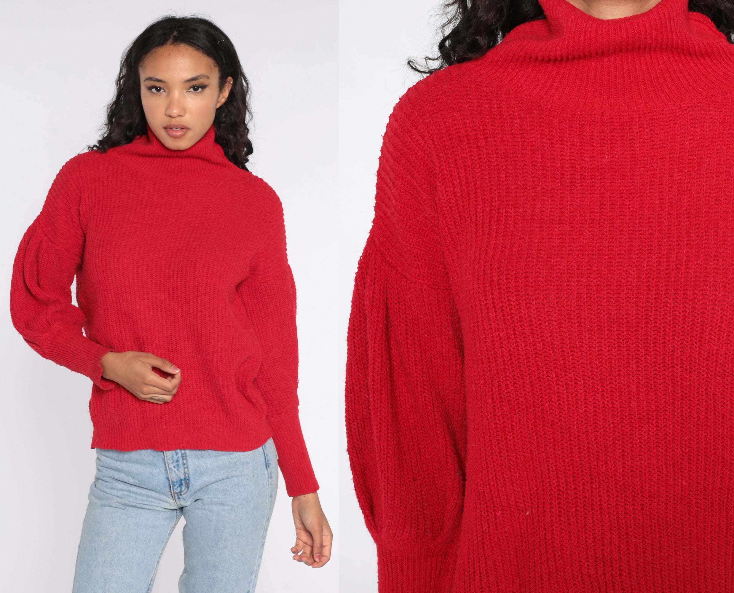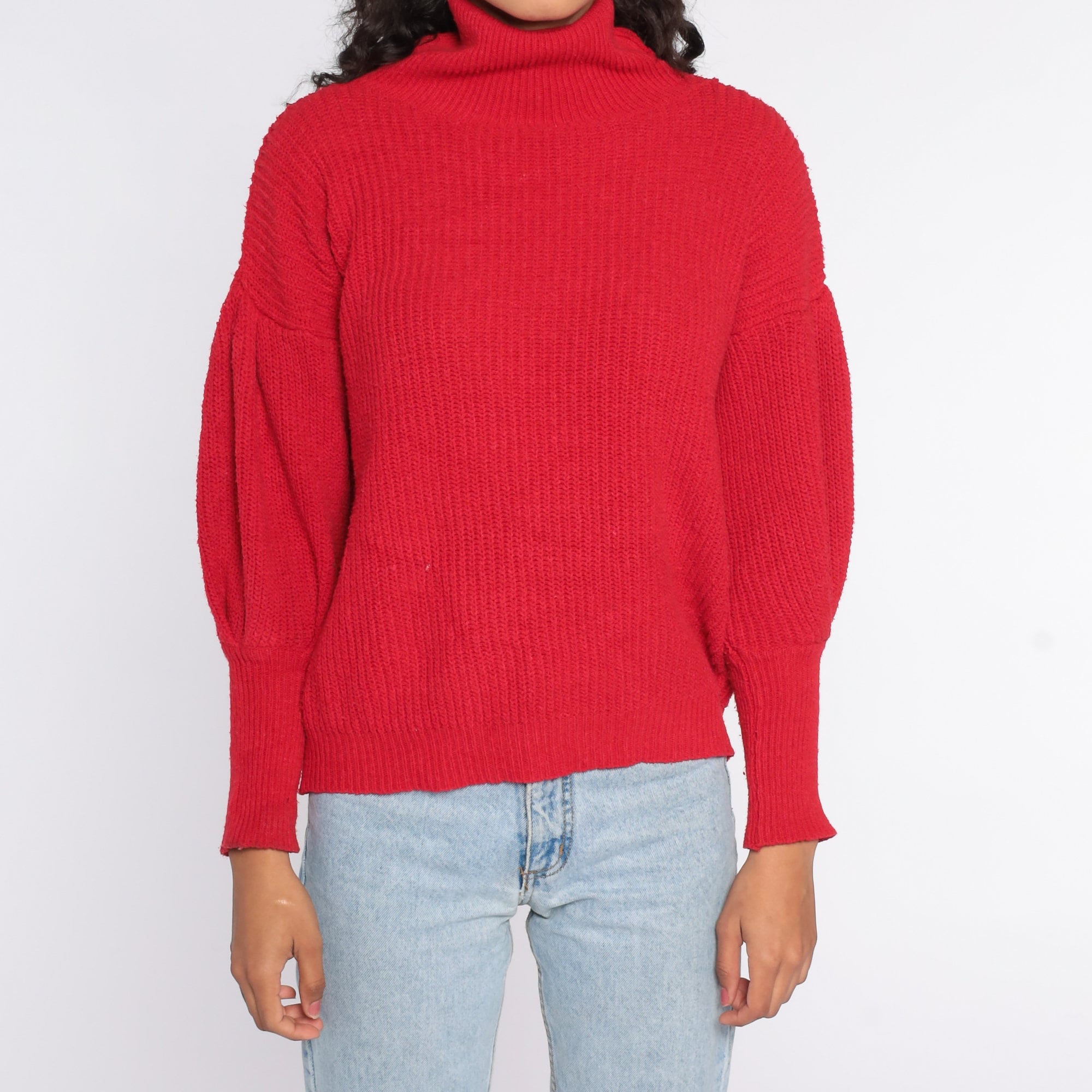 Vintage 80s sweater in red knit with a mock neck and balloon sleeves.