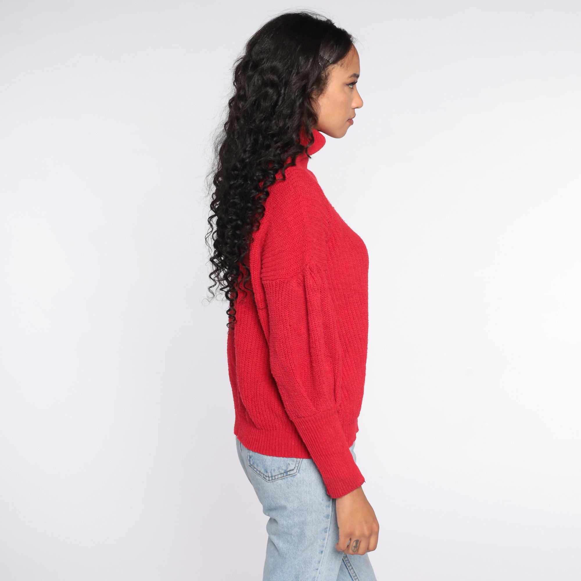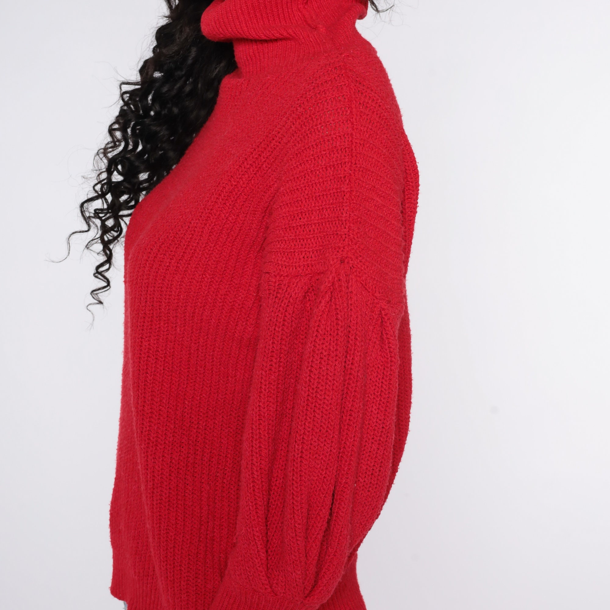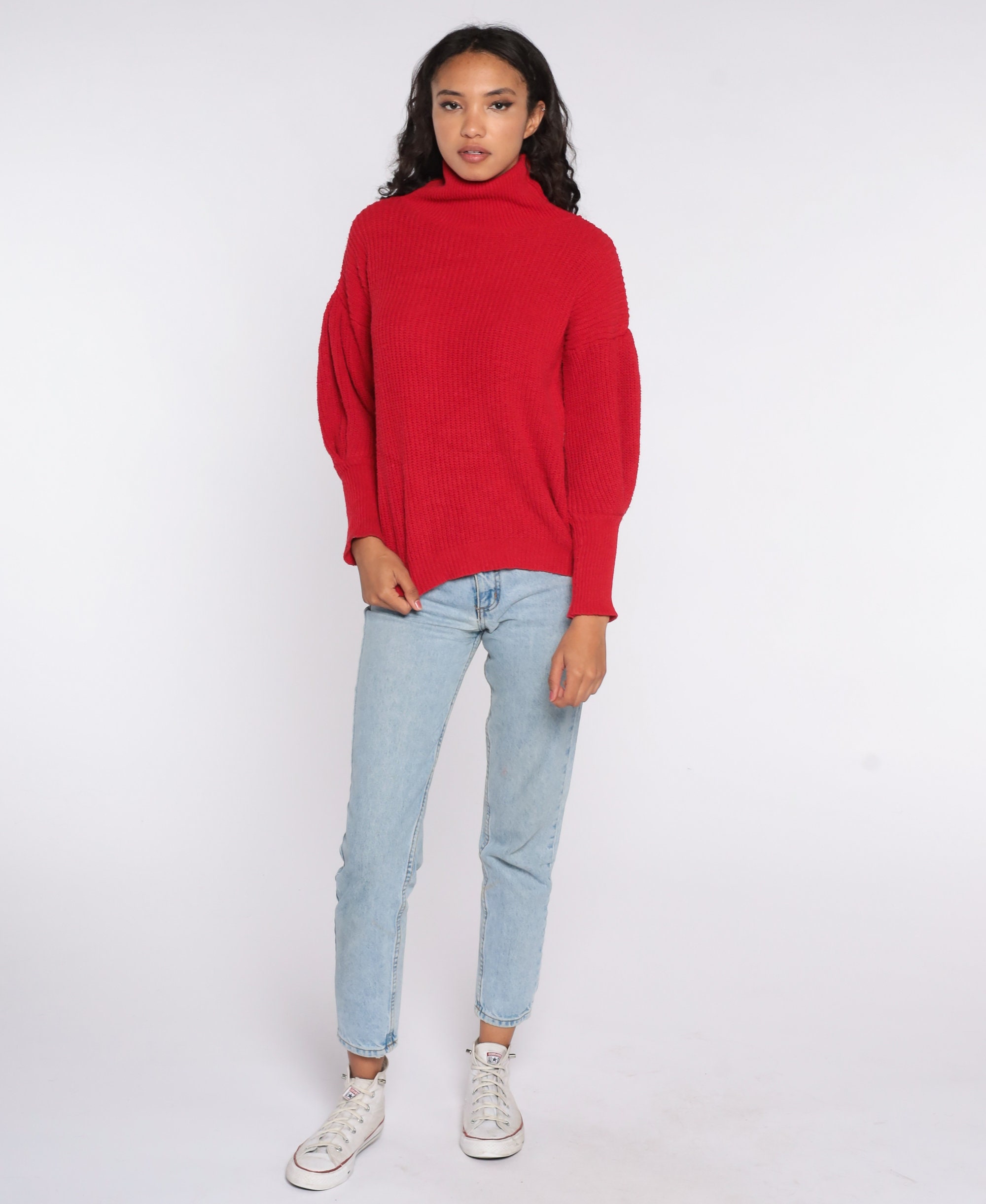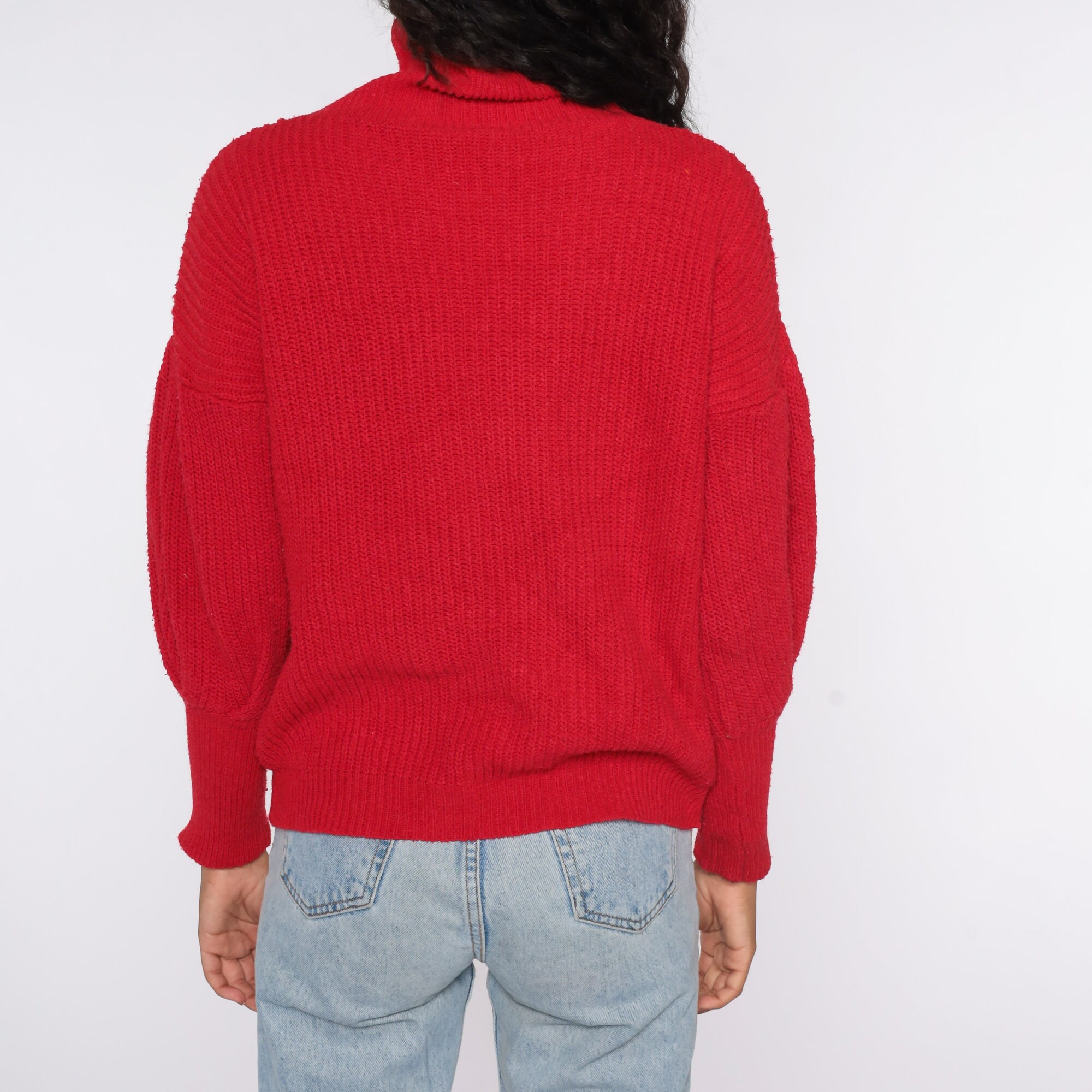 Vintage 80s sweater in red knit with a mock neck and balloon sleeves.