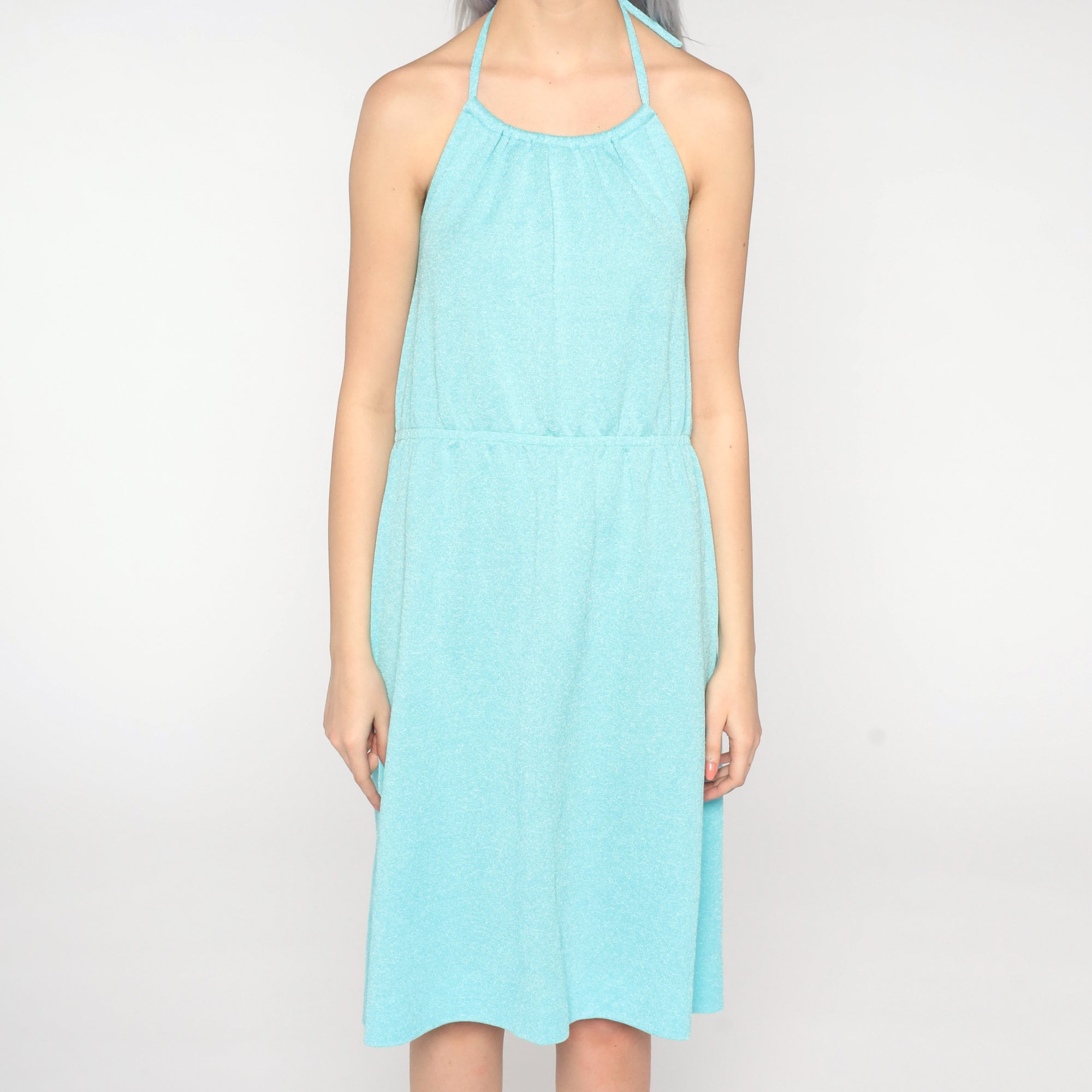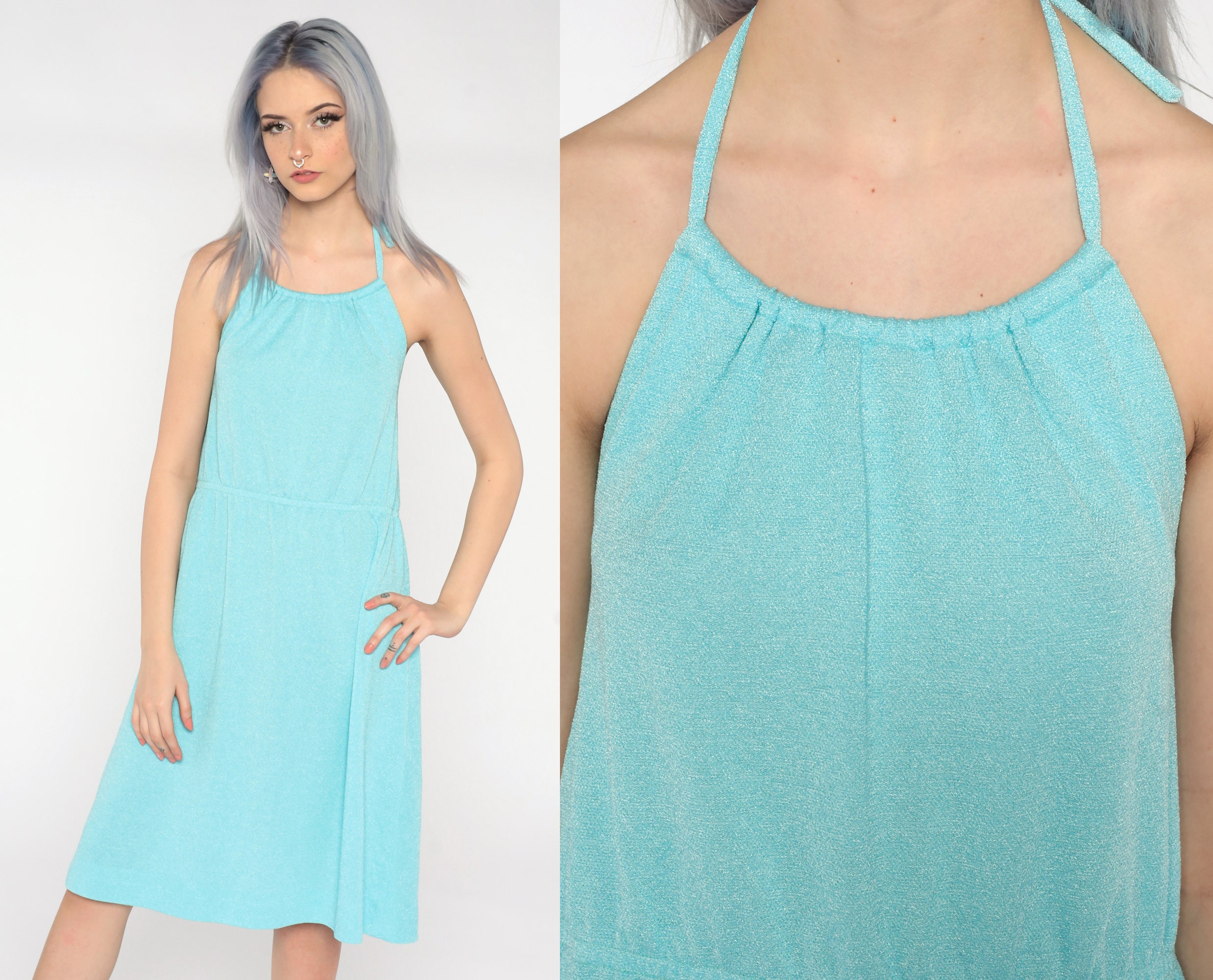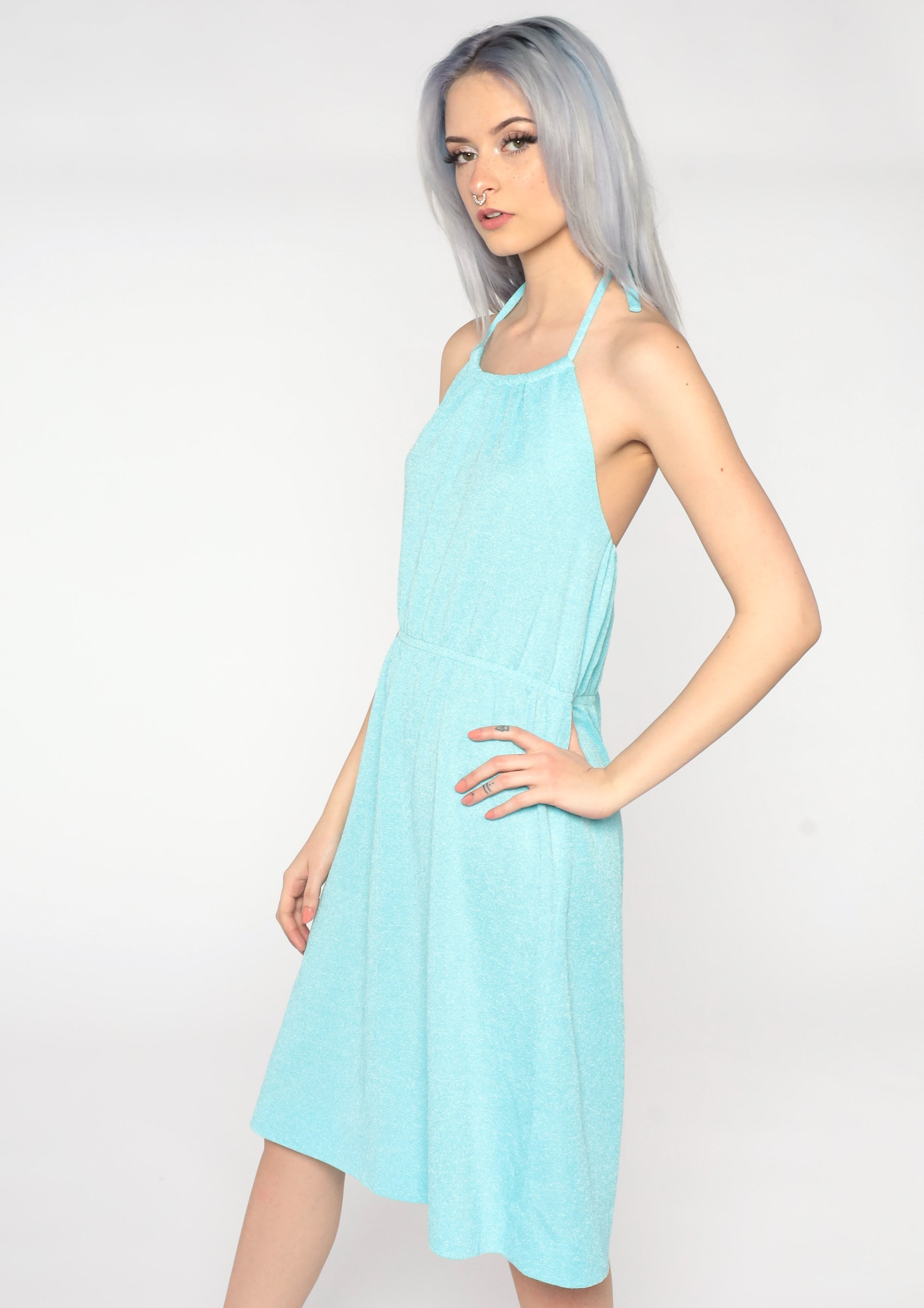 Vintage 70s dress in blue. It has a halter neck, a high elastic waist, and a midi length skirt.
