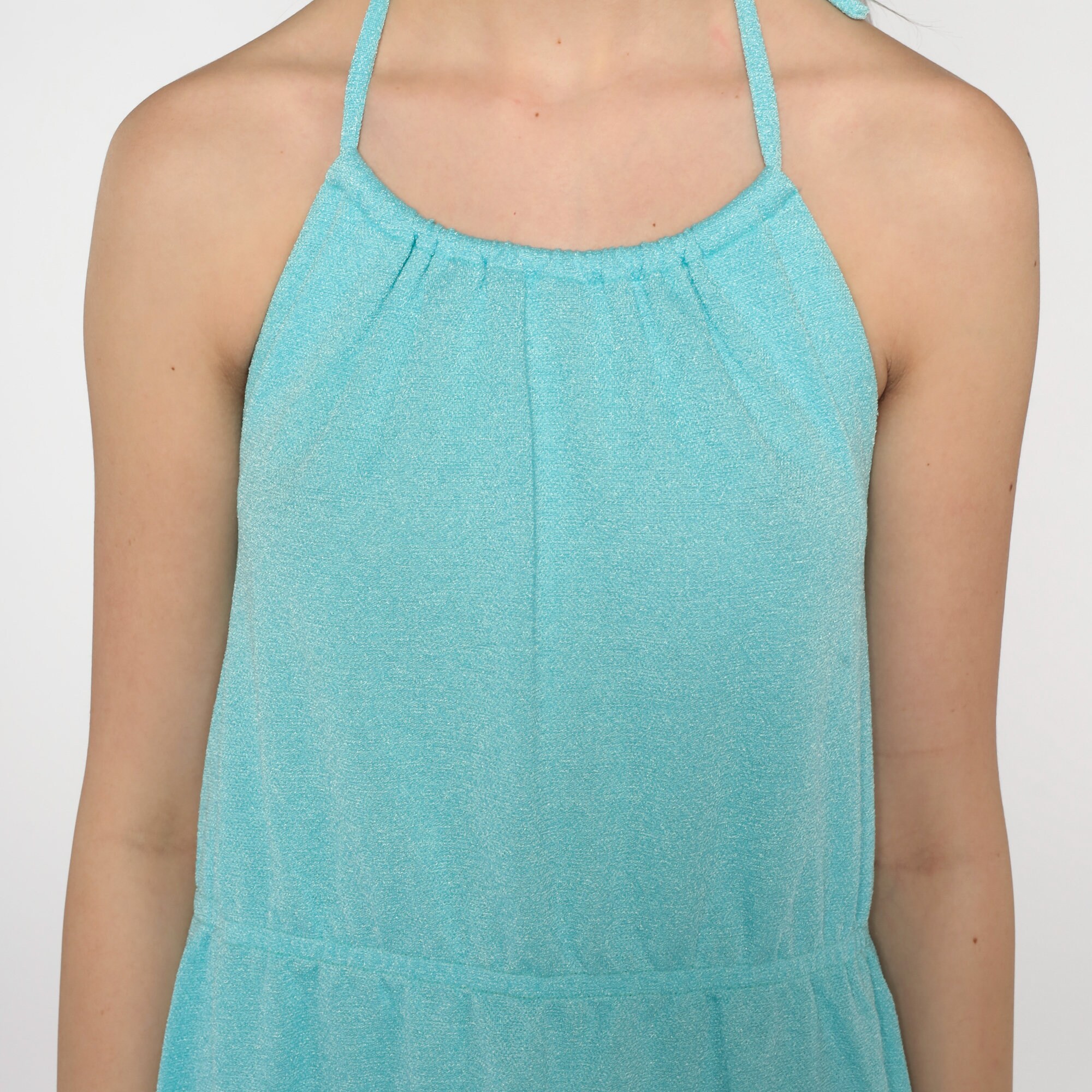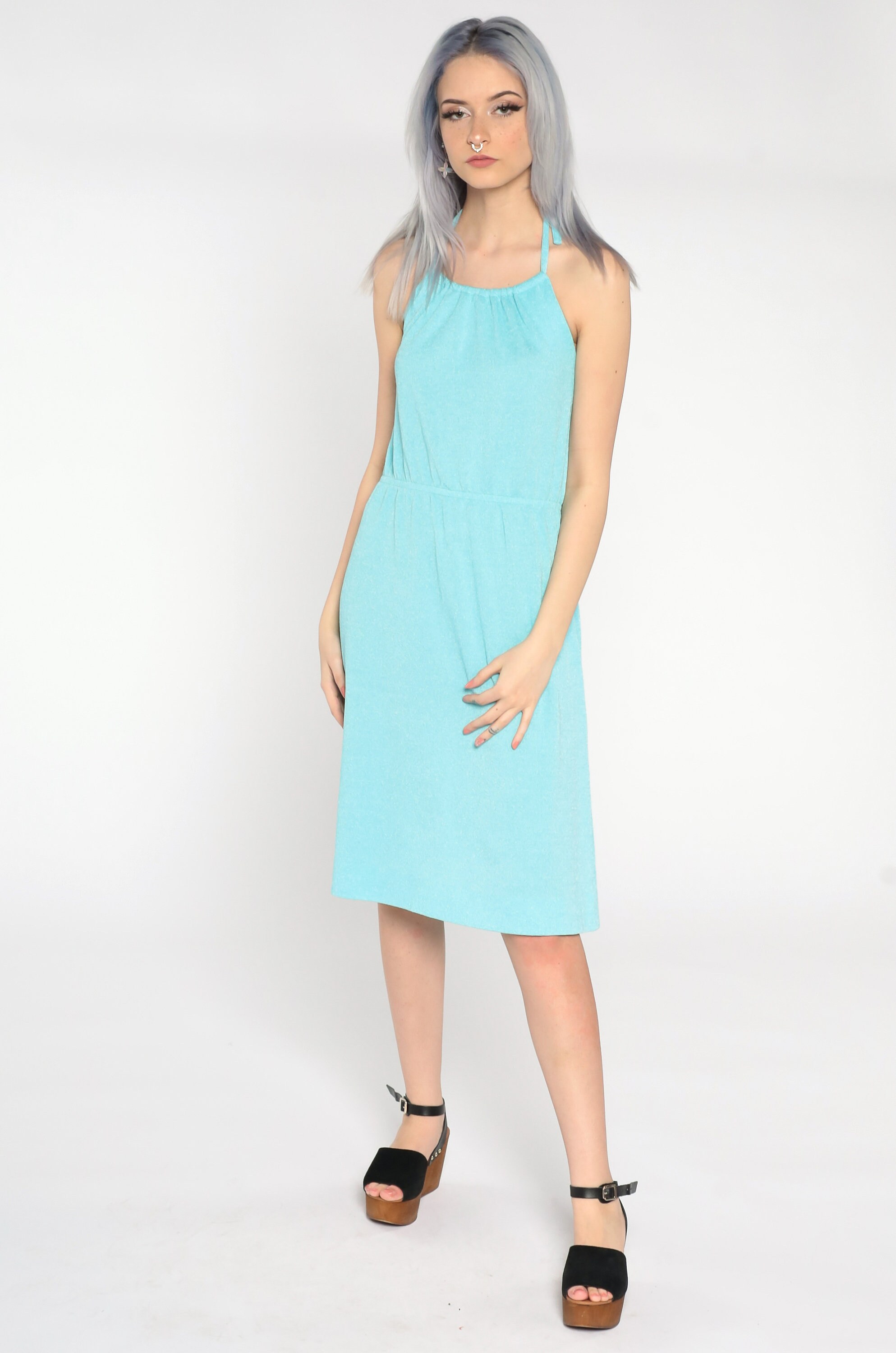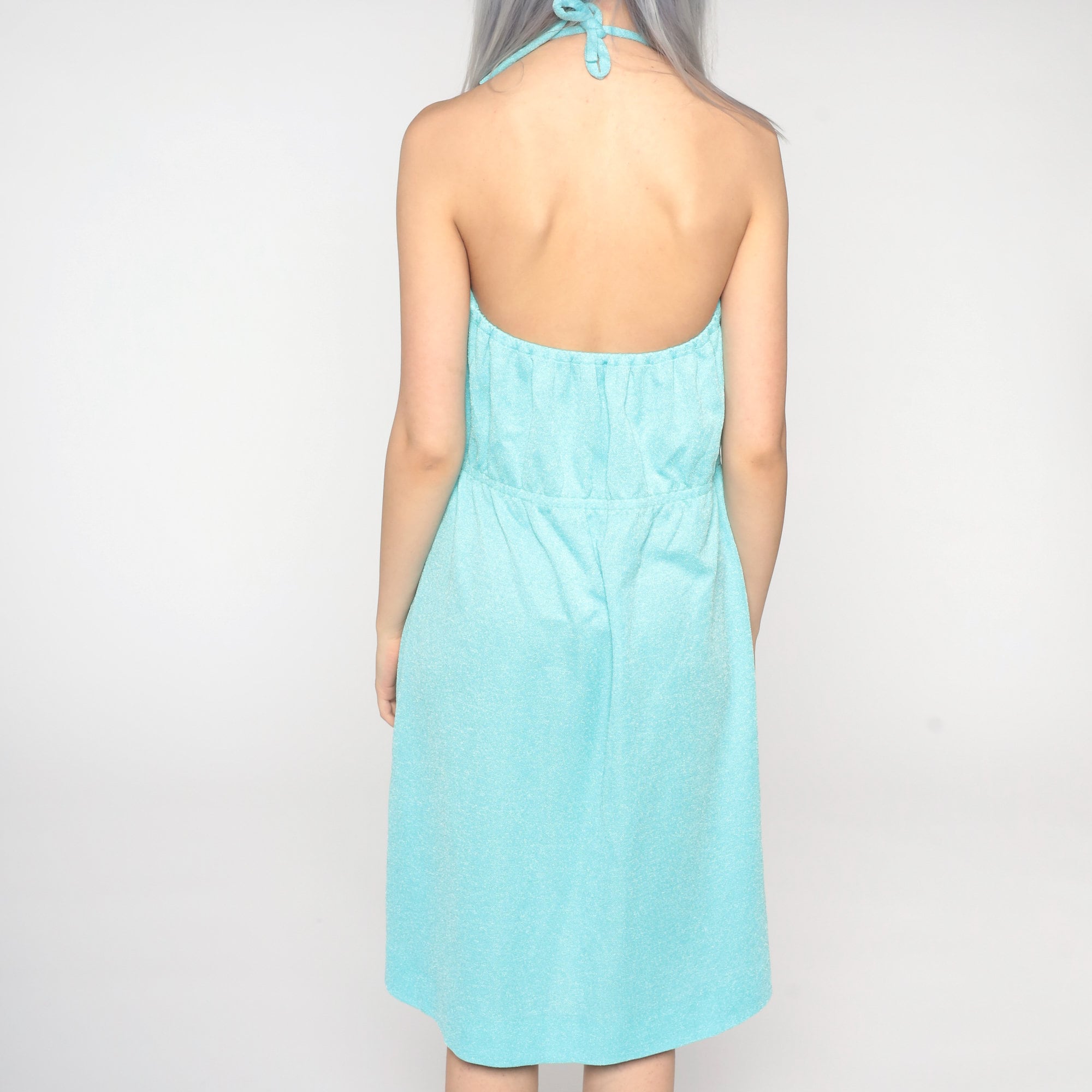 Vintage 70s dress in blue. It has a halter neck, a high elastic waist, and a midi length skirt.