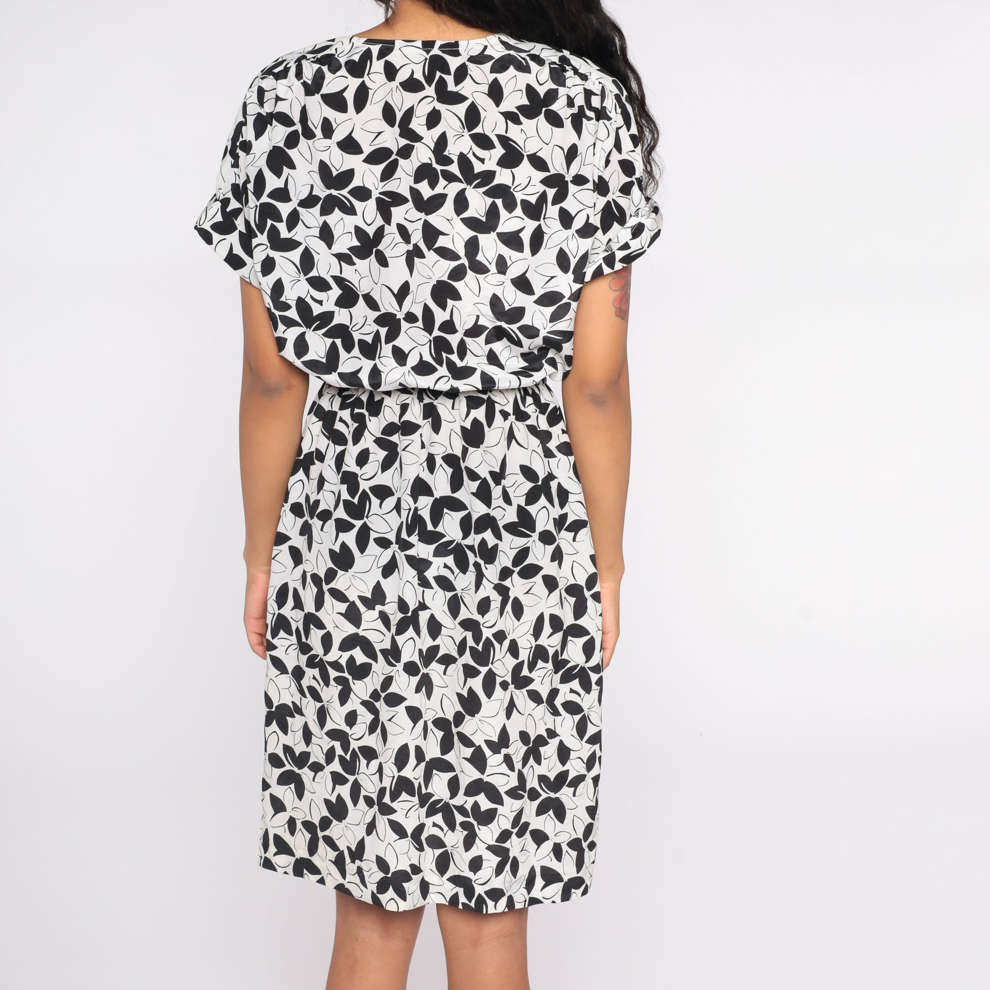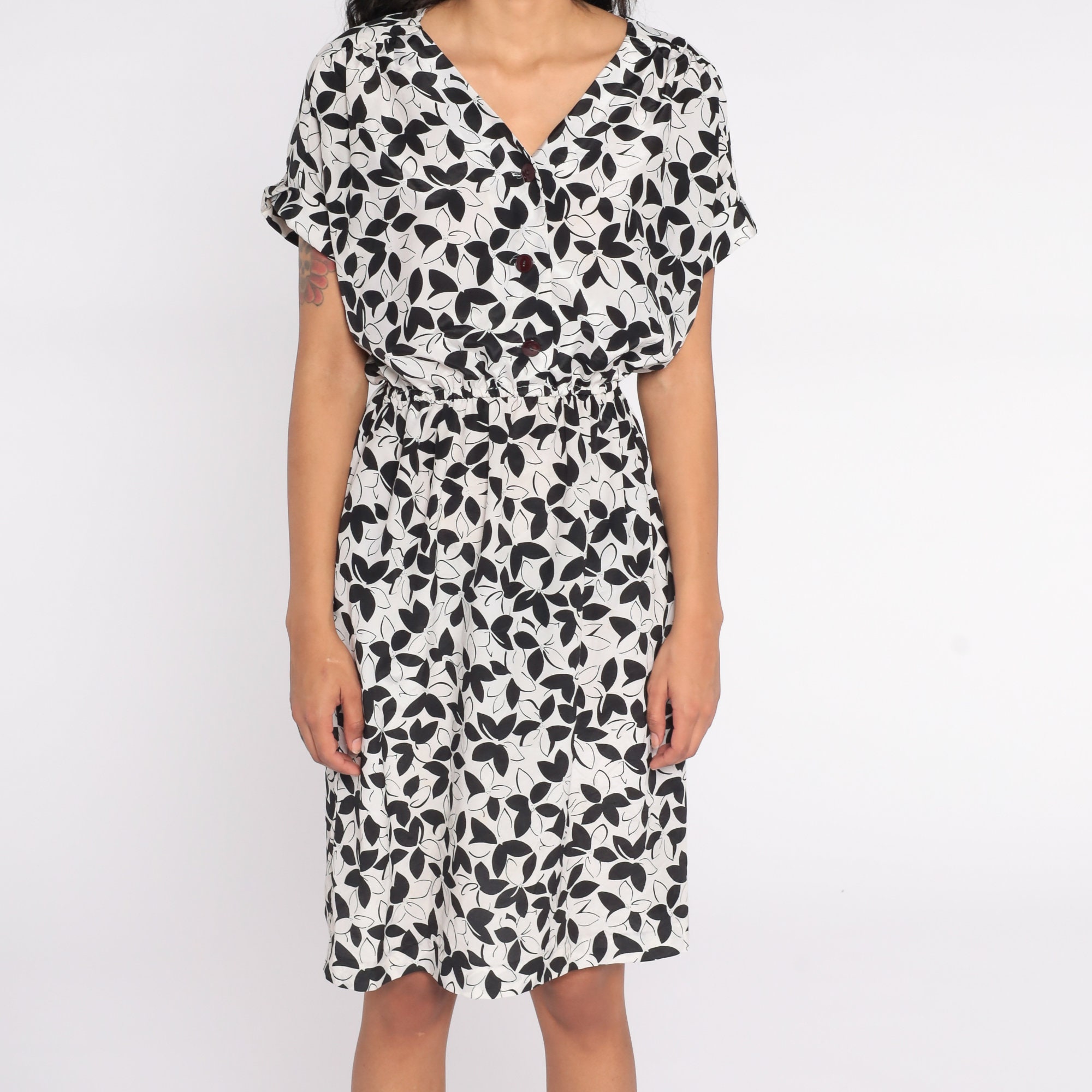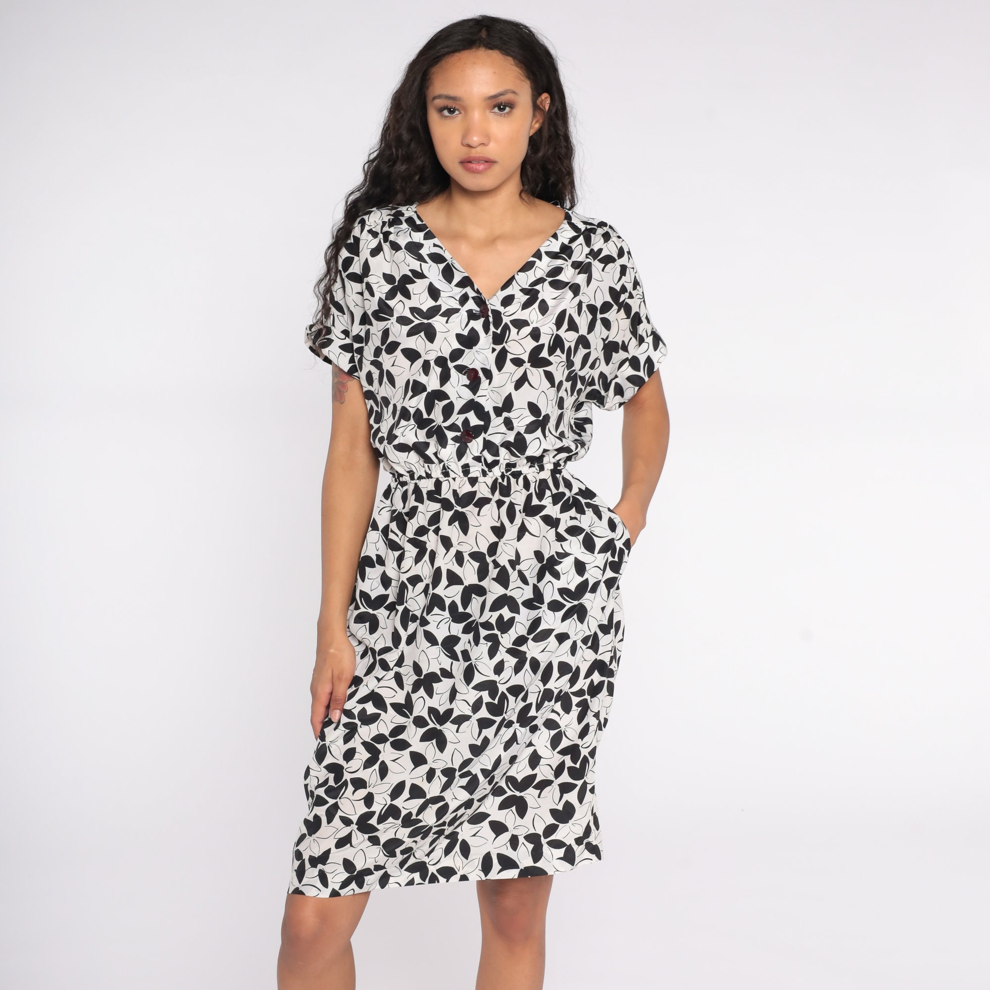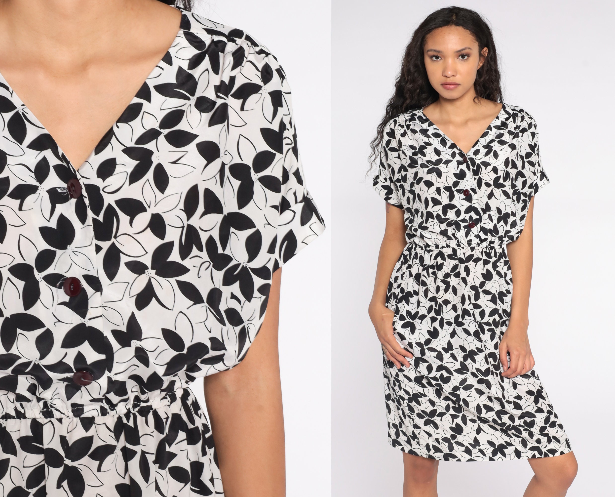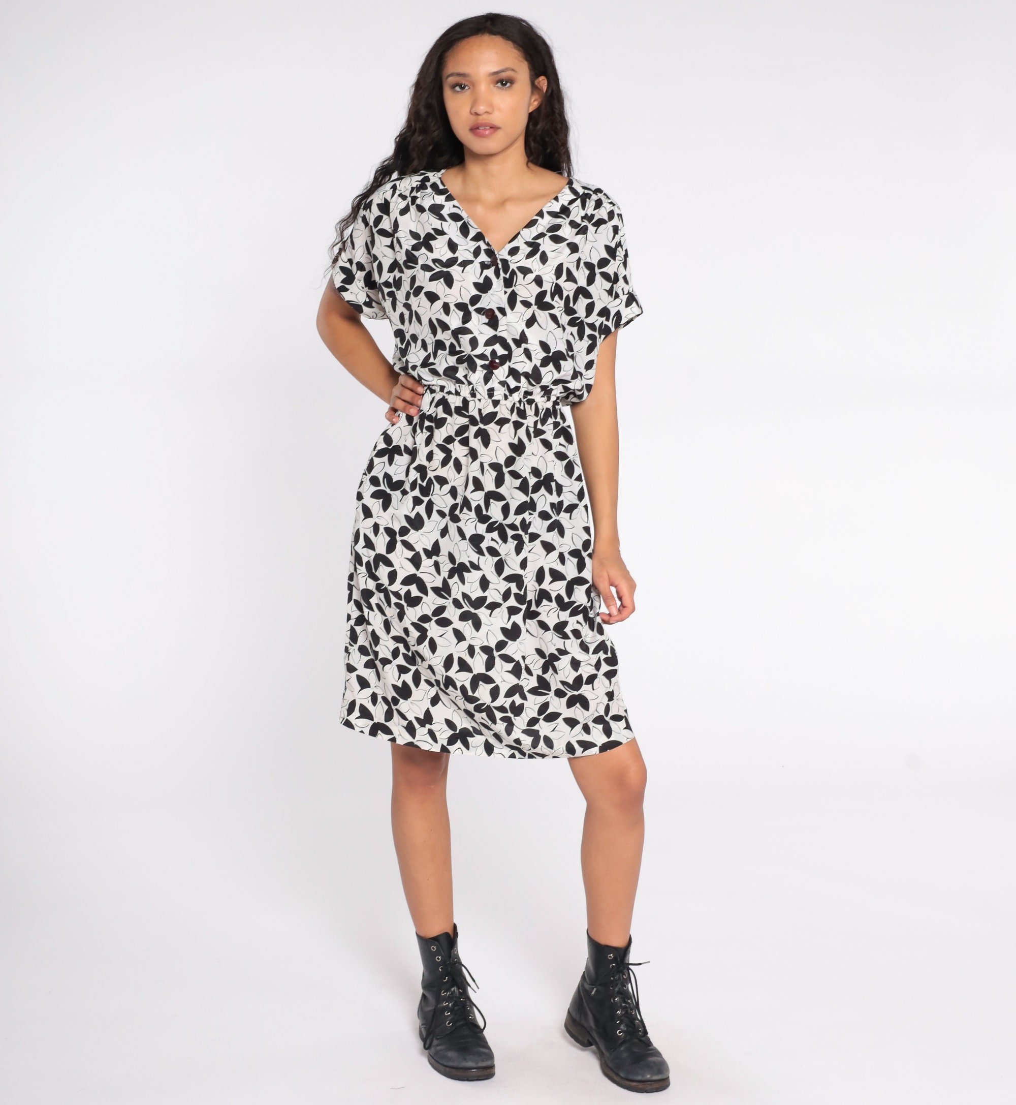 Vintage 80s dress in a black and white floral print with short sleeves and buttons up the chest.