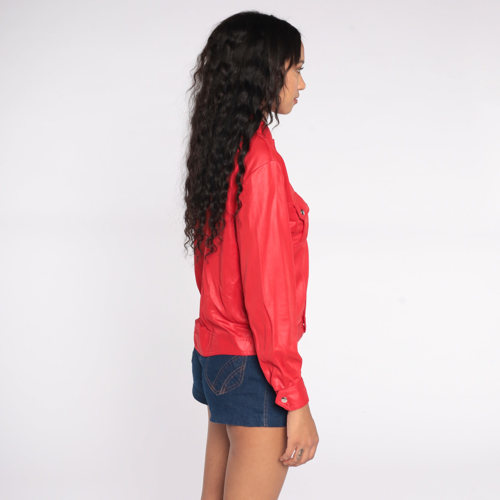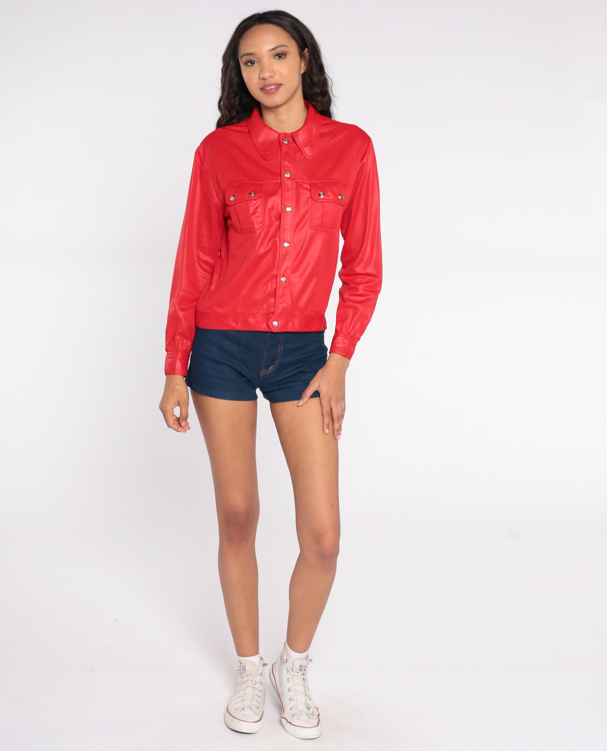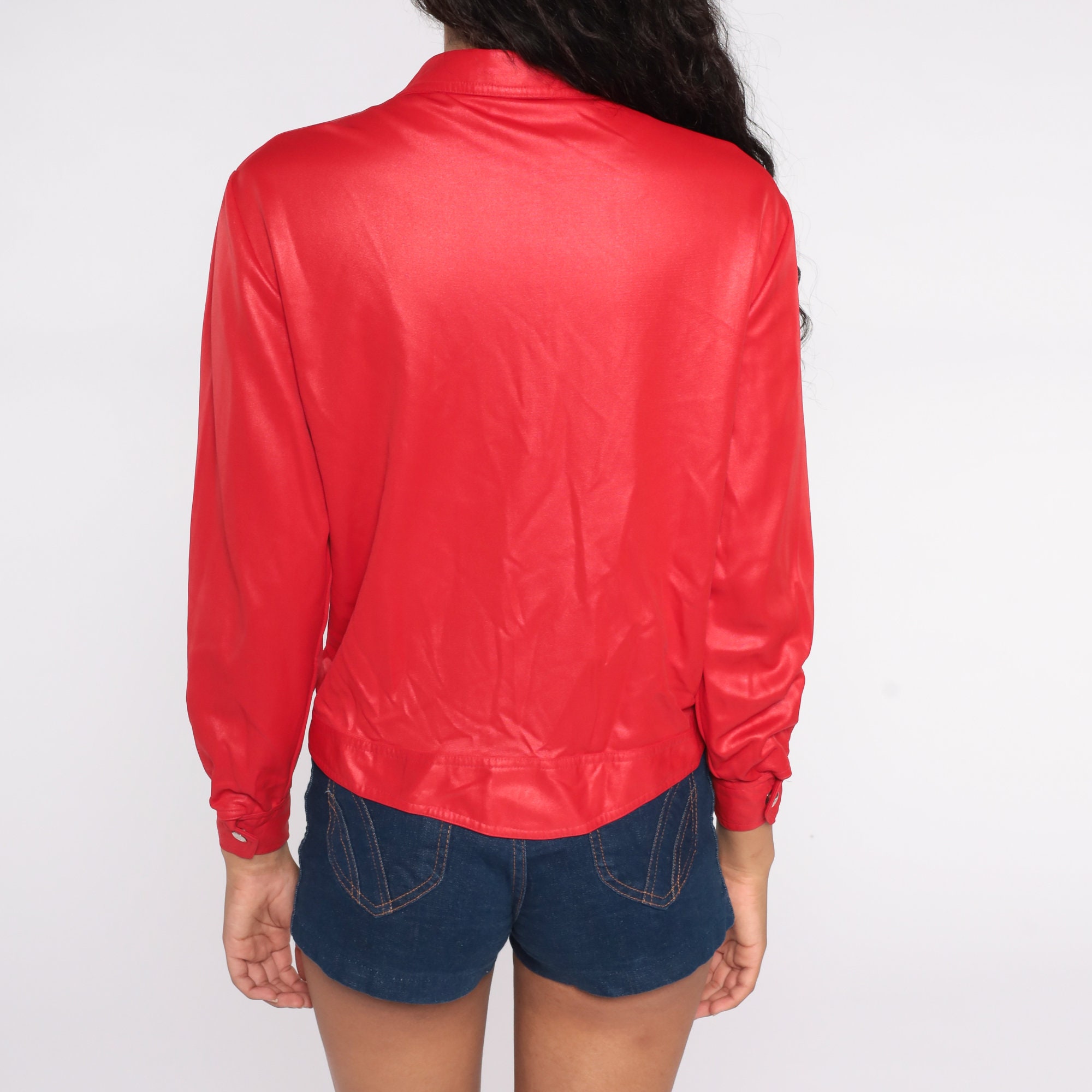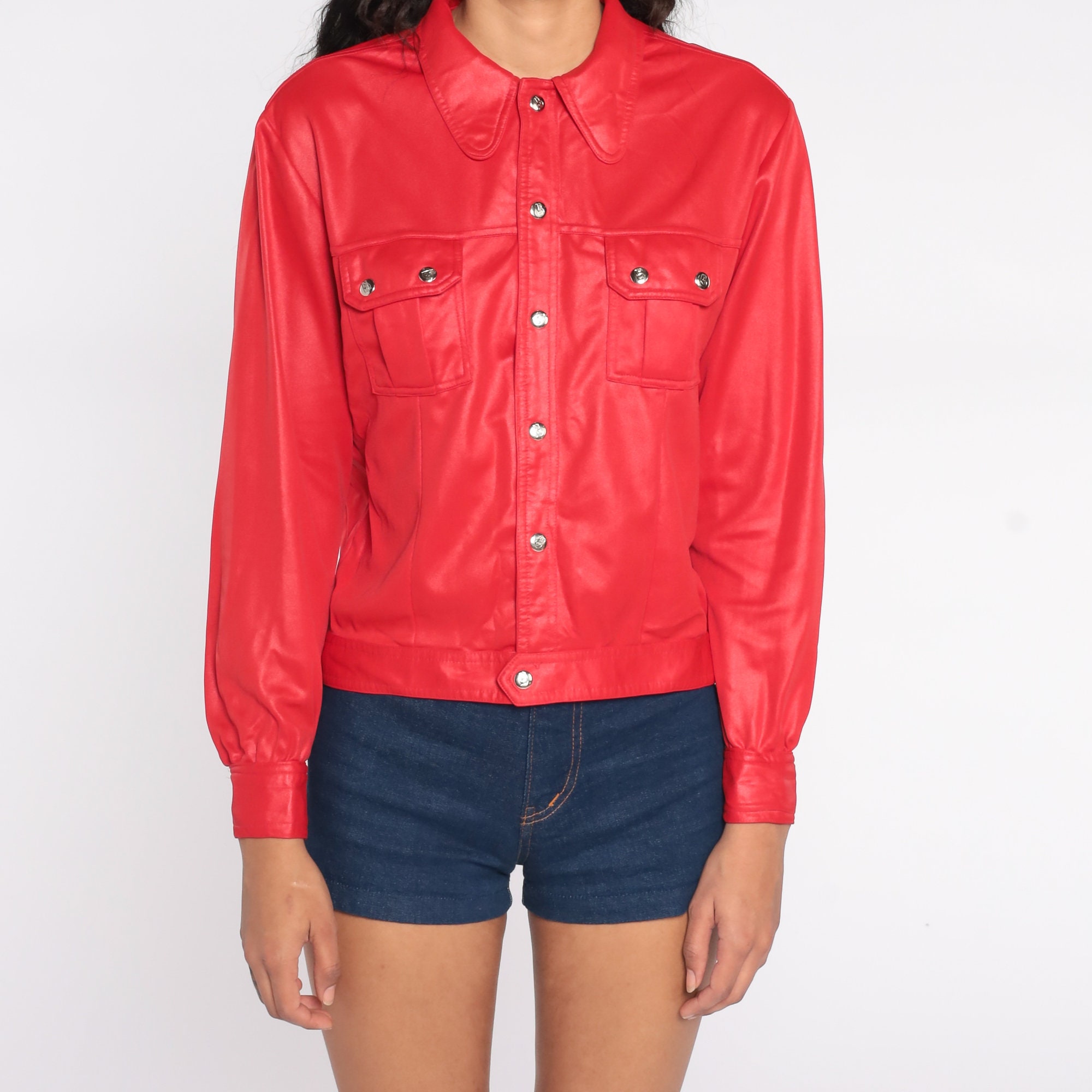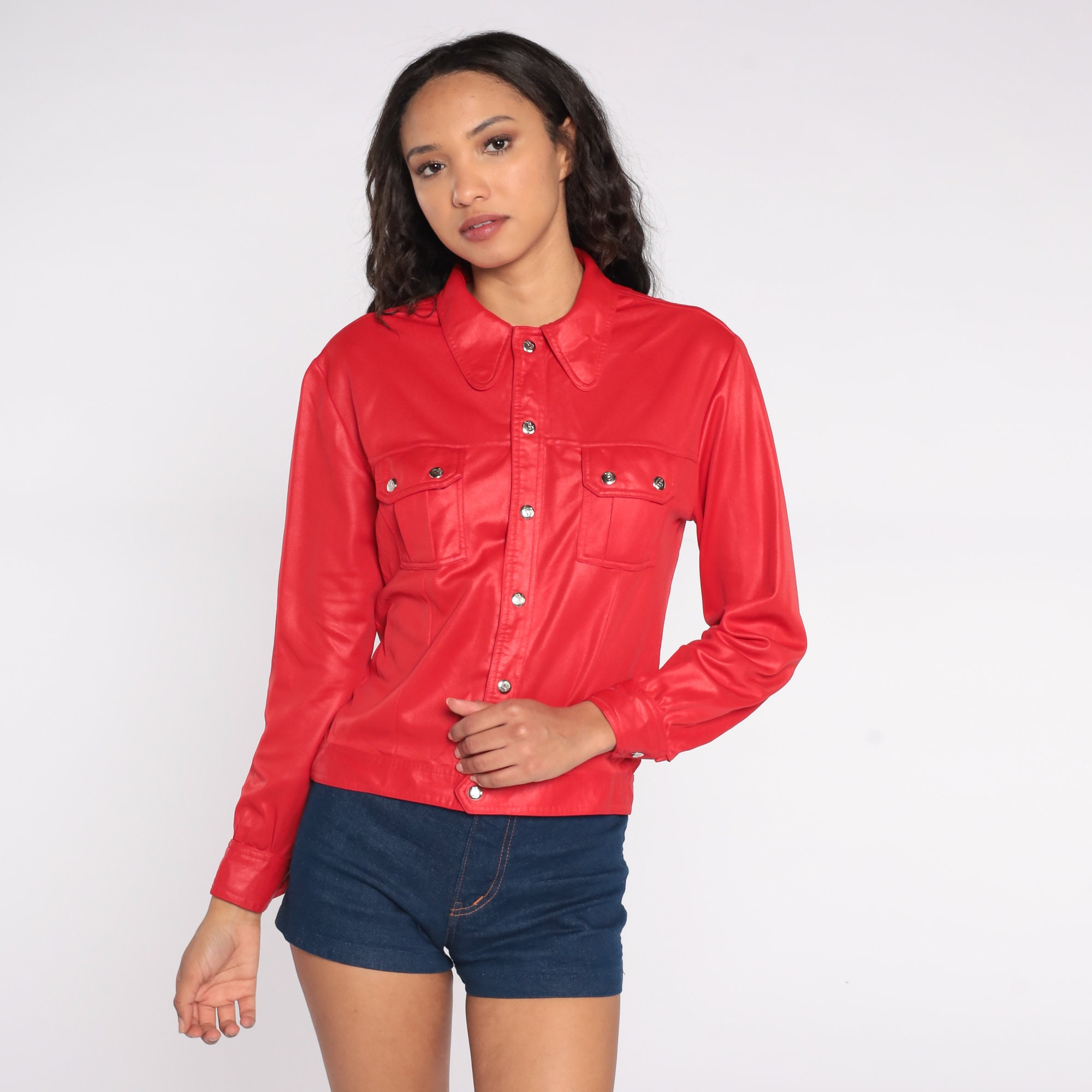 Vintage 70s biker-inspired blouse in shimmery red with snaps up the front, pockets, and long sleeves.
