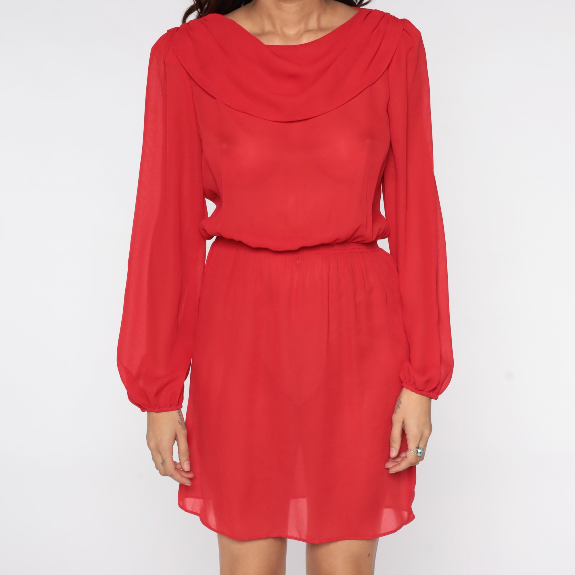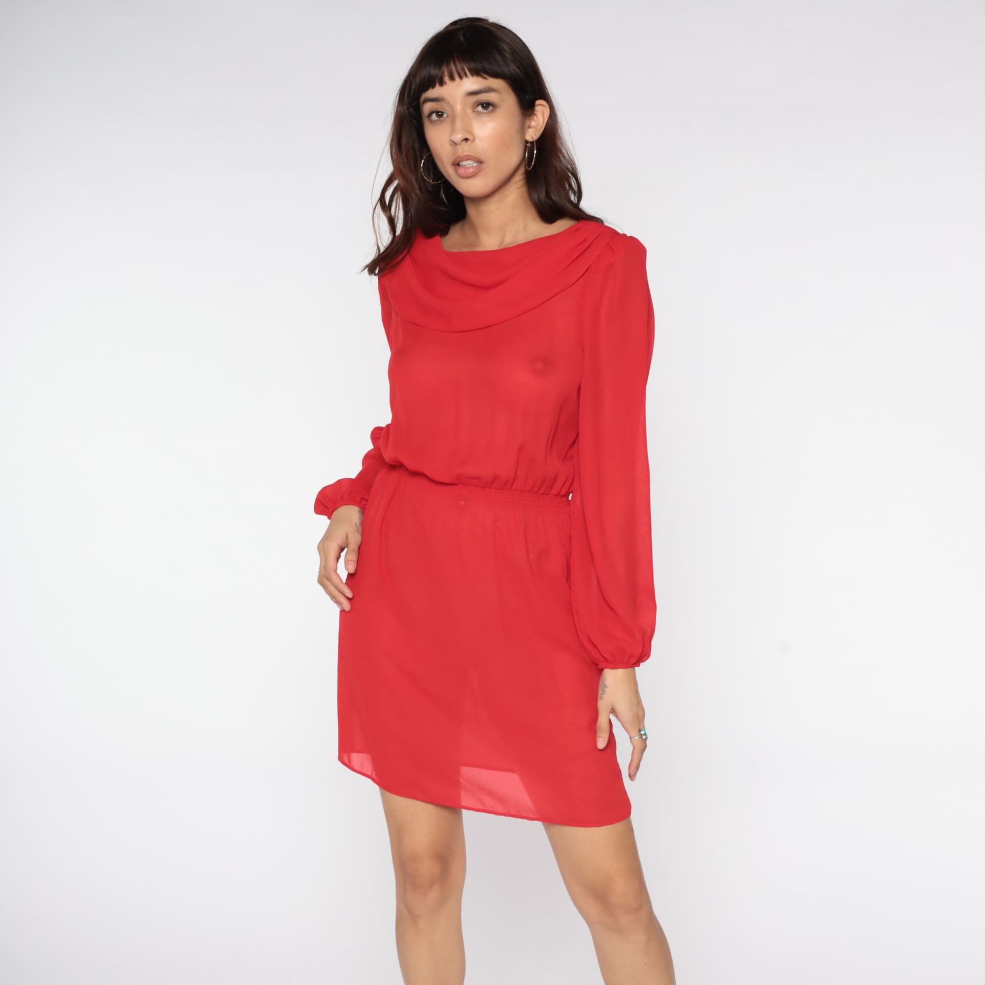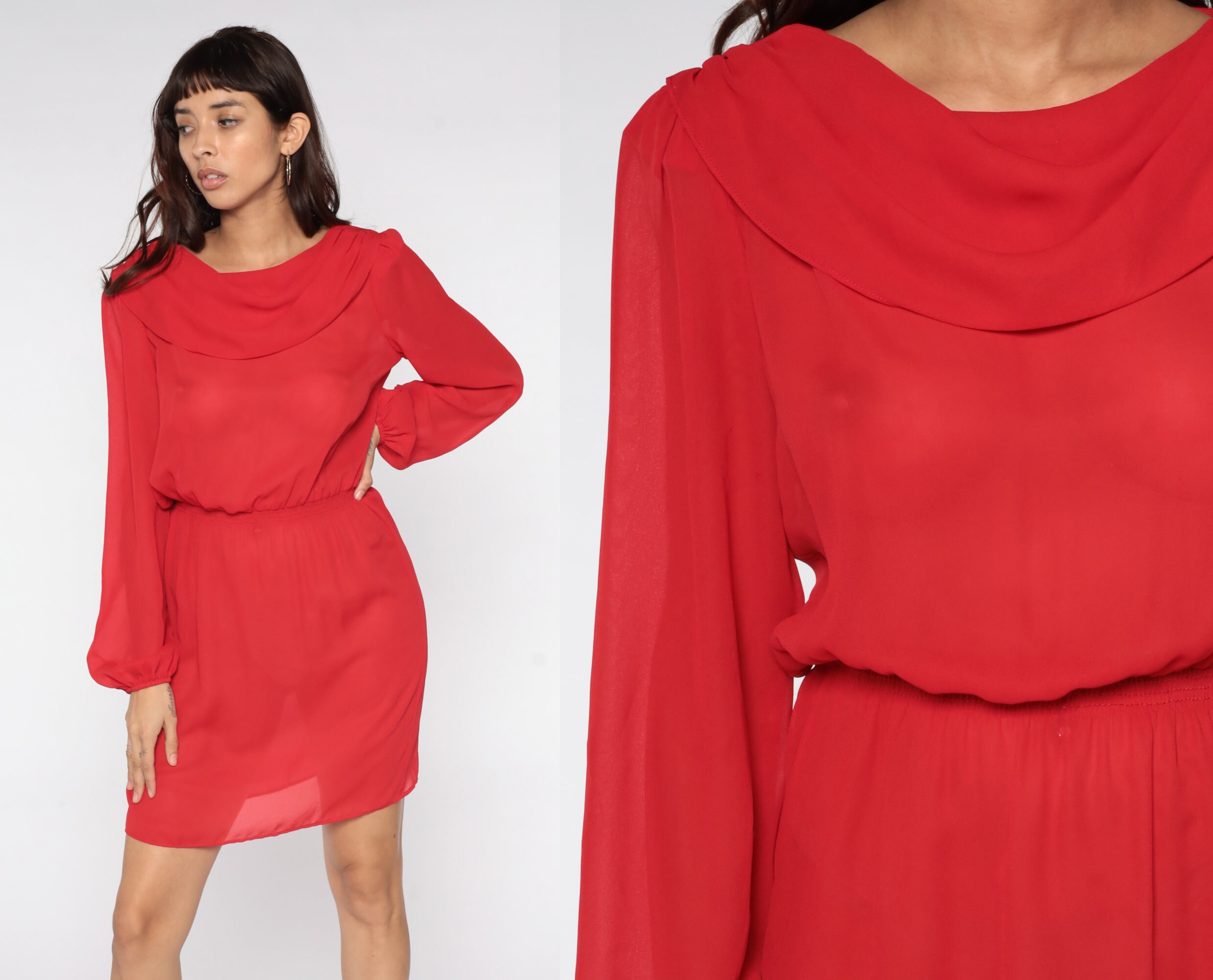 Vintage 80s dress in sheer red with a cowl neck. High waisted with long puff sleeves.