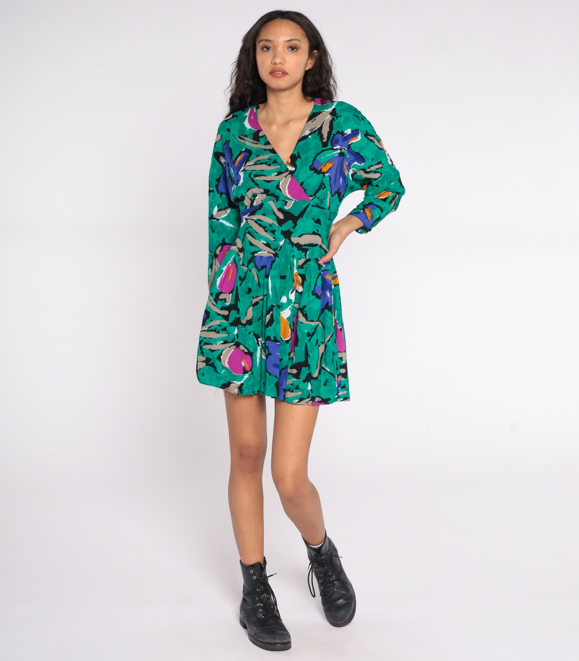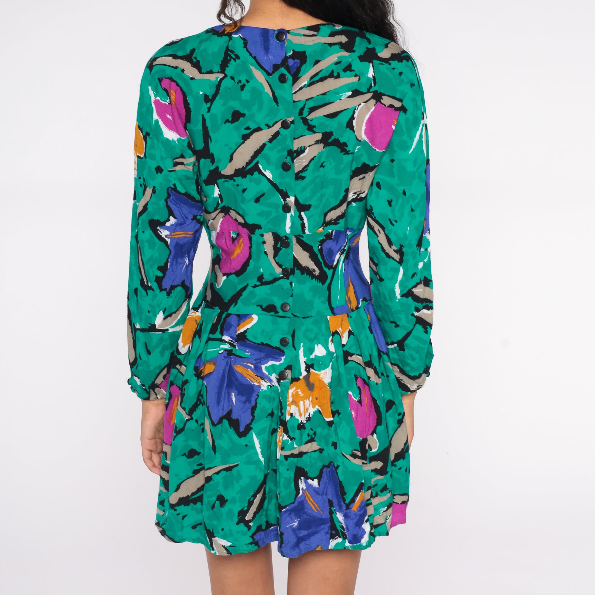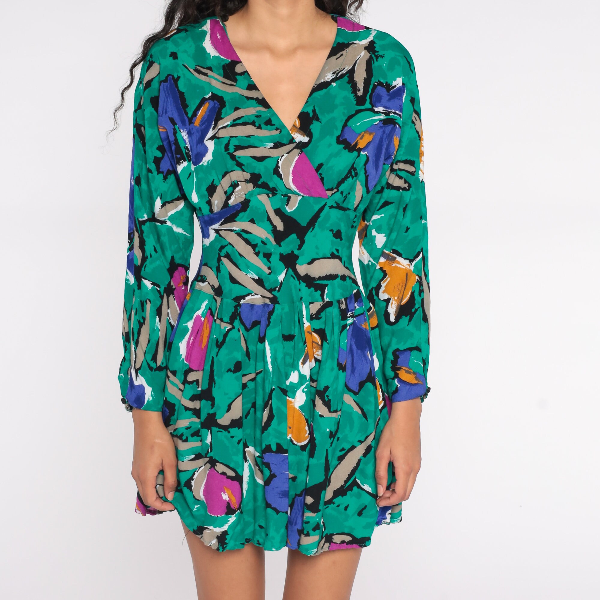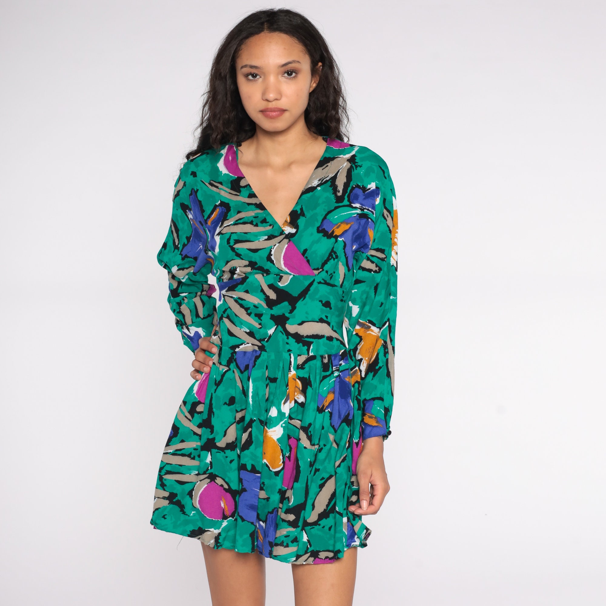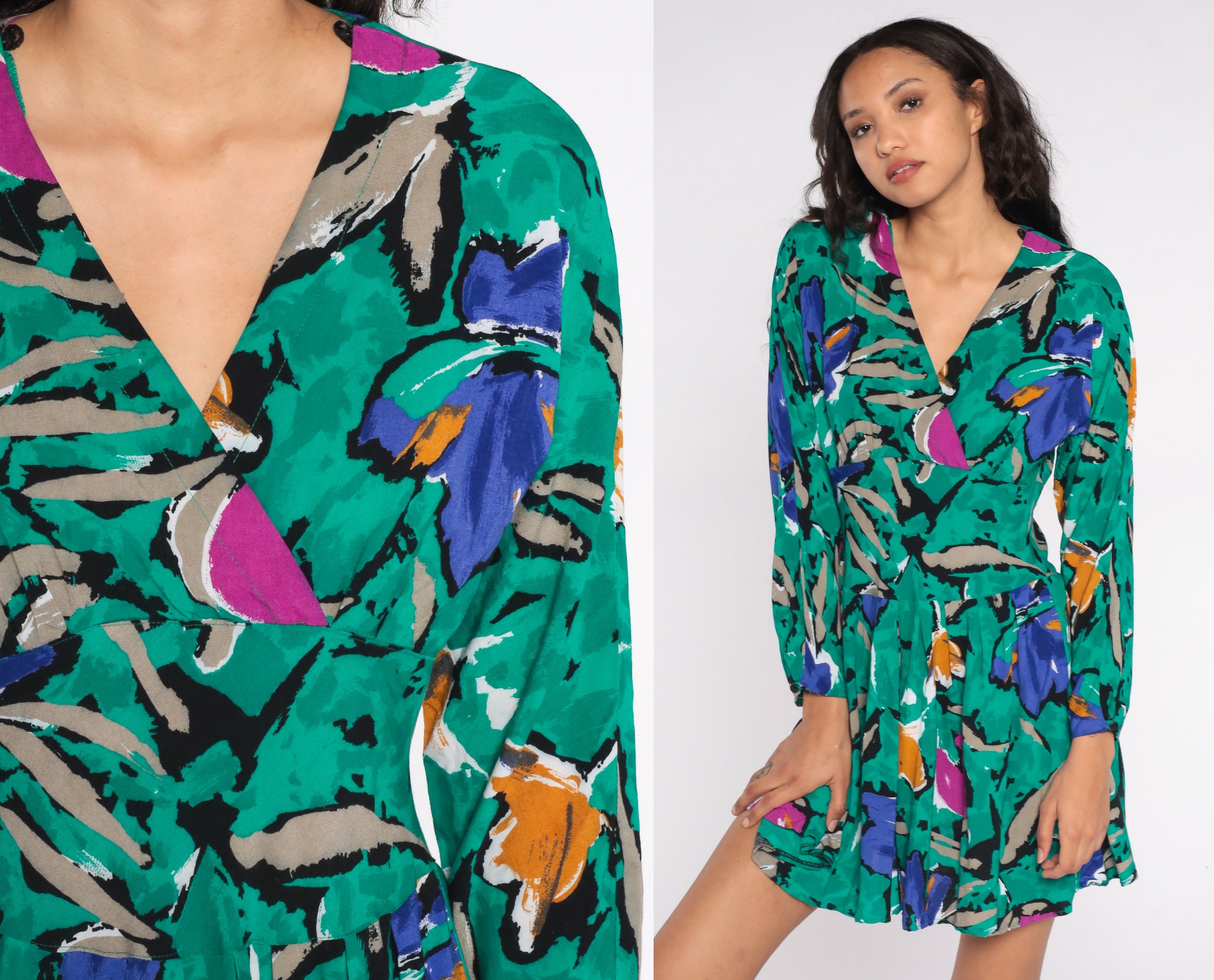 Vintage 80s dress in a floral print with a wrap cut. High waisted with long sleeves and a v neck. Mini length.