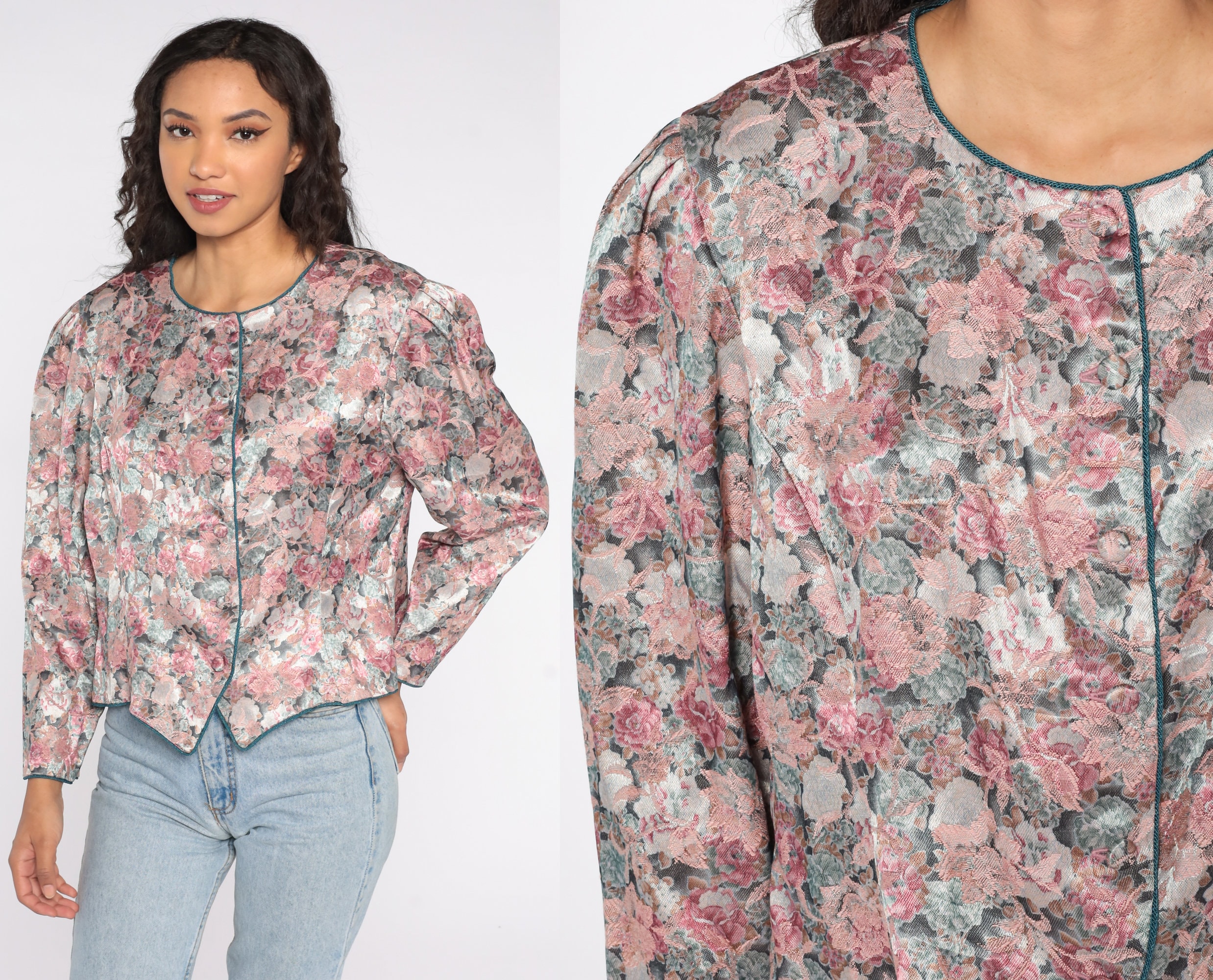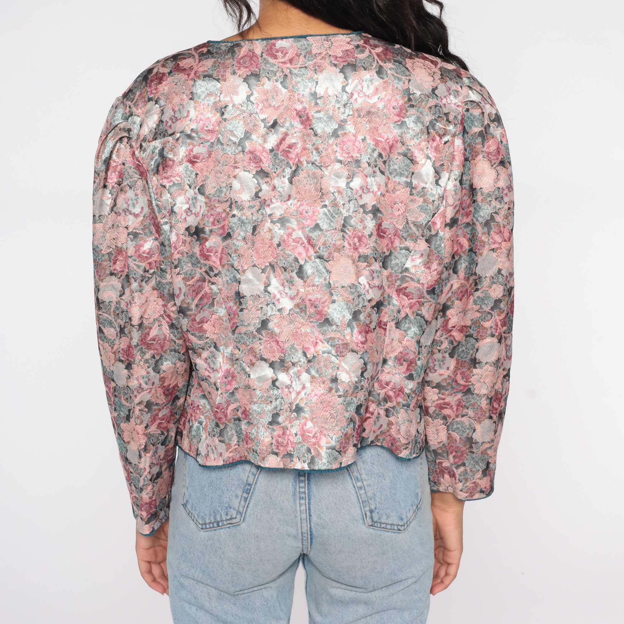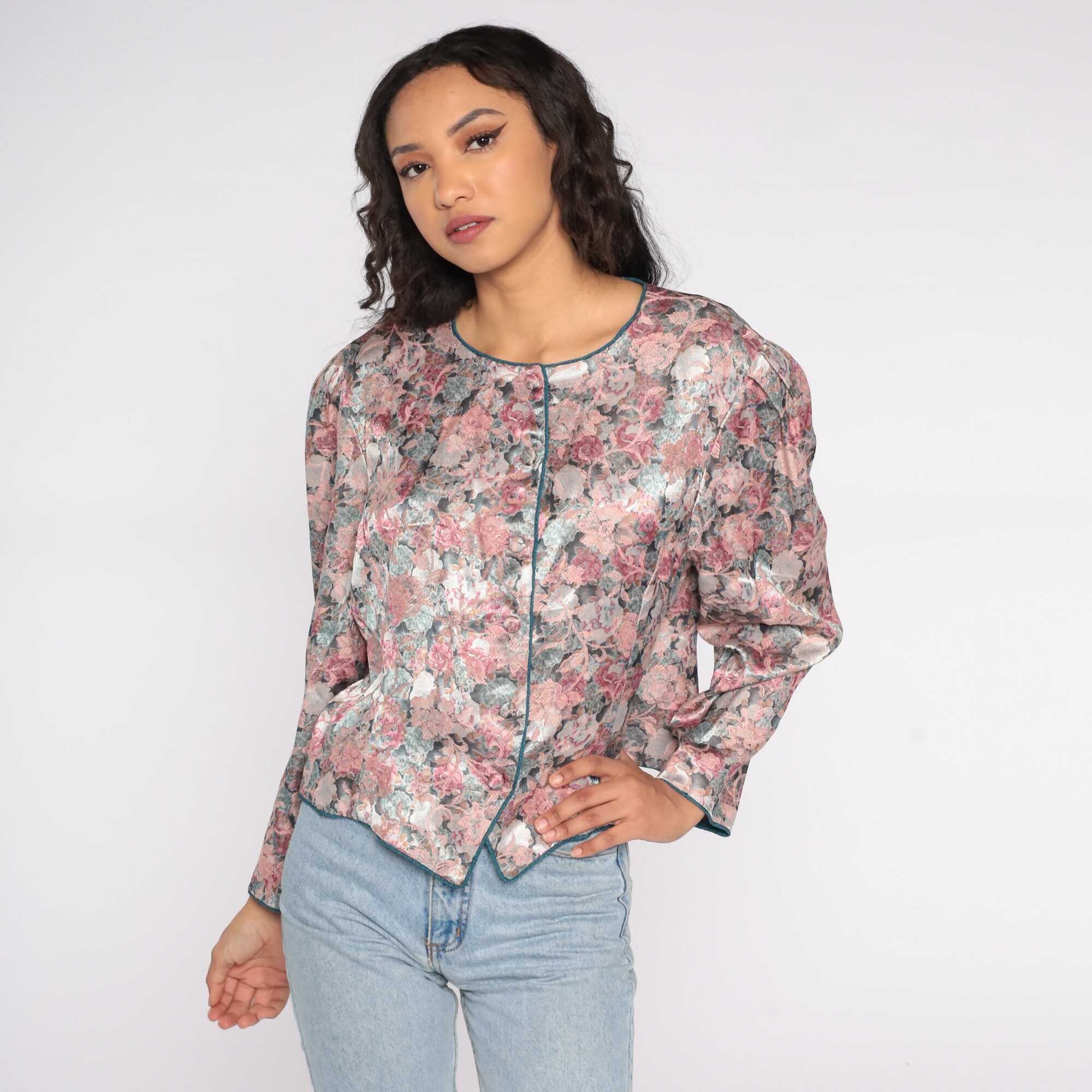 Vintage 80s shirt in a shimmery tapestry floral print. It has puff sleeves and buttons up the front.