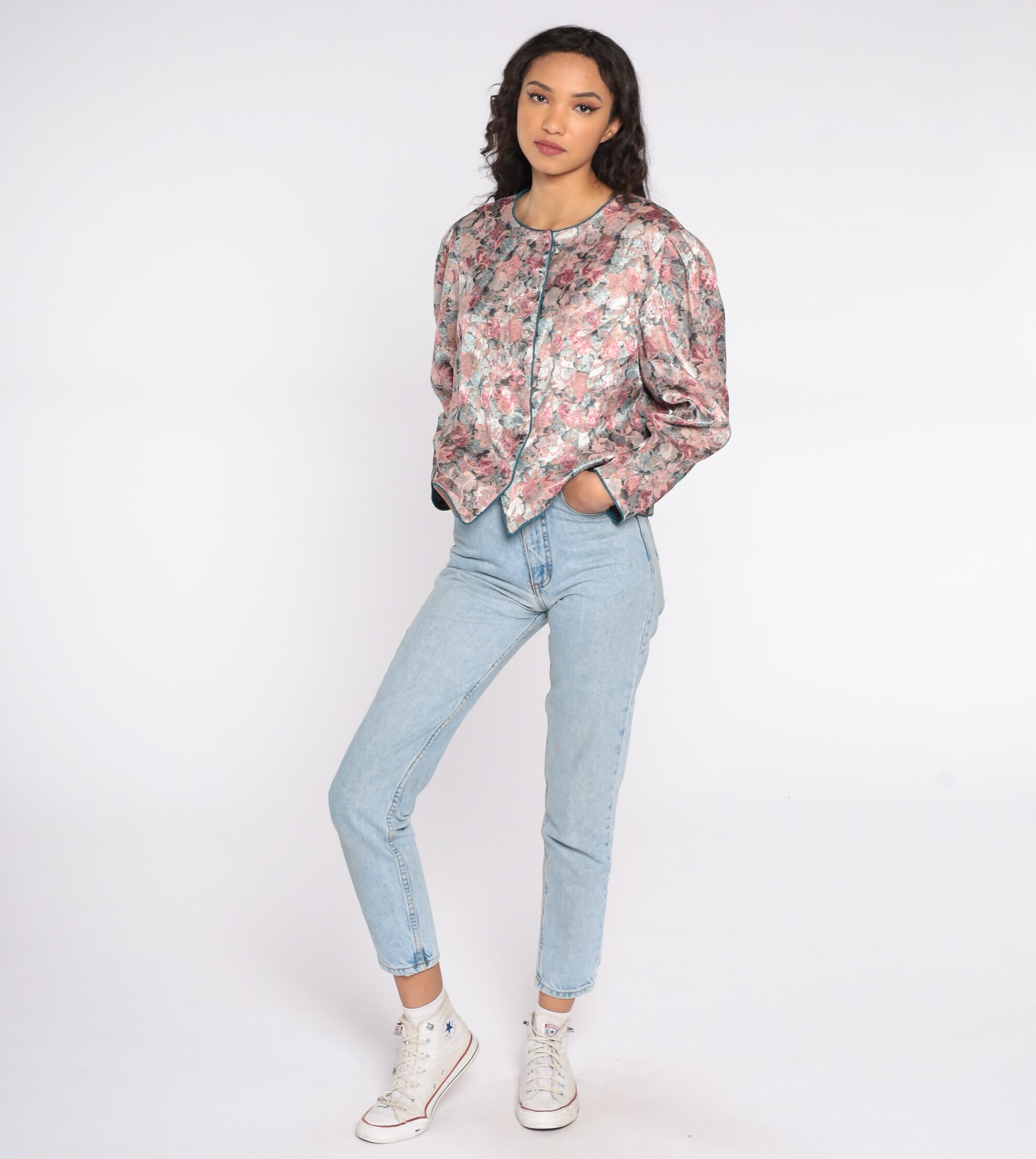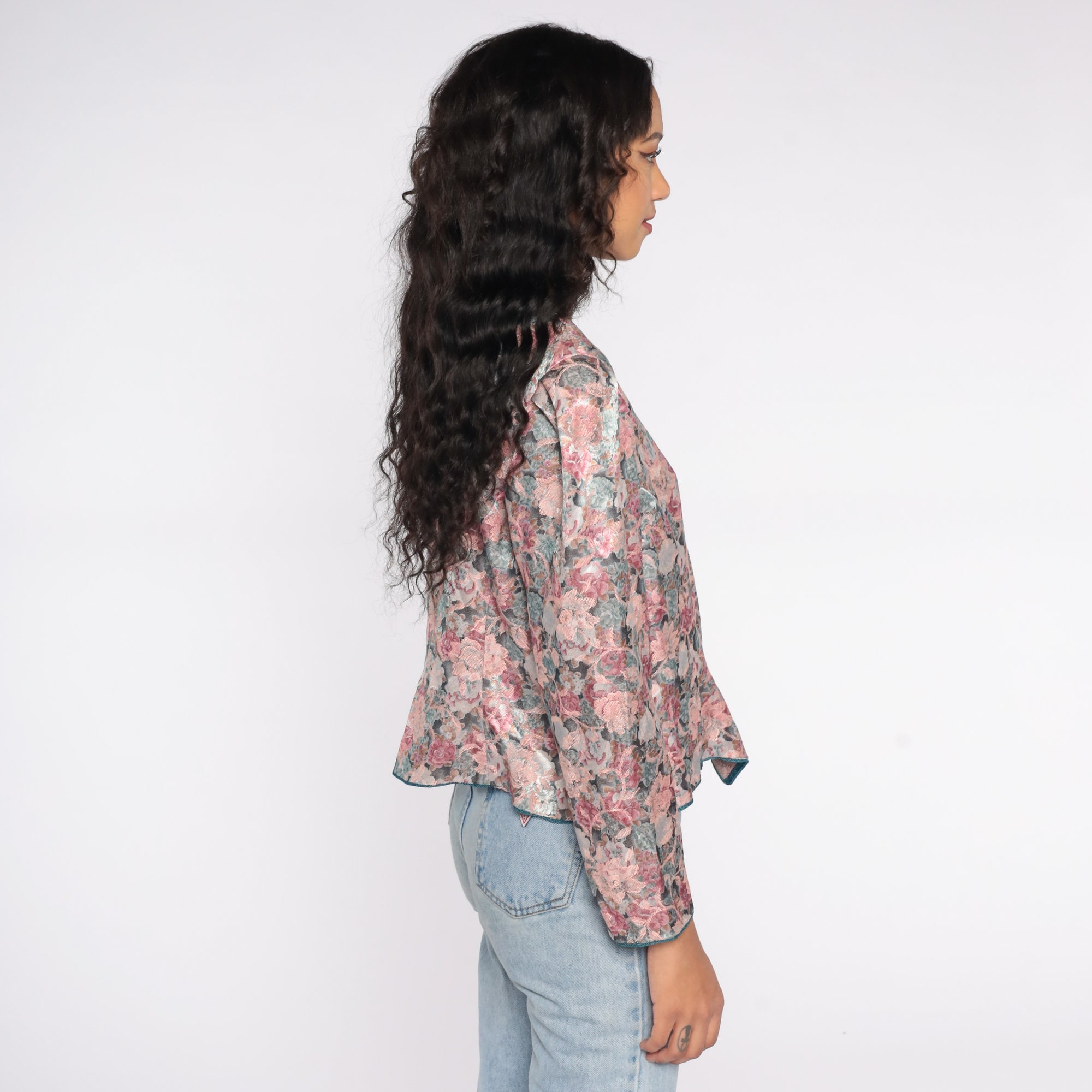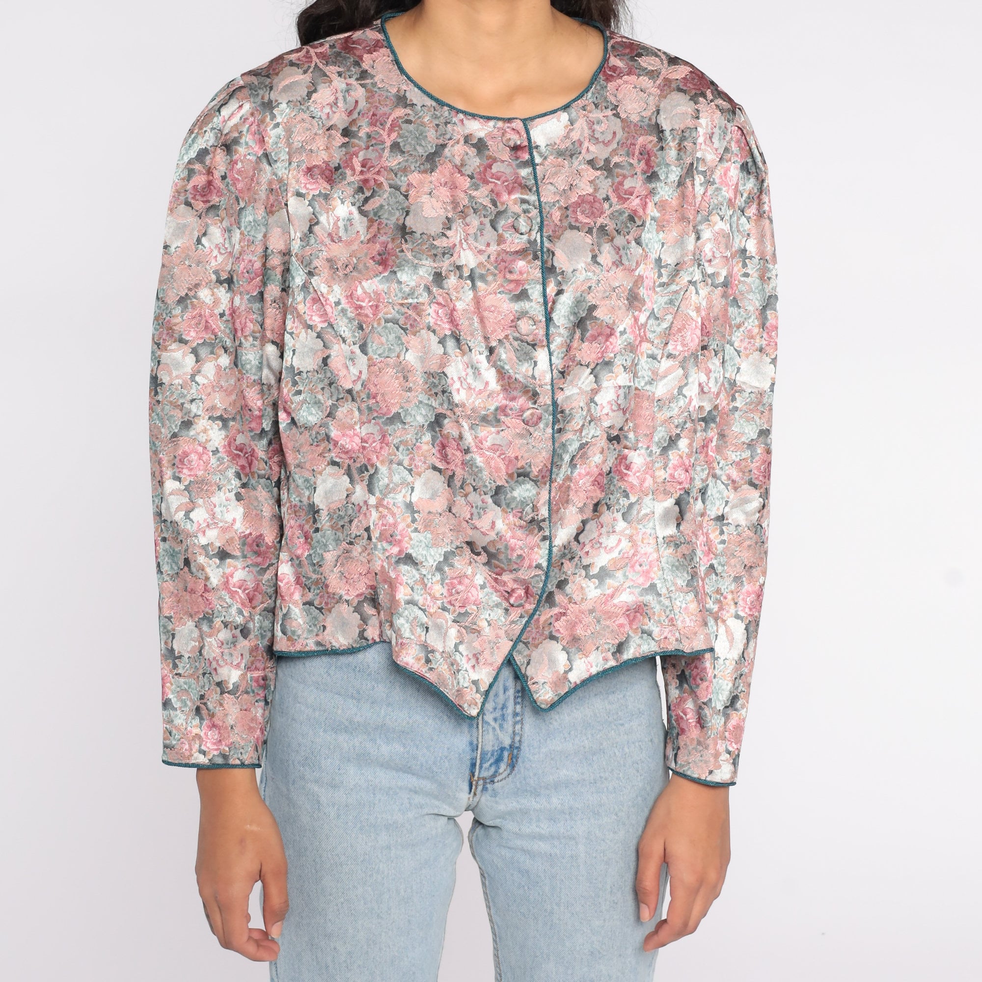 Vintage 80s shirt in a shimmery tapestry floral print. It has puff sleeves and buttons up the front.