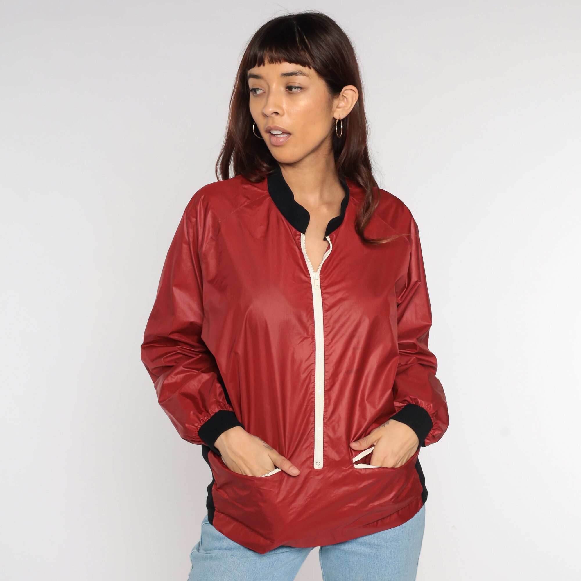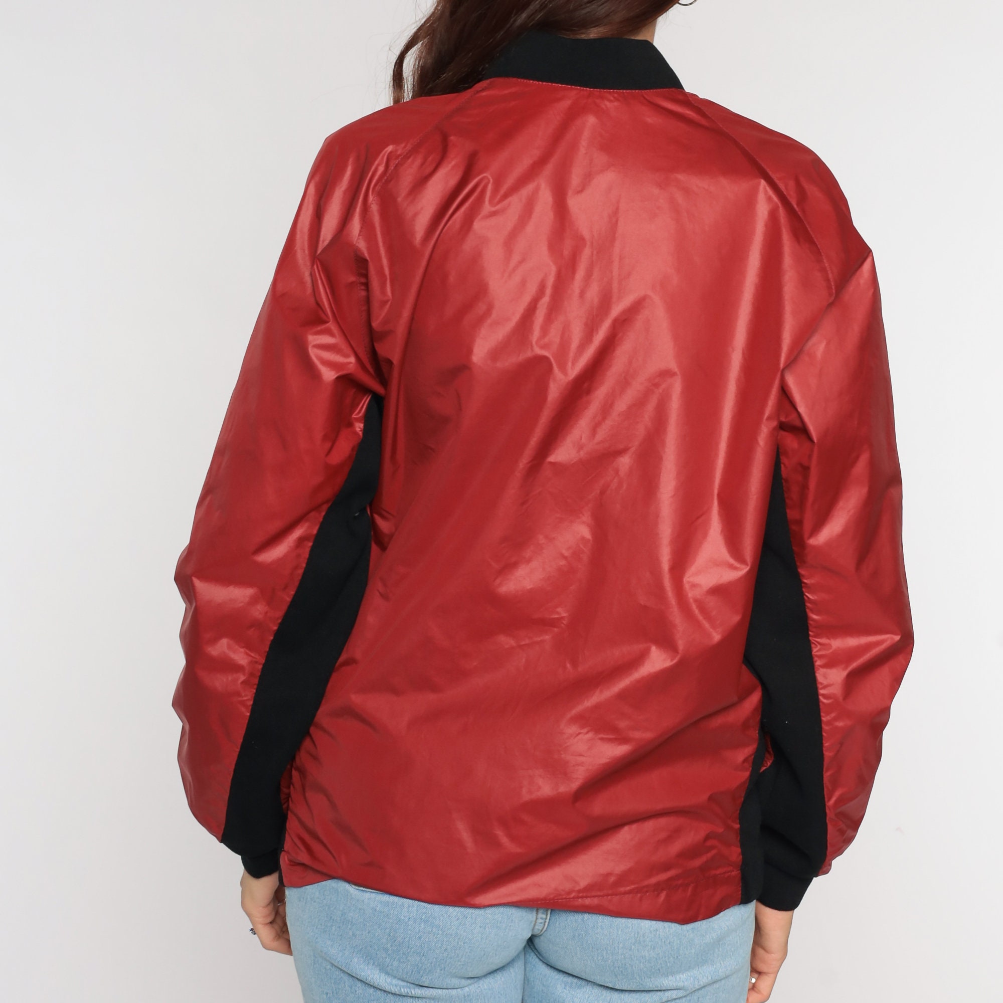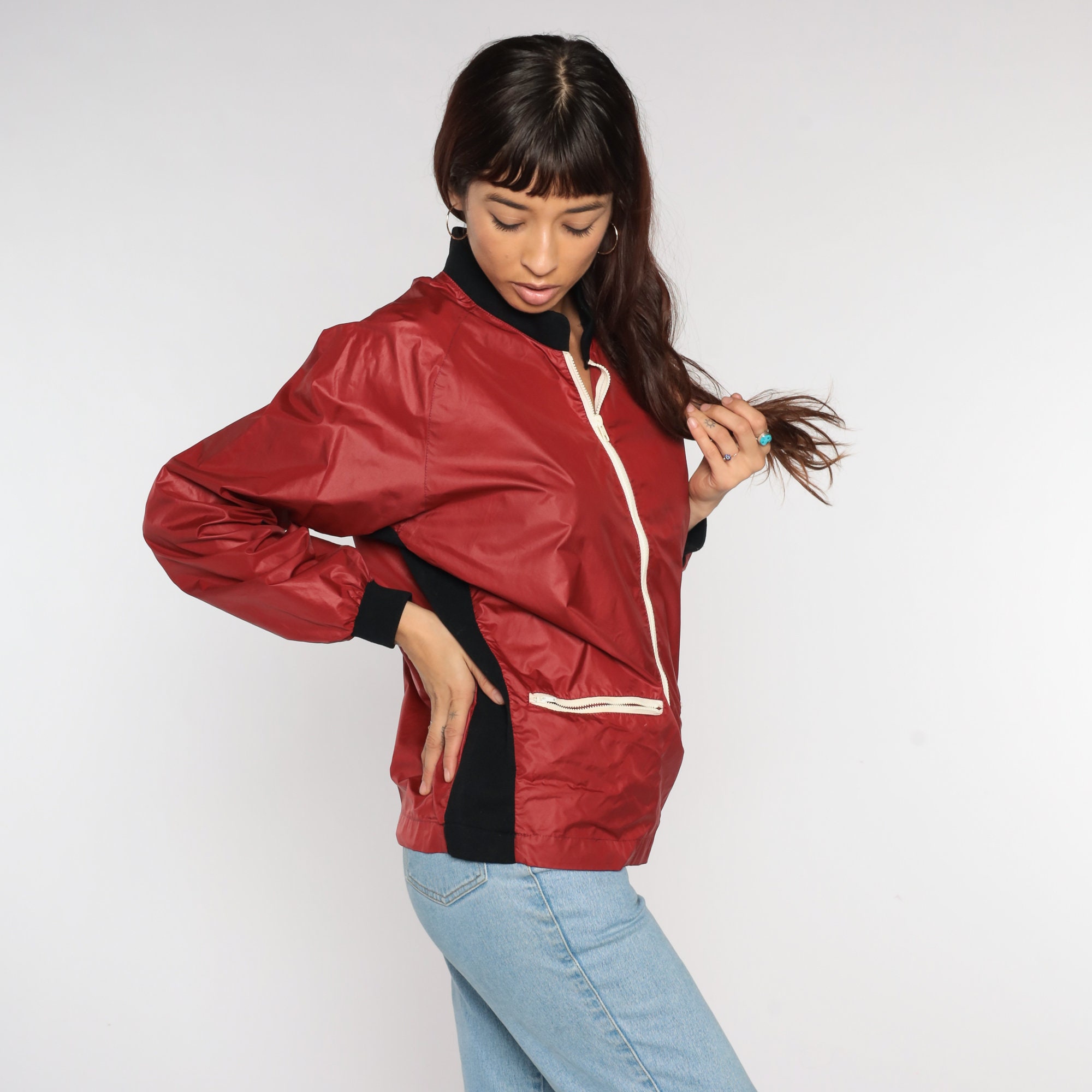 Vintage 80s bomber jacket in red with raglan sleeves, knit trim, pockets, and a zipper.