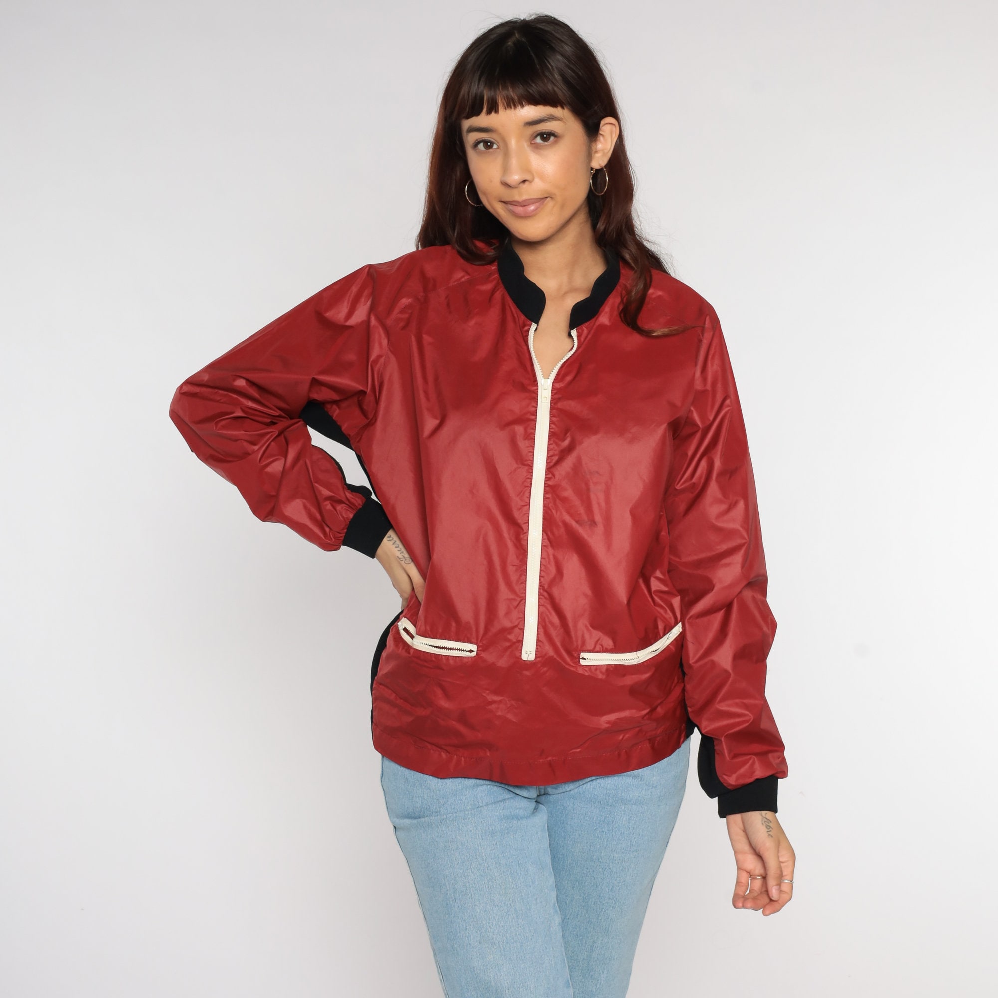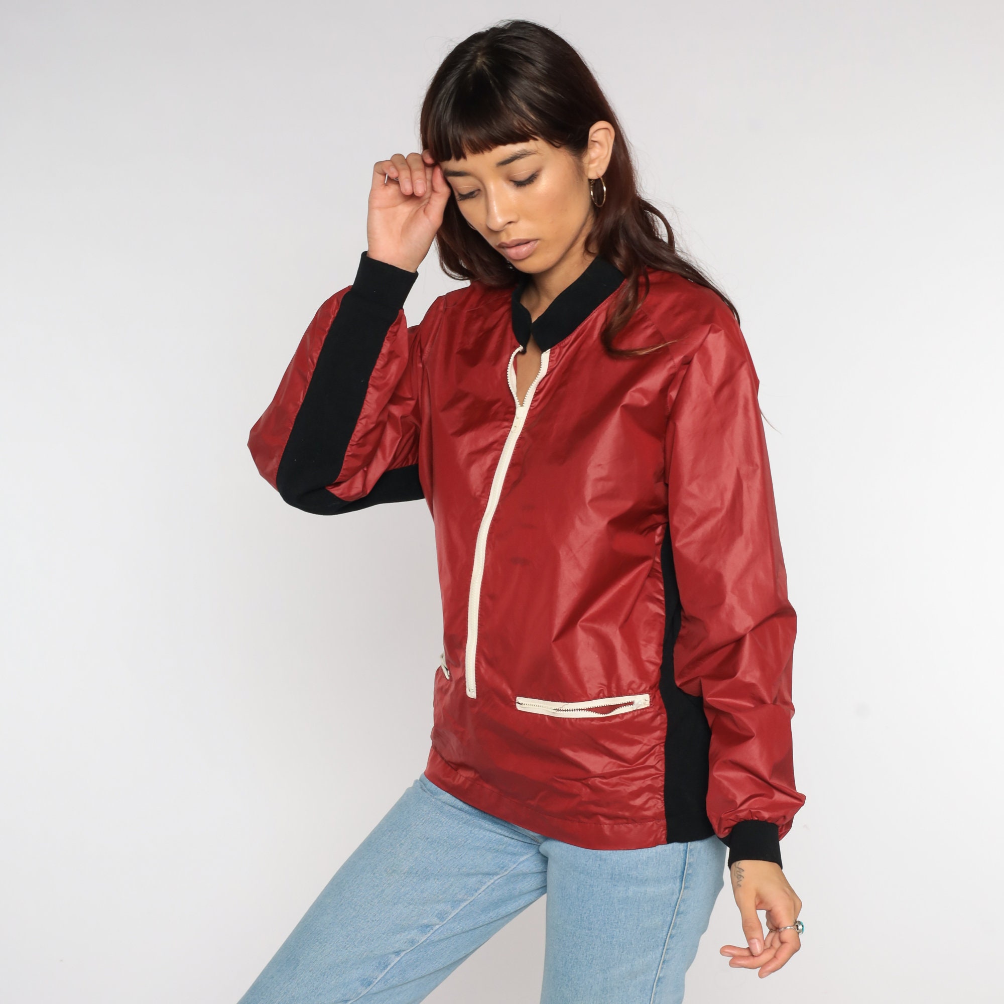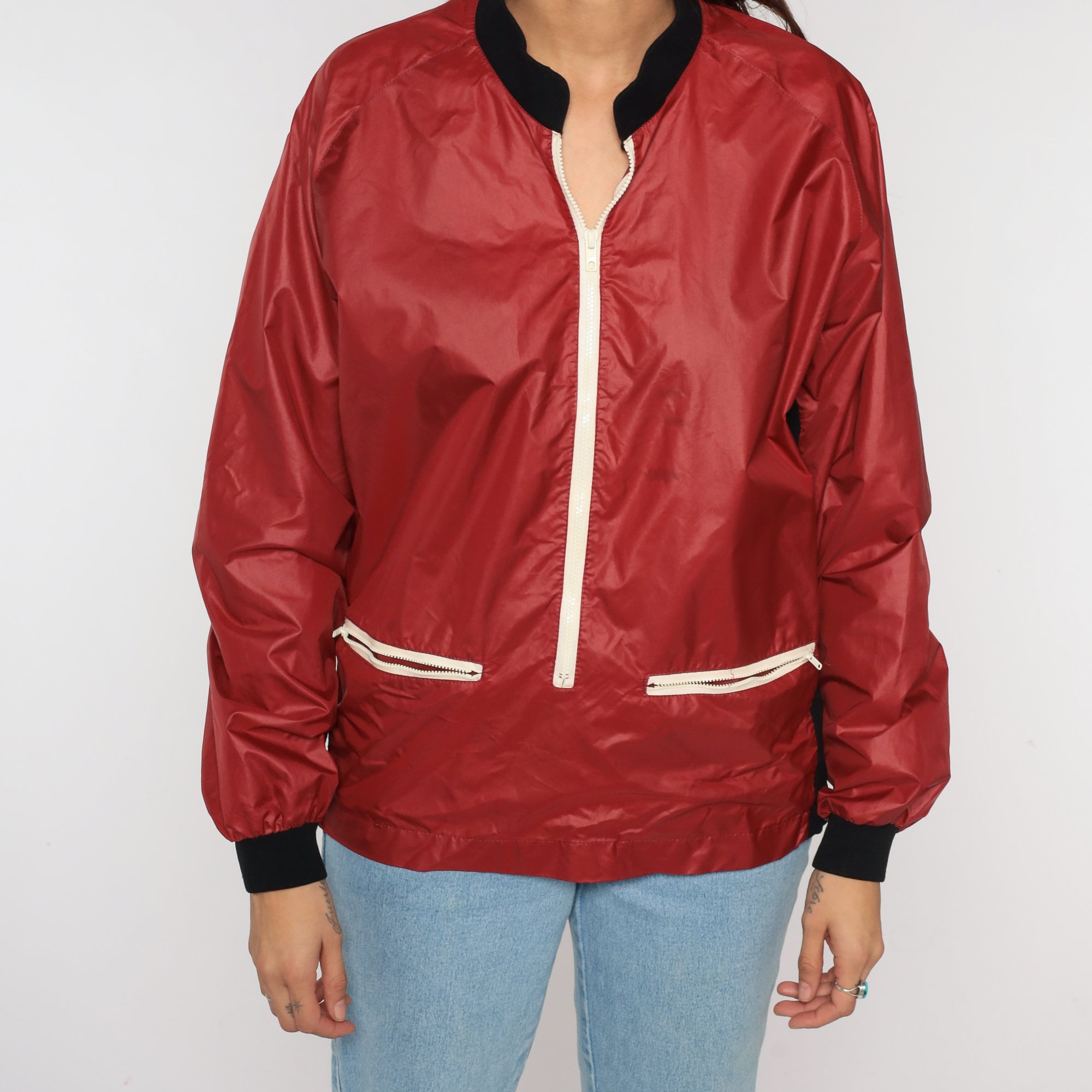 Vintage 80s bomber jacket in red with raglan sleeves, knit trim, pockets, and a zipper.