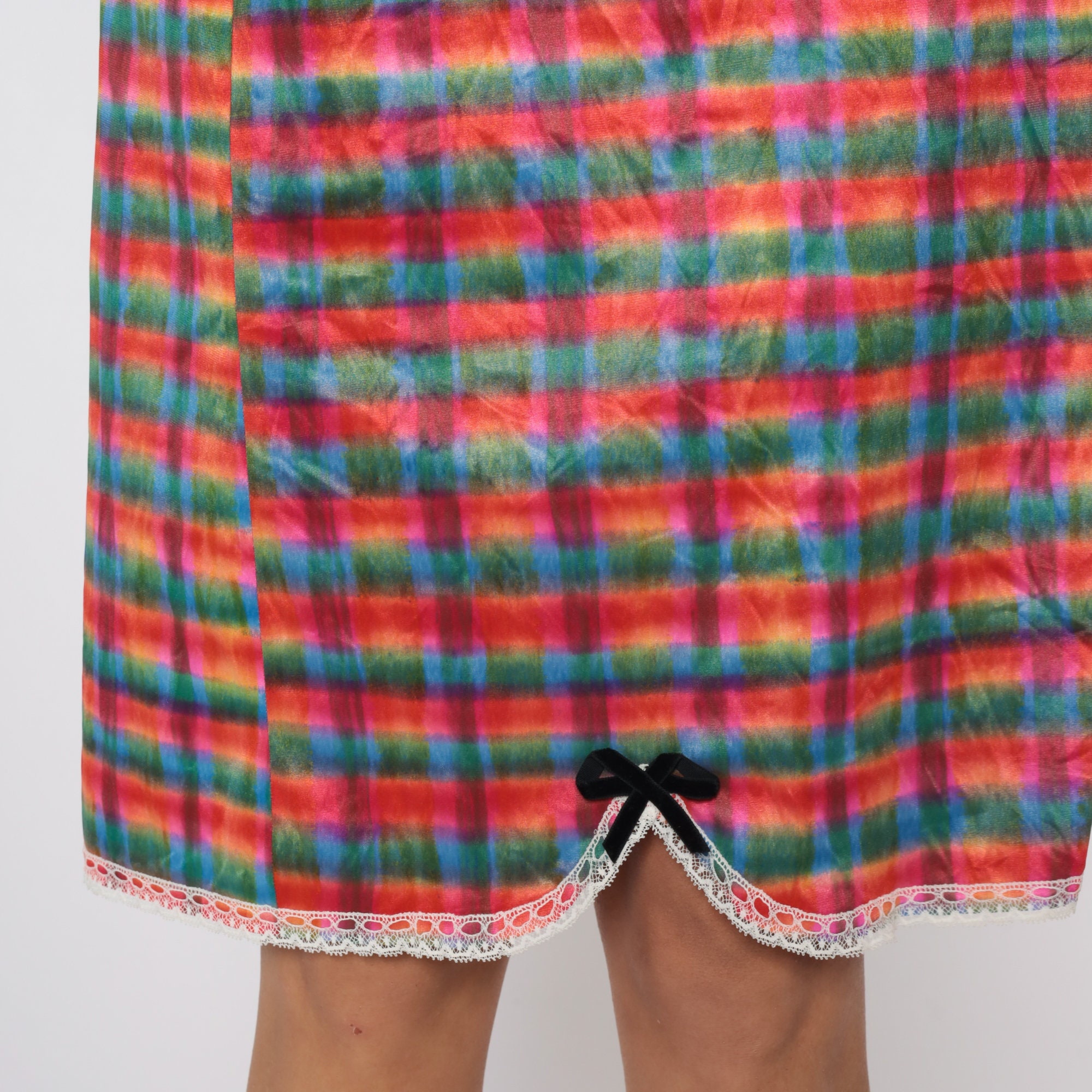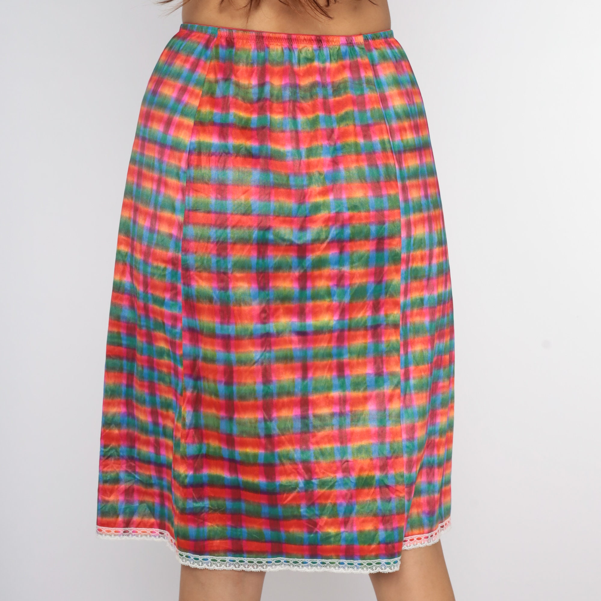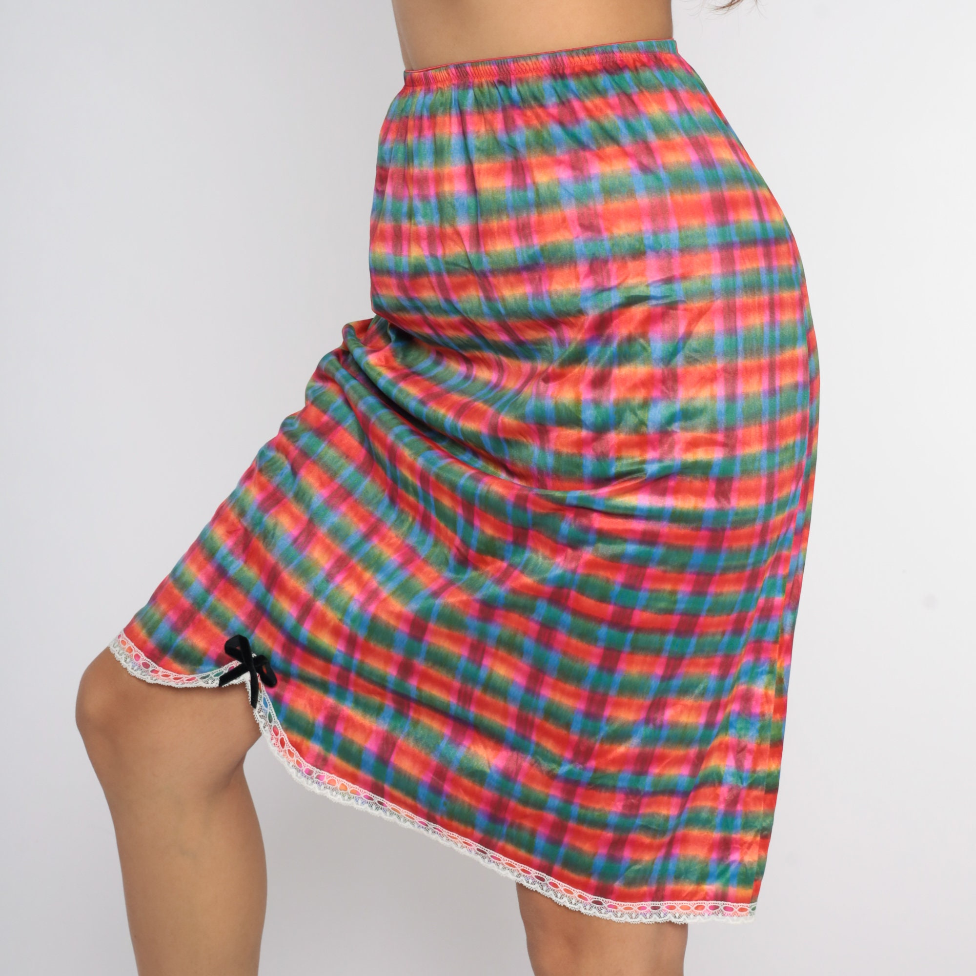 Vintage 70s lingerie slip skirt in a checkered print with lace trim.