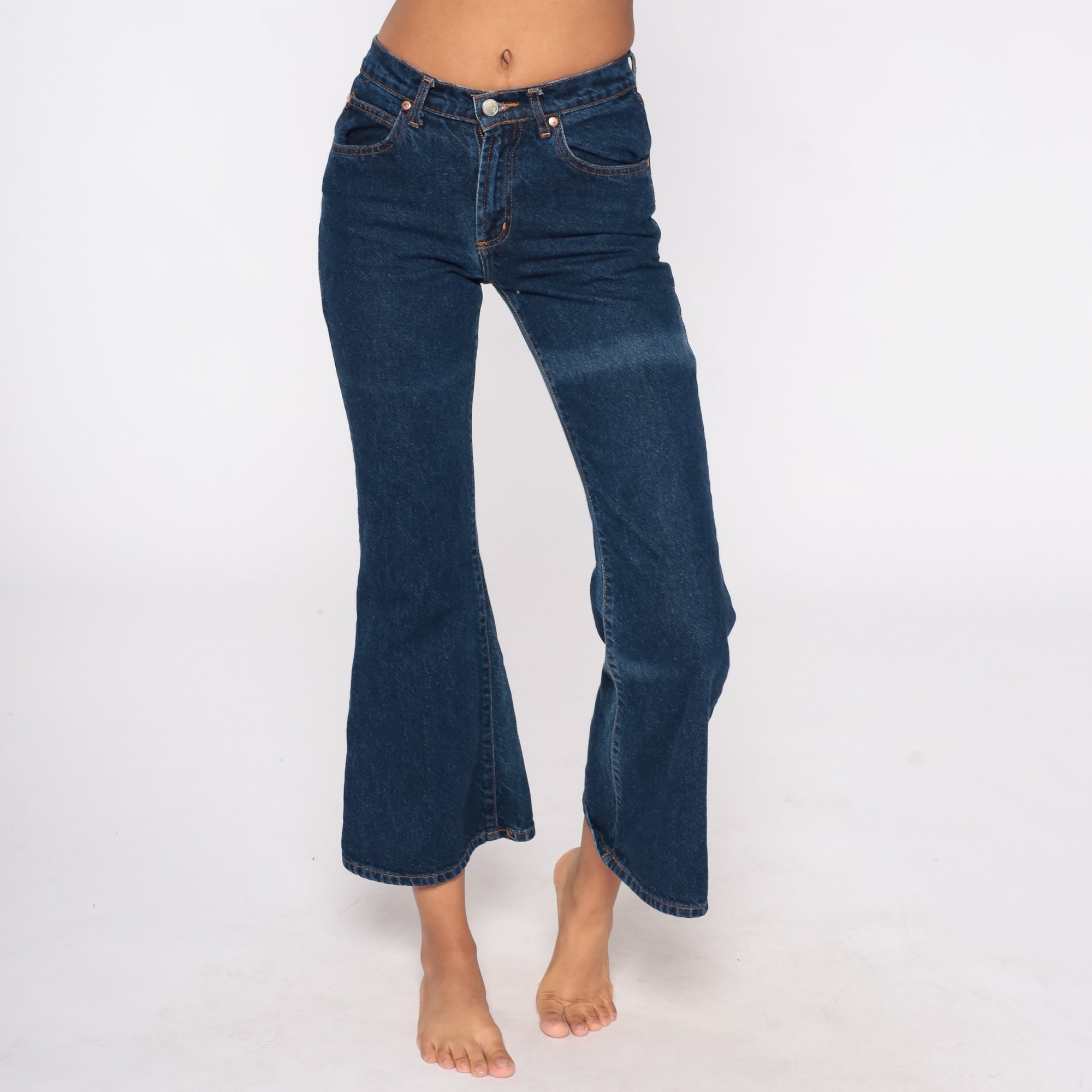 Vintage 00s jeans in blue denim with a flared leg and a mid rise waist.