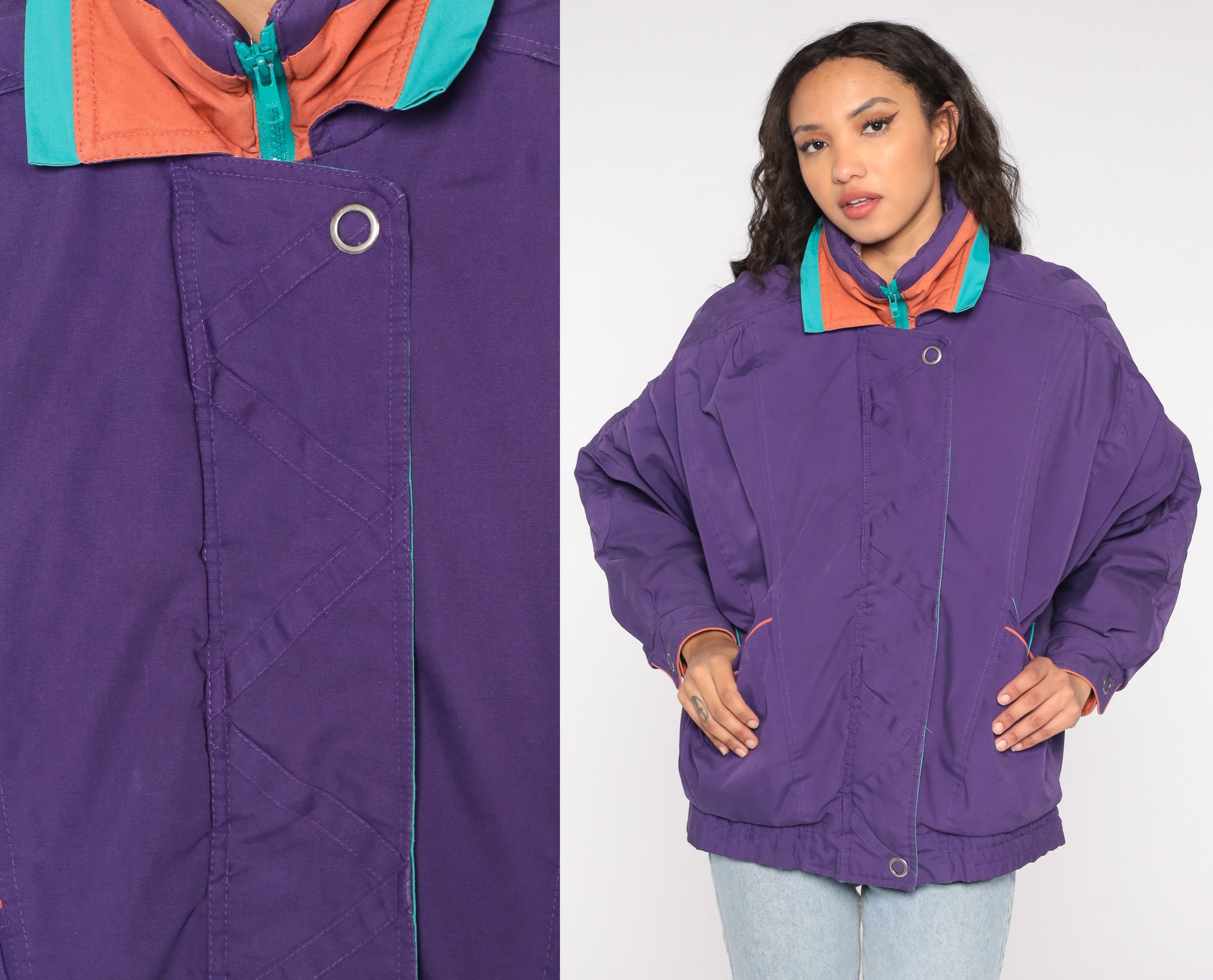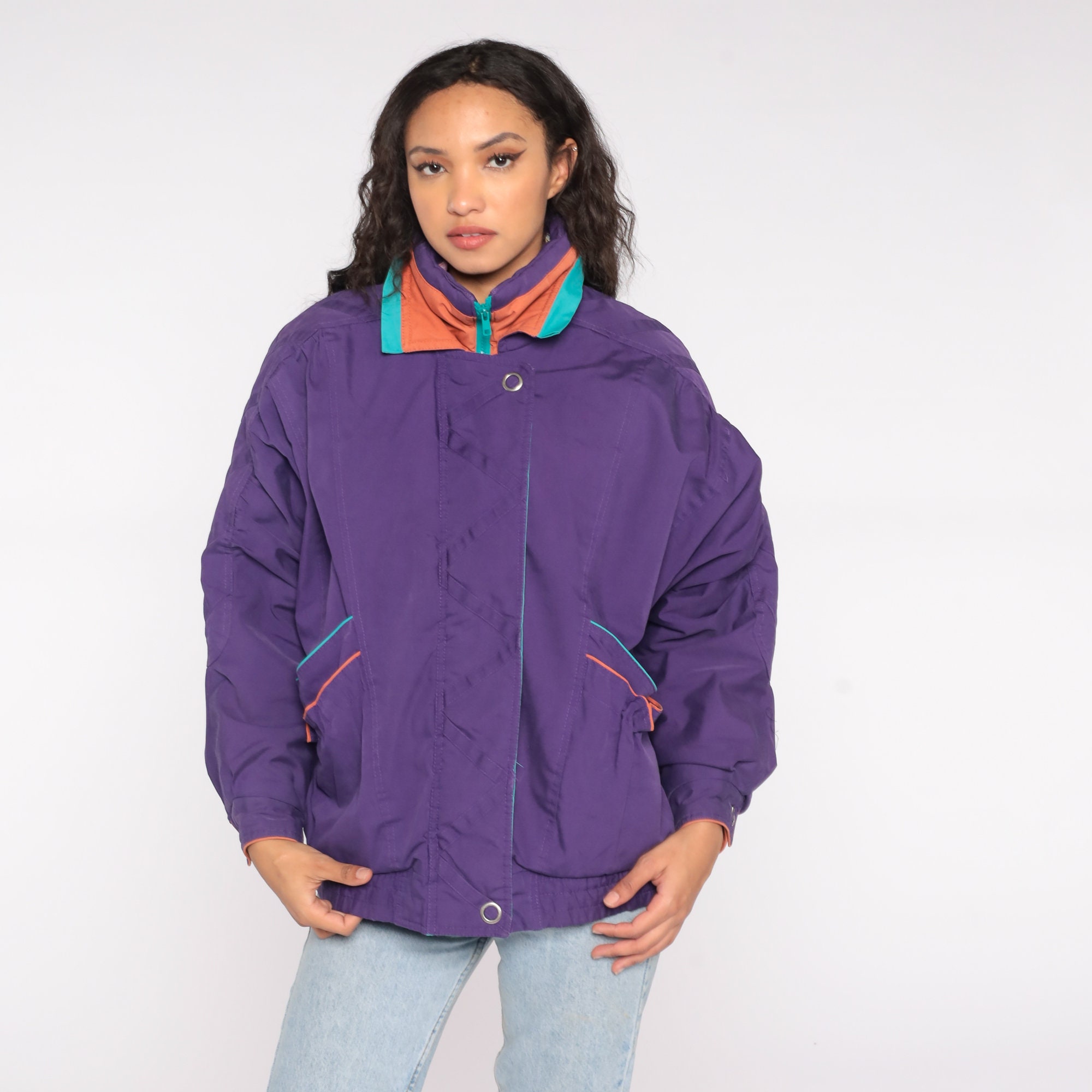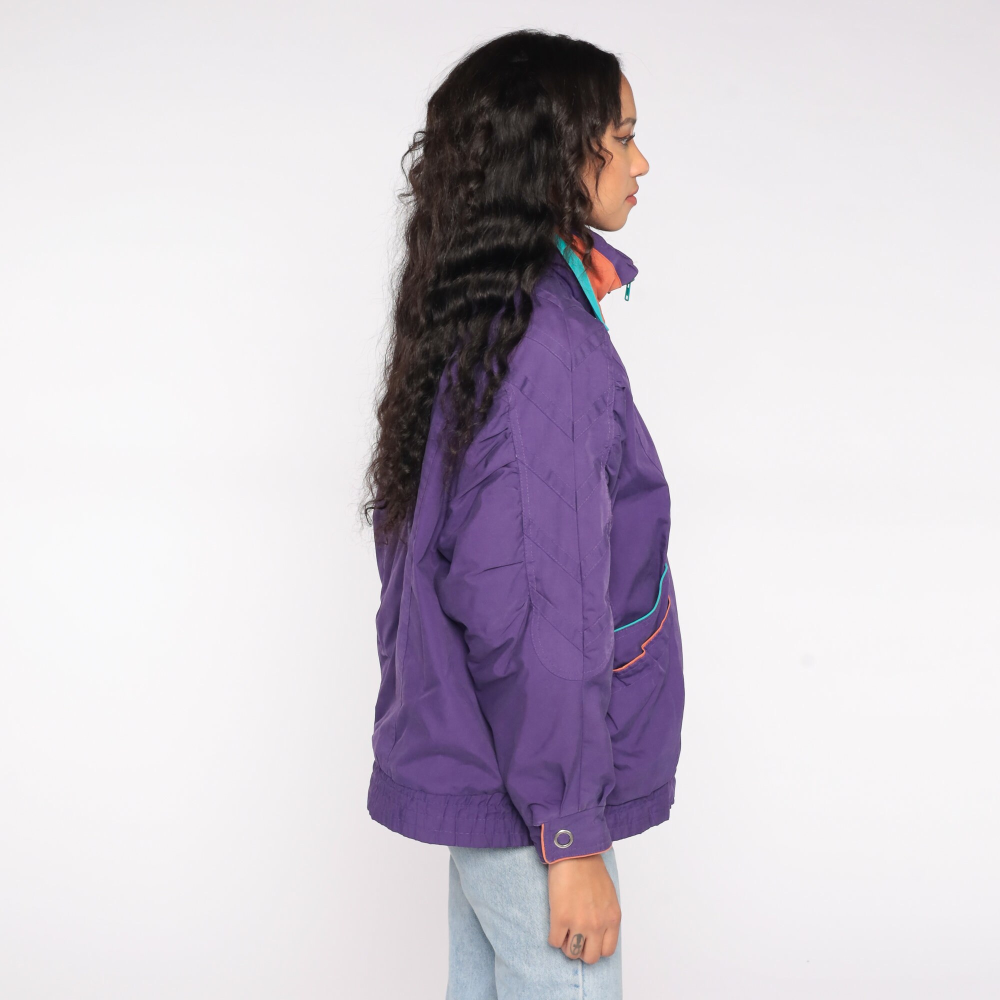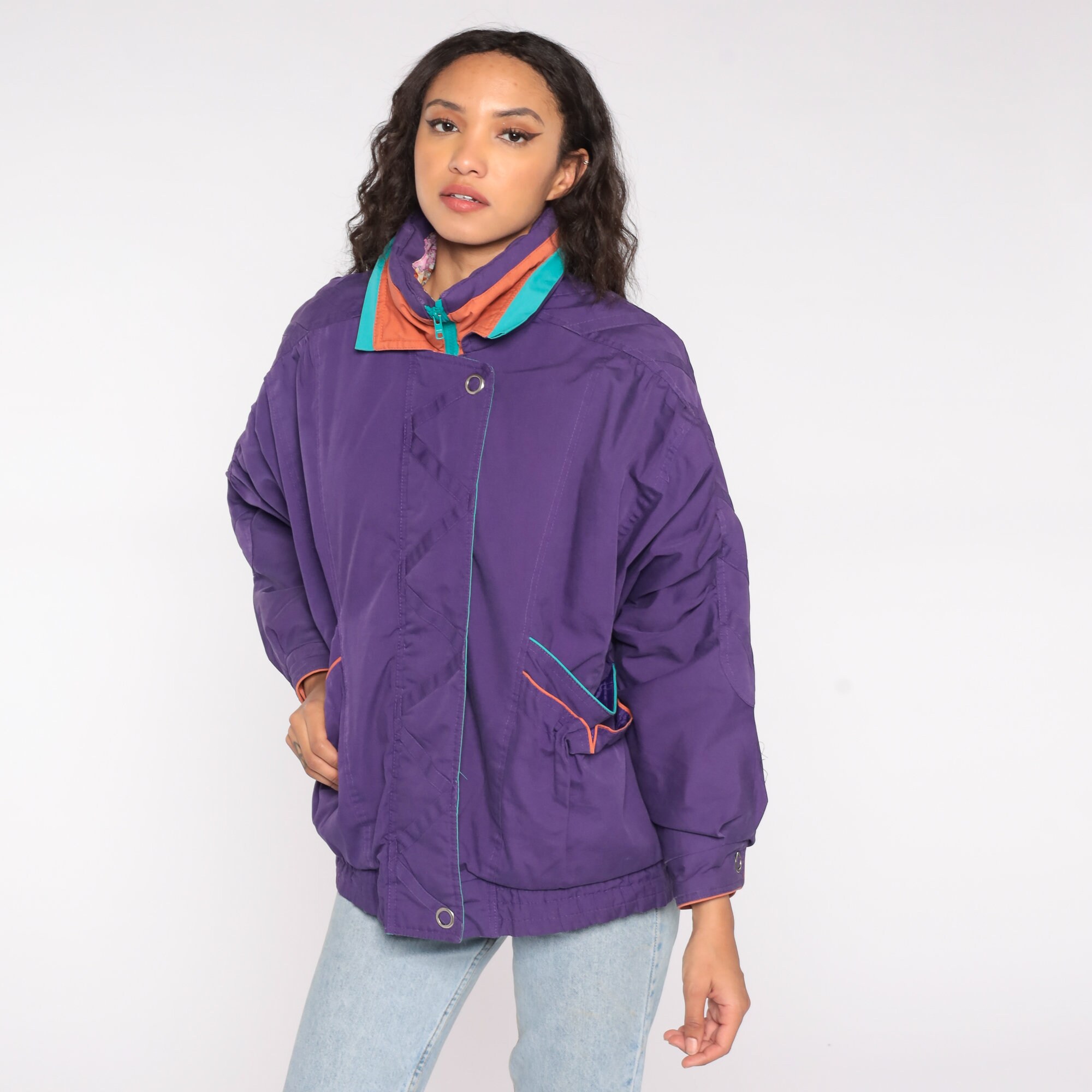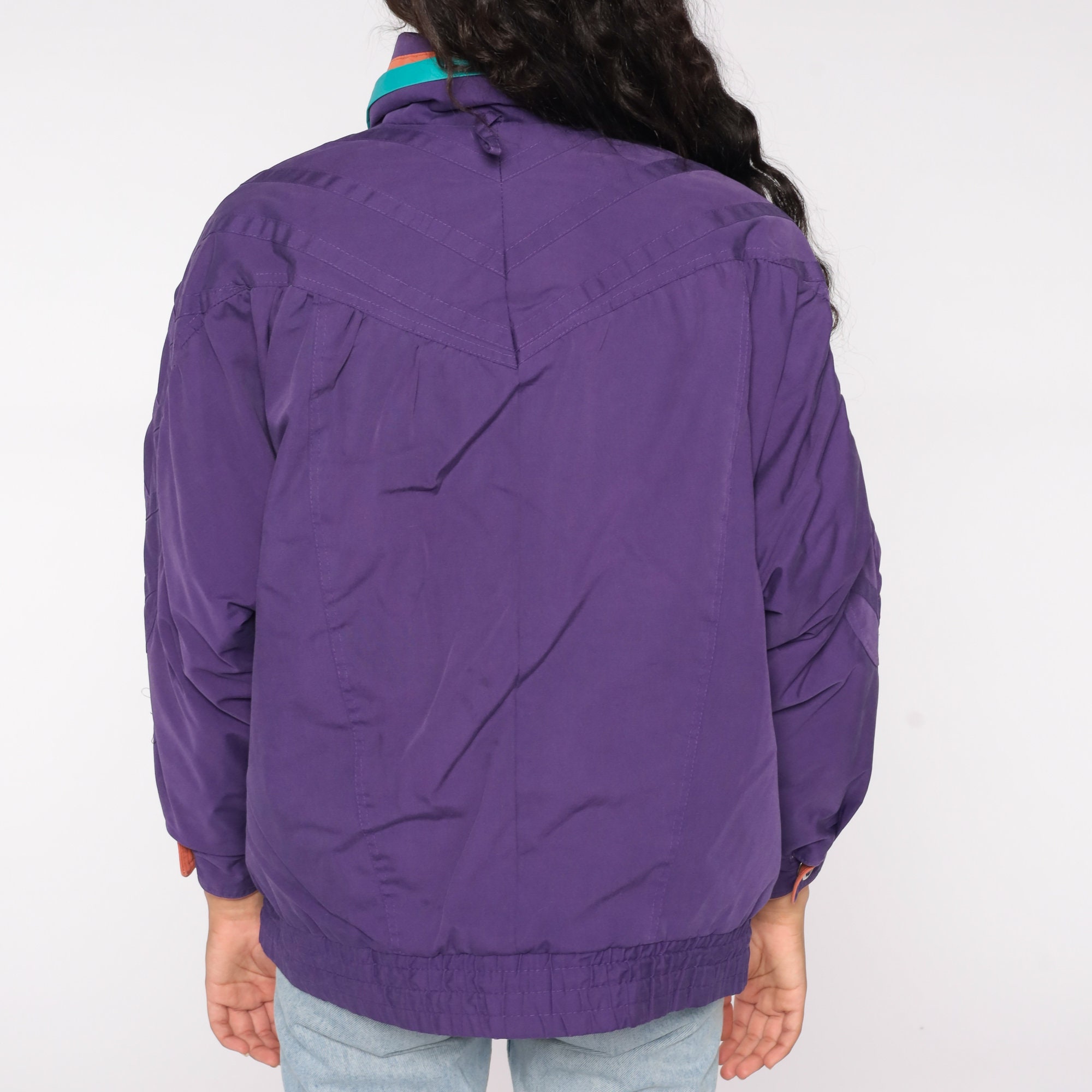 Vintage 90s windbreaker jacket in purple with turquoise and orange details. Zips up the front.