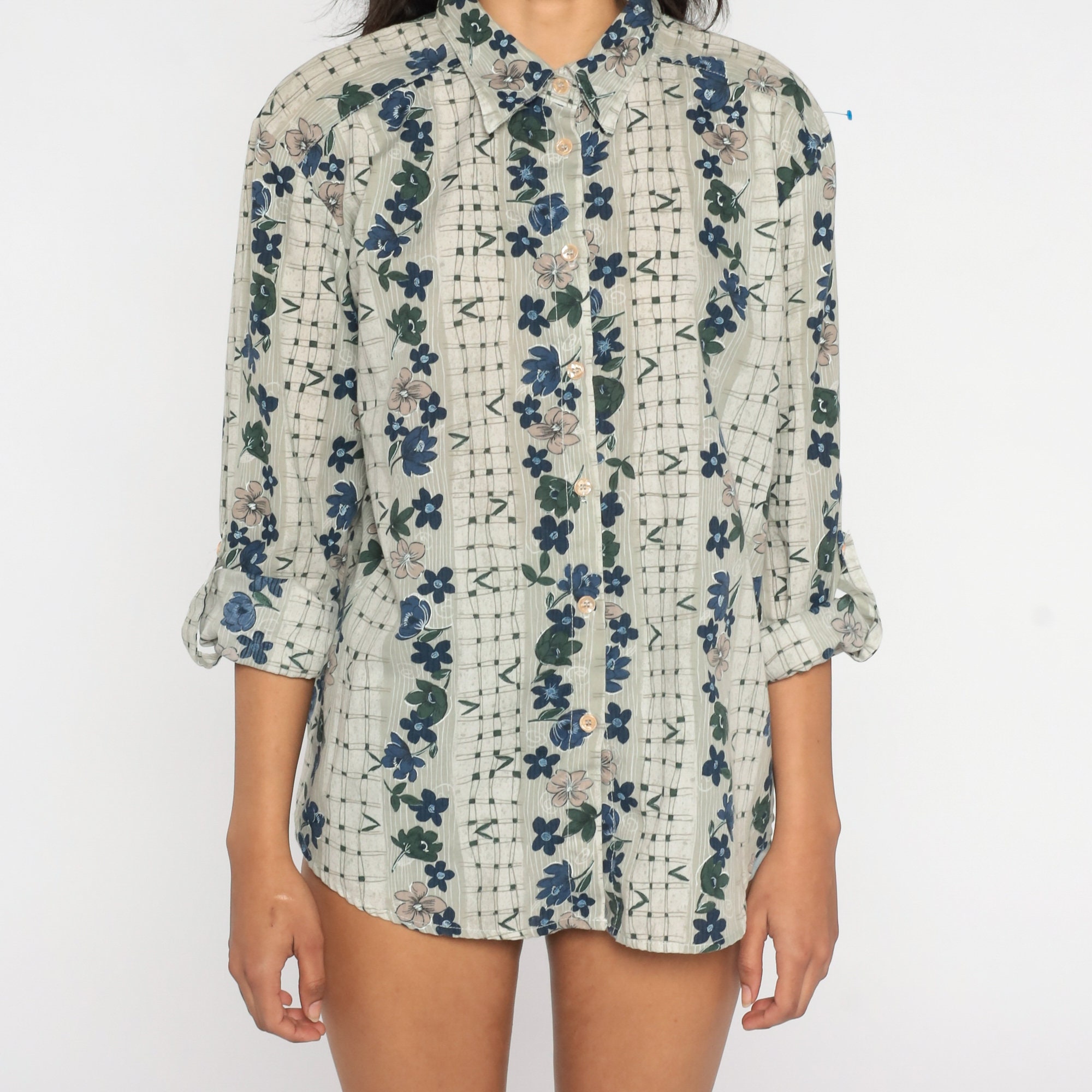 Vintage 80s 90s shirt in grey with a floral and checkered print, cuffed sleeves, and buttons up the front.