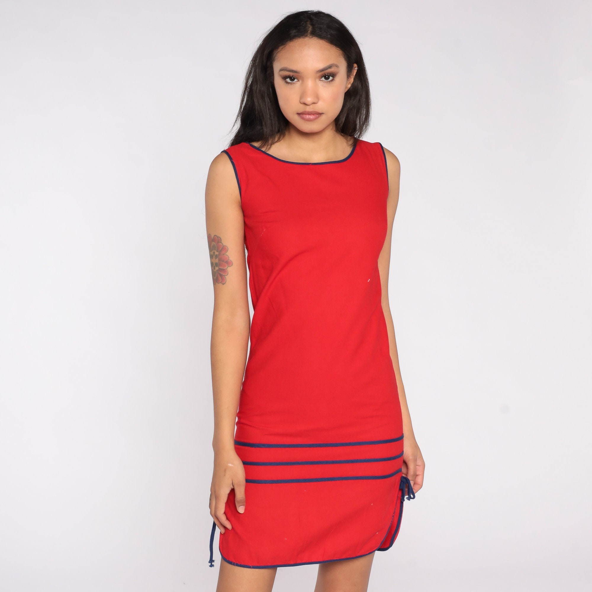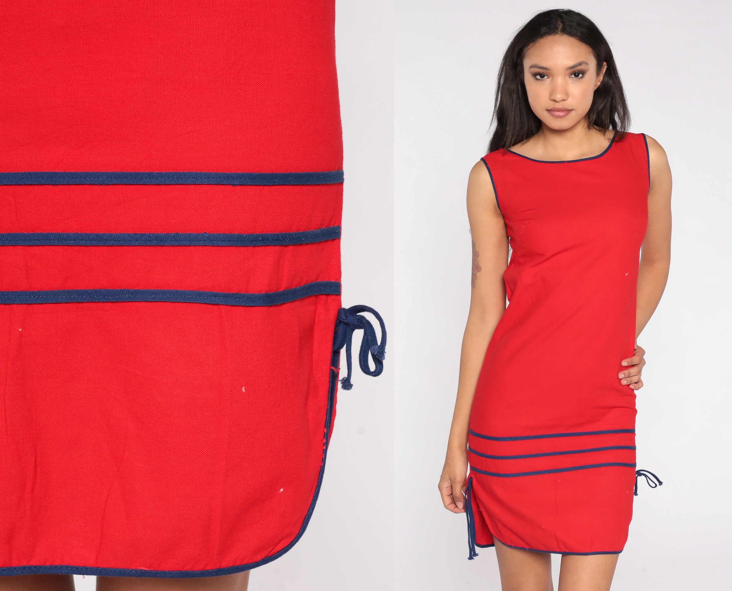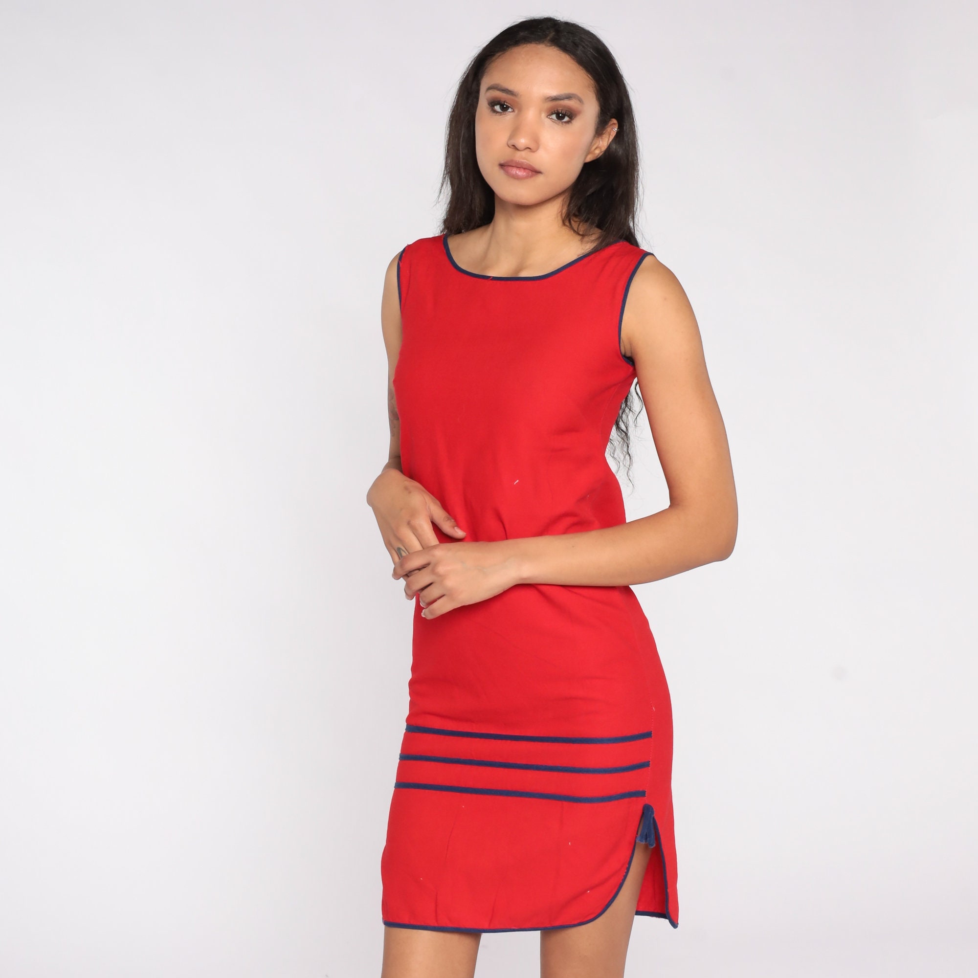Vintage 80s dress in red with striped trim and a sheath cut. Mini length.