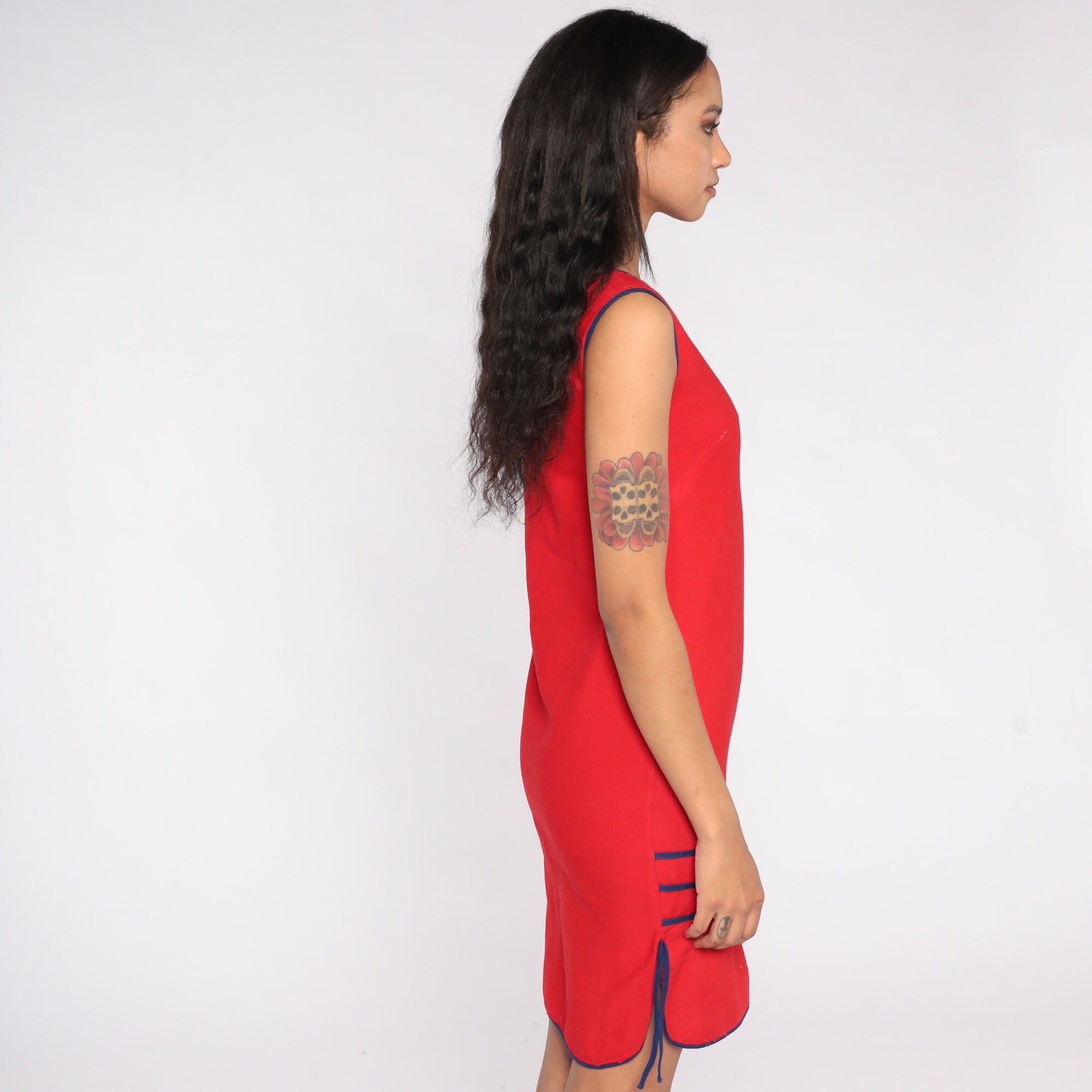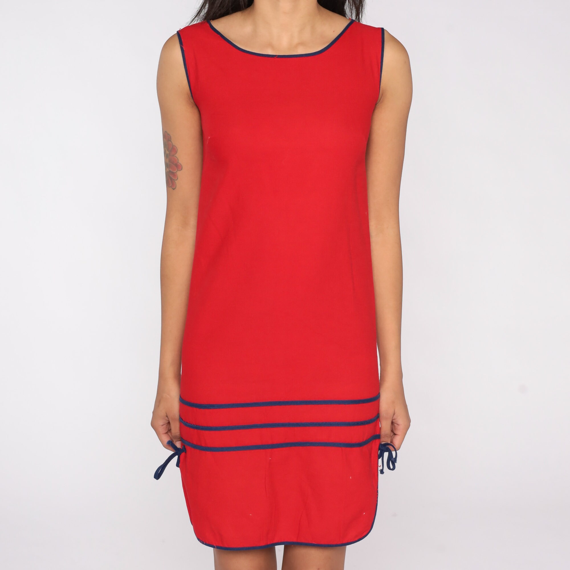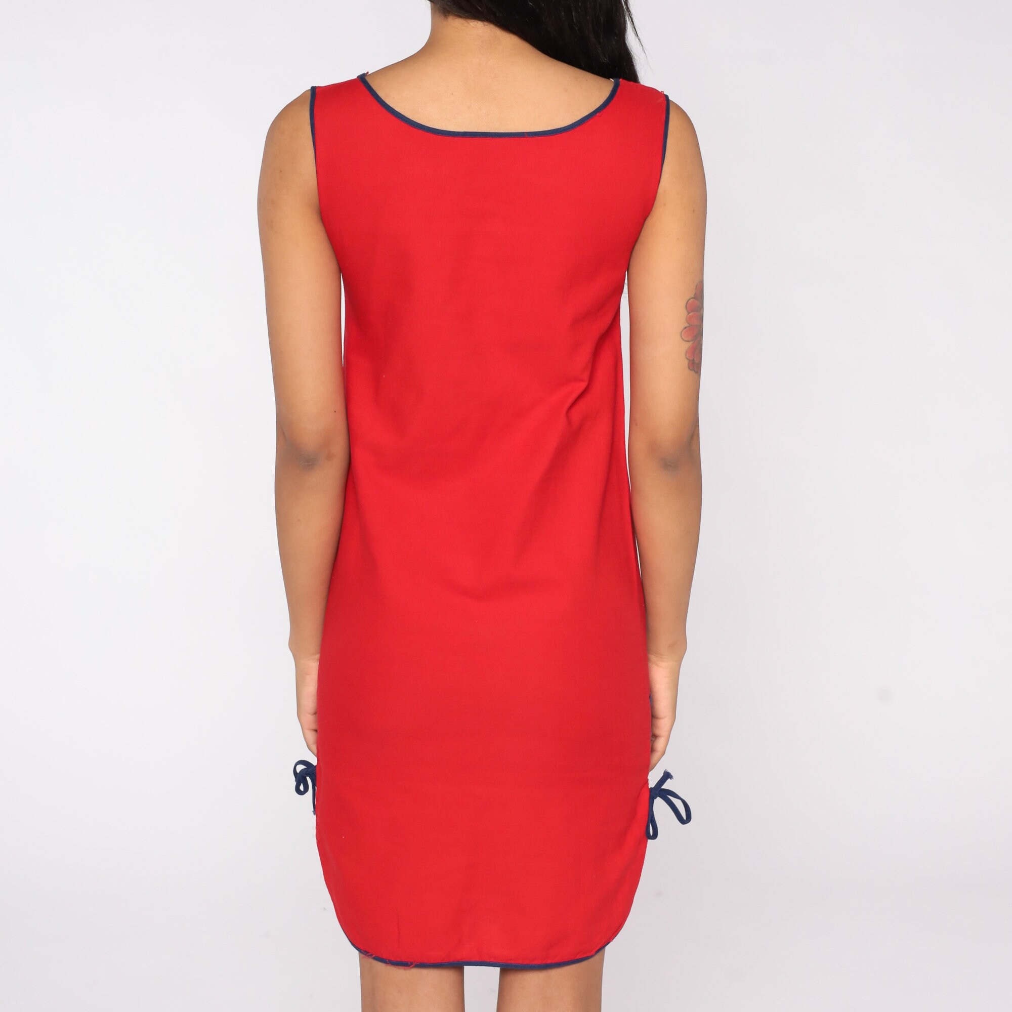Vintage 80s dress in red with striped trim and a sheath cut. Mini length.