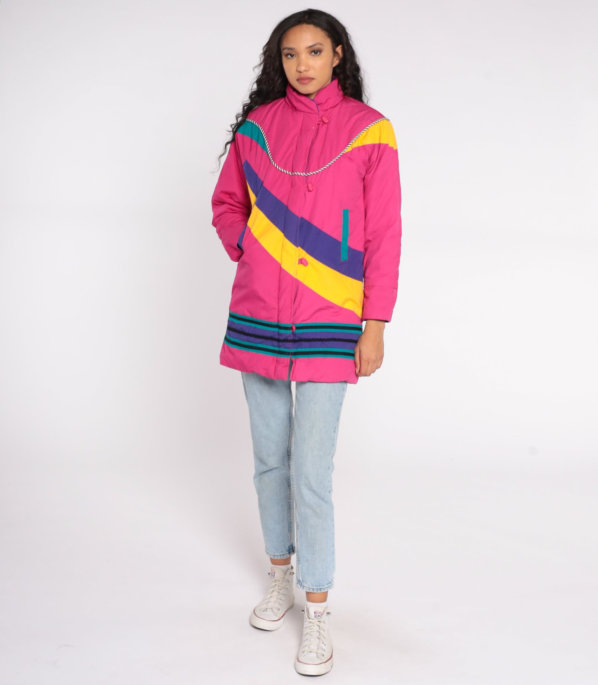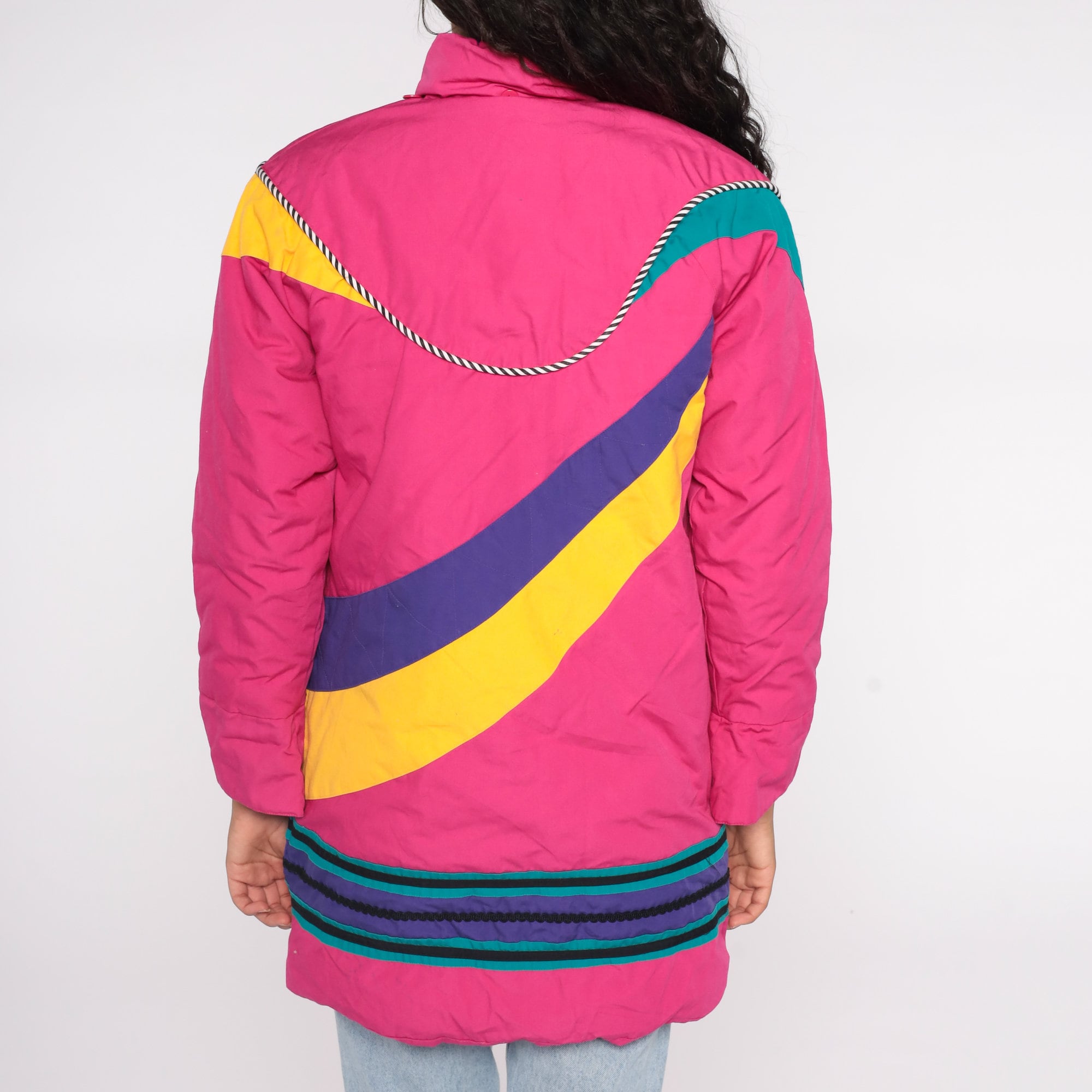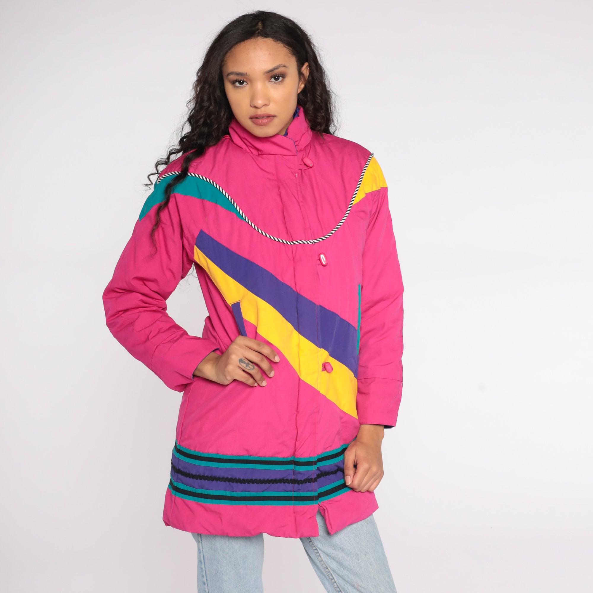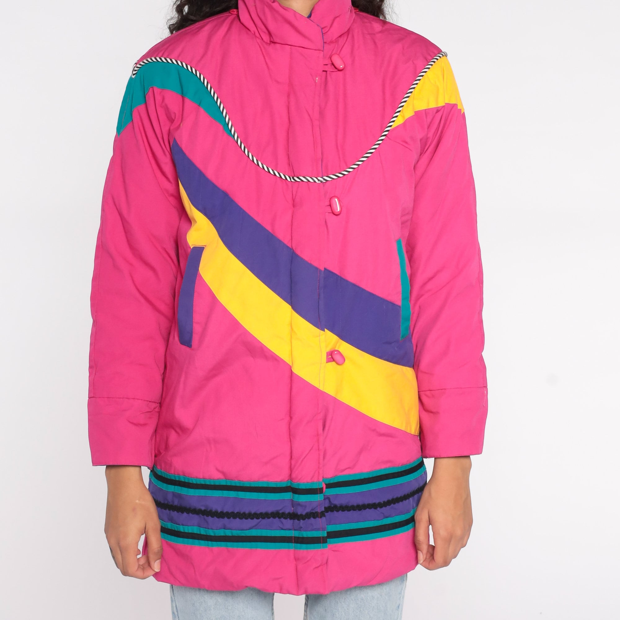 Vintage 80s puffer ski jacket in bright pink with an abstract stripe design, toggle buttons, and a floral lining. Originally for youth.