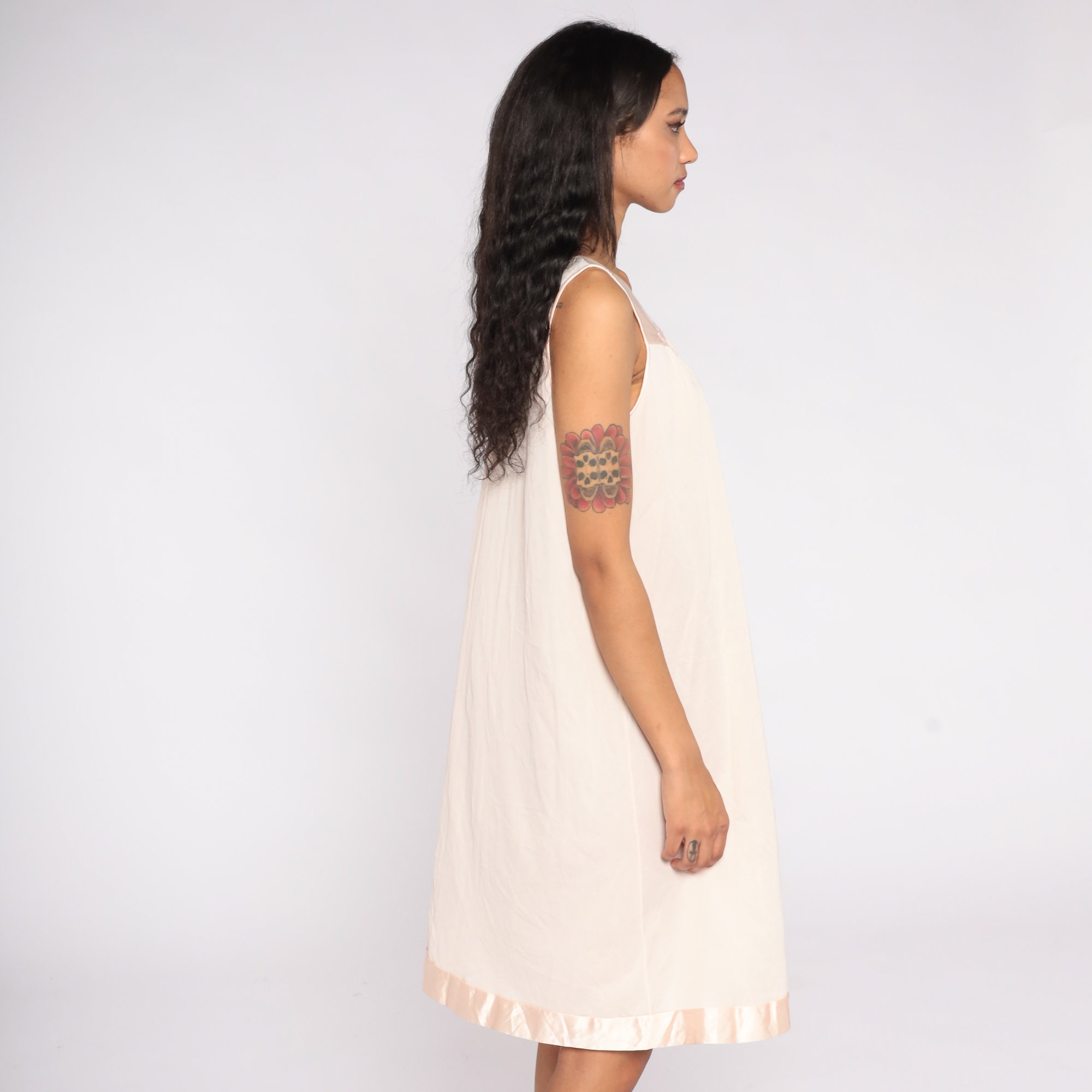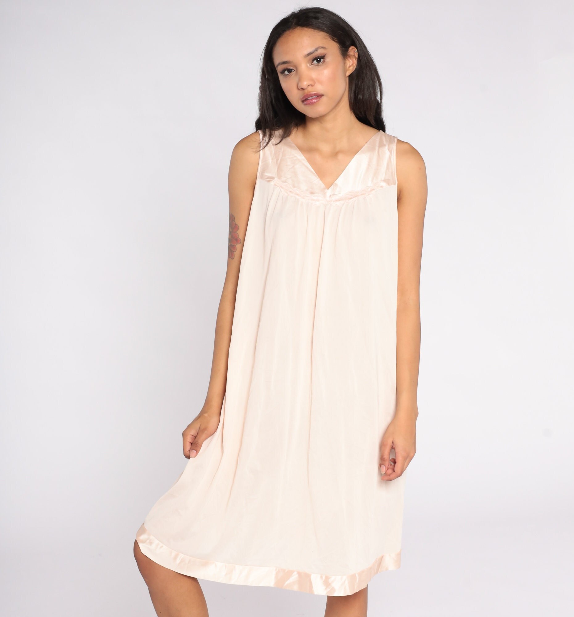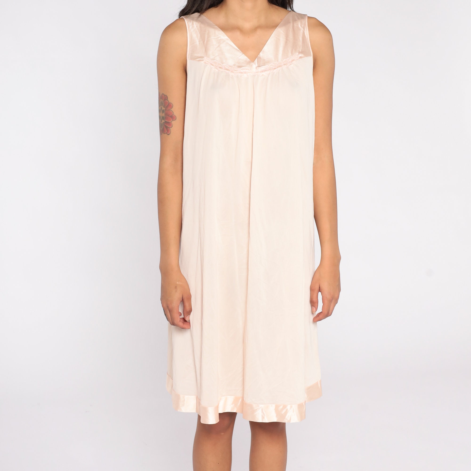 Vintage 80s nightgown in a blush pink with a shift fit, v neck and floral embroidery on the chest.