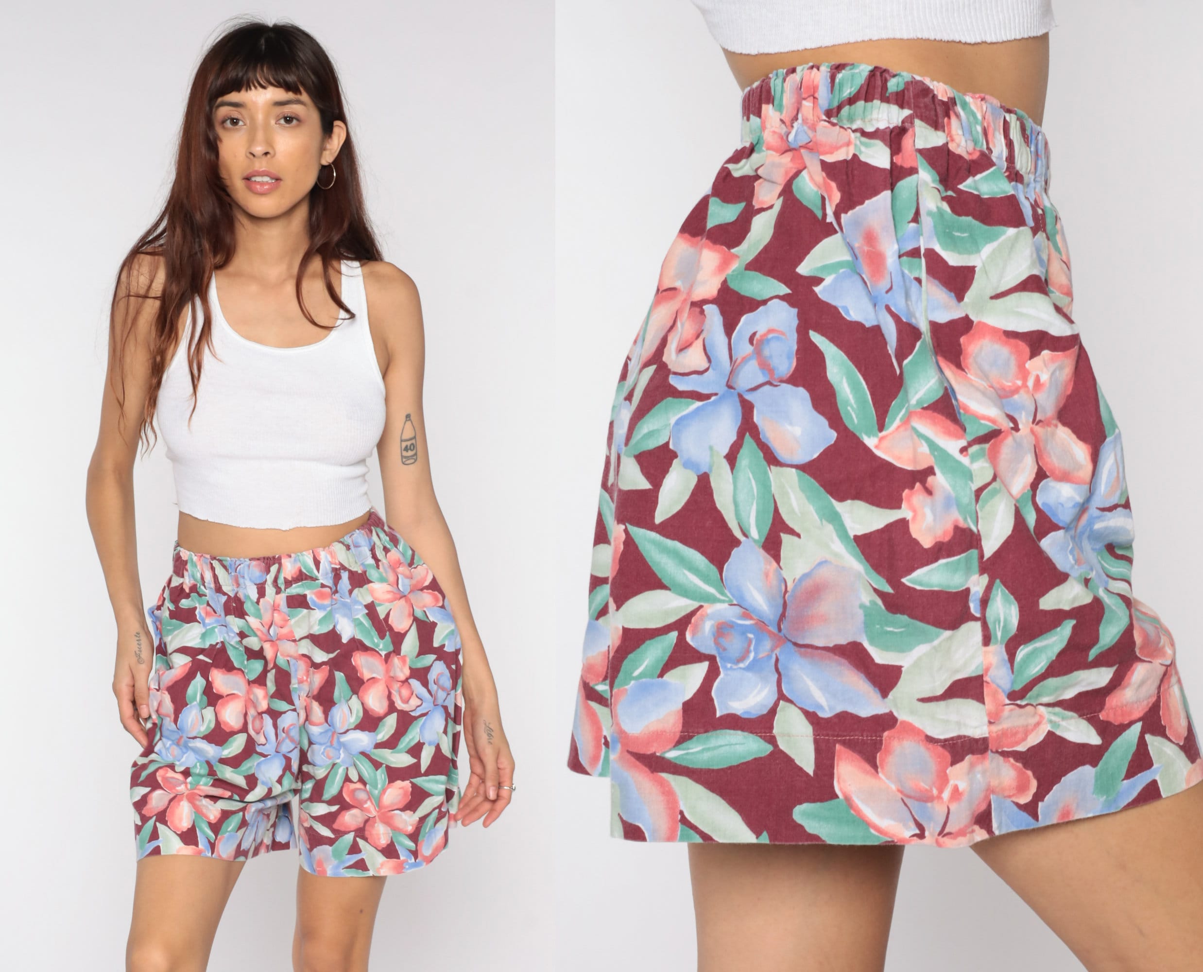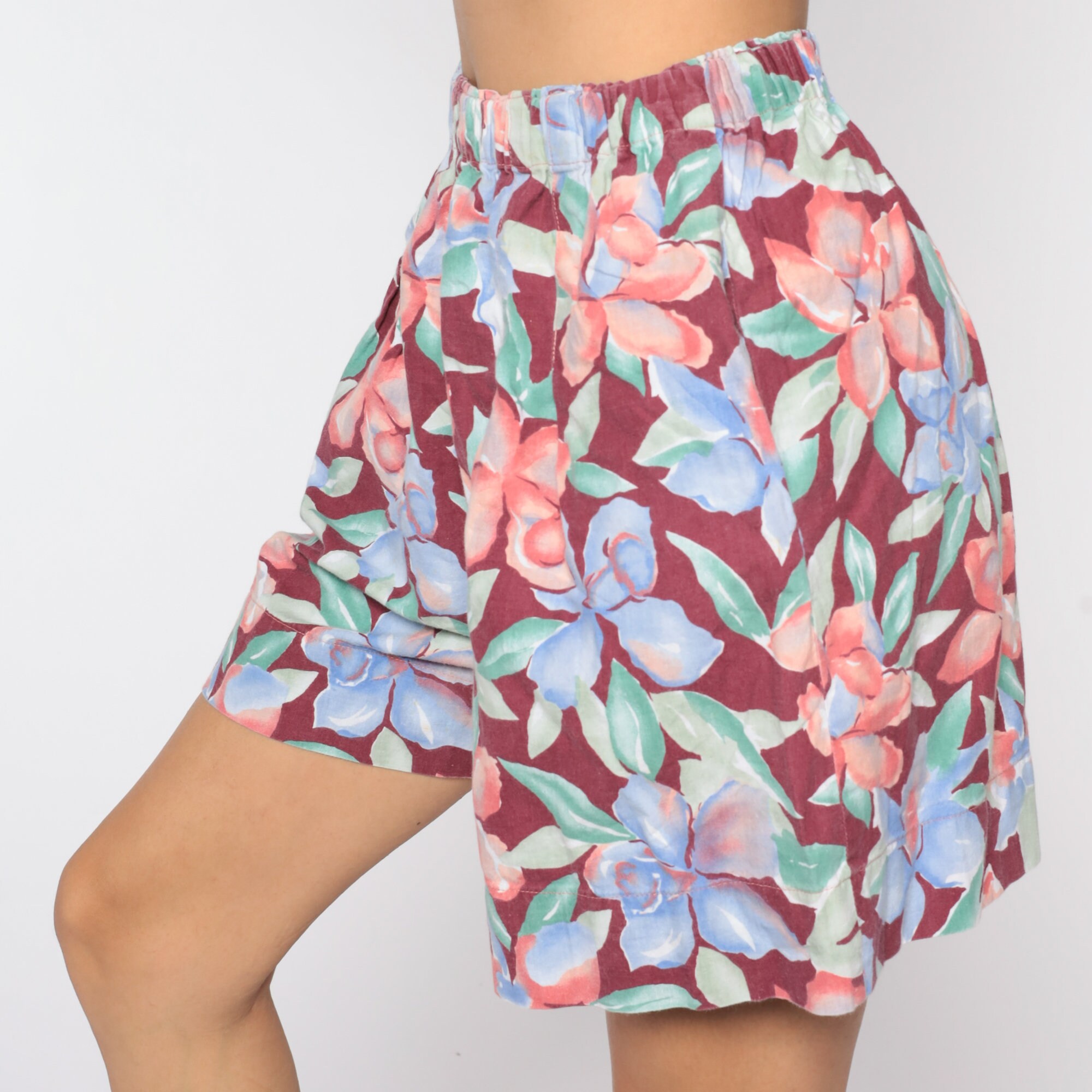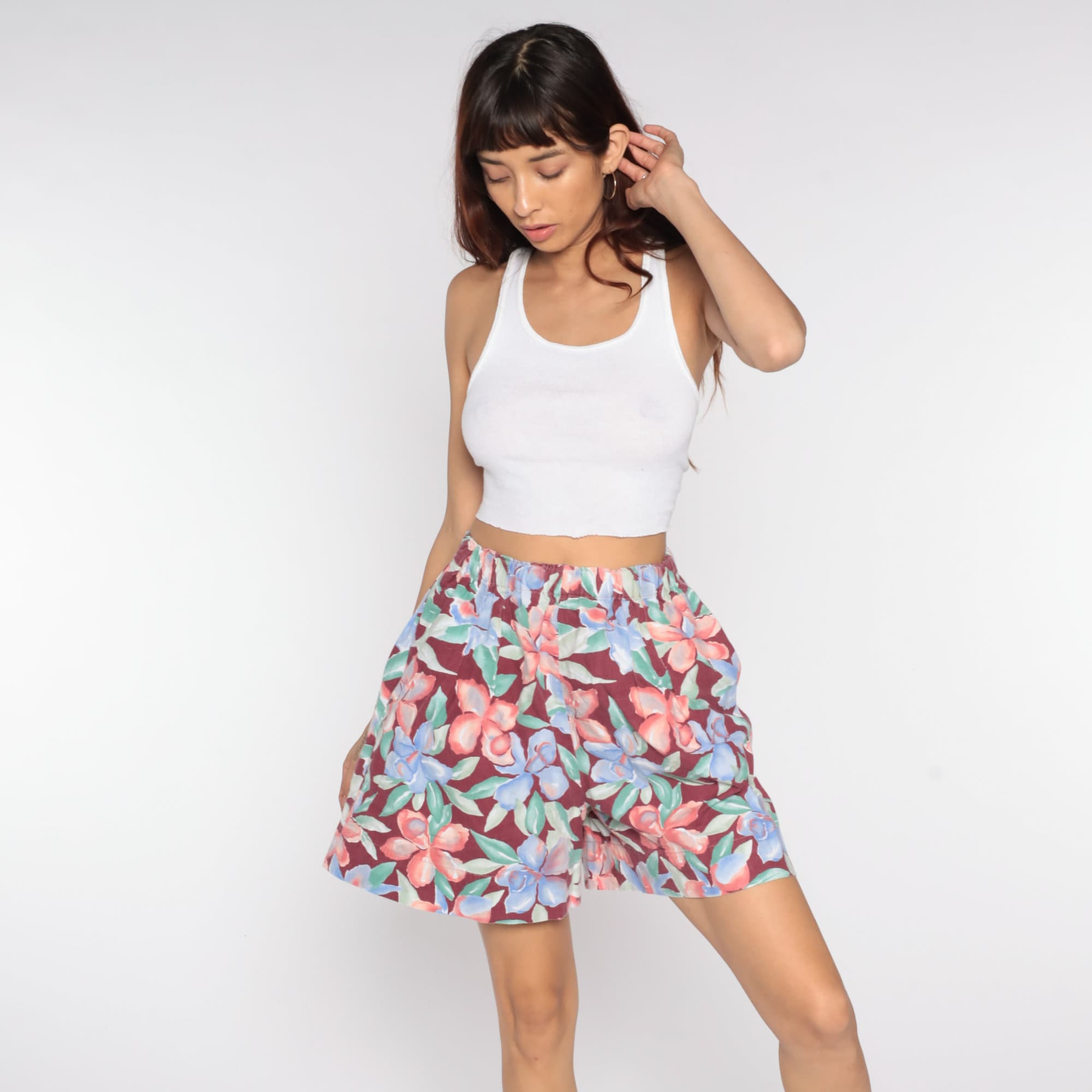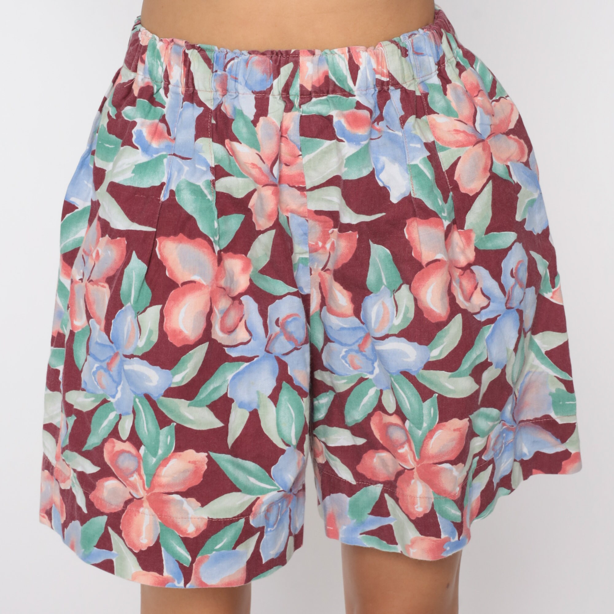 Vintage 90s shorts in a floral print with a high elastic waist and a baggy fit.