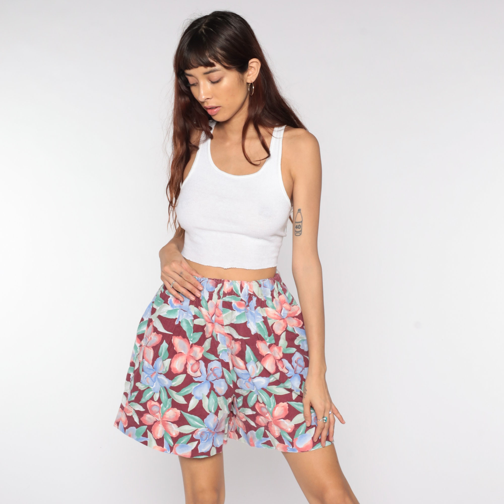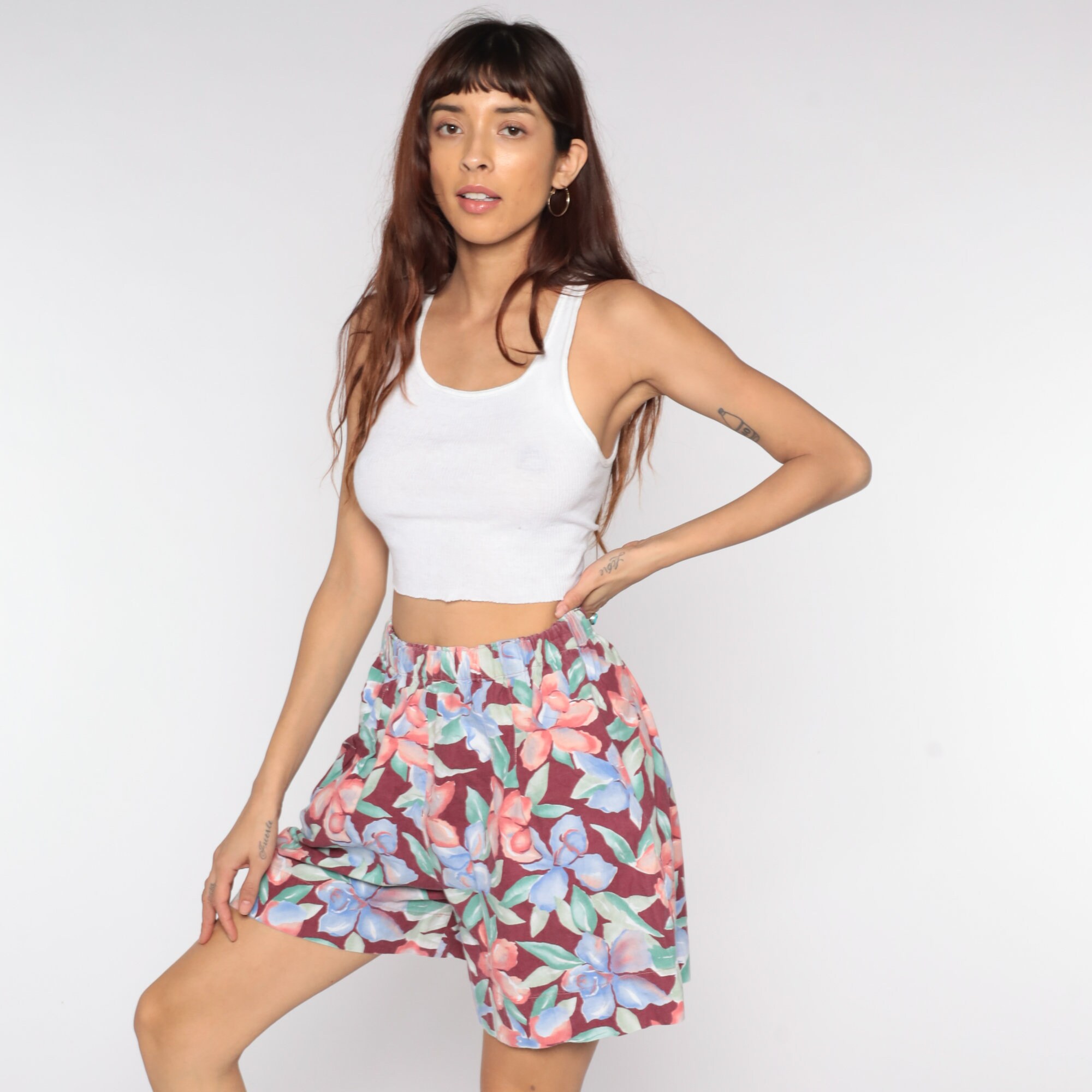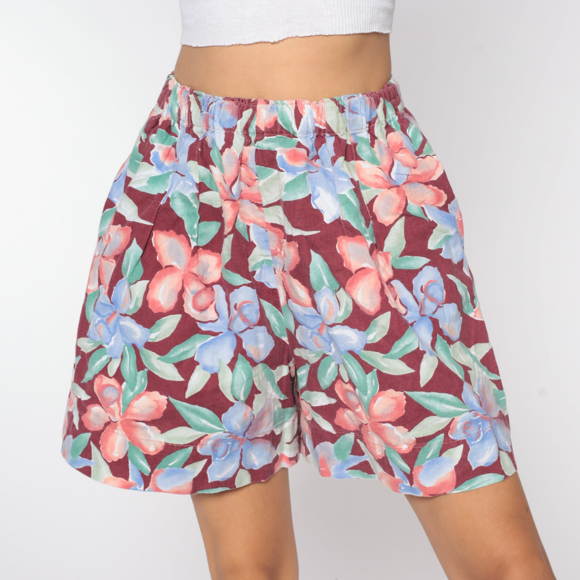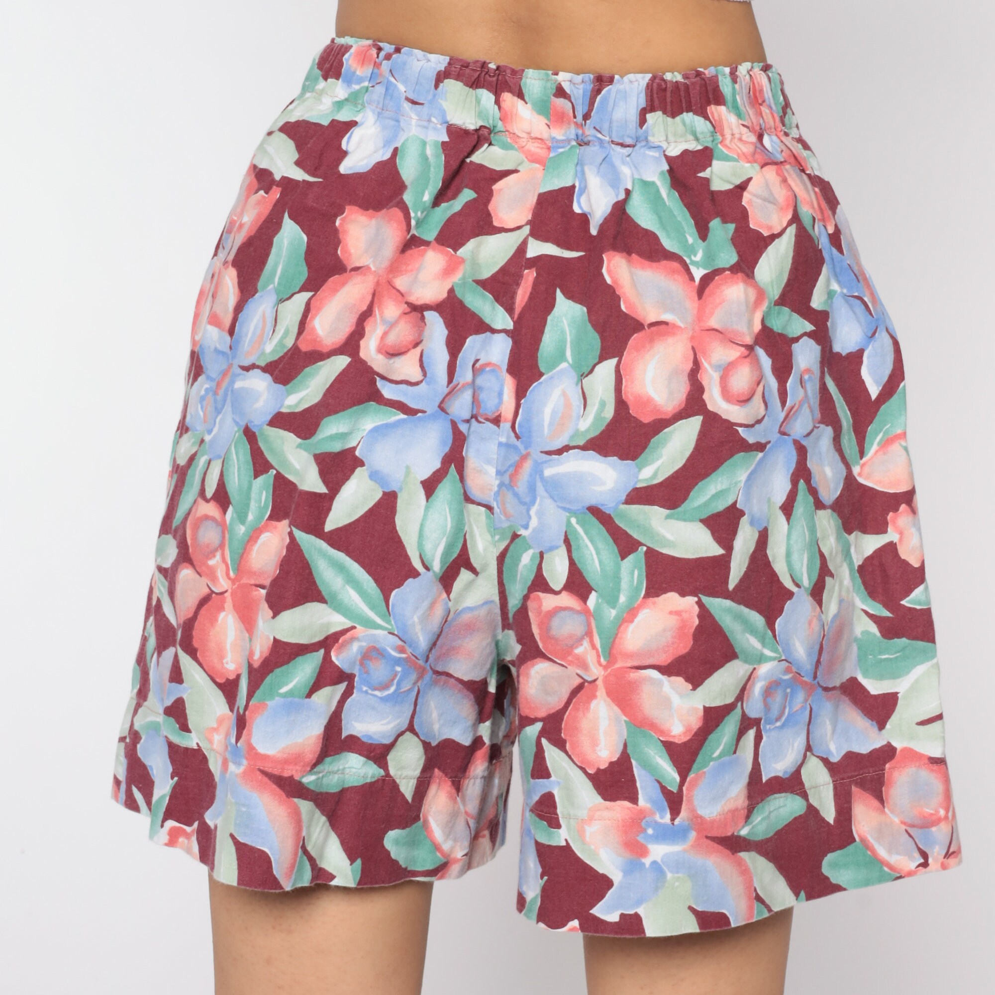 Vintage 90s shorts in a floral print with a high elastic waist and a baggy fit.