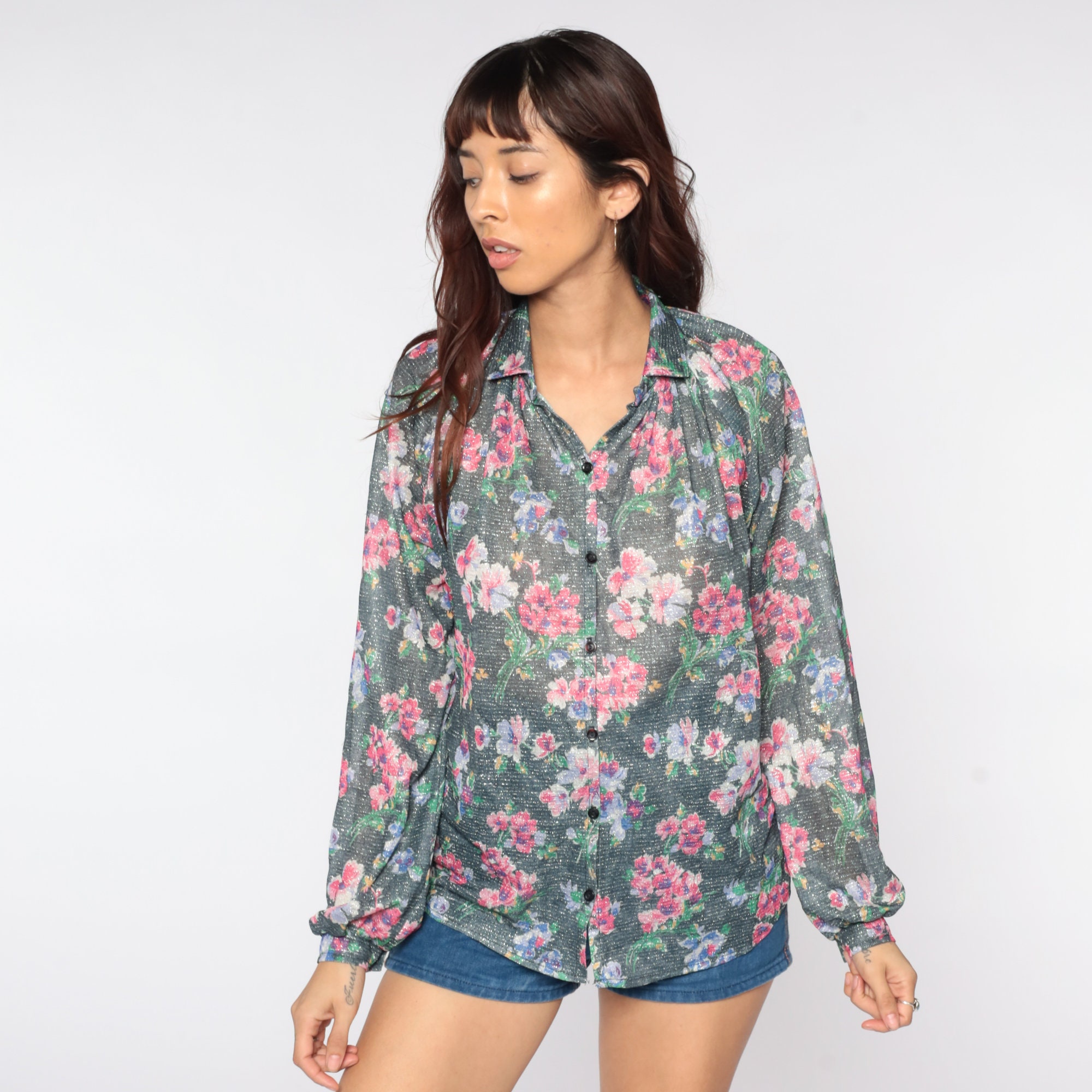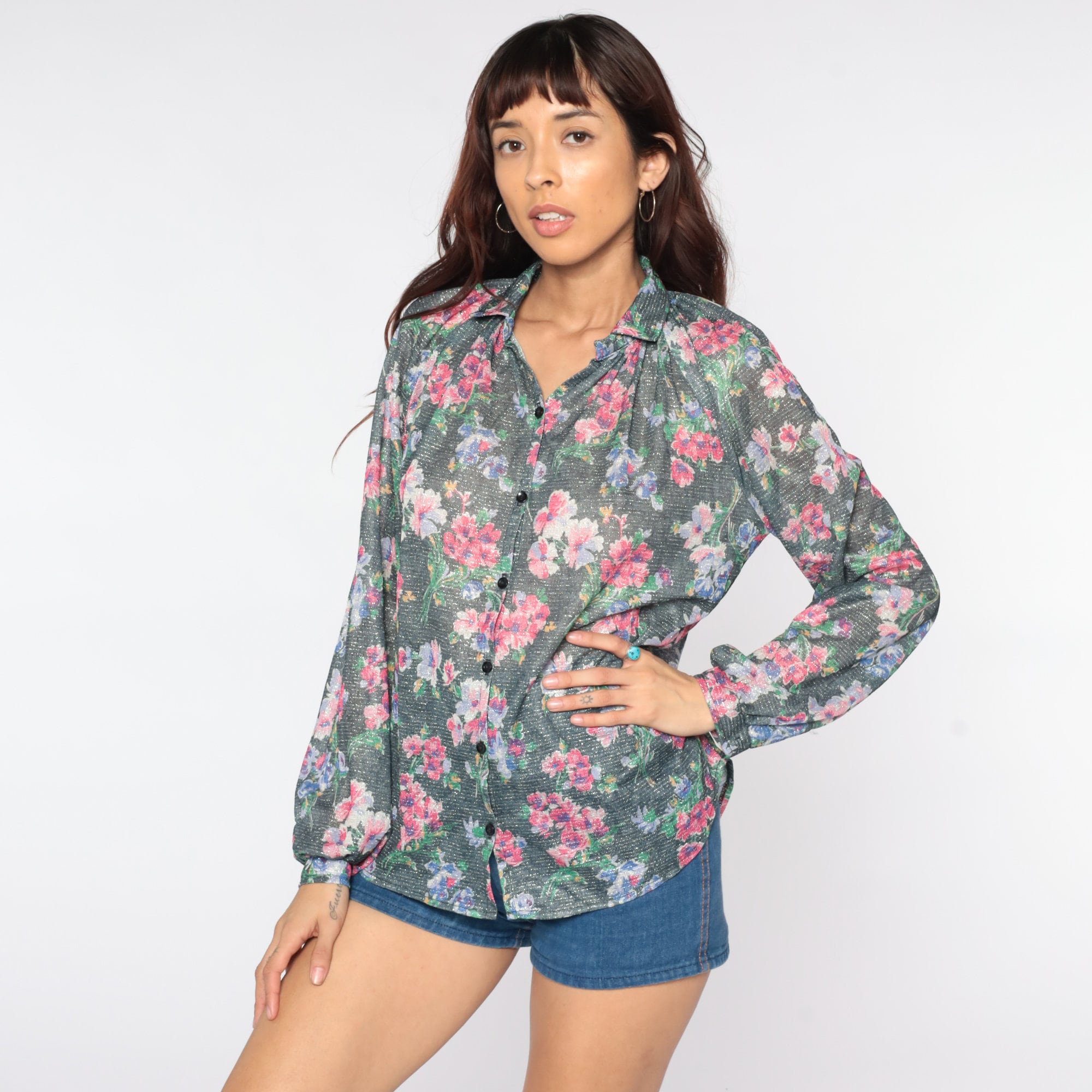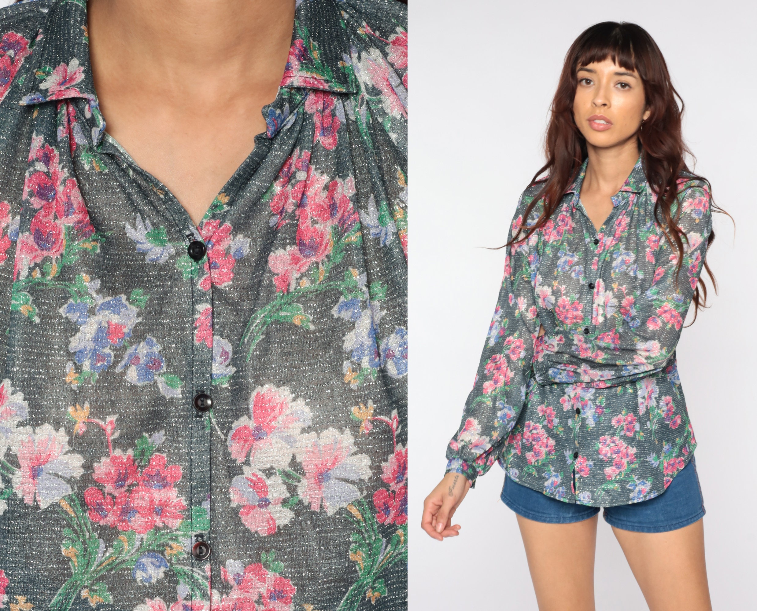 Vintage 70s blouse in silver with a floral design and buttons down the front.