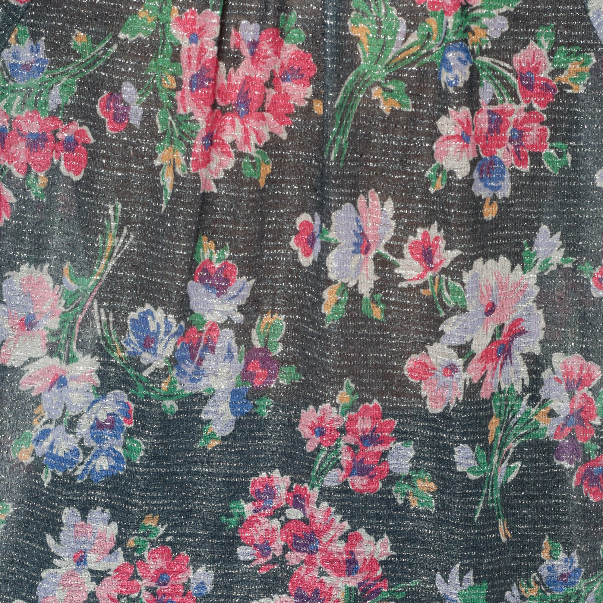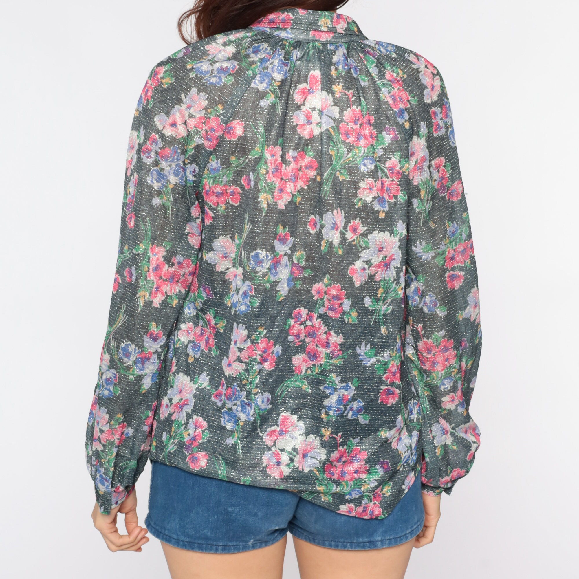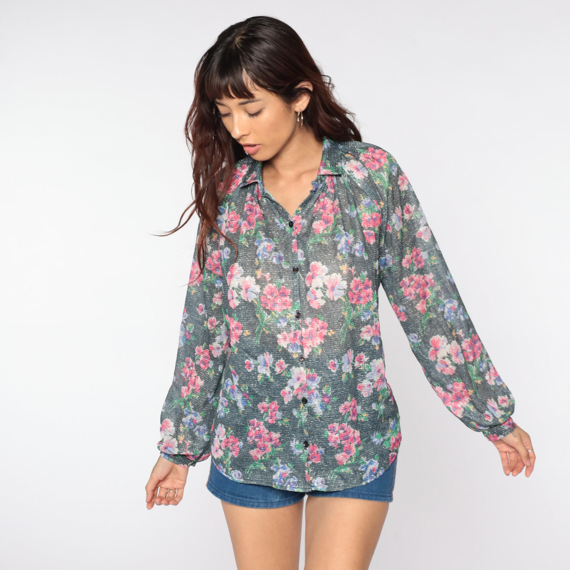 Vintage 70s blouse in silver with a floral design and buttons down the front.