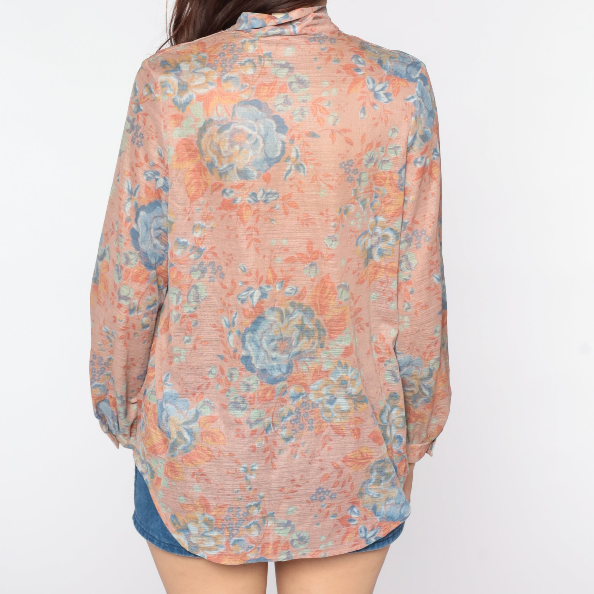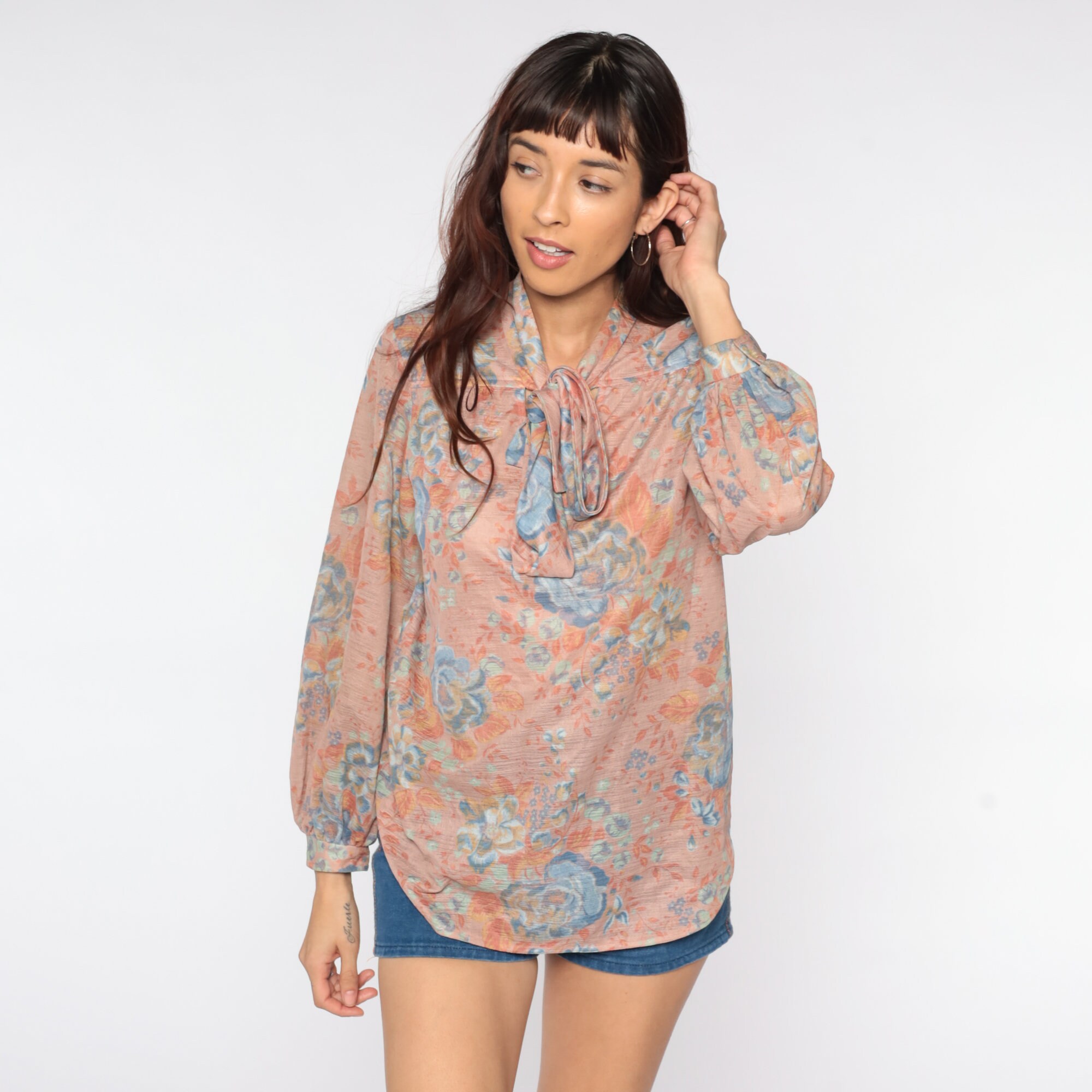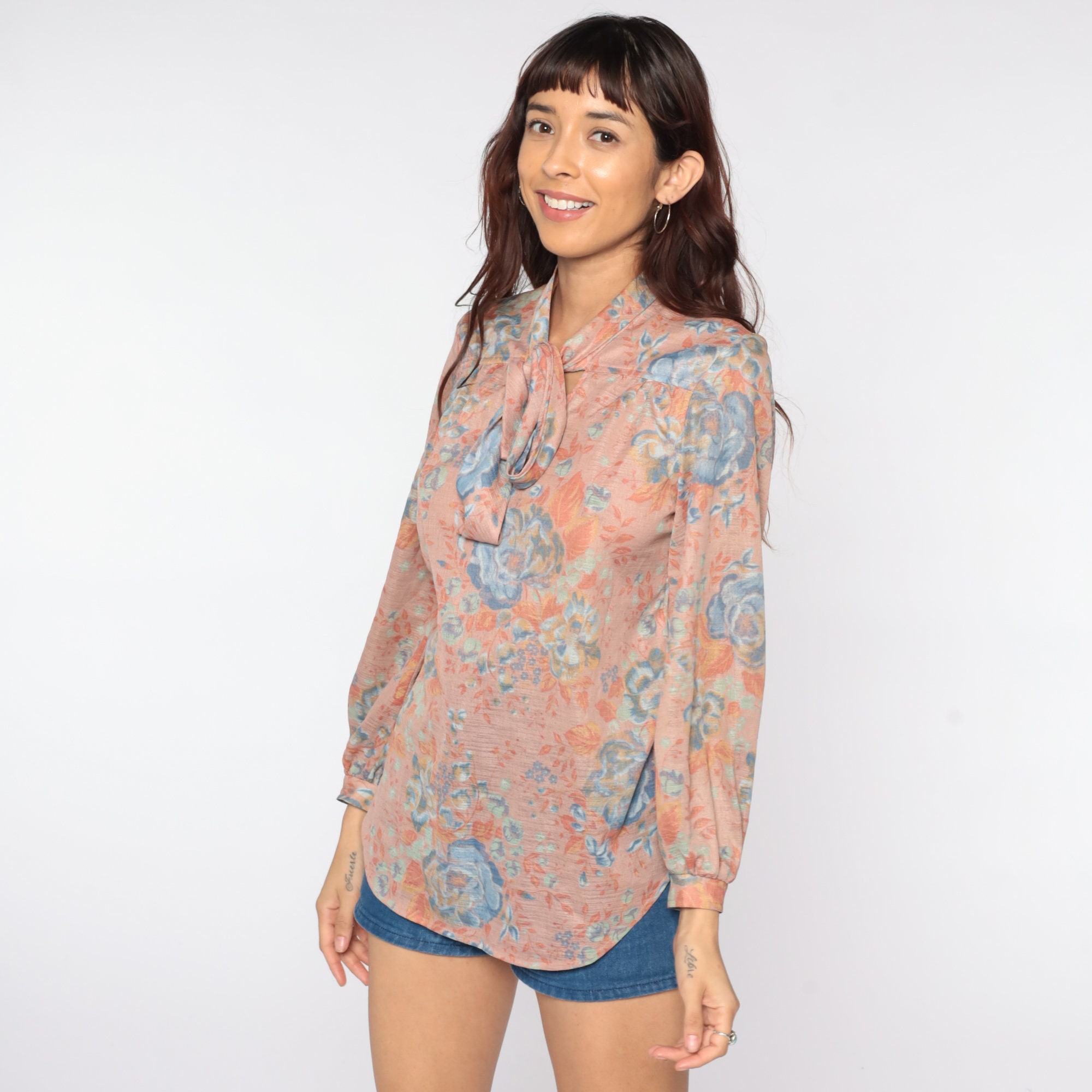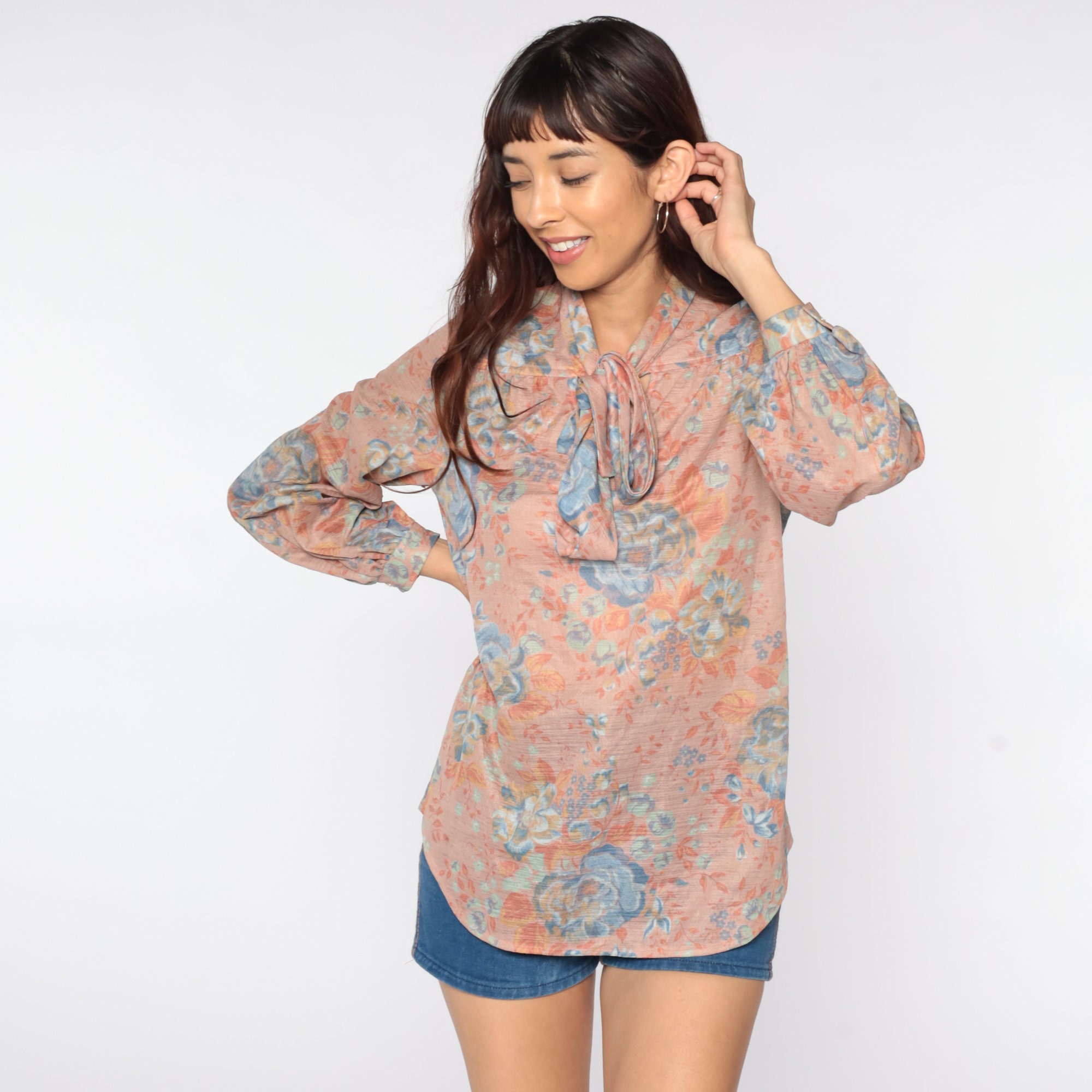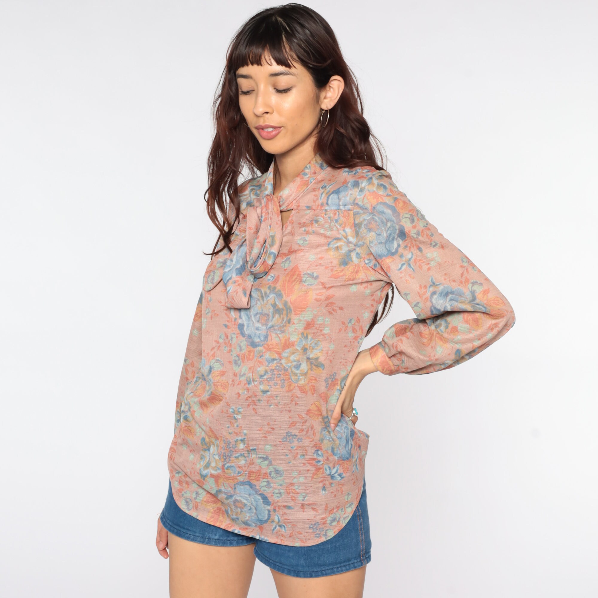 Vintage 70s blouse with a floral print and an ascot bow at the neck. Pullover style.
