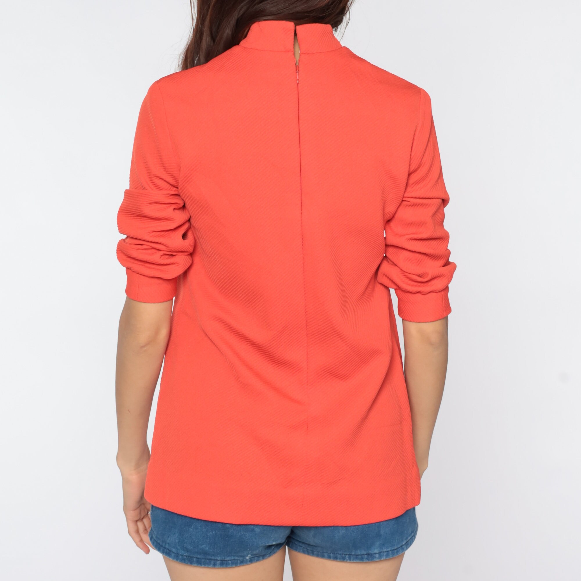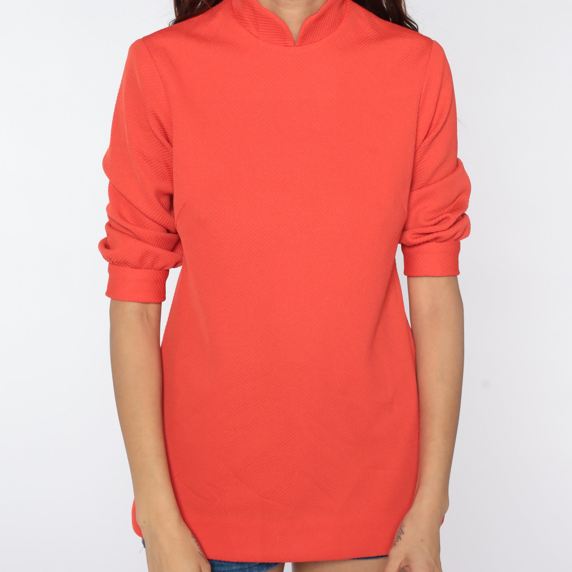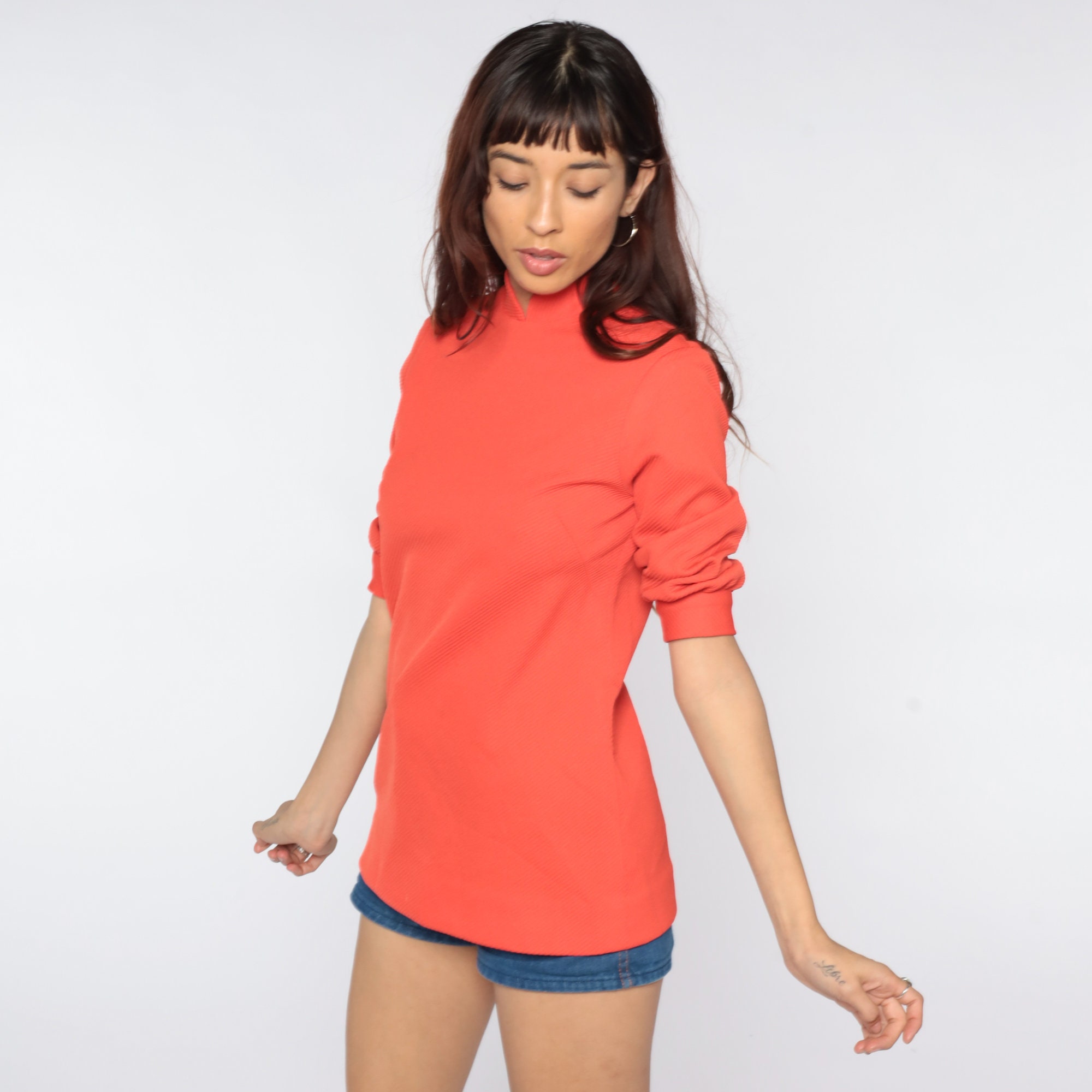 Vintage 70s shirt in reddish orange with a mandarin collar, a rear zipper and short sleeves.