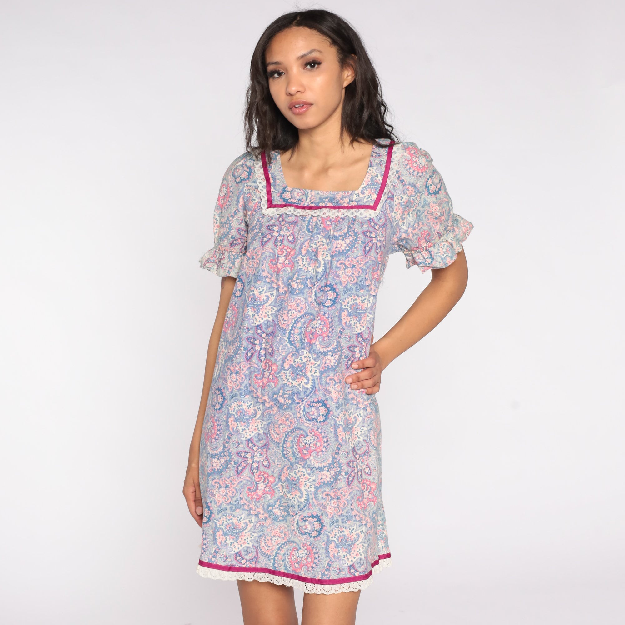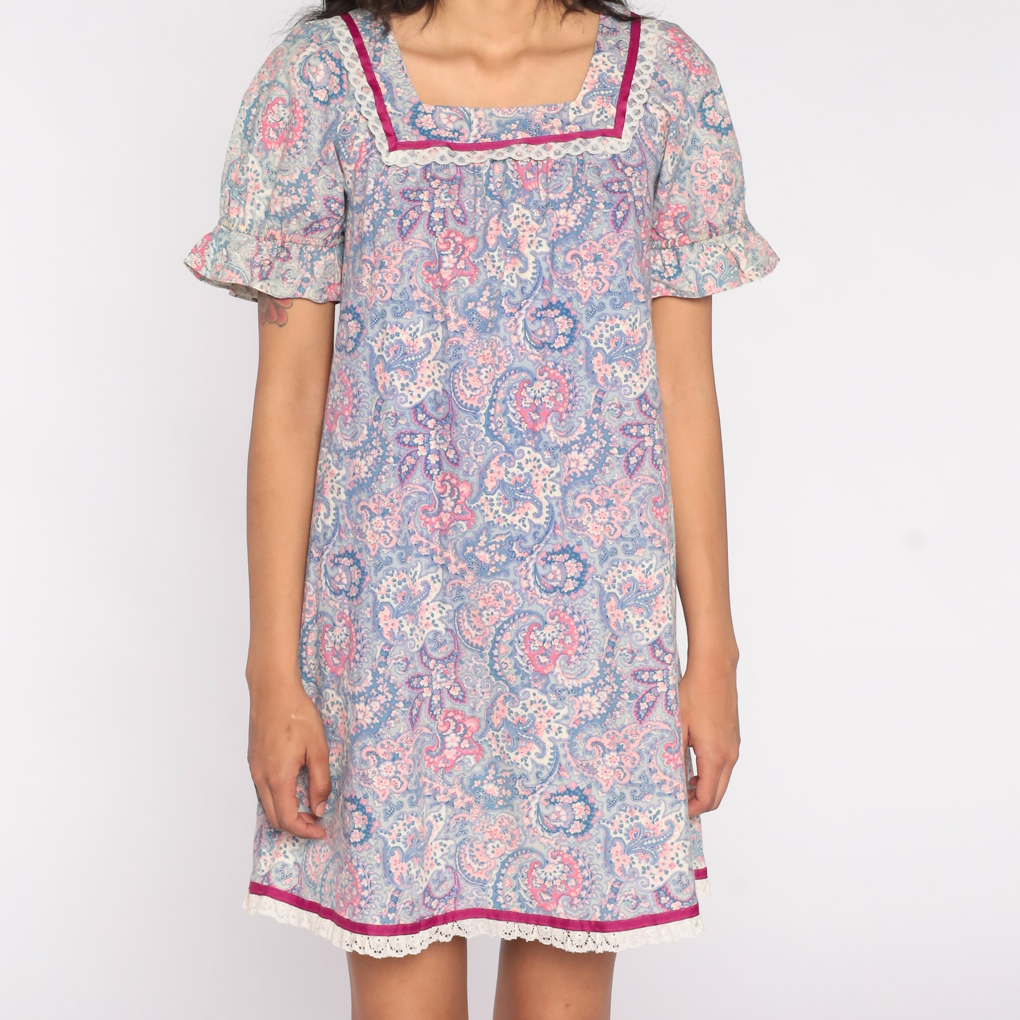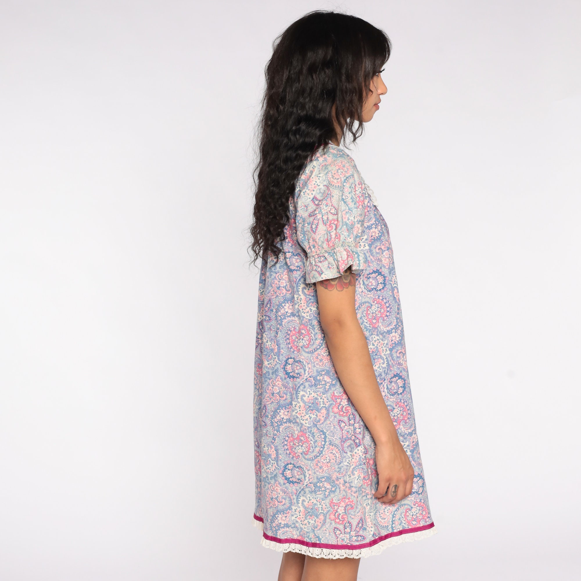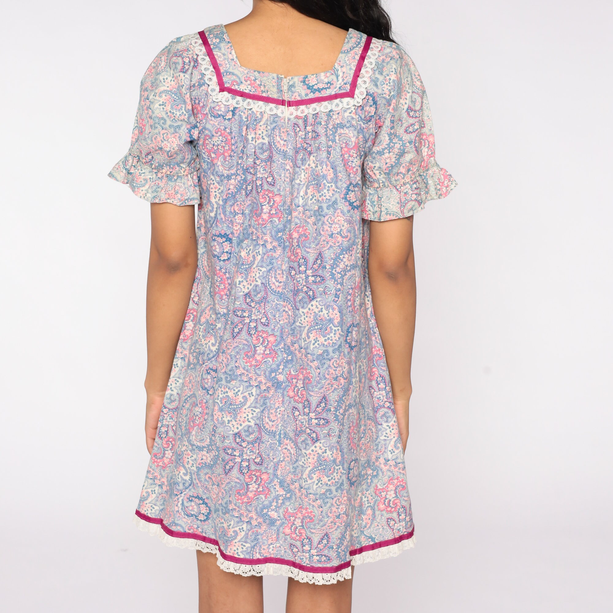 Vintage 80s dress with a paisley print, a shift cut, and puff sleeves. Mini length with lace trim.