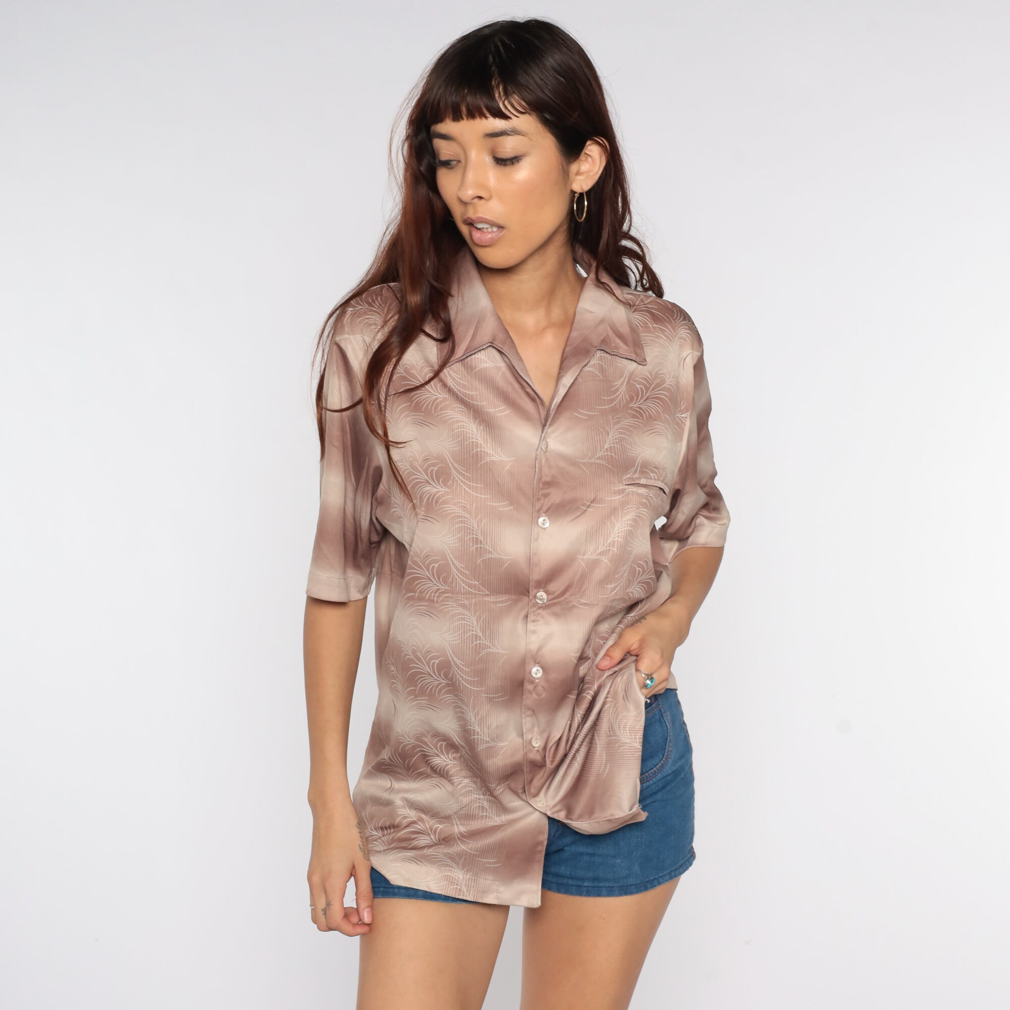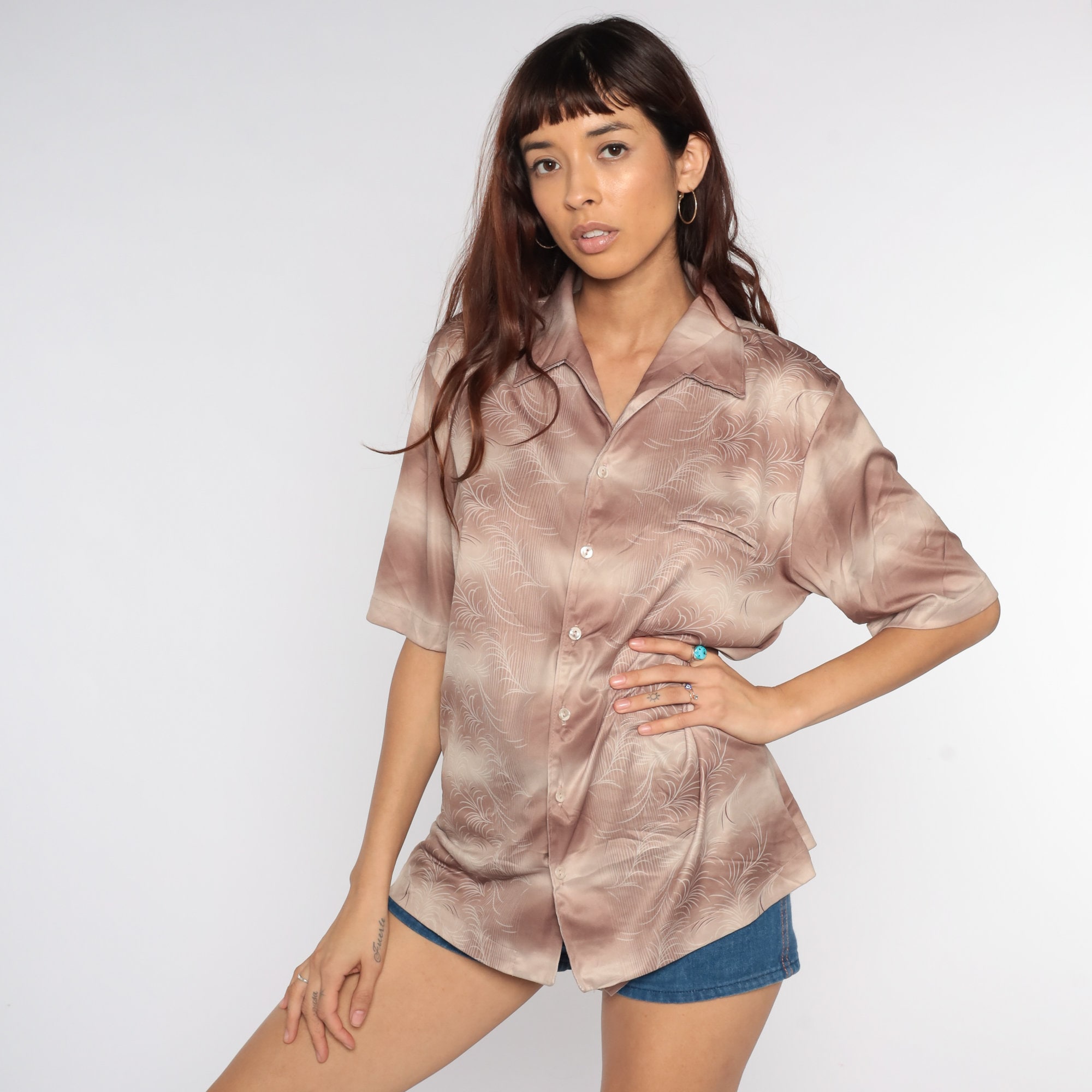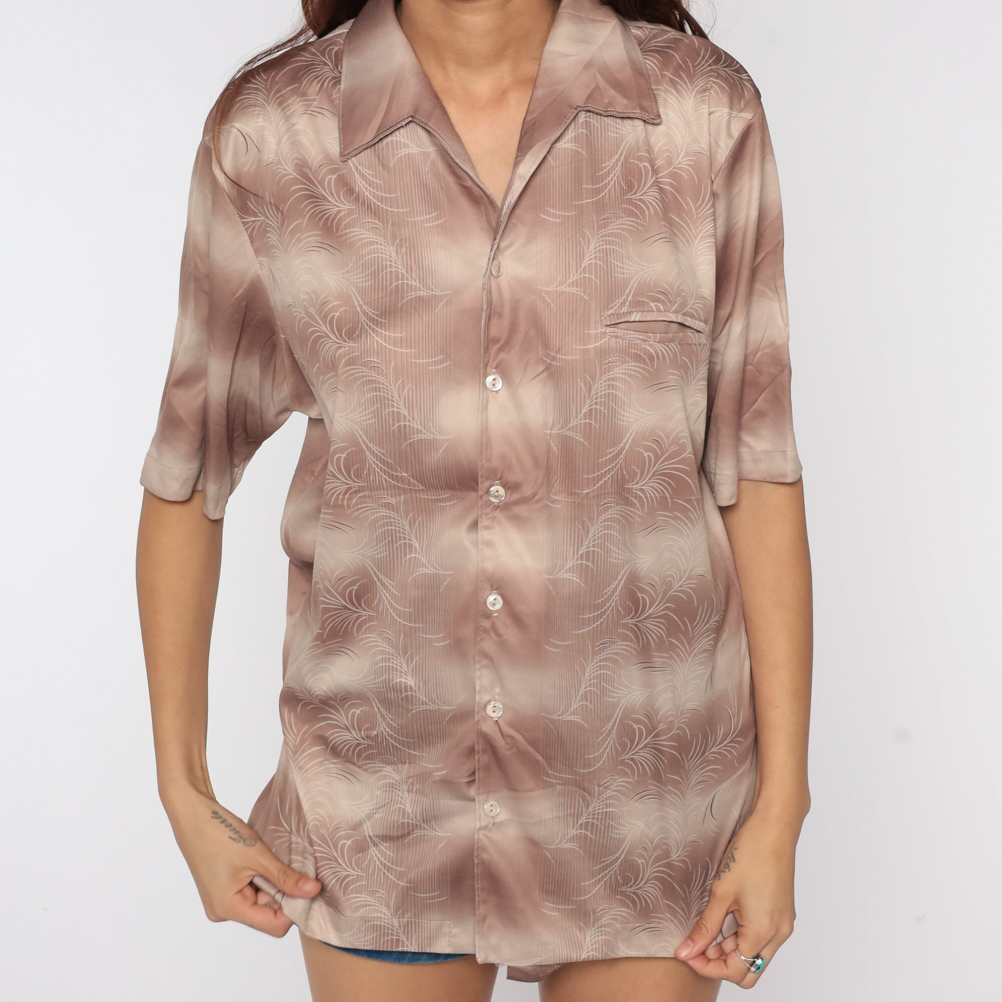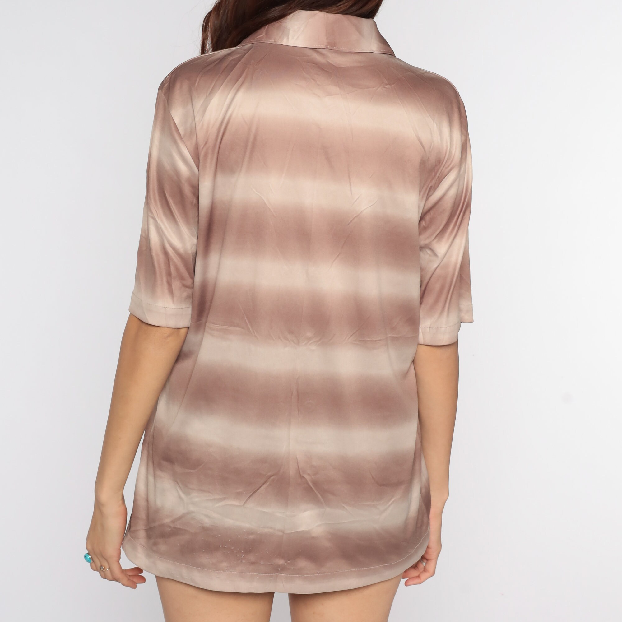Vintage 70s shirt with stripes and an abstract print. Buttons up the front with an oversize collar and short sleeves.