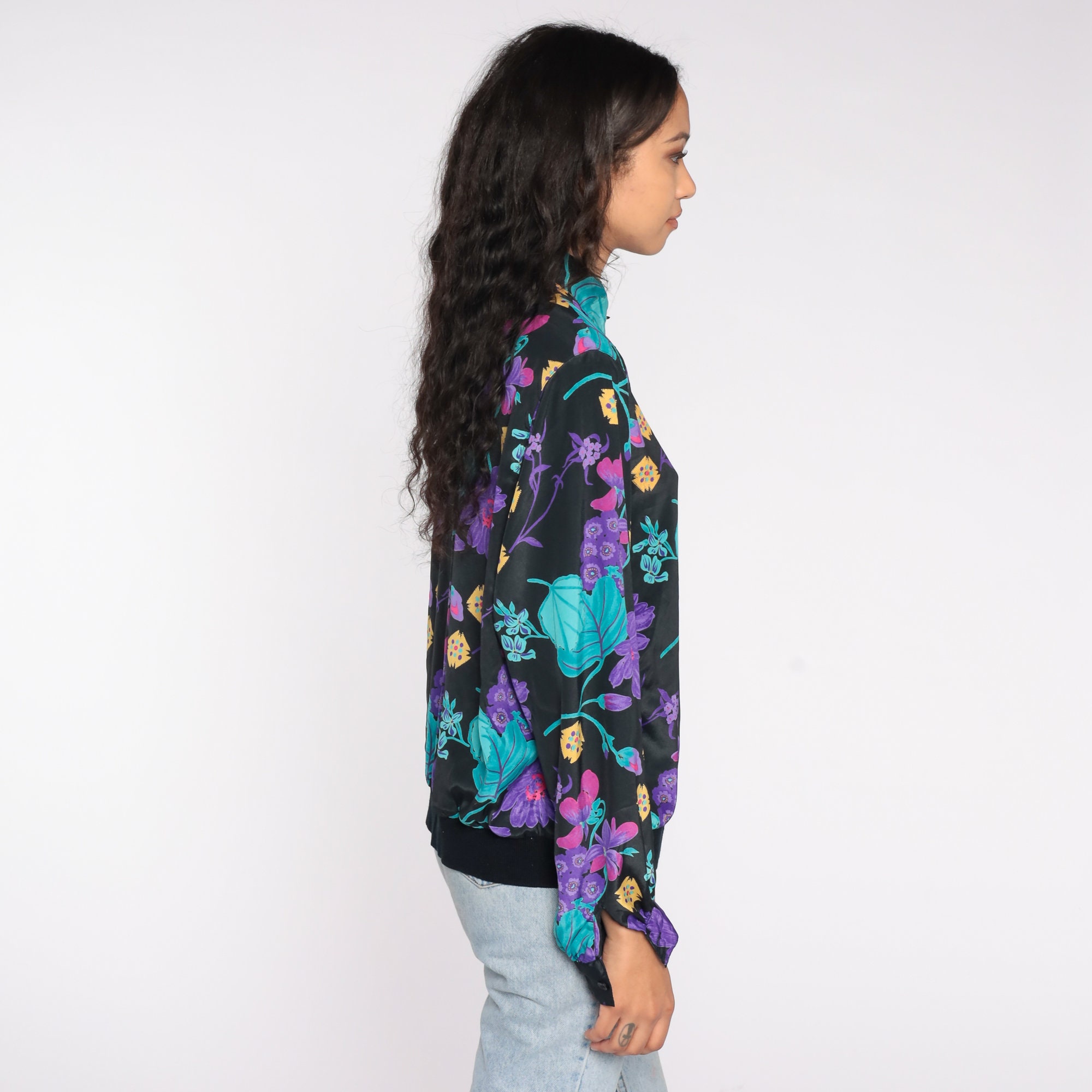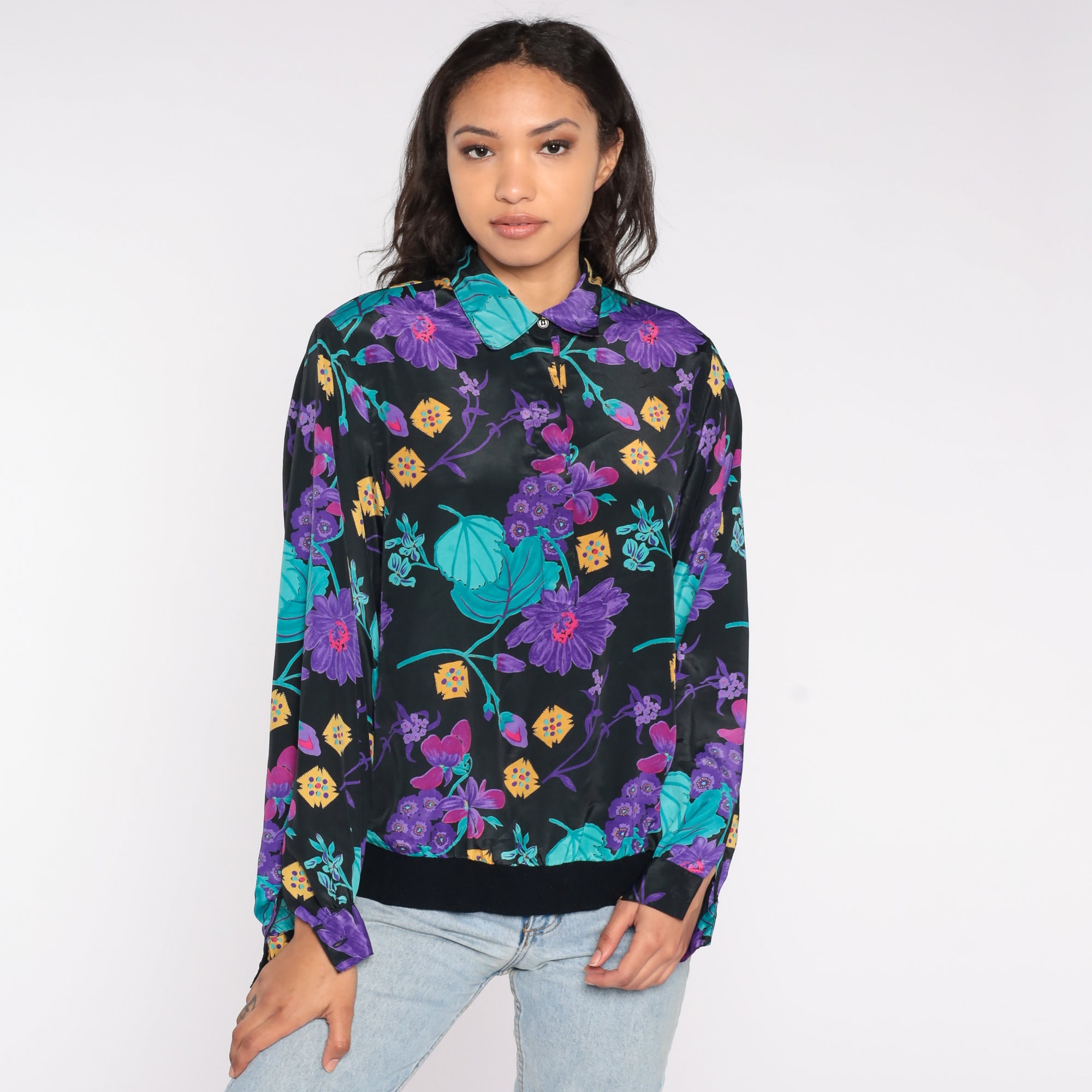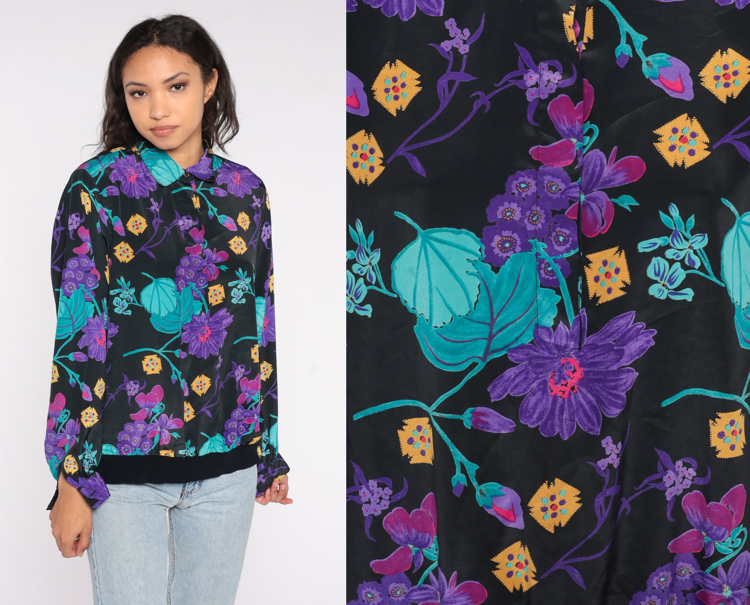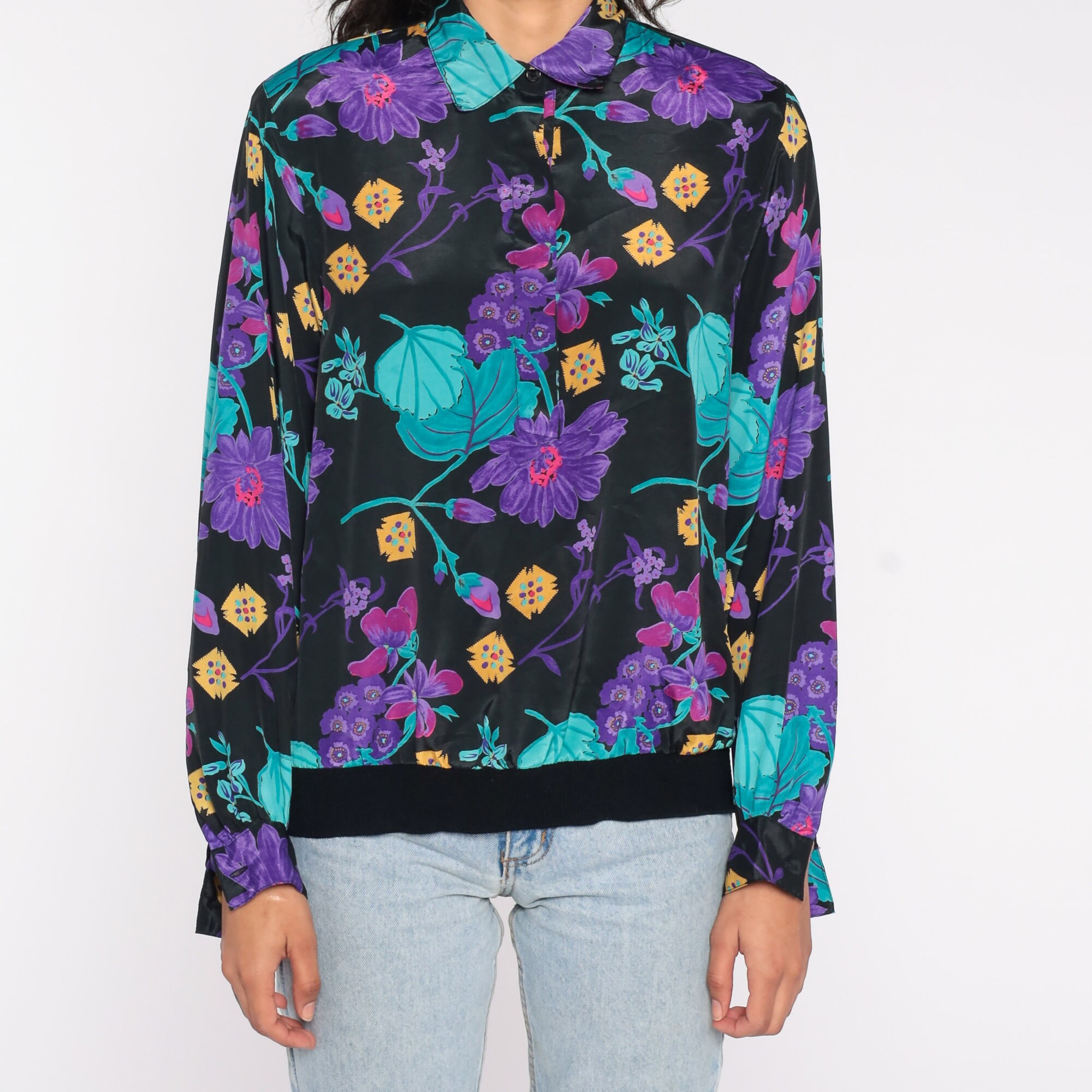 Vintage 80s 90s shirt in a floral print with long cuffed sleeves, a collar, a banded hem, and buttons on the chest.
