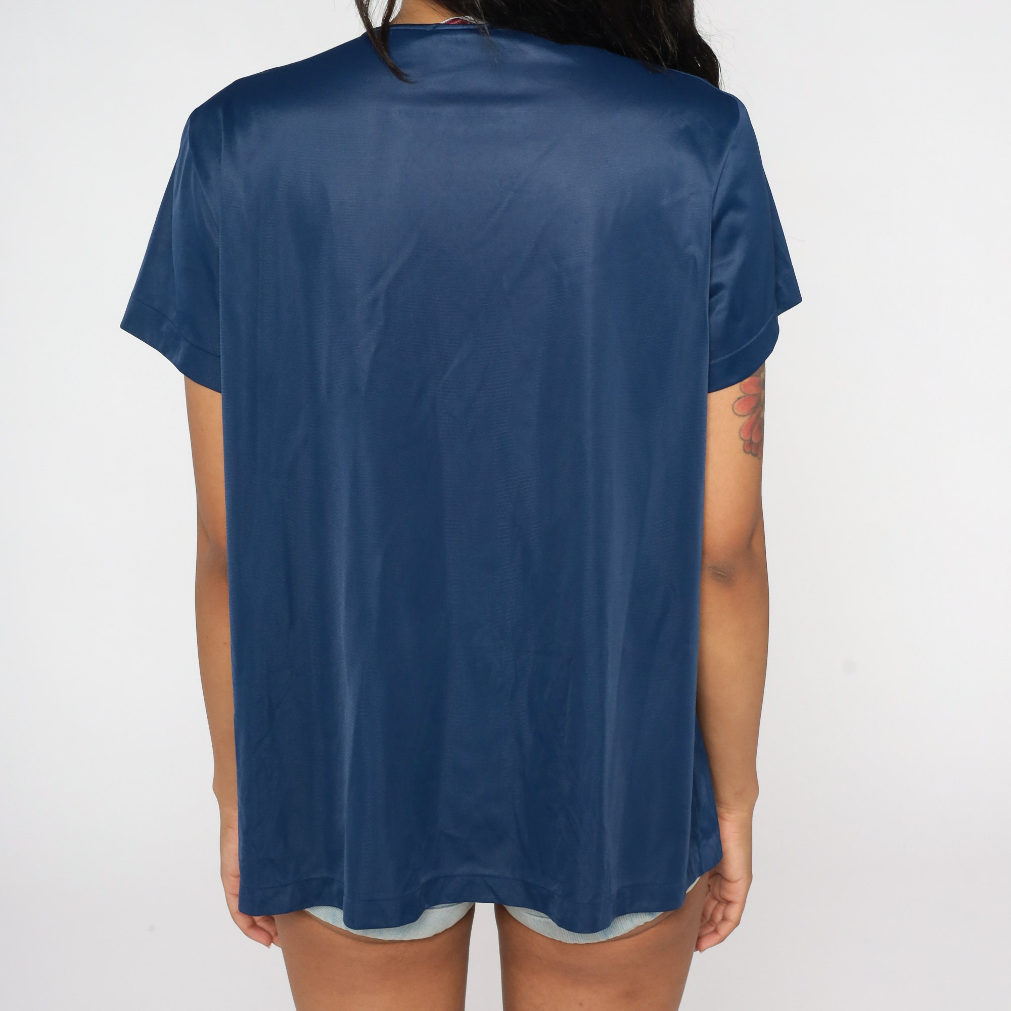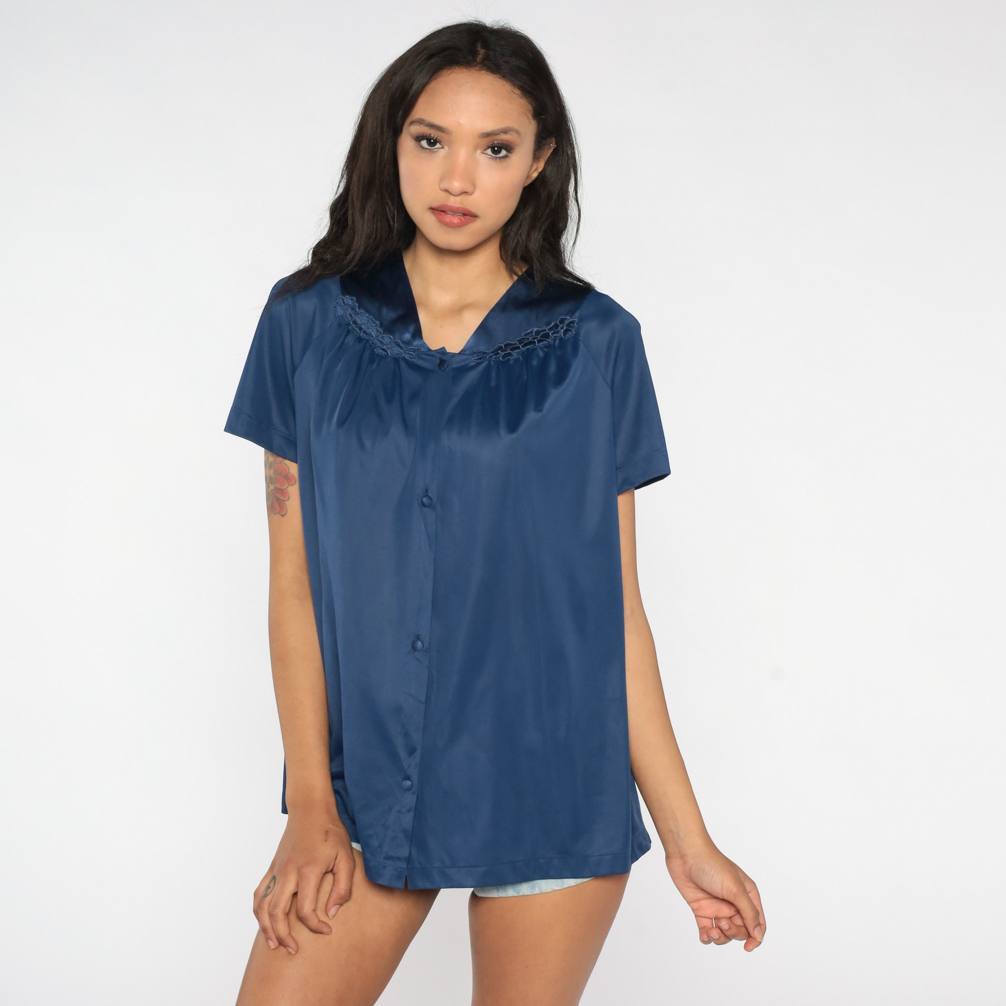 Vintage 80s lingerie pajama top in navy blue nylon with embroidered flowers and buttons up the front.