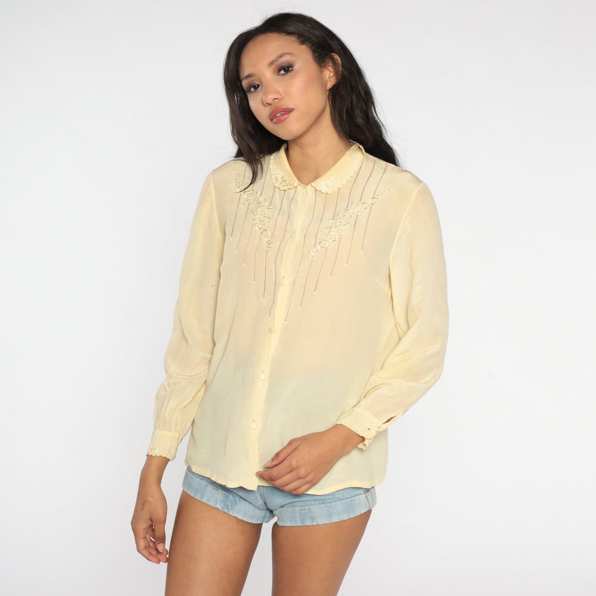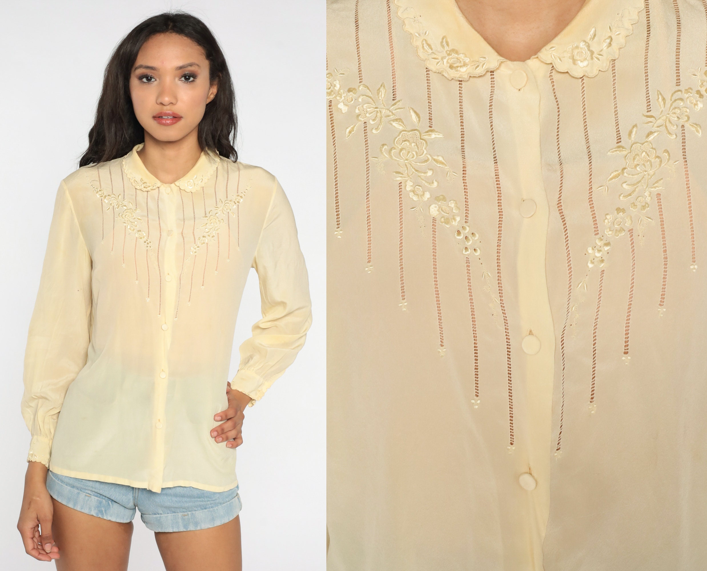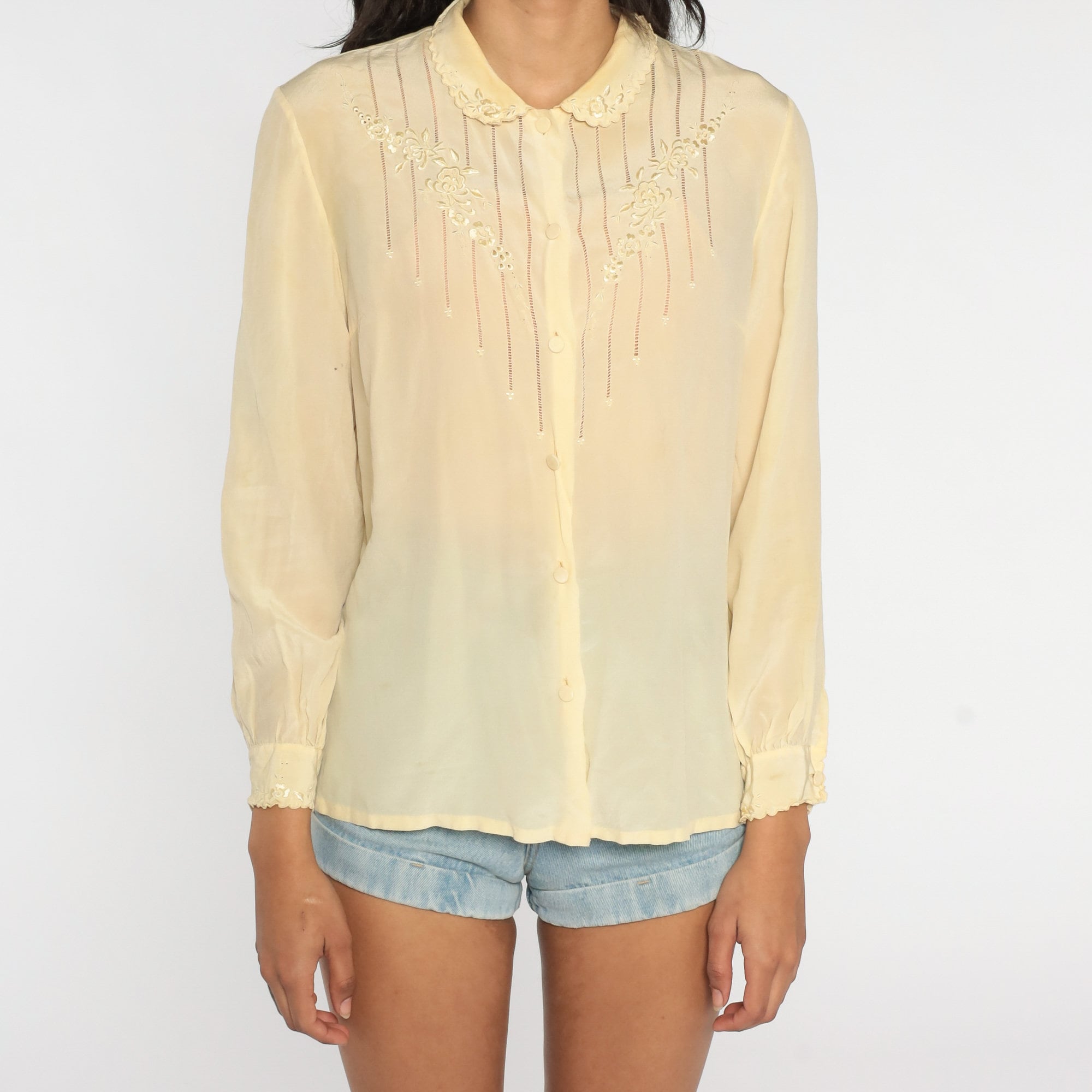Vintage 80s blouse in pale yellow with a scalloped collar, cutwork, and floral embroidery. Buttons up the front with long sleeves. Has some condition issues, see details below.