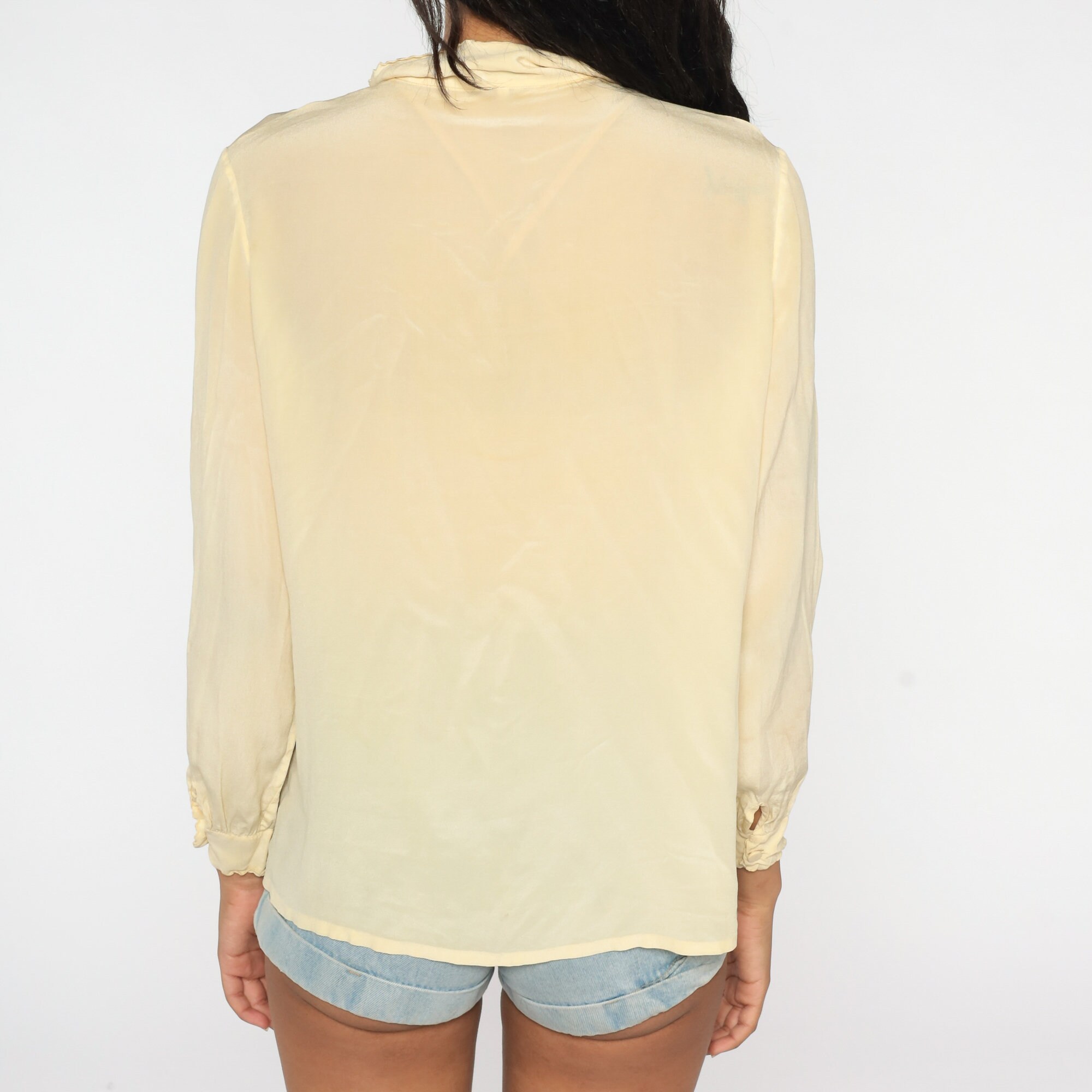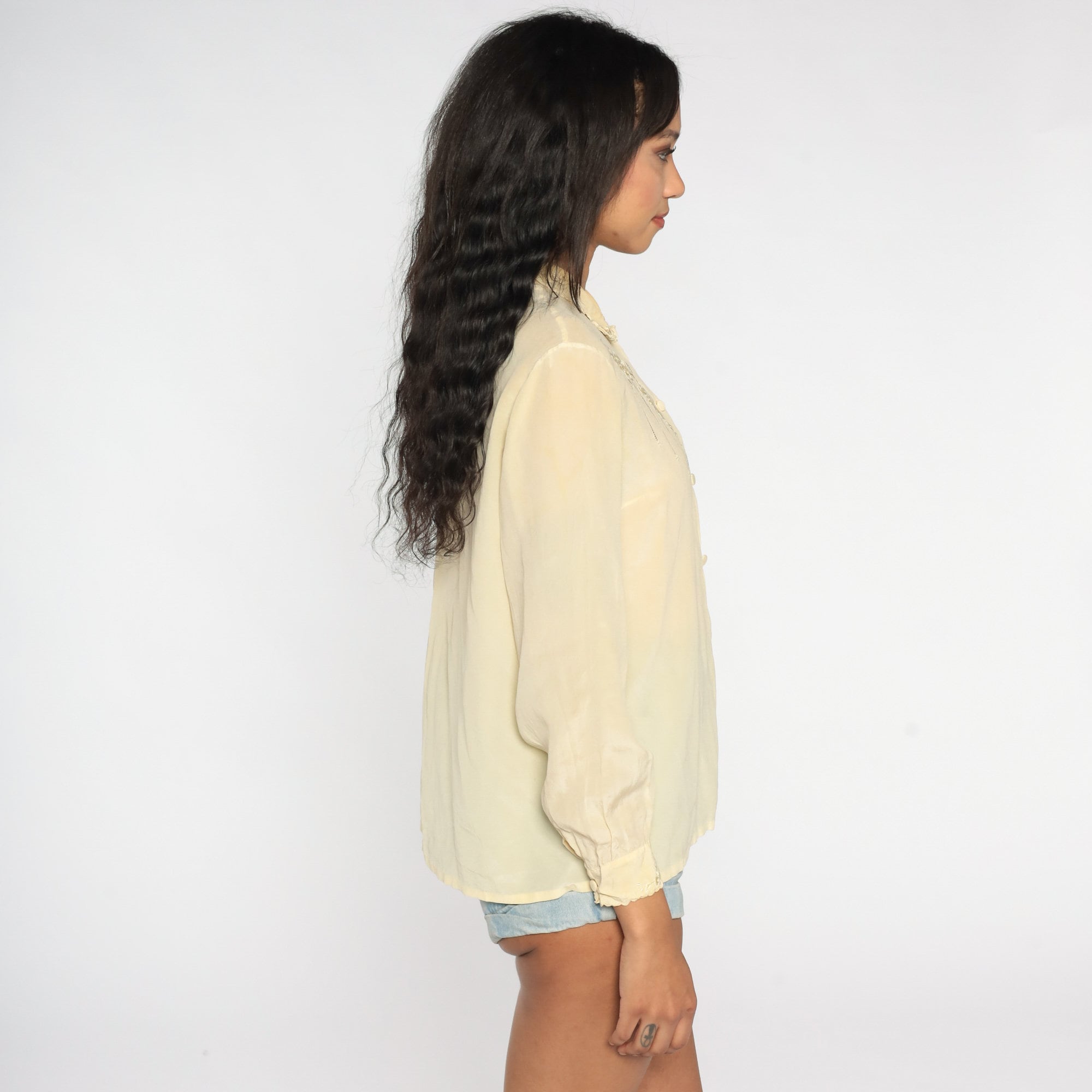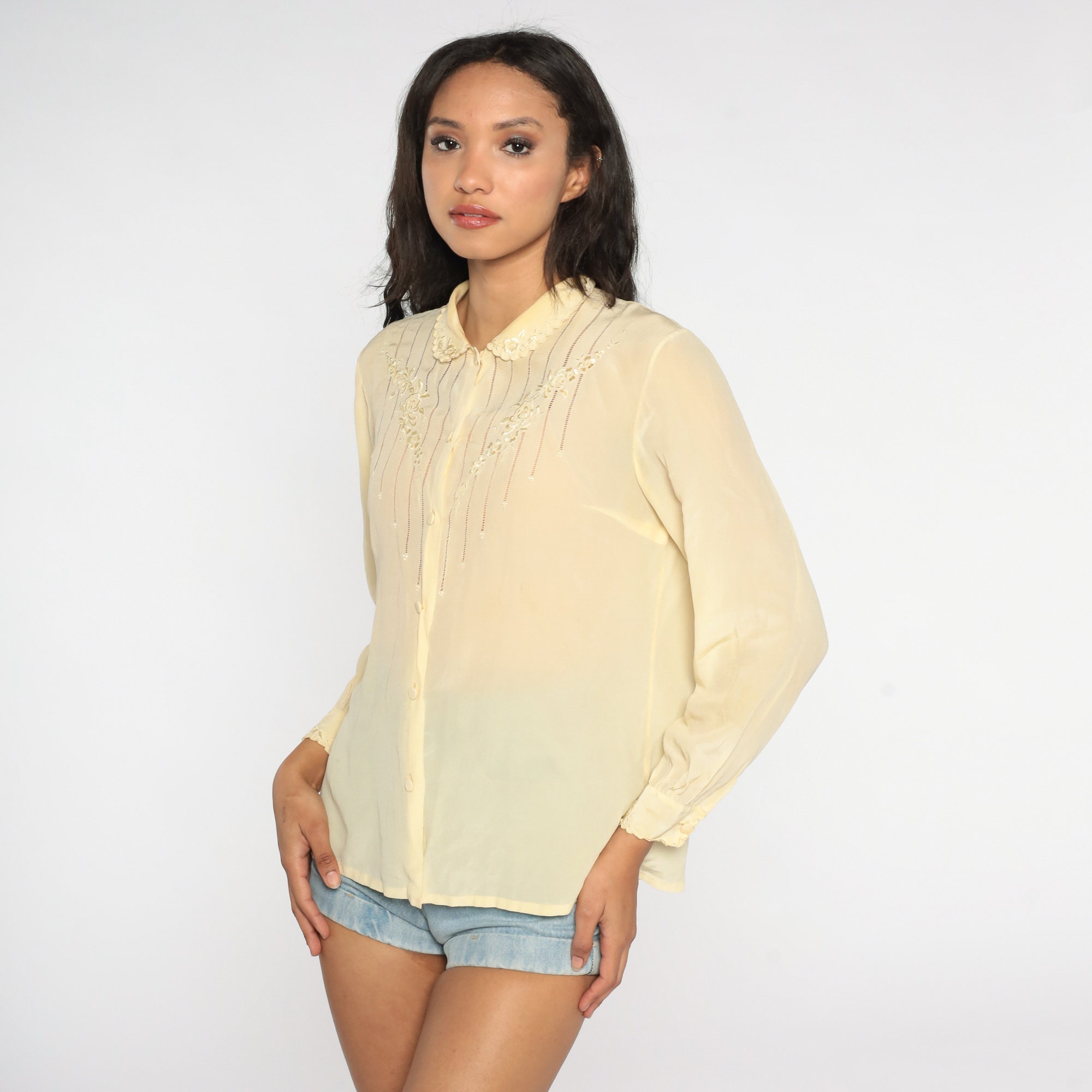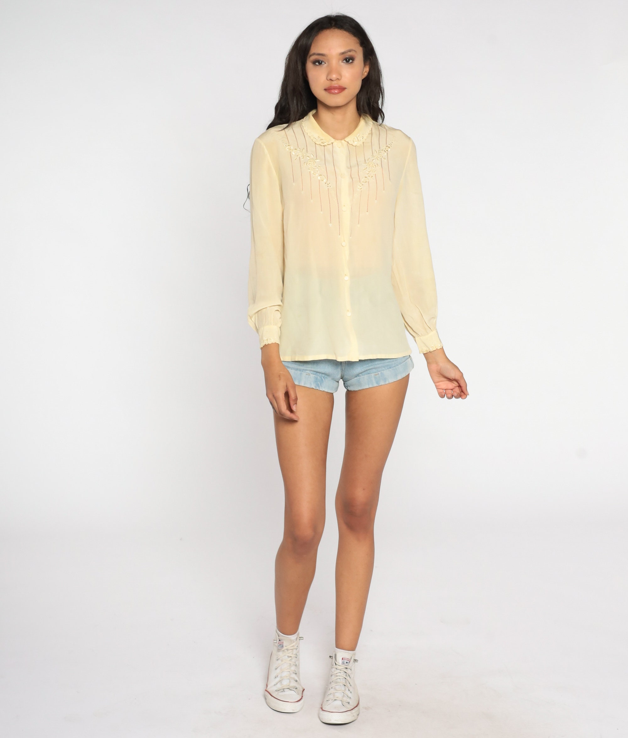 Vintage 80s blouse in pale yellow with a scalloped collar, cutwork, and floral embroidery. Buttons up the front with long sleeves. Has some condition issues, see details below.