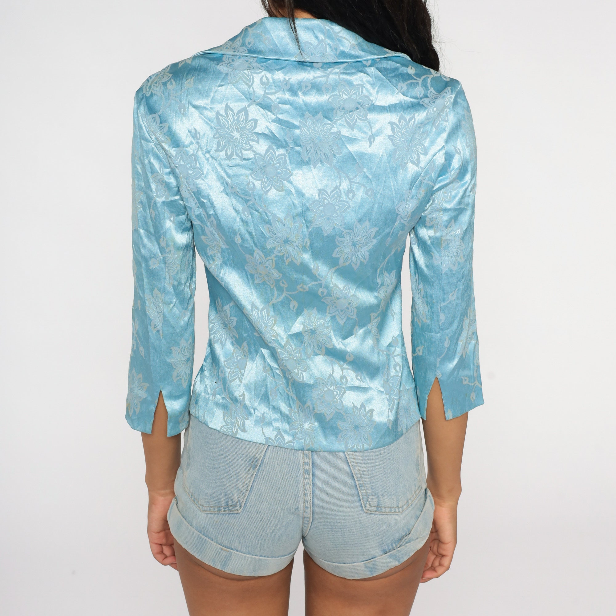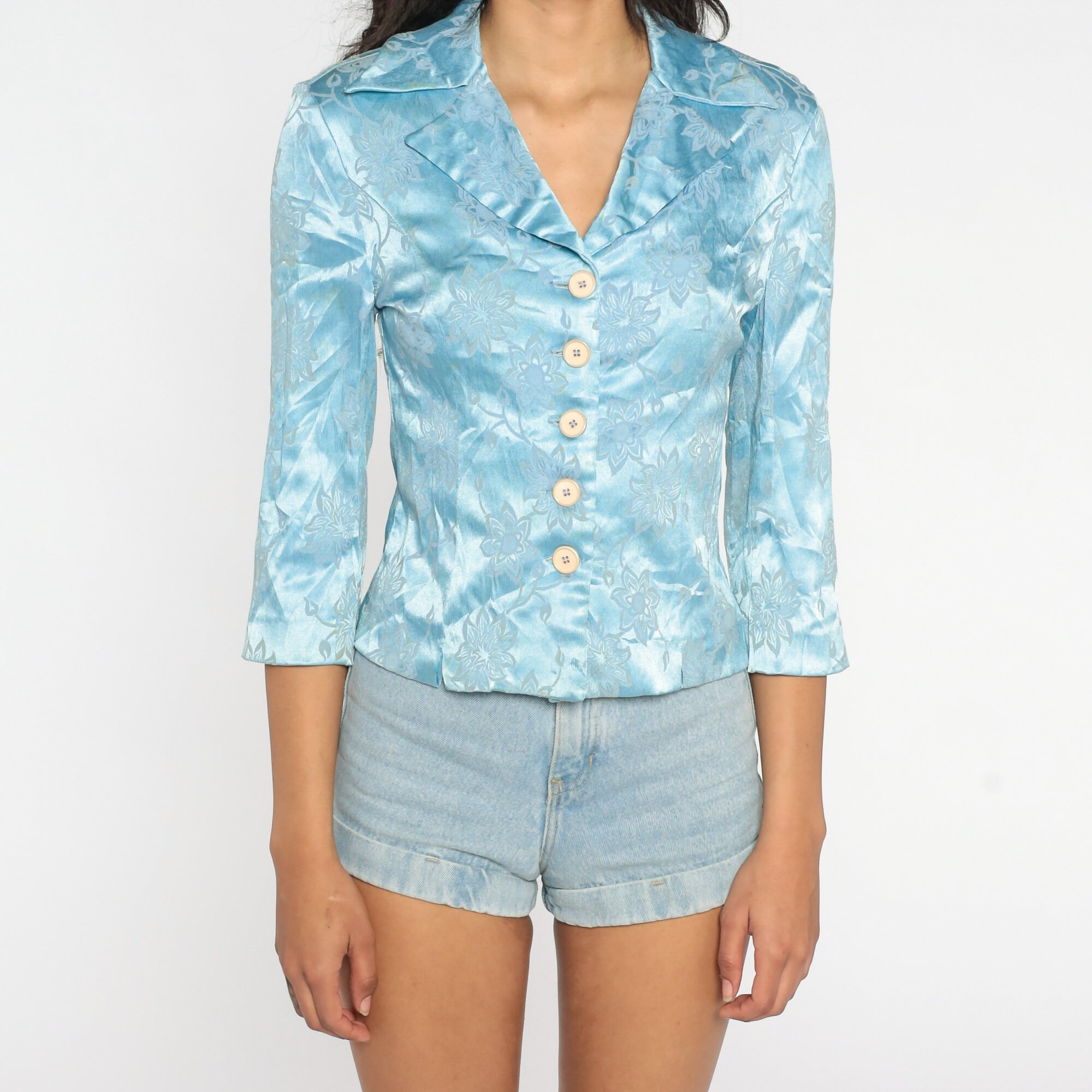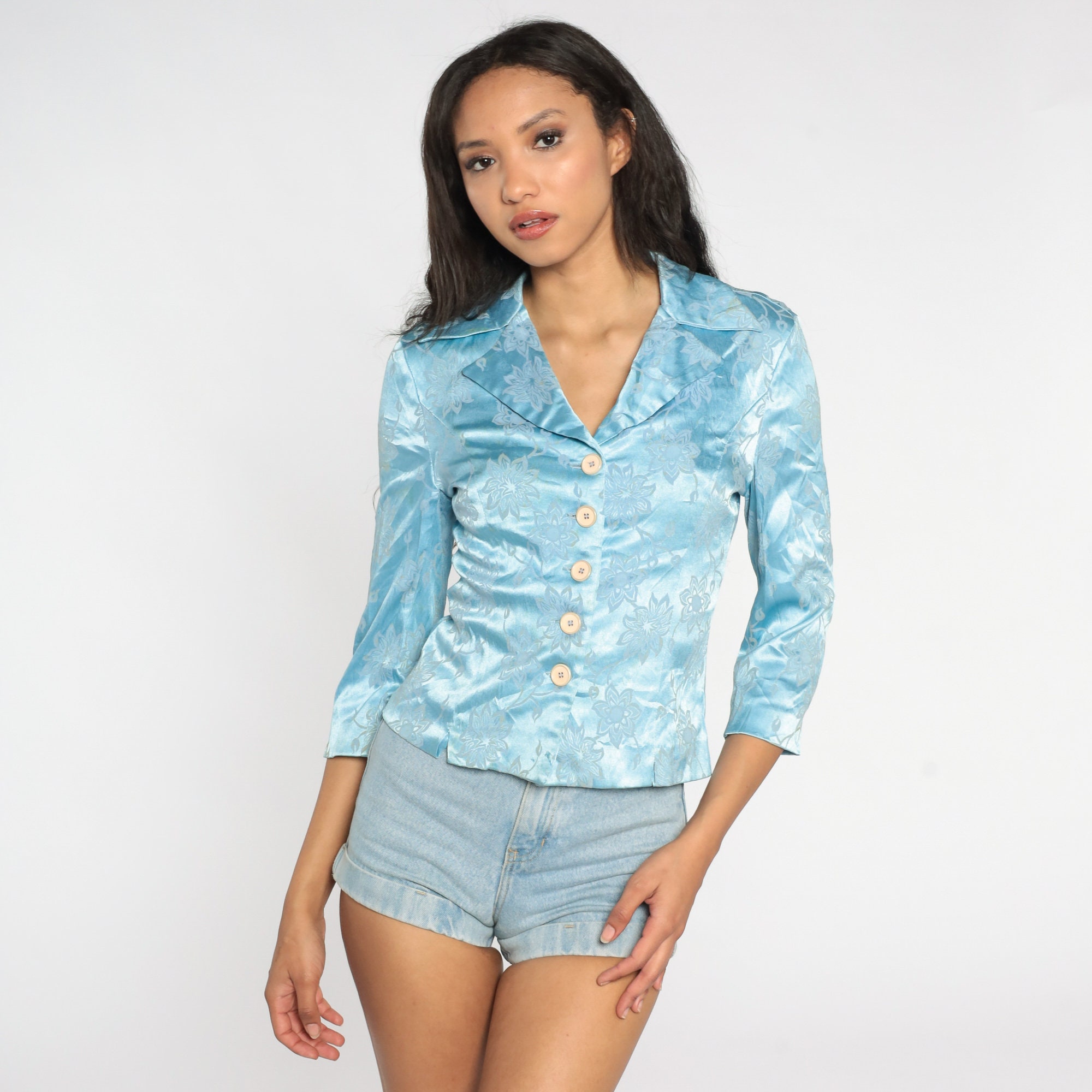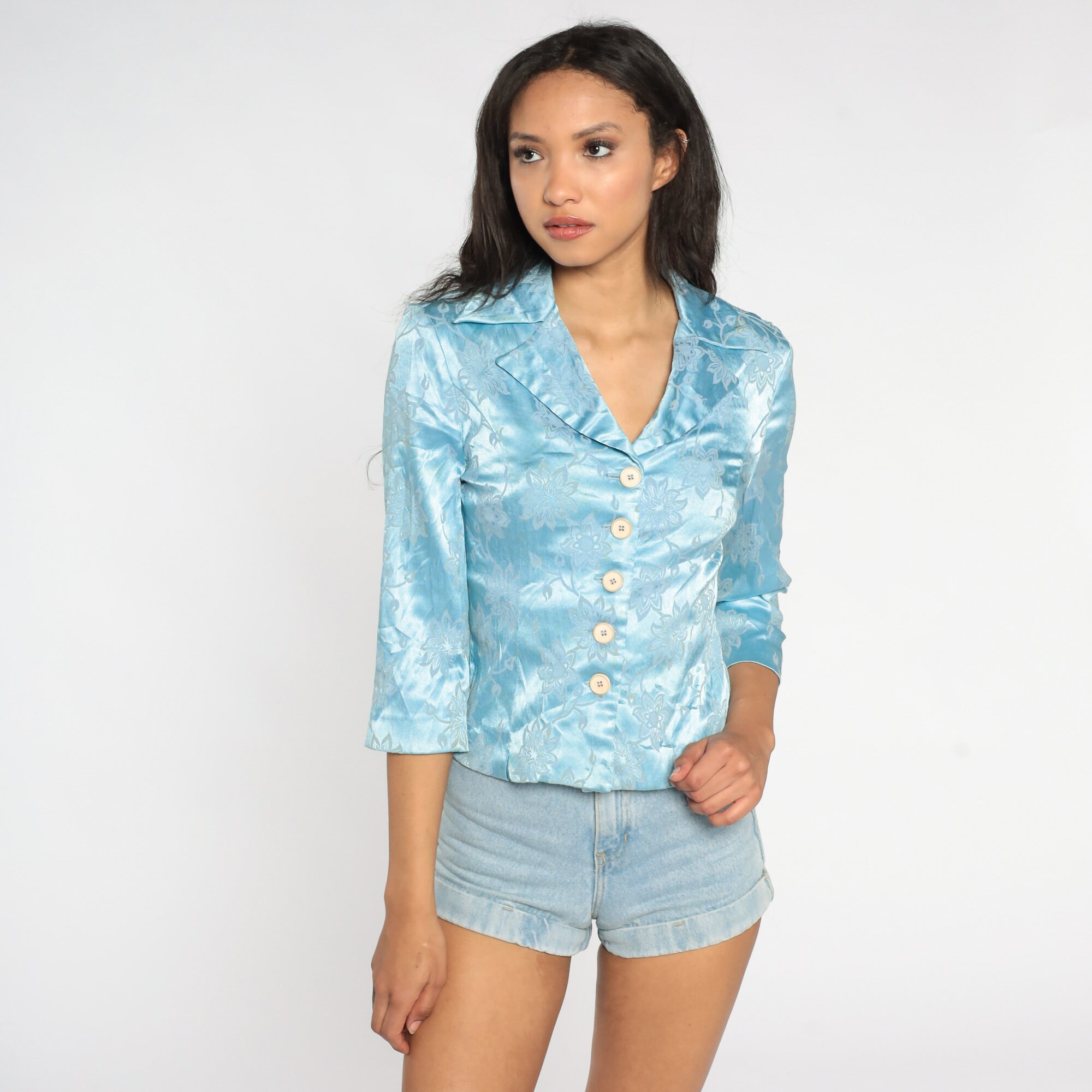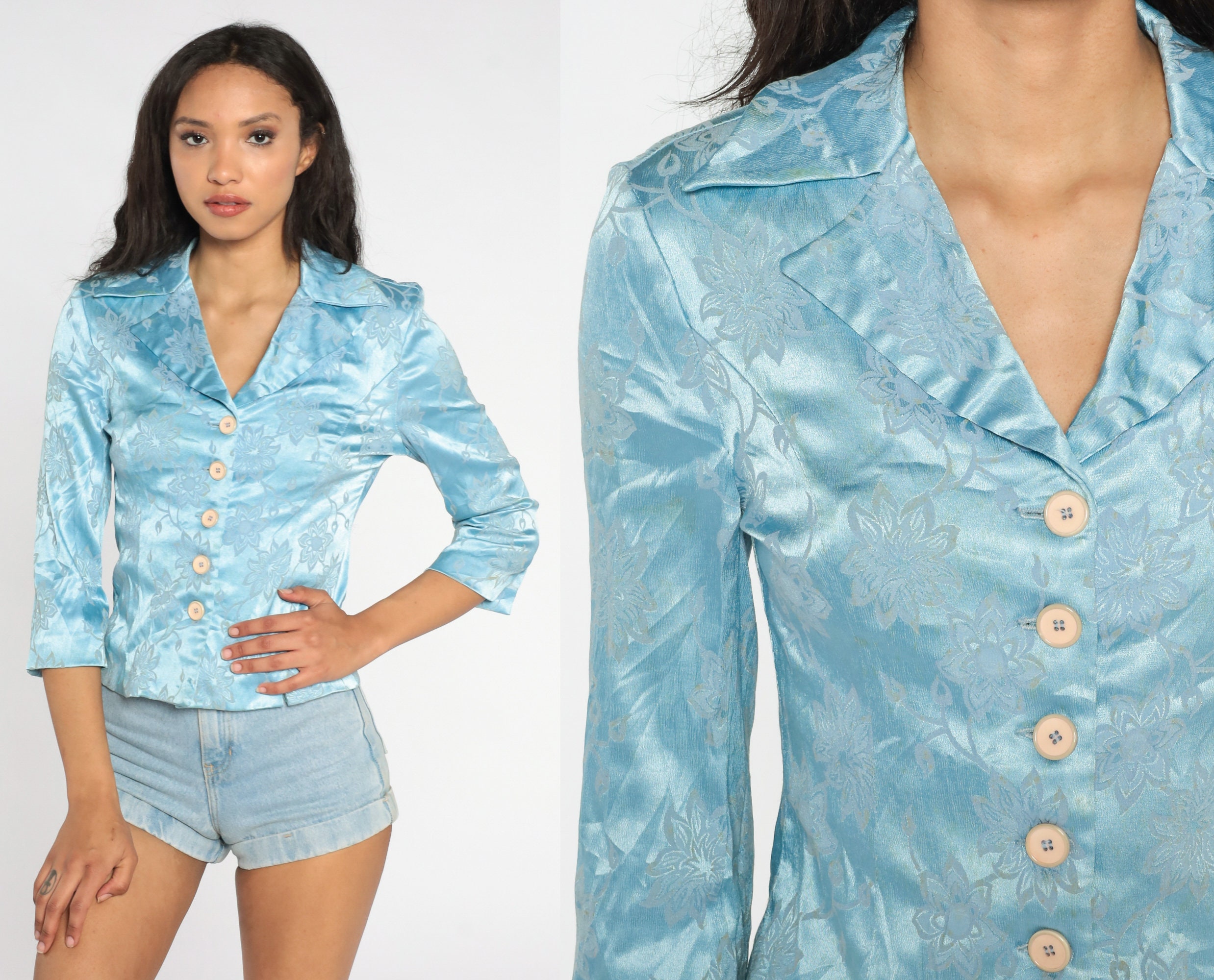 Vintage 60s 70s blouse floral embossed baby blue with buttons up the front and a notched collar.