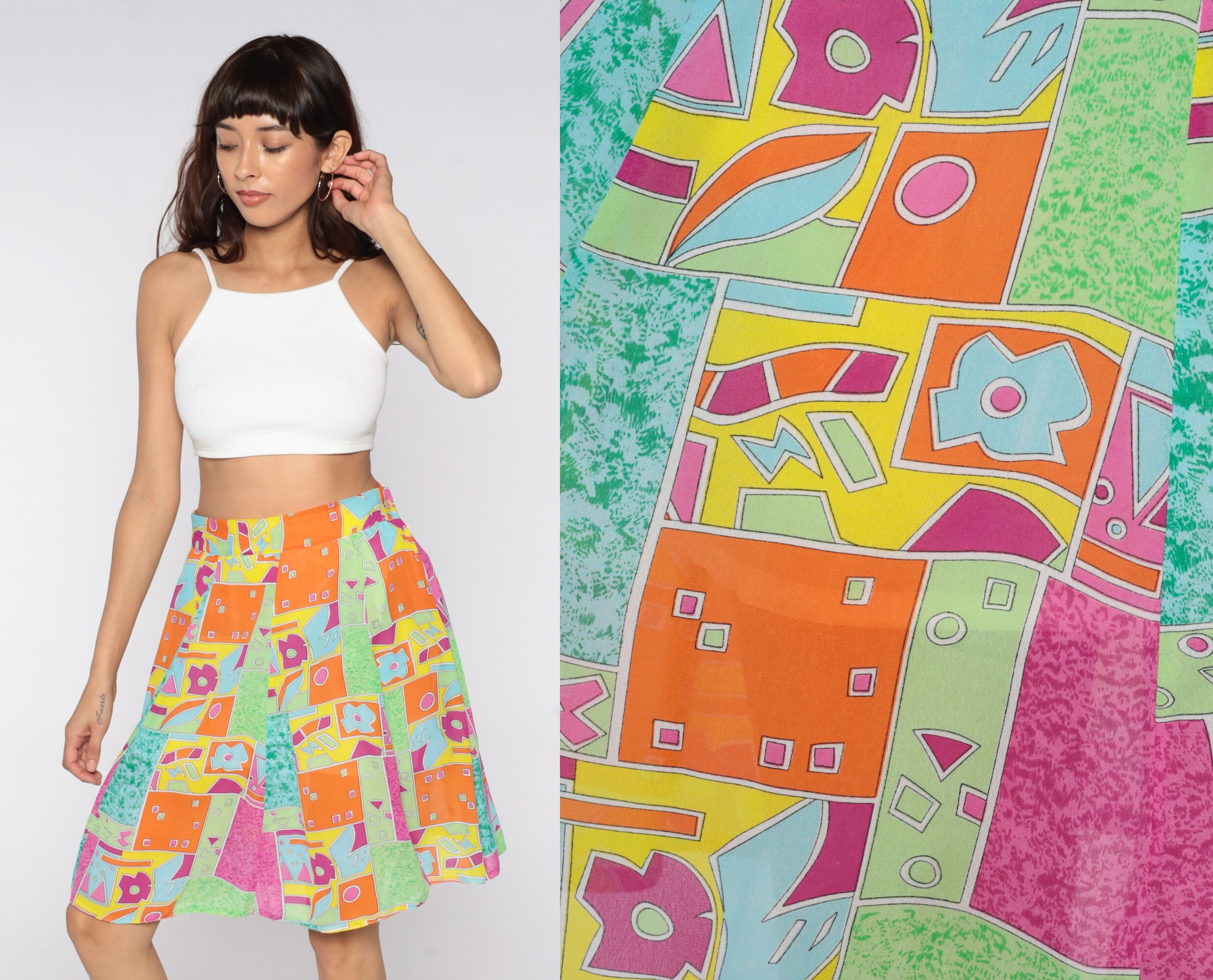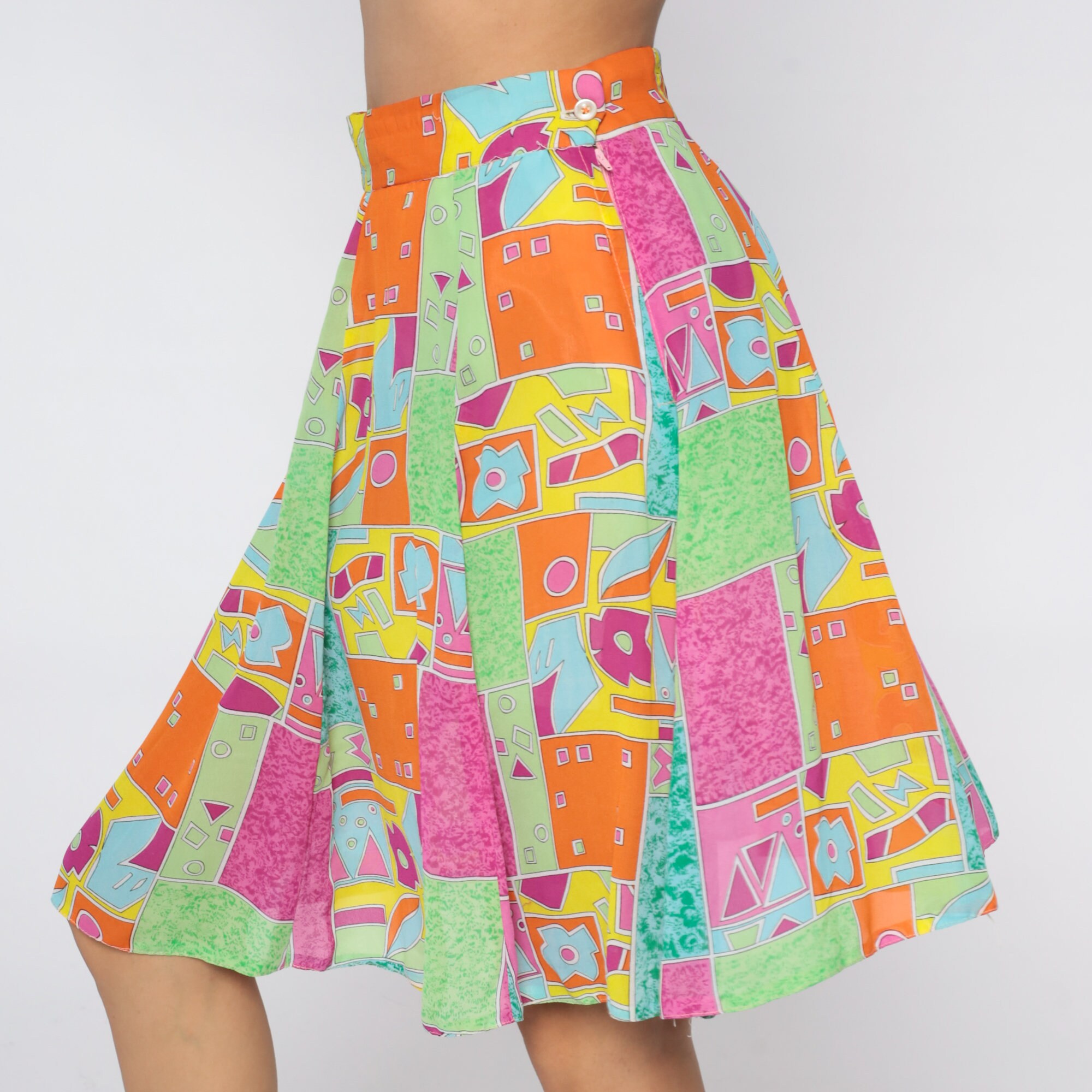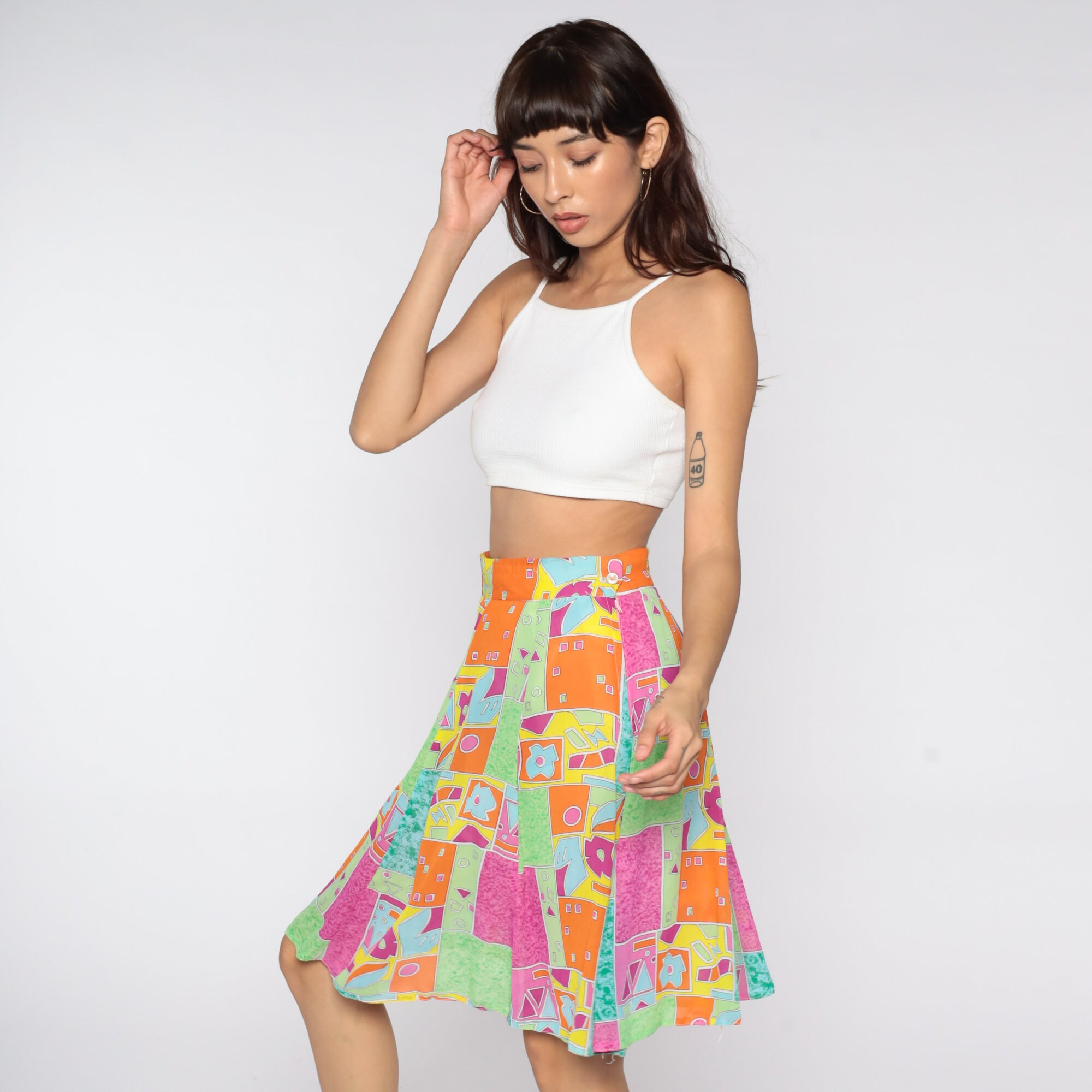 Vintage 80s skirt with a bright floral print. High waist, knee length.