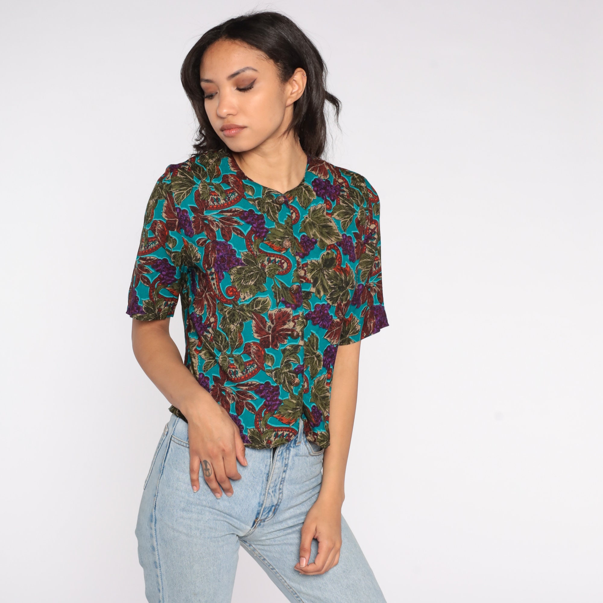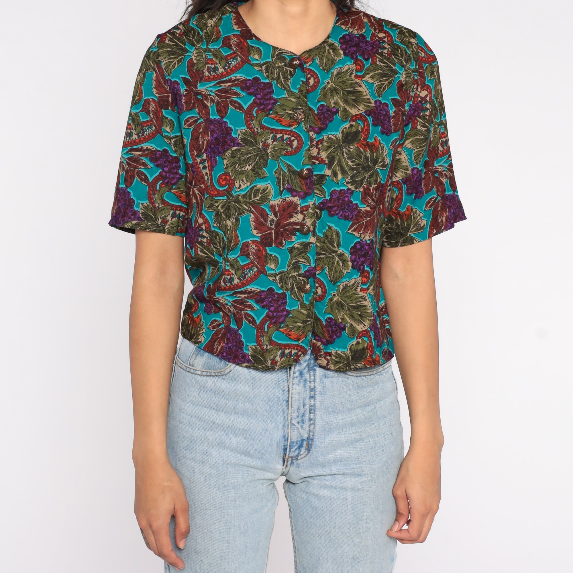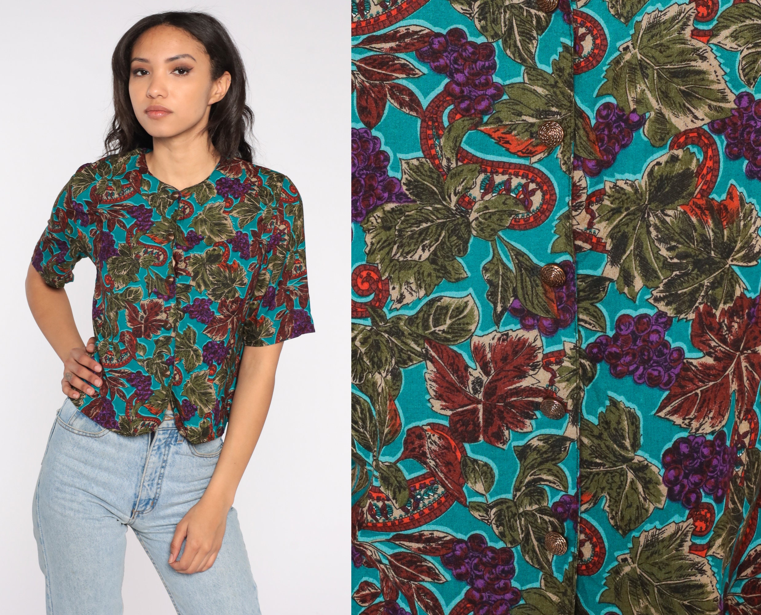 Vintage 80s 90s shirt with a paisley and grape vine print, buttons up the front and short sleeves.